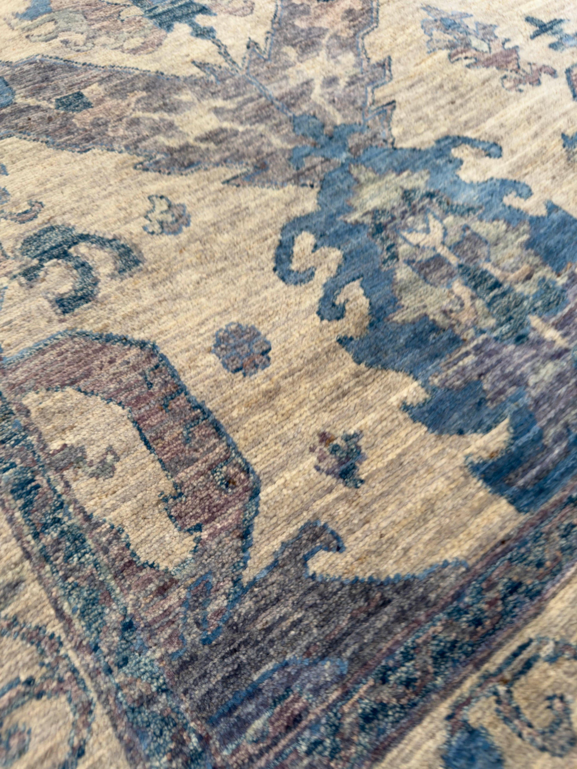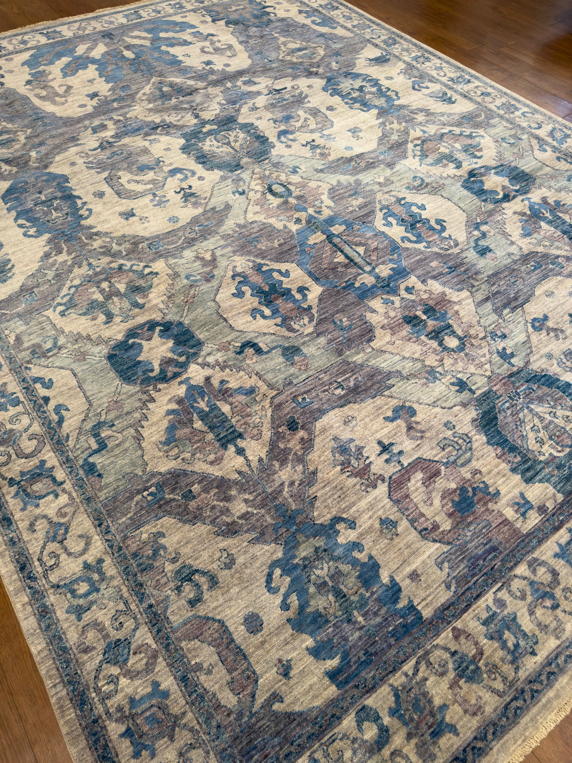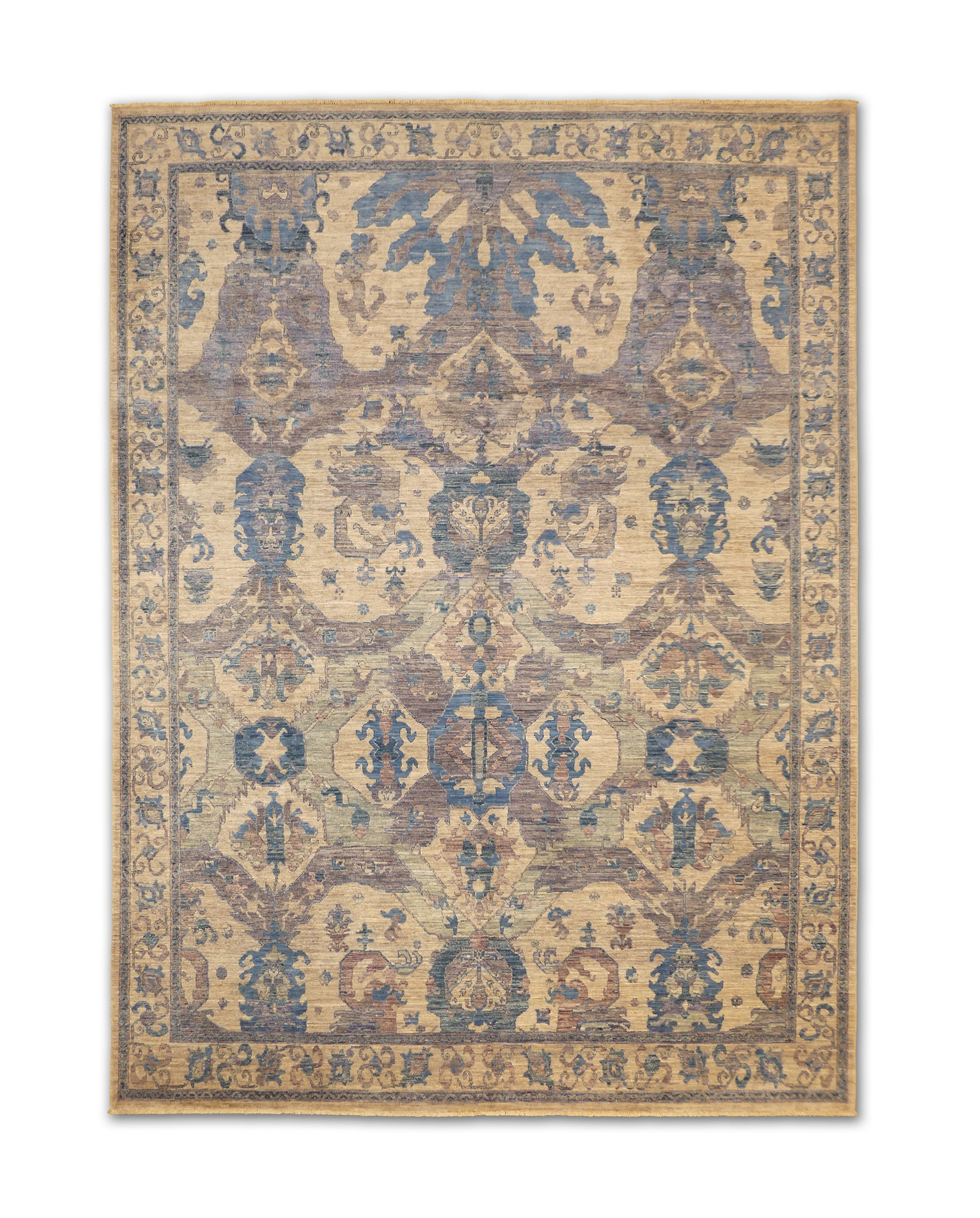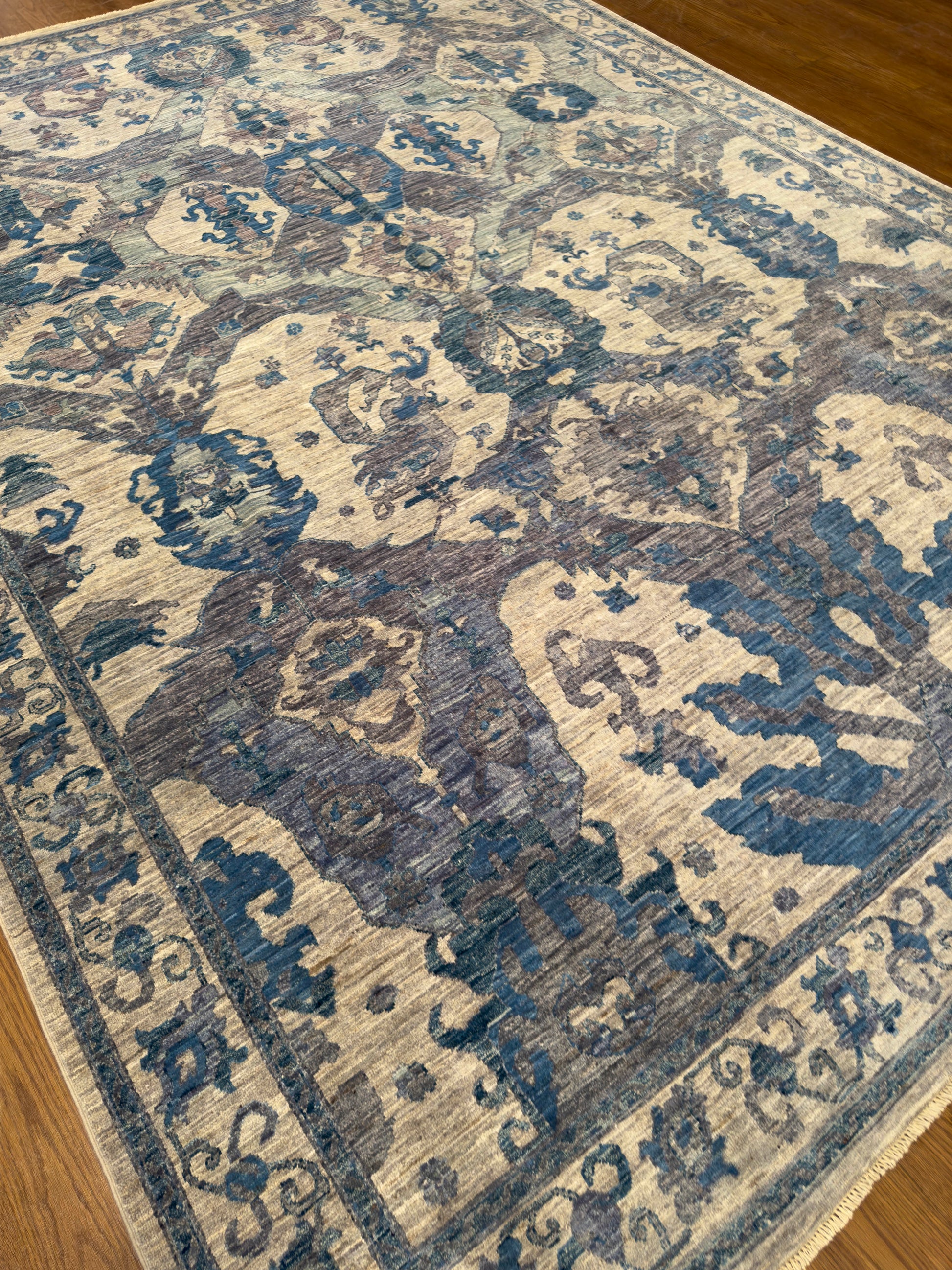 This elegant hand-knotted rug features a soft ivory field adorned with grand, oversized palmettes and angular motifs in muted shades of denim blue, slate, and dusty lavender. The design is arranged in a balanced symmetry, with bold central medallion-like forms giving the rug structure while the flowing vine details soften the composition. A complementary border of stylized floral and geometric elements frames the interior, enhancing its refined presence. The washed palette and gentle contrasts give this piece a vintage-inspired look, making it a versatile foundation for transitional living rooms, dining areas, or serene bedrooms.