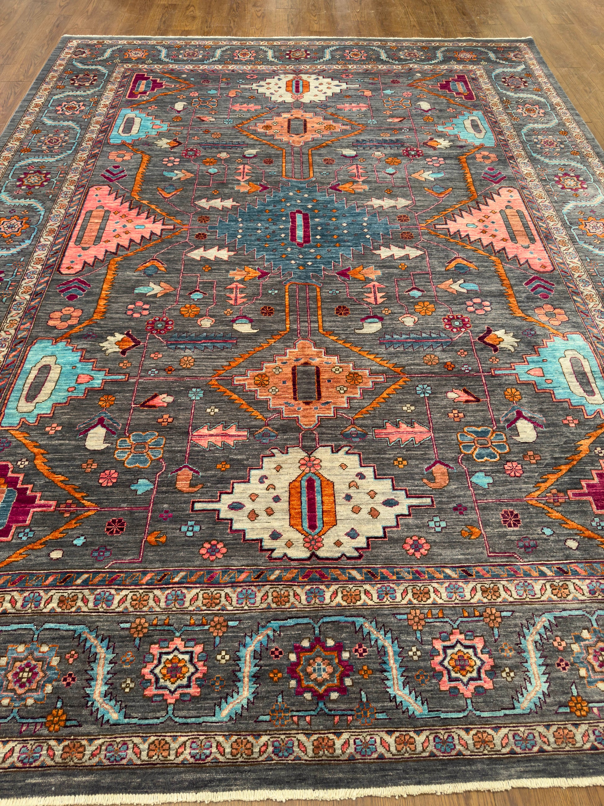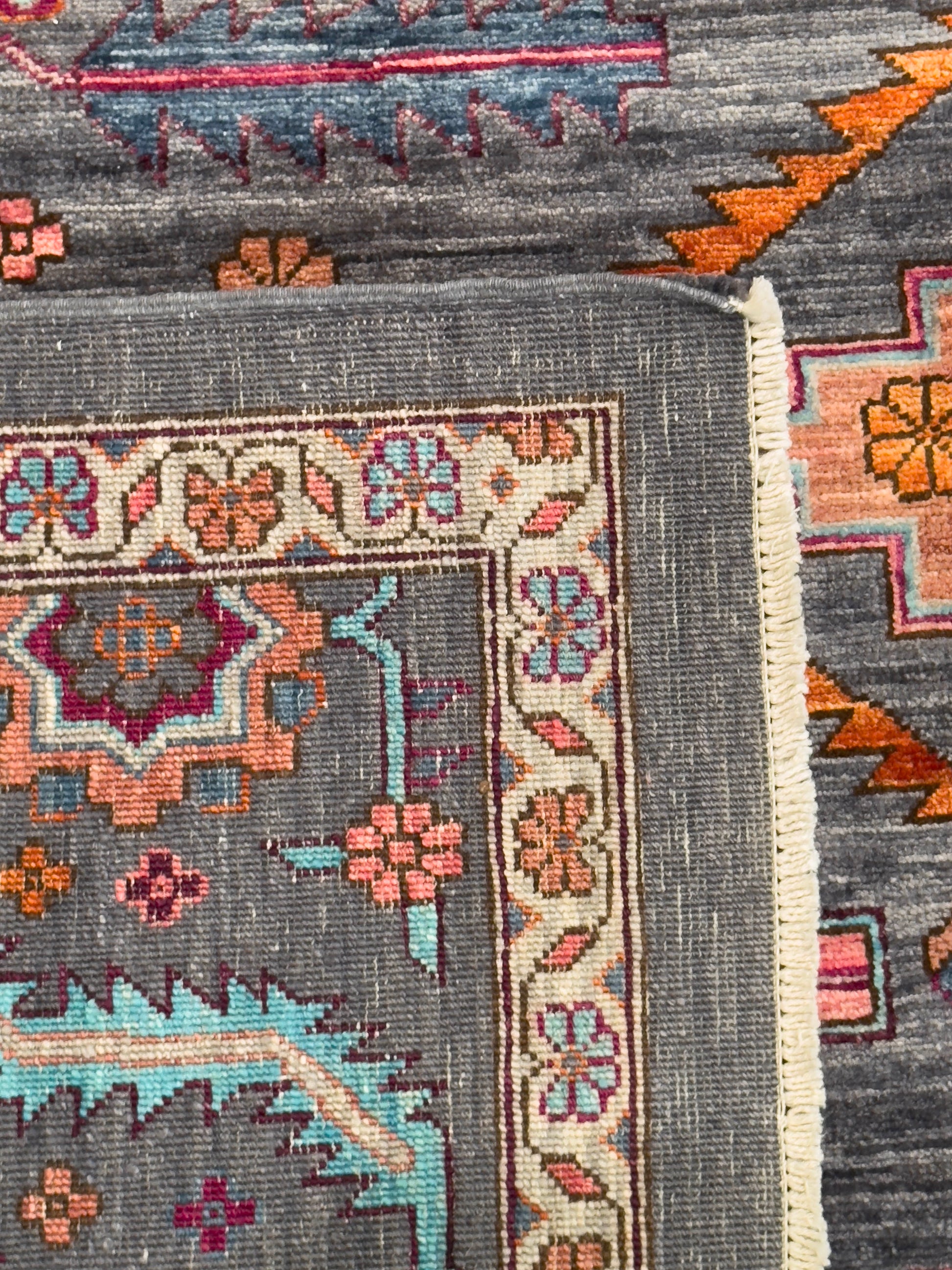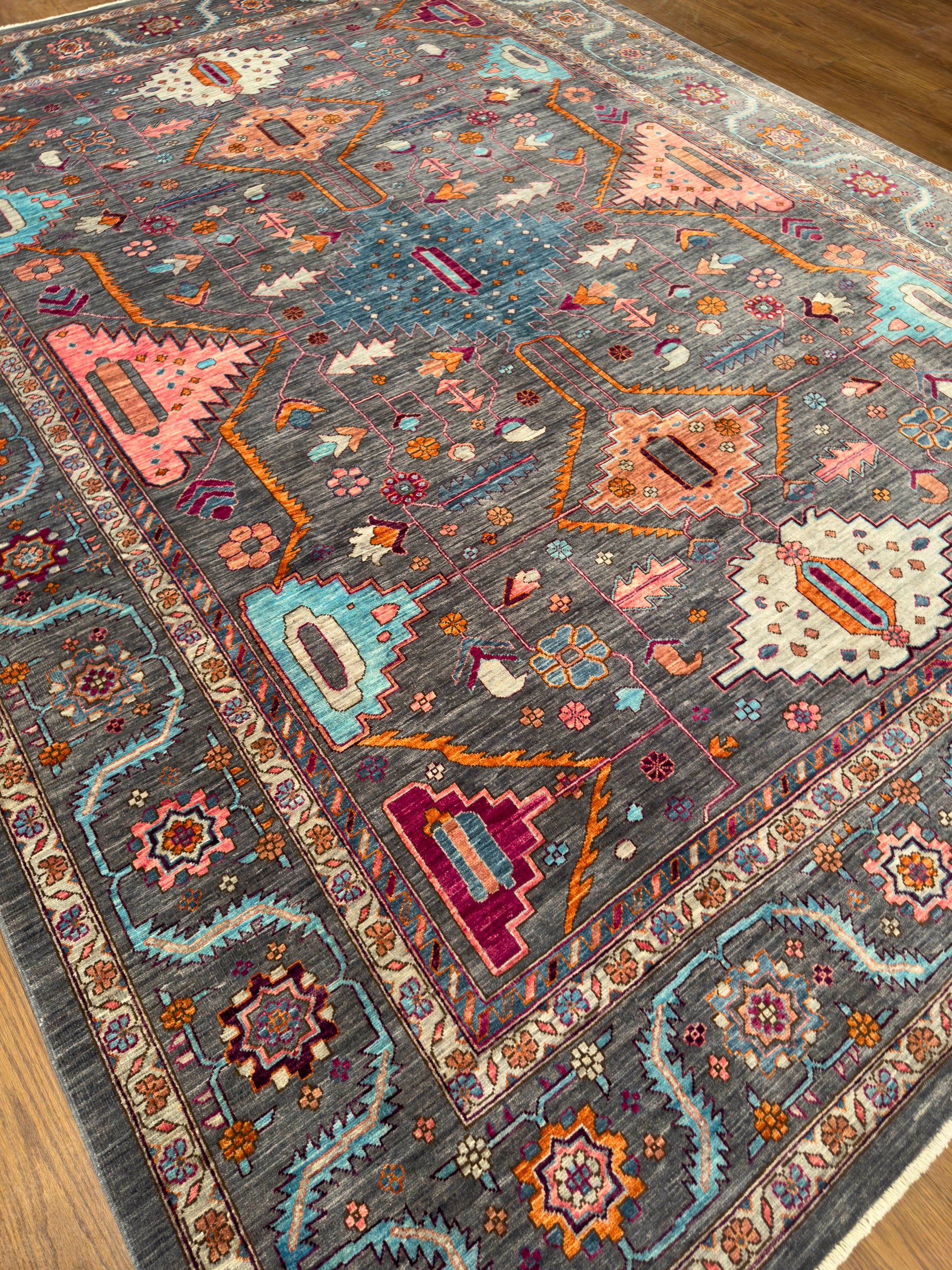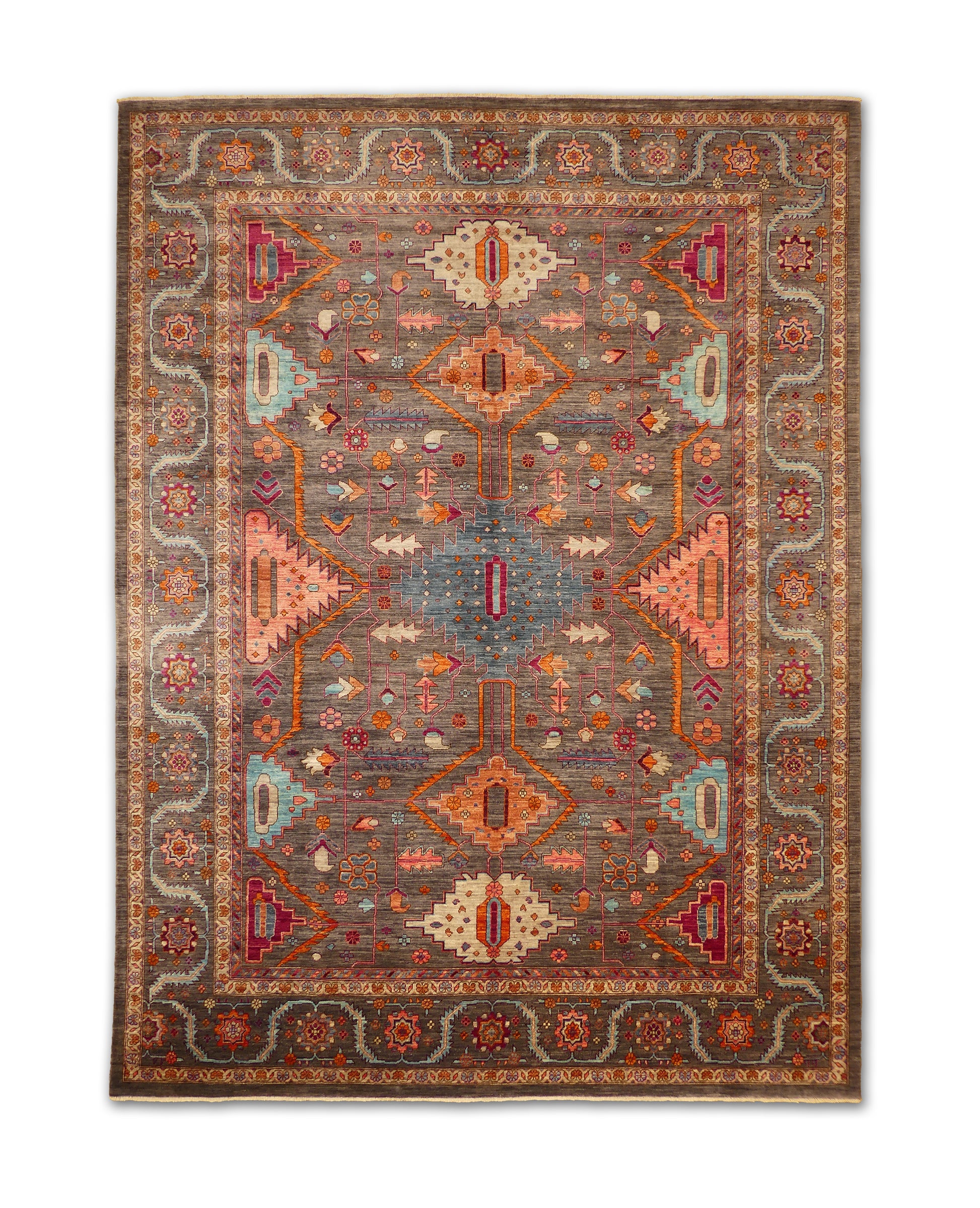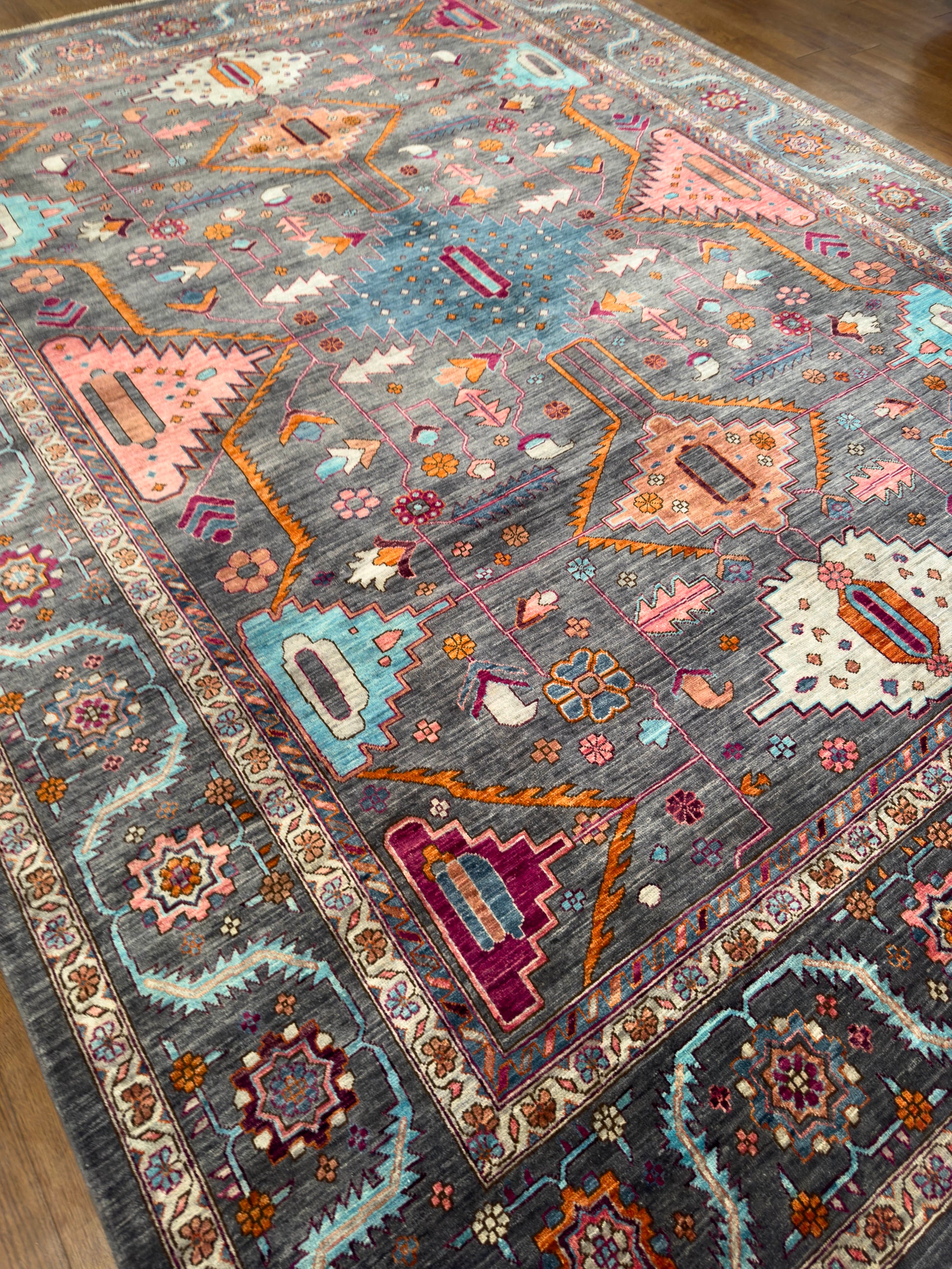 This striking hand-knotted rug showcases a dramatic gray field decorated with bold diamond medallions and stylized geometric motifs in vivid shades of turquoise, coral pink, saffron, ivory, and magenta. The playful placement of tribal-inspired patterns, interspersed with small floral accents, creates a dynamic balance of tradition and modern flair. A richly ornamented border in complementary jewel tones frames the composition, grounding the bright interior with structure and detail. With its vibrant palette and strong geometry, this rug is perfect for eclectic living rooms, artistic studios, or contemporary spaces seeking a bold statement.