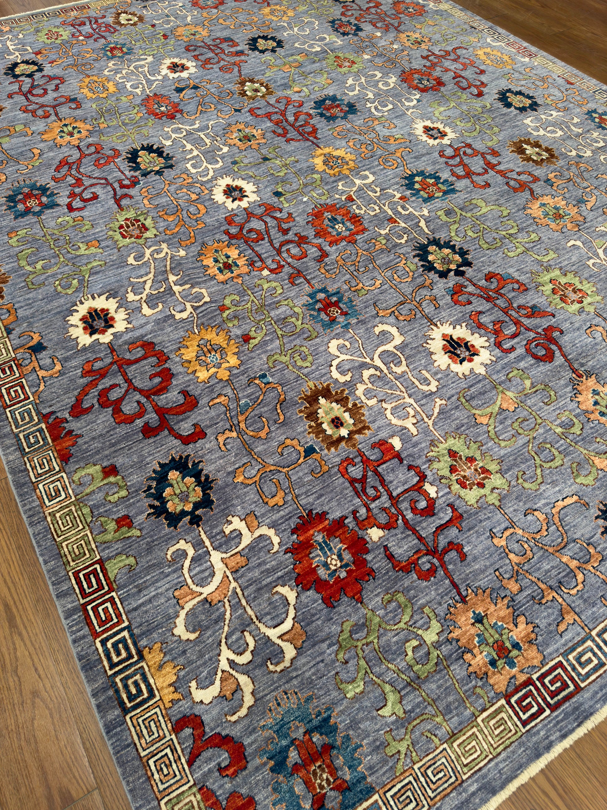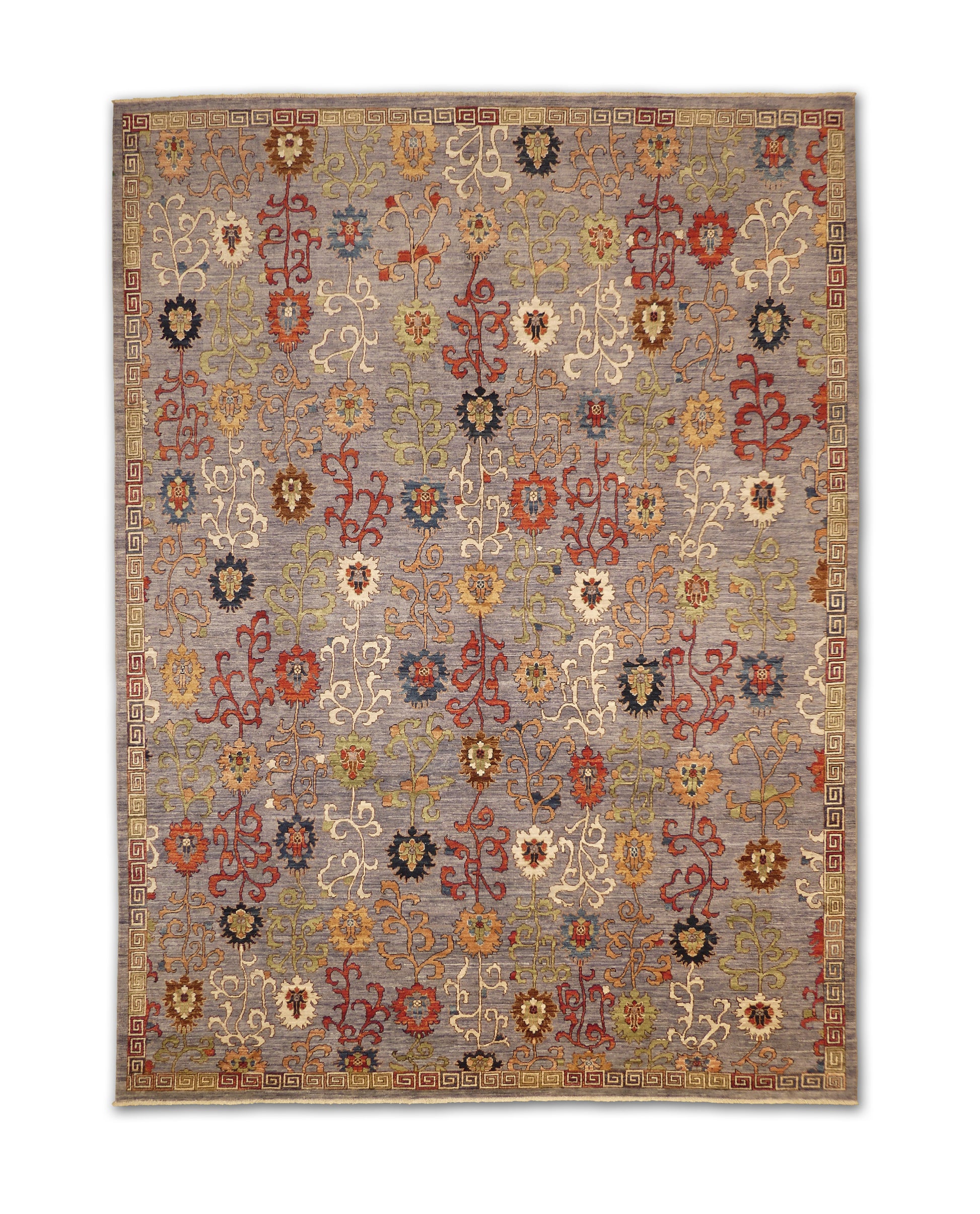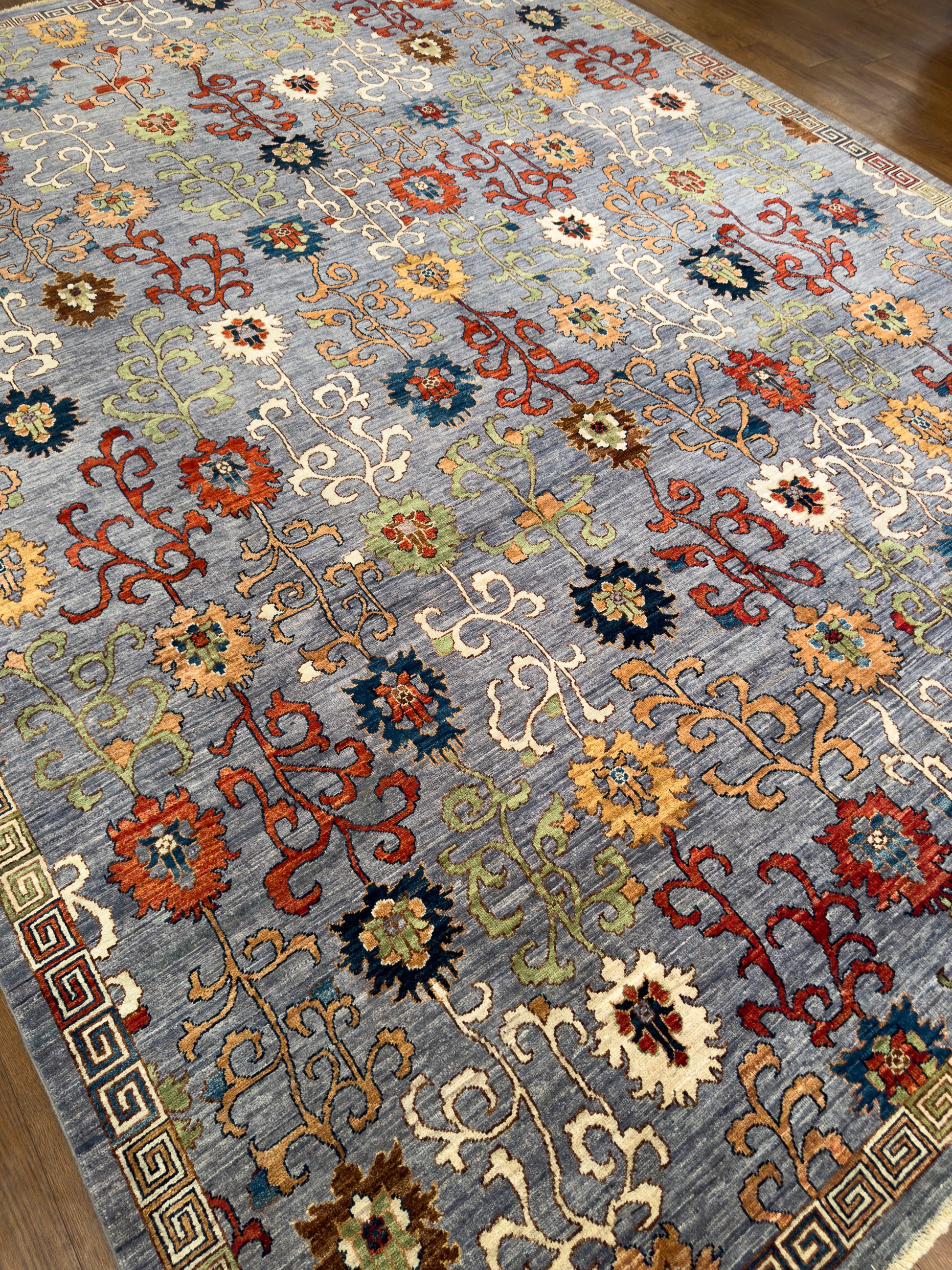 This dynamic hand-knotted rug features a slate-blue field covered in scrolling vine motifs and stylized floral medallions in vivid shades of red, gold, ivory, and teal. The allover design flows with rhythmic energy, while the motifs are given space to stand out, creating both movement and harmony. A distinctive Greek key–inspired border frames the composition, adding a touch of geometric refinement that contrasts beautifully with the organic interior. The bold palette and lively arrangement give this piece a striking character, perfect for eclectic living rooms, dining spaces, or statement-making interiors.