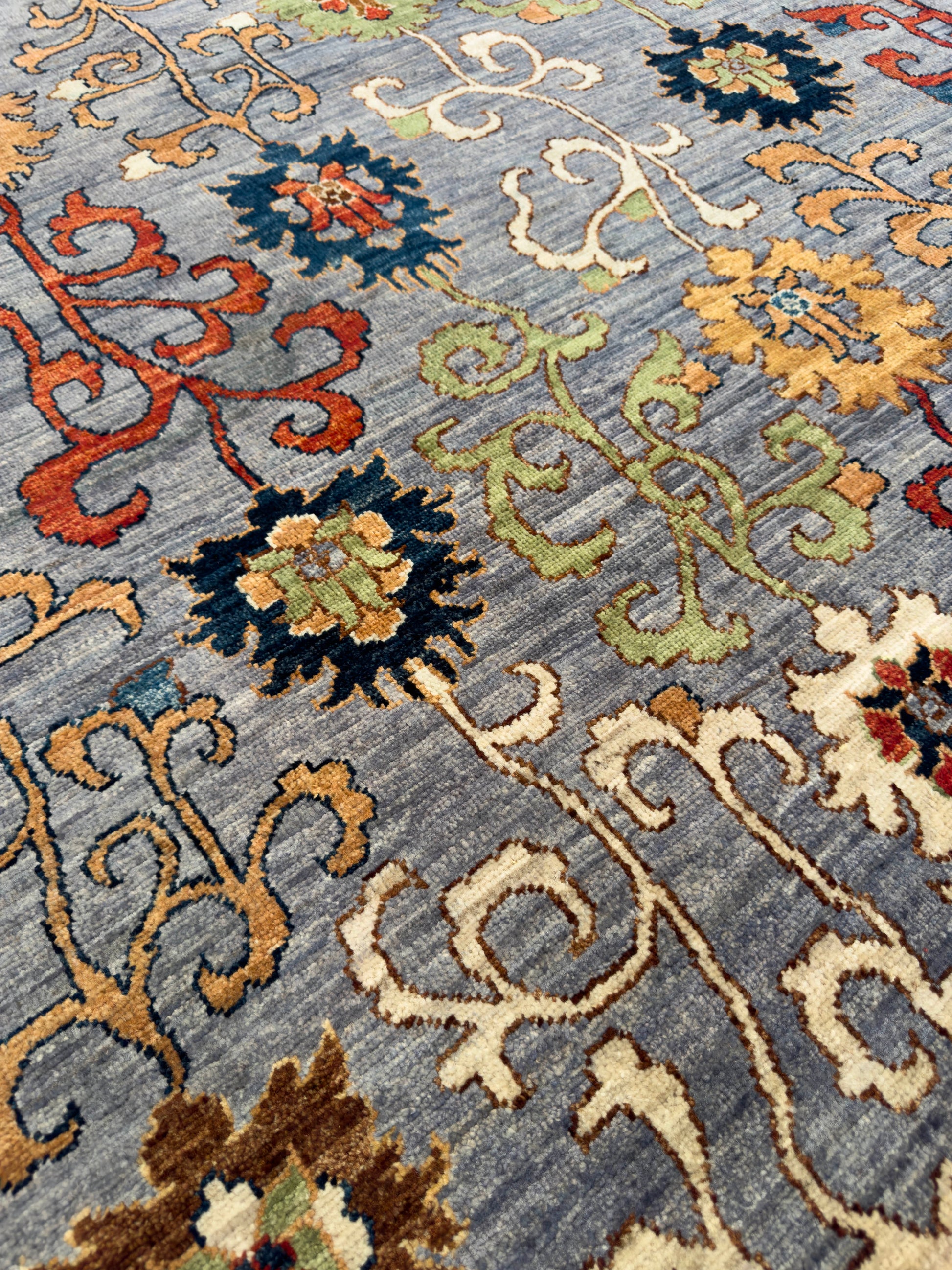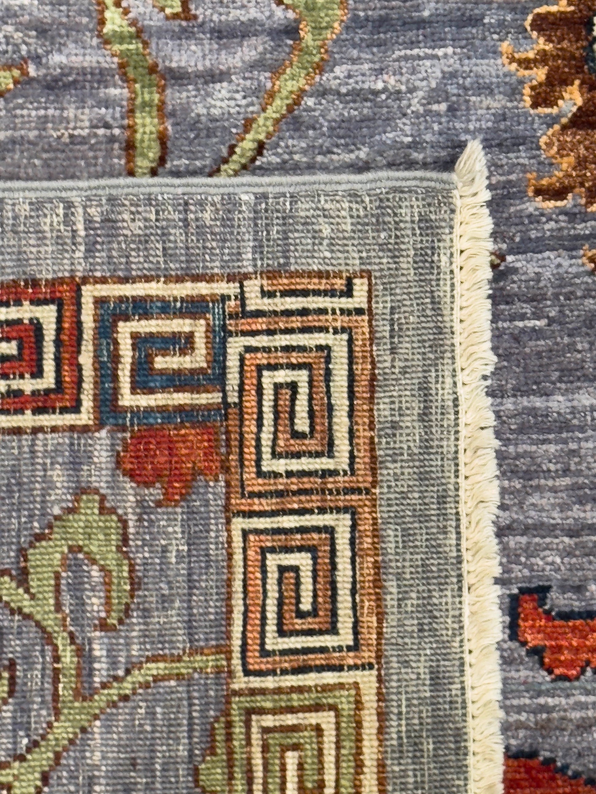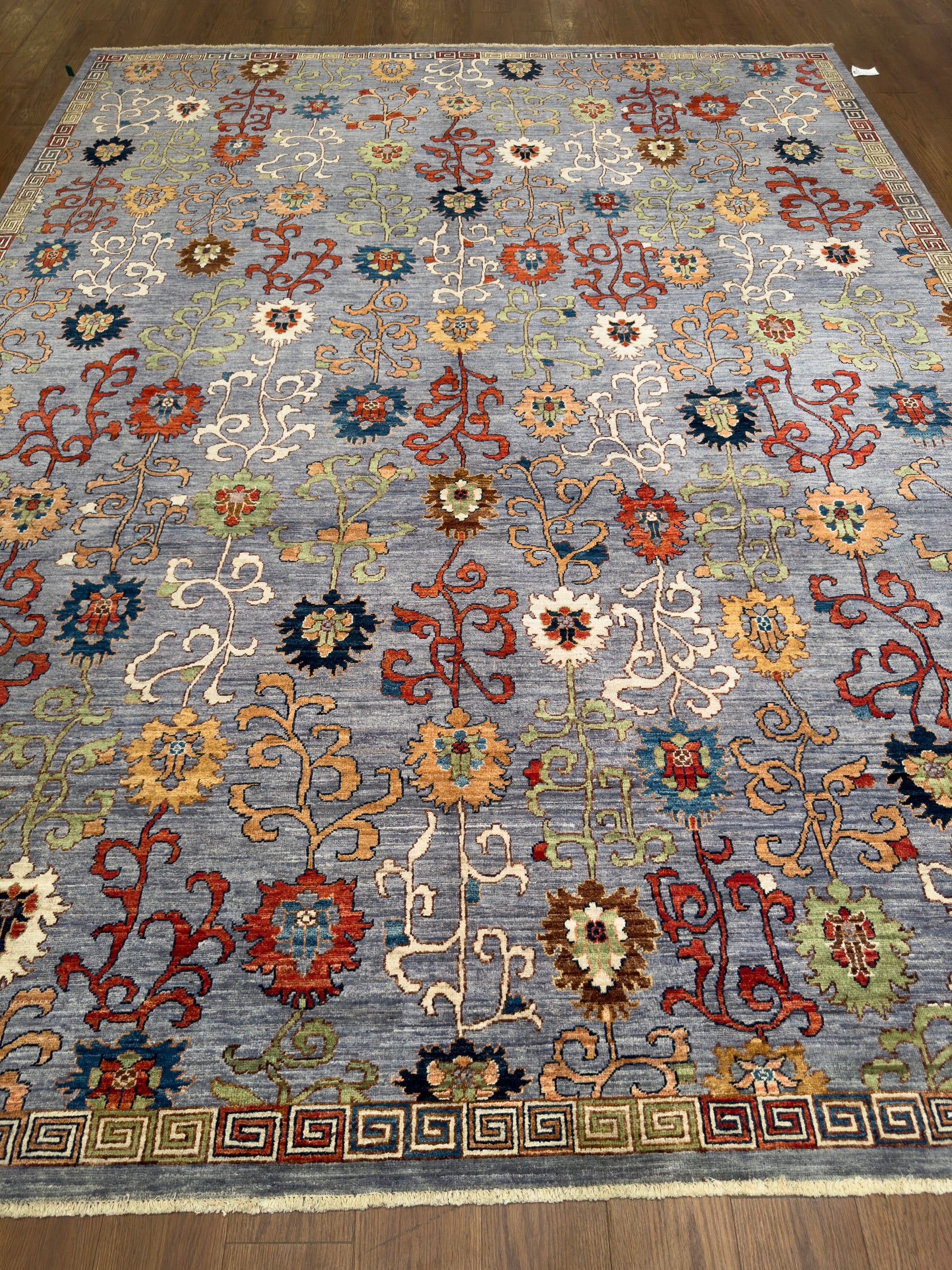 This dynamic hand-knotted rug features a slate-blue field covered in scrolling vine motifs and stylized floral medallions in vivid shades of red, gold, ivory, and teal. The allover design flows with rhythmic energy, while the motifs are given space to stand out, creating both movement and harmony. A distinctive Greek key–inspired border frames the composition, adding a touch of geometric refinement that contrasts beautifully with the organic interior. The bold palette and lively arrangement give this piece a striking character, perfect for eclectic living rooms, dining spaces, or statement-making interiors.