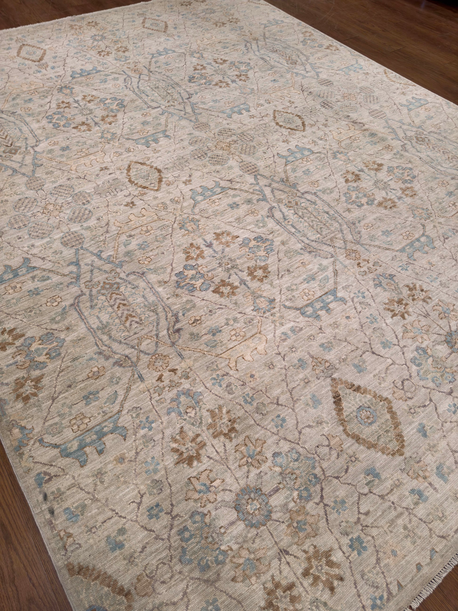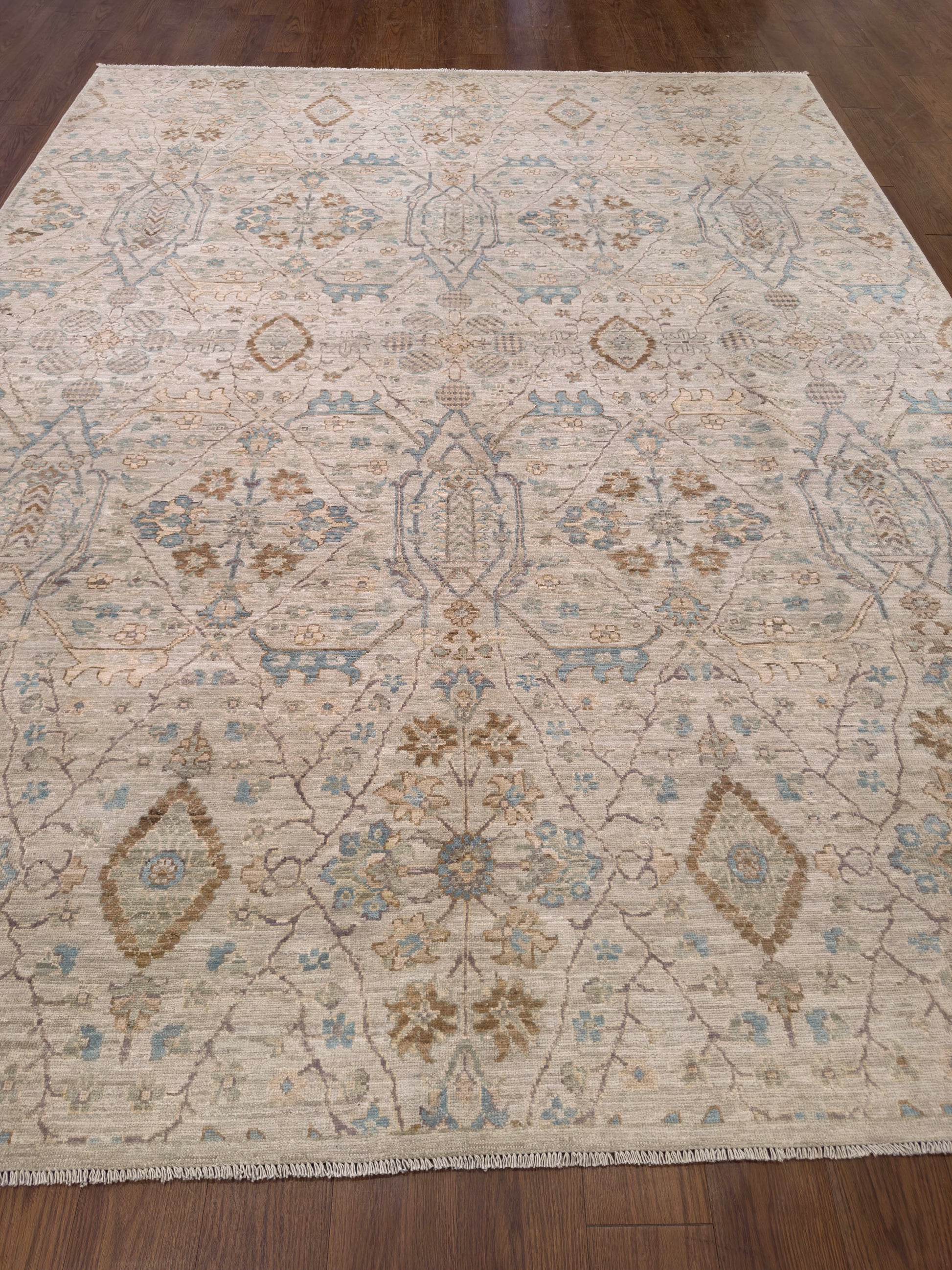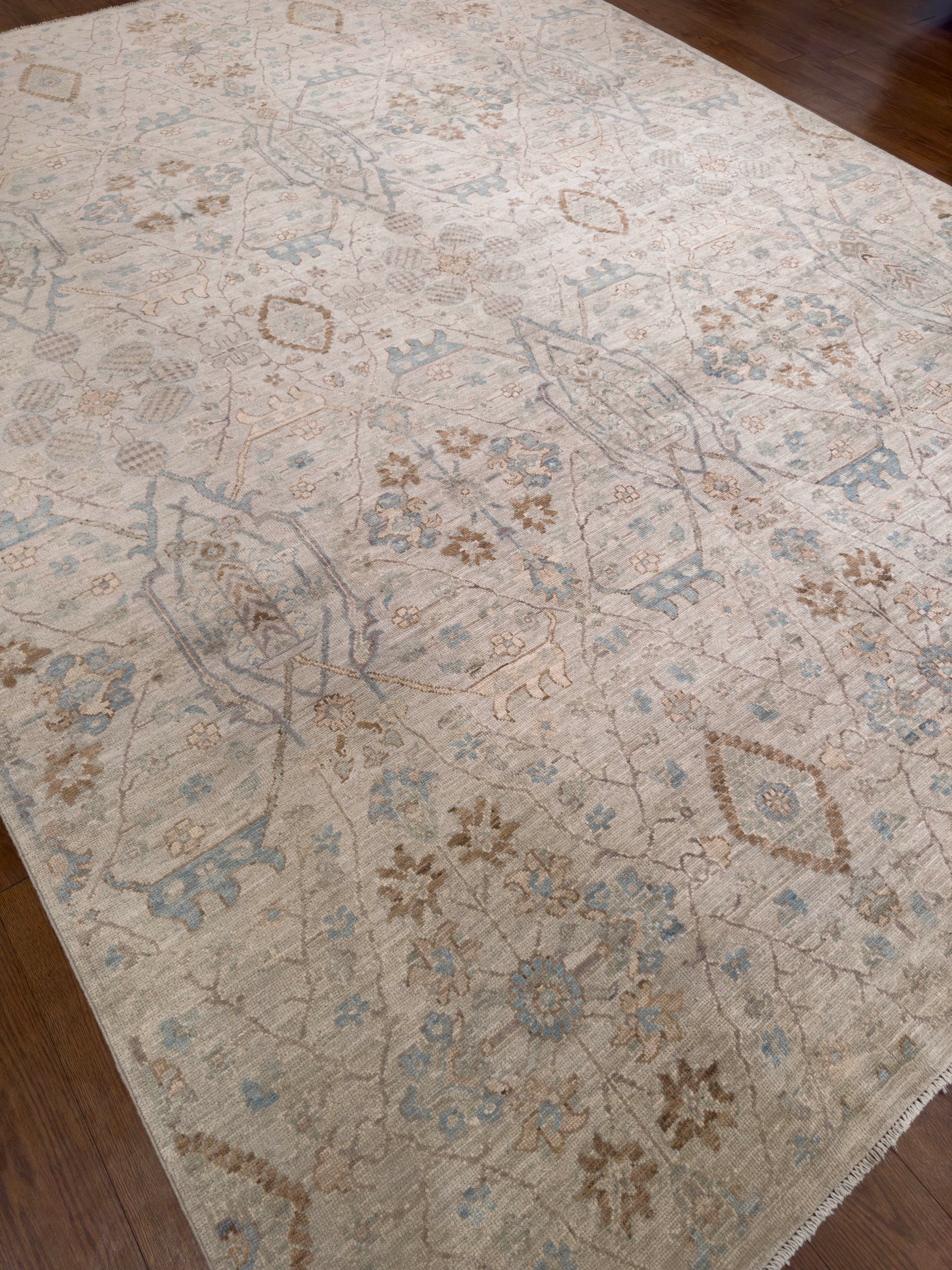 This refined hand-knotted rug features a soft ivory-beige field with an allover lattice of stylized floral medallions, palmettes, and delicate vine work in muted shades of sky blue, taupe, and sand. The balanced design is arranged with gentle symmetry, creating a graceful, harmonious composition. Its subtle palette and softly faded look give the rug a timeless, vintage-inspired character, while its openness and restraint make it adaptable to both formal and casual interiors. A versatile piece, it provides a calming and elegant foundation for living rooms, dining areas, or bedrooms.