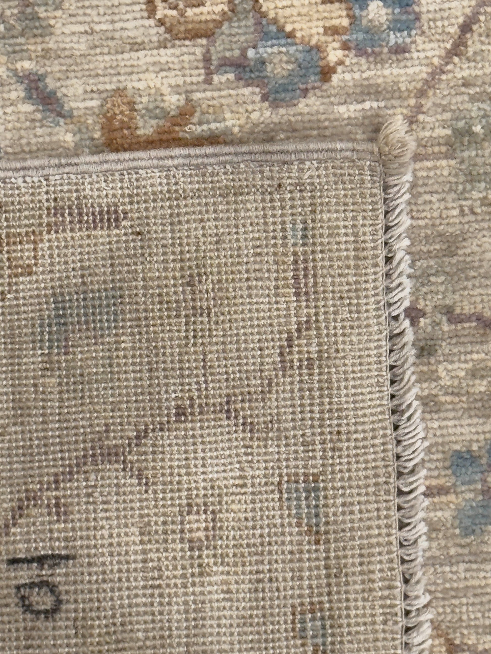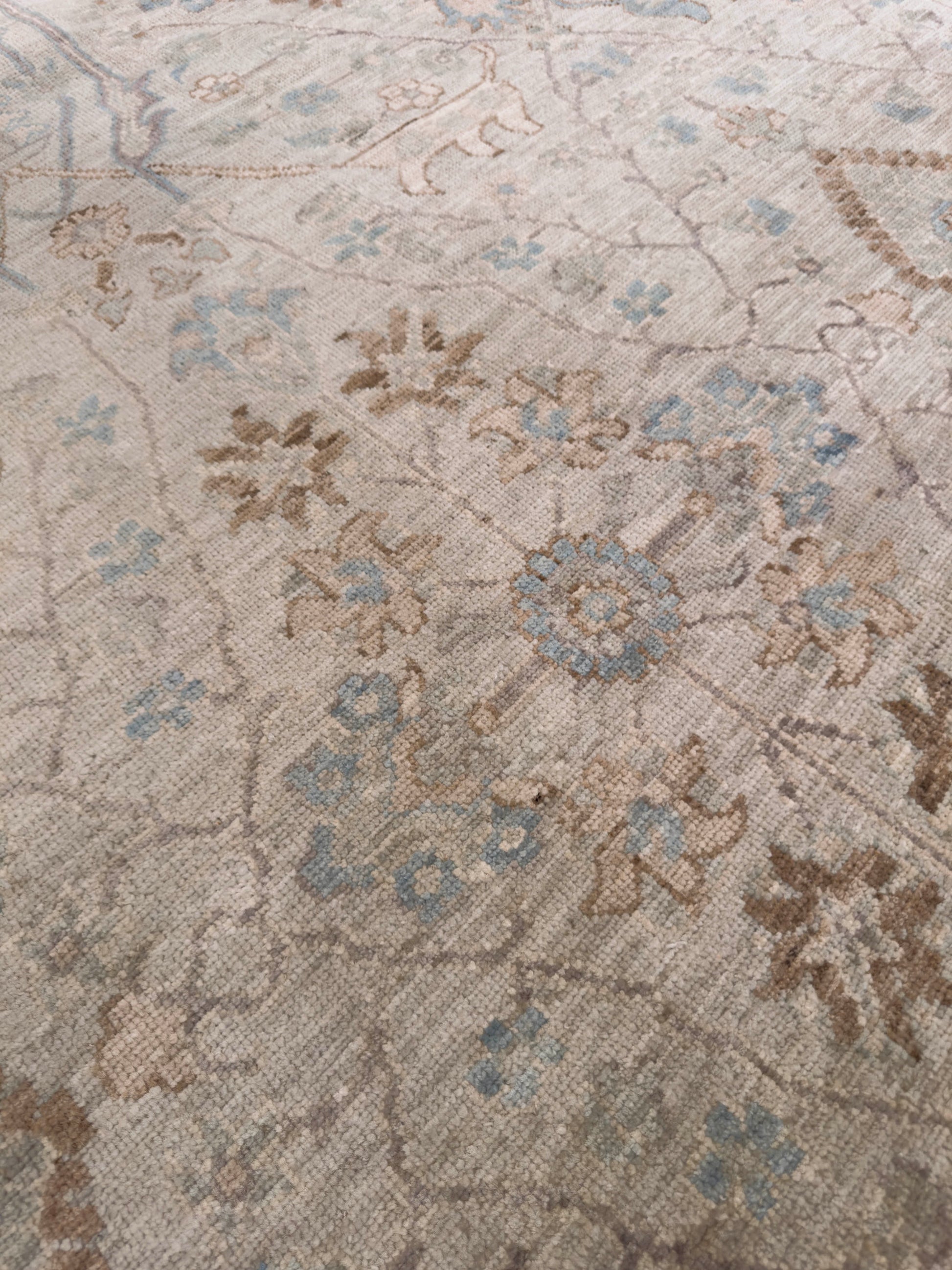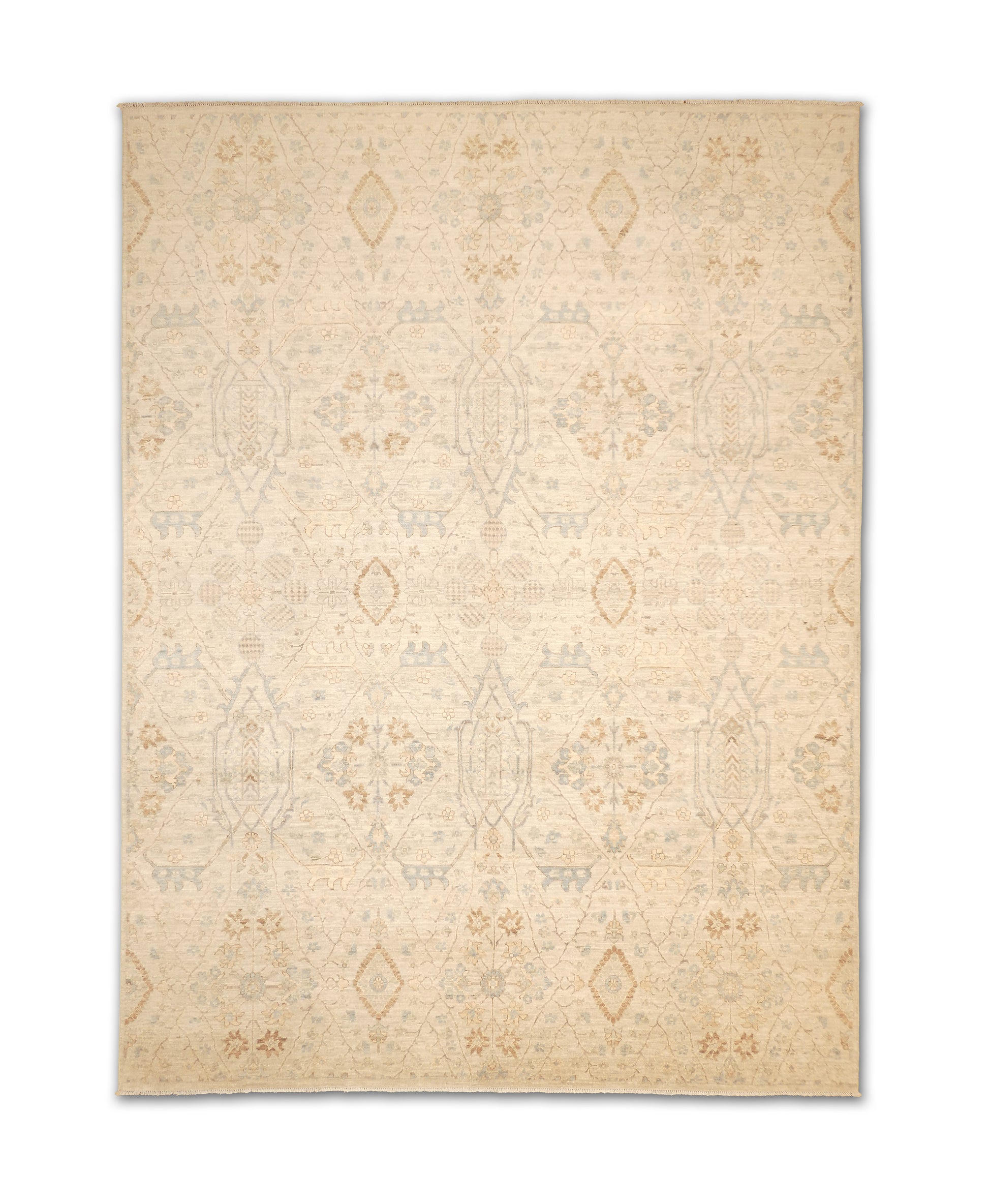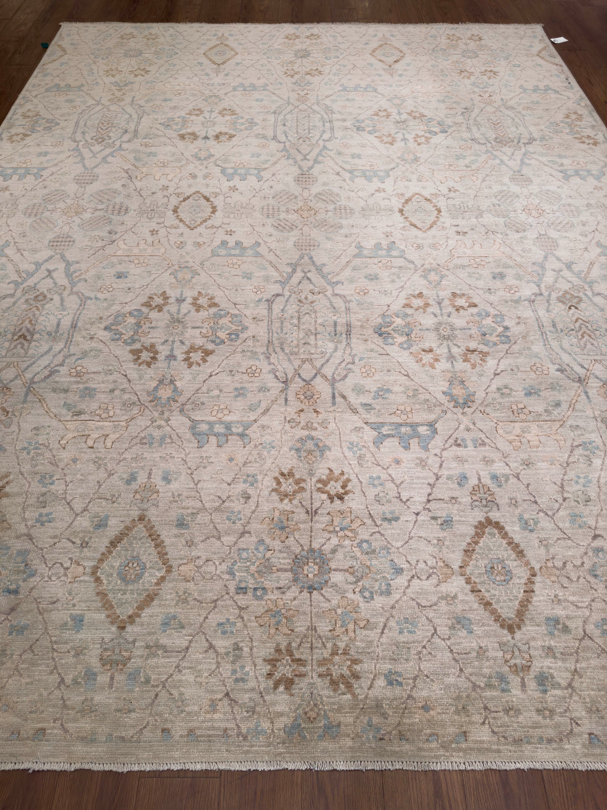 This refined hand-knotted rug features a soft ivory-beige field with an allover lattice of stylized floral medallions, palmettes, and delicate vine work in muted shades of sky blue, taupe, and sand. The balanced design is arranged with gentle symmetry, creating a graceful, harmonious composition. Its subtle palette and softly faded look give the rug a timeless, vintage-inspired character, while its openness and restraint make it adaptable to both formal and casual interiors. A versatile piece, it provides a calming and elegant foundation for living rooms, dining areas, or bedrooms.
