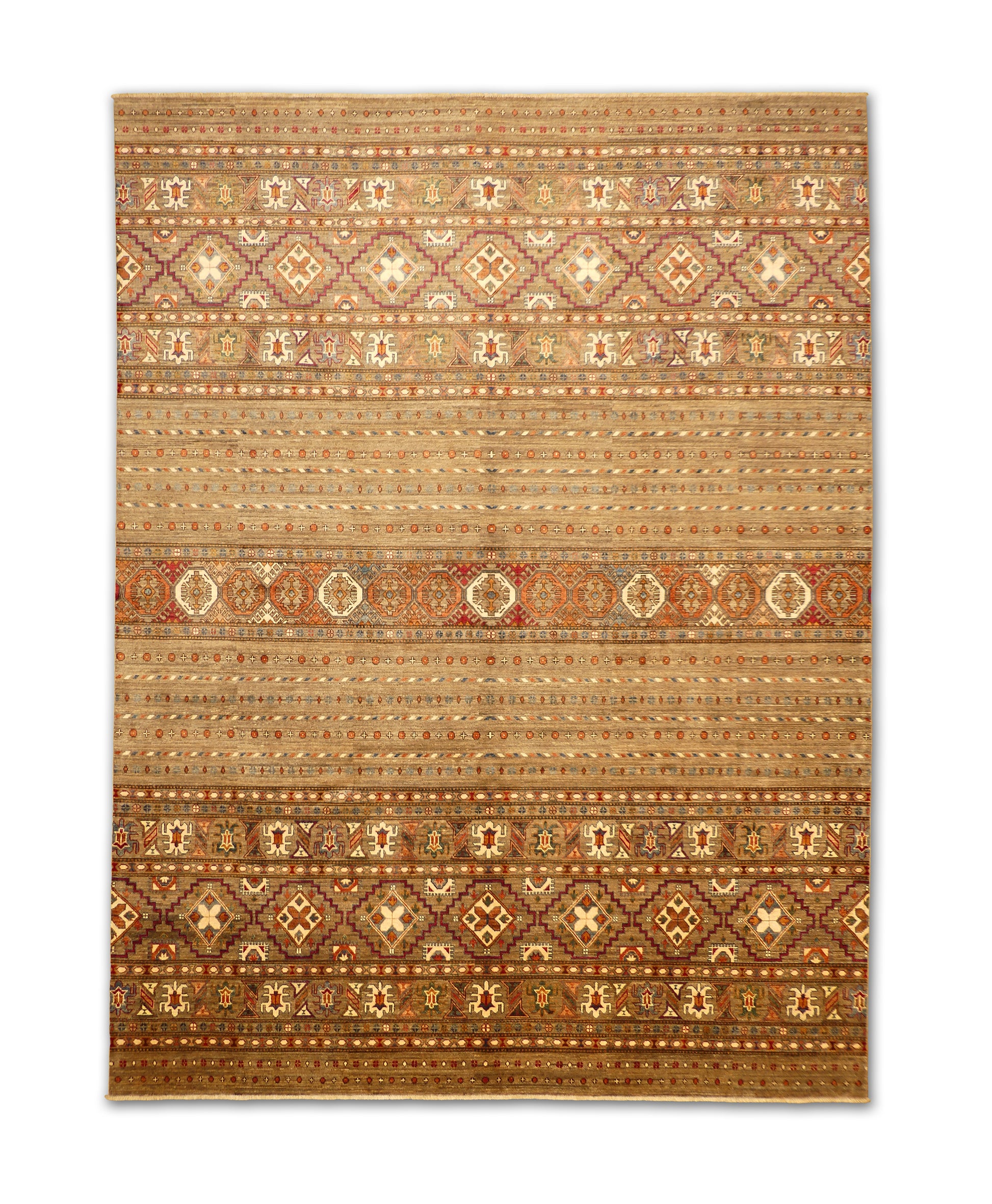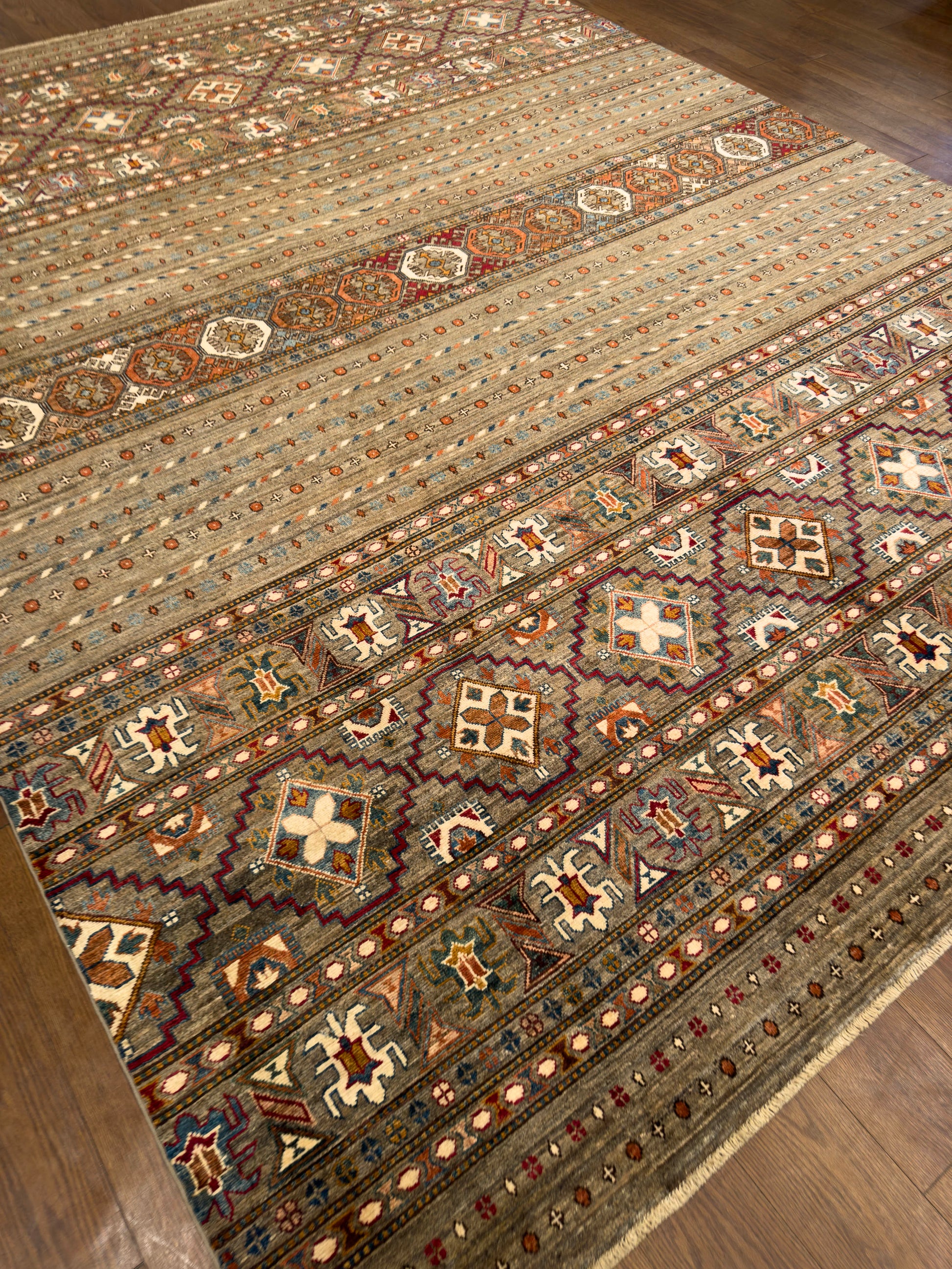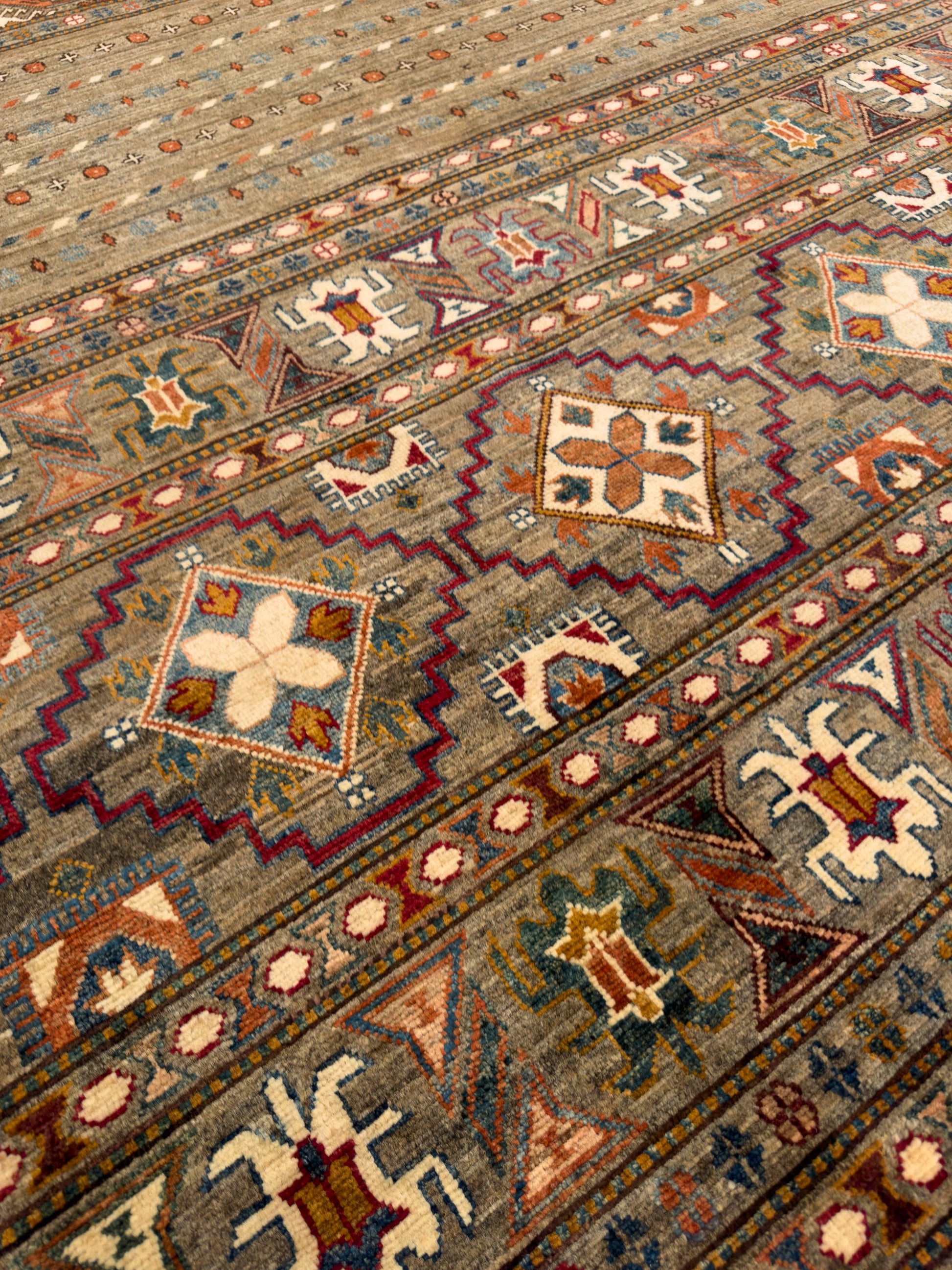 This hand-knotted rug presents a traditional caucasian shal, recognized by its horizontal banded layout. The taupe-brown field is arranged with alternating rows of octagonal medallions, diamond motifs, and small tribal symbols in ivory, rust, indigo, and golden ochre. Each stripe carries its own distinct rhythm, creating a visually layered effect that reflects the heritage of Caucasian weaving. The rug’s narrow guard stripes and patterned borders tie the design together, adding depth and refinement. Bold yet earthy, this piece makes a striking addition to rustic, eclectic, or heritage-inspired interiors.