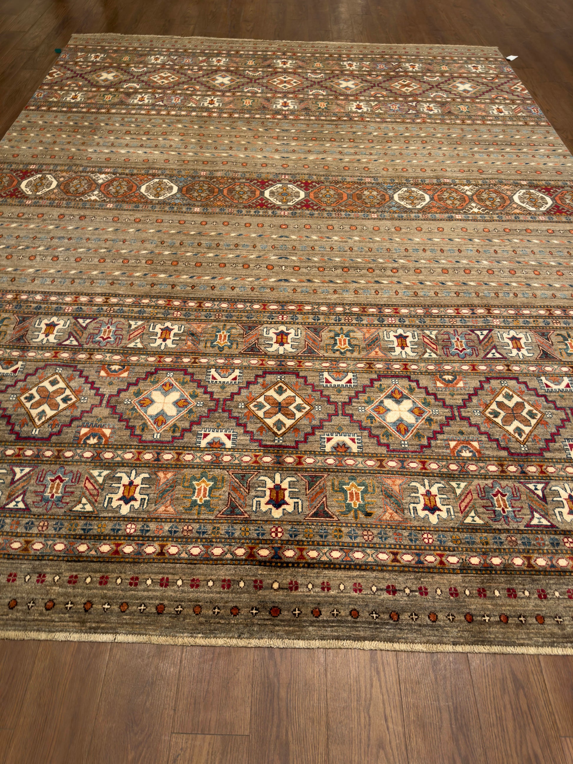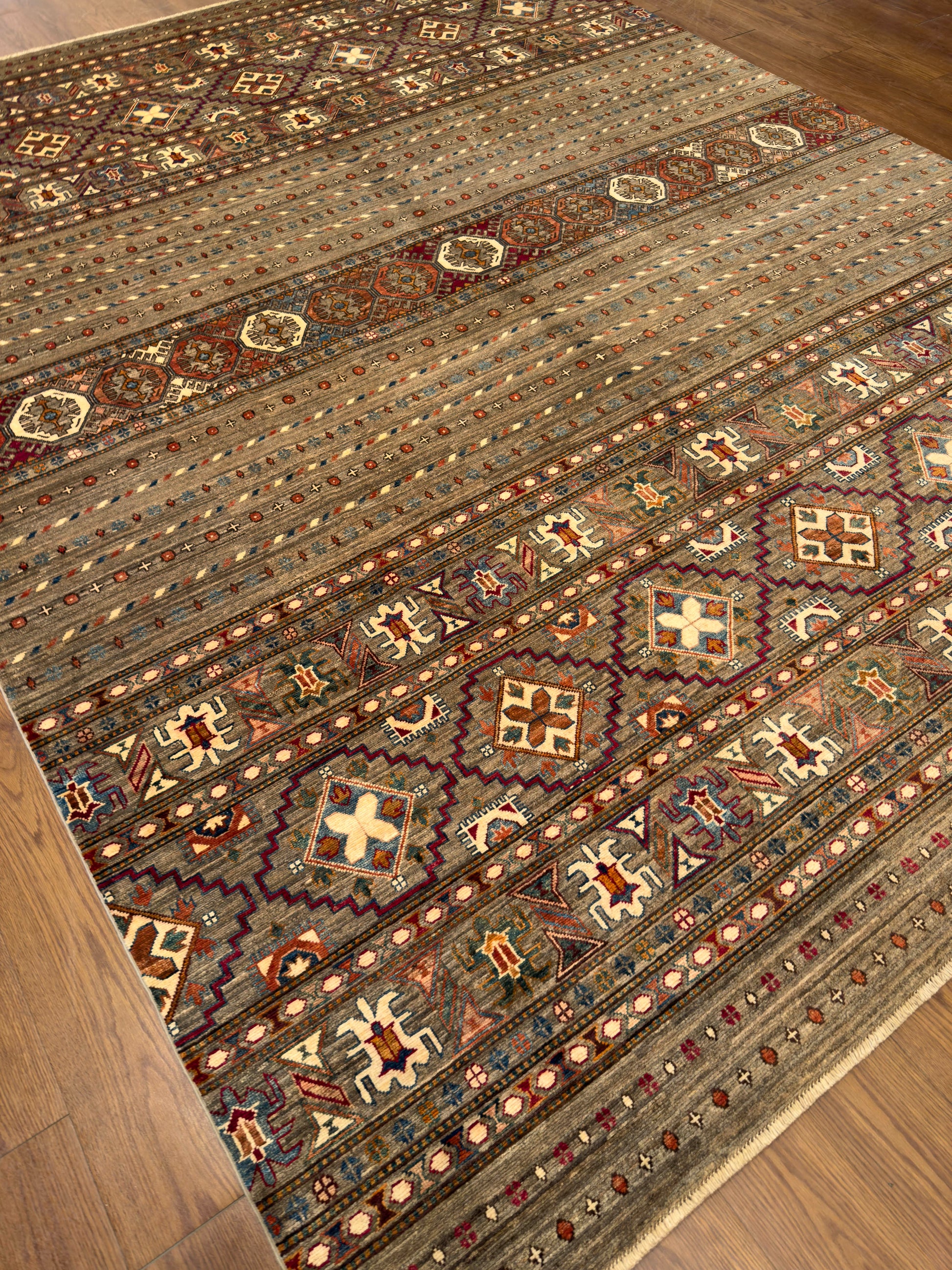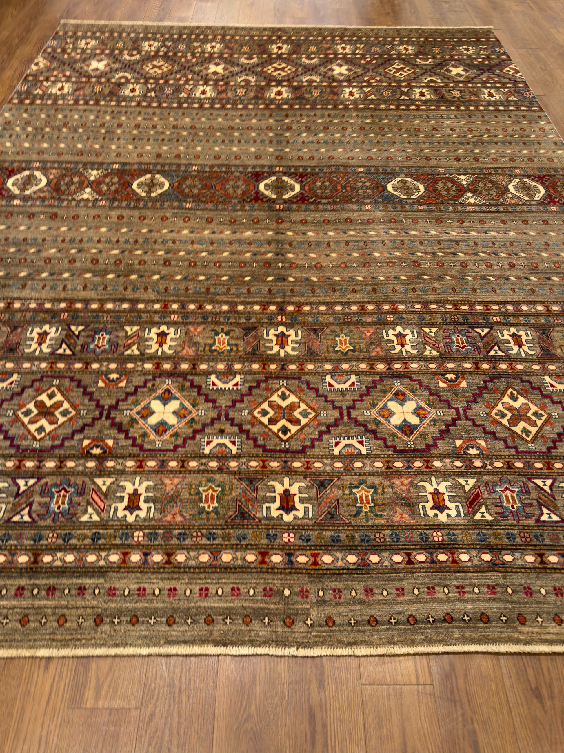 This hand-knotted rug presents a traditional caucasian shal, recognized by its horizontal banded layout. The taupe-brown field is arranged with alternating rows of octagonal medallions, diamond motifs, and small tribal symbols in ivory, rust, indigo, and golden ochre. Each stripe carries its own distinct rhythm, creating a visually layered effect that reflects the heritage of Caucasian weaving. The rug’s narrow guard stripes and patterned borders tie the design together, adding depth and refinement. Bold yet earthy, this piece makes a striking addition to rustic, eclectic, or heritage-inspired interiors.