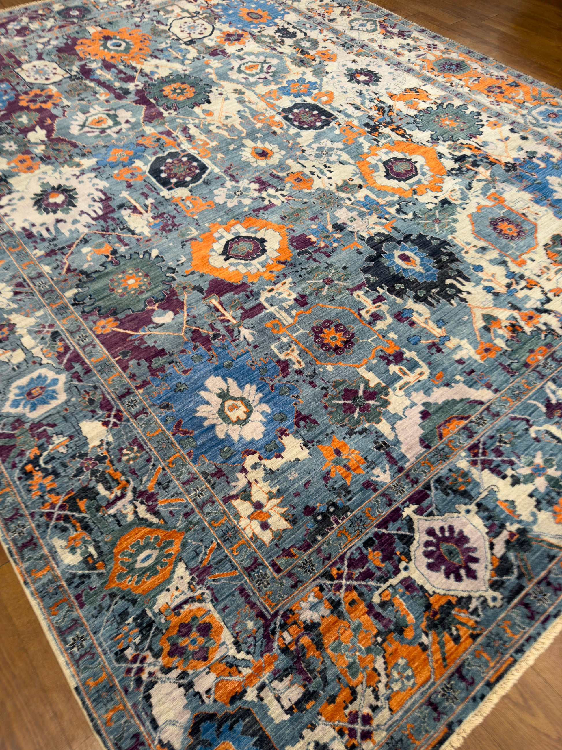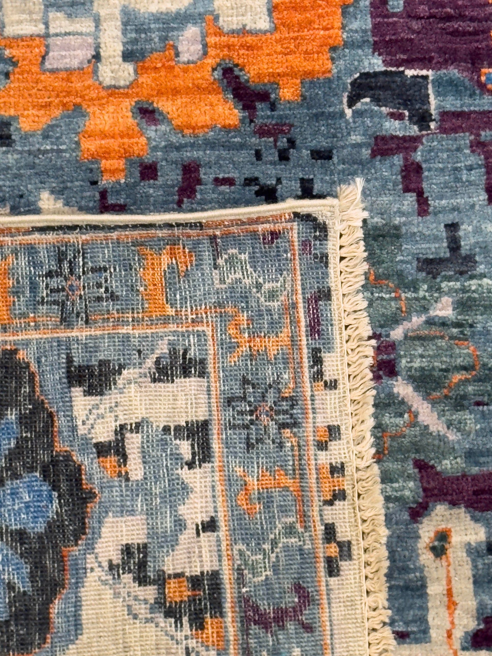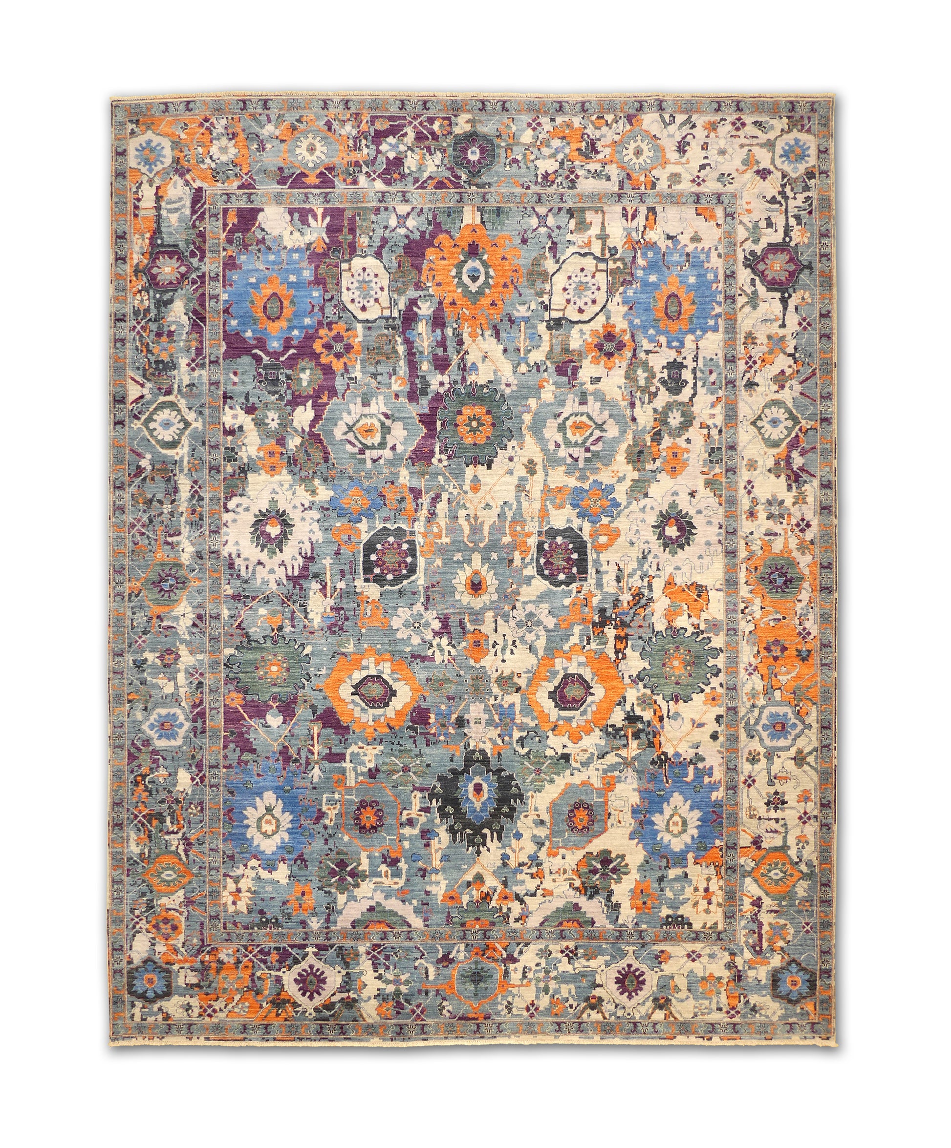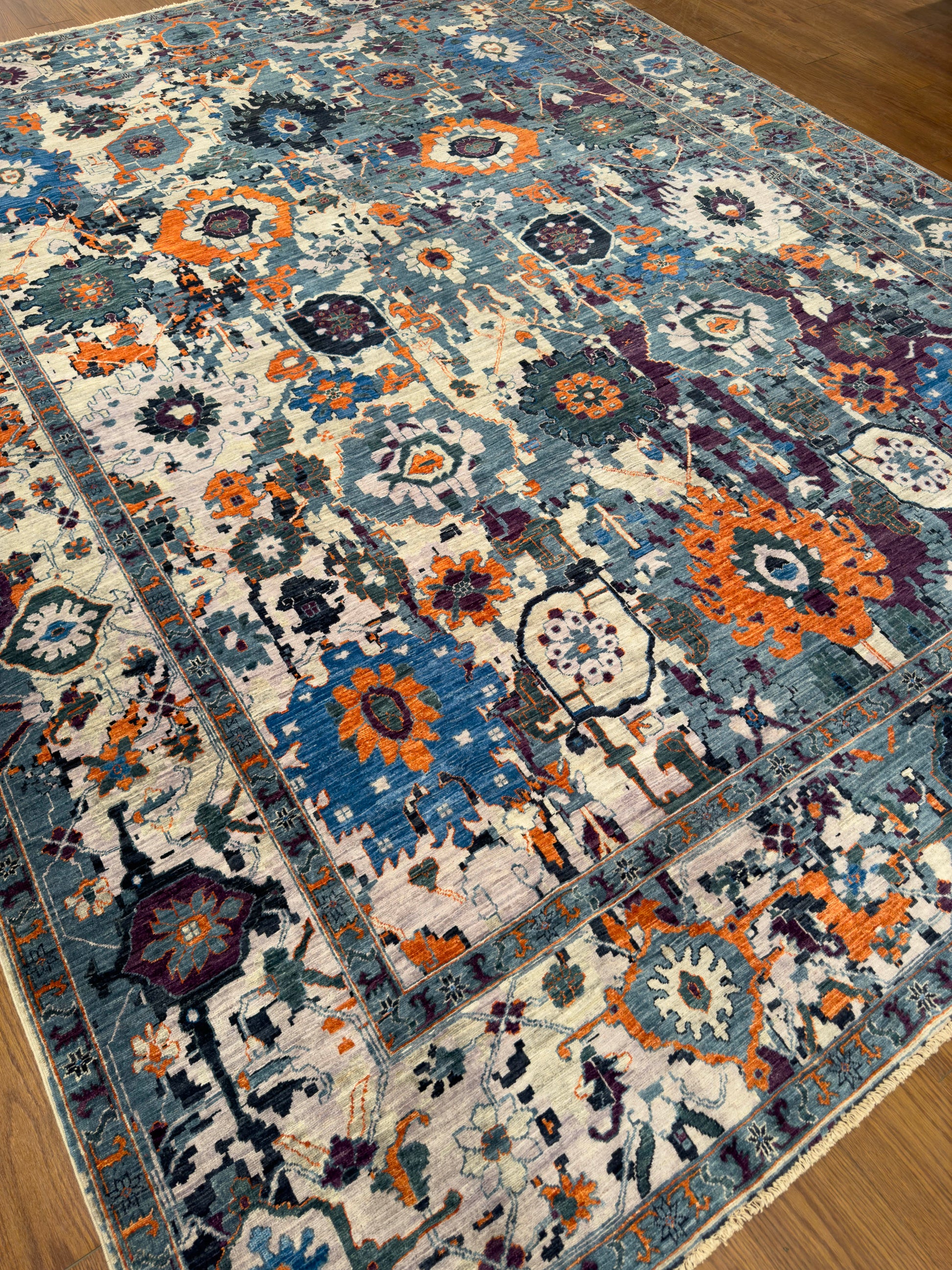 This vibrant hand-knotted rug showcases a lively palette of teal-blue, ivory, burnt orange, and deep plum across a dynamic allover pattern. Stylized floral rosettes and geometric medallions are arranged with bold contrast, creating a rich sense of movement and rhythm. The layered border, with alternating floral and angular motifs, frames the energetic composition, making it a striking centerpiece for eclectic, modern, or transitional interiors.