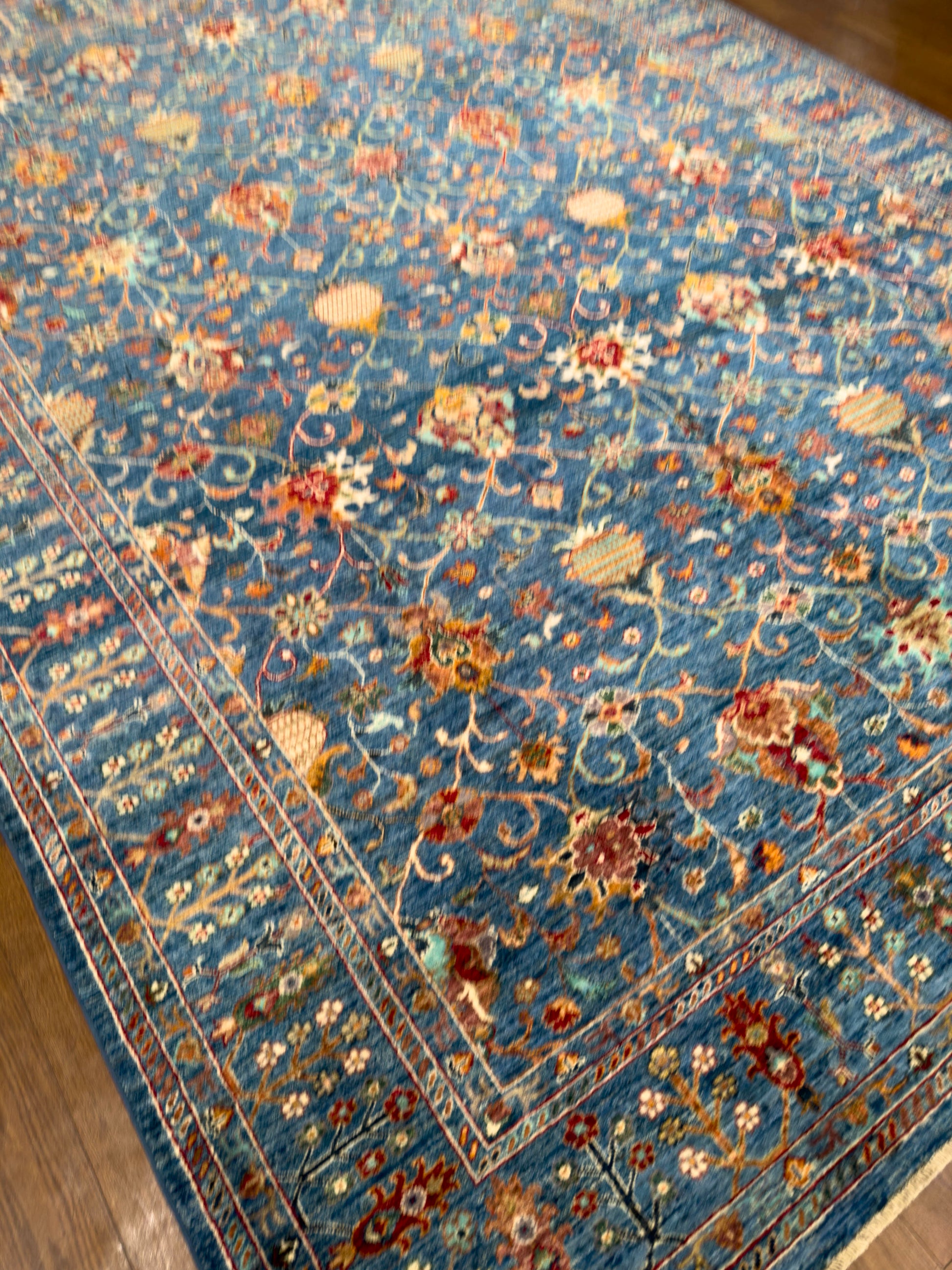 This hand-knotted rug displays a luminous blue field filled with a repeating lattice of flowering vines, palmettes, and stylized pomegranate motifs. The rich palette of crimson red, golden ochre, ivory, and soft green creates depth and vibrancy, while the finely detailed vines flow rhythmically across the surface. A layered border of floral sprays and narrow guard stripes frames the field, enhancing the rug’s balance and symmetry. Its elegant yet lively character makes it a versatile piece for formal living rooms, dining spaces, or eclectic interiors seeking refined artistry.