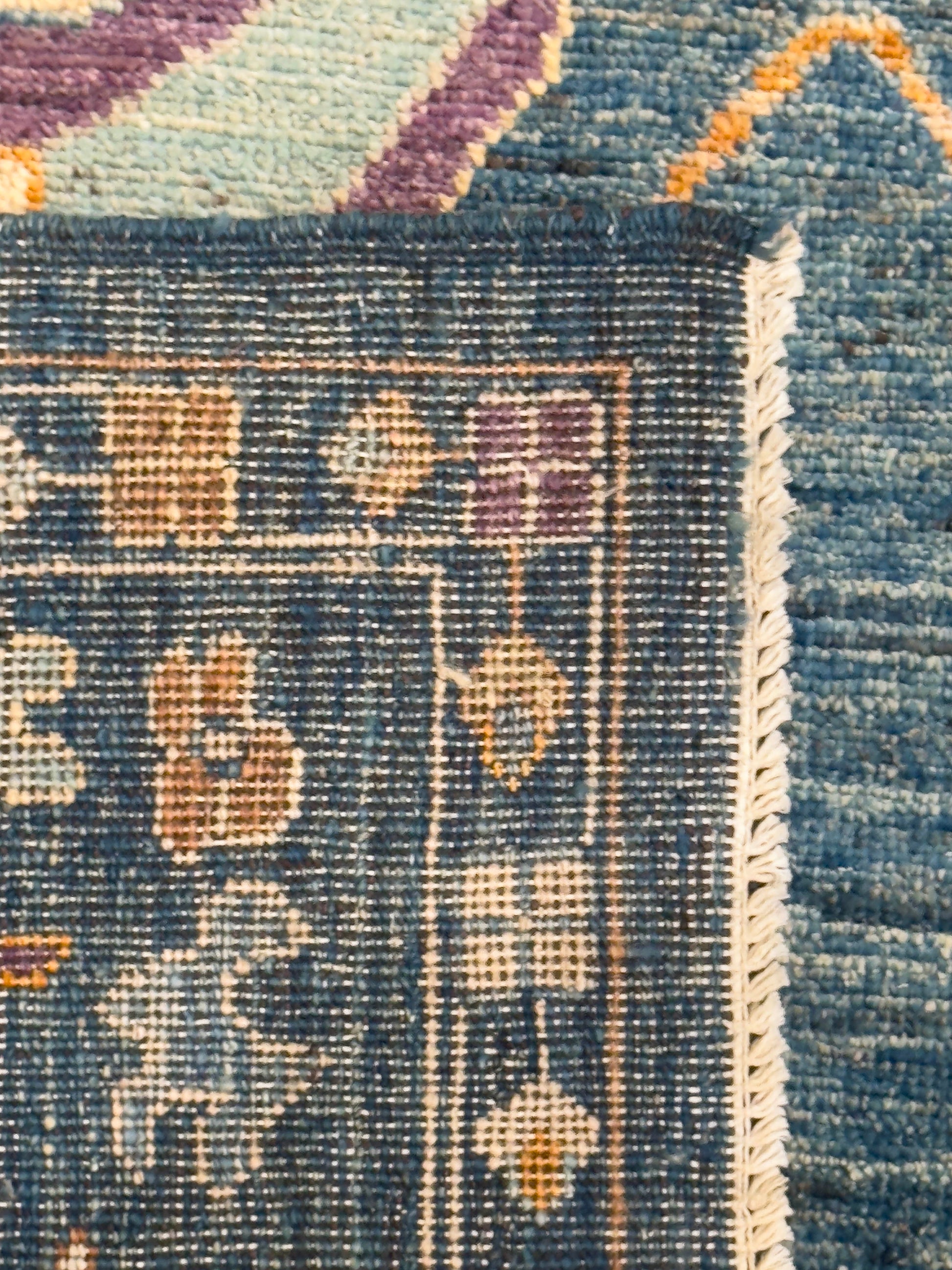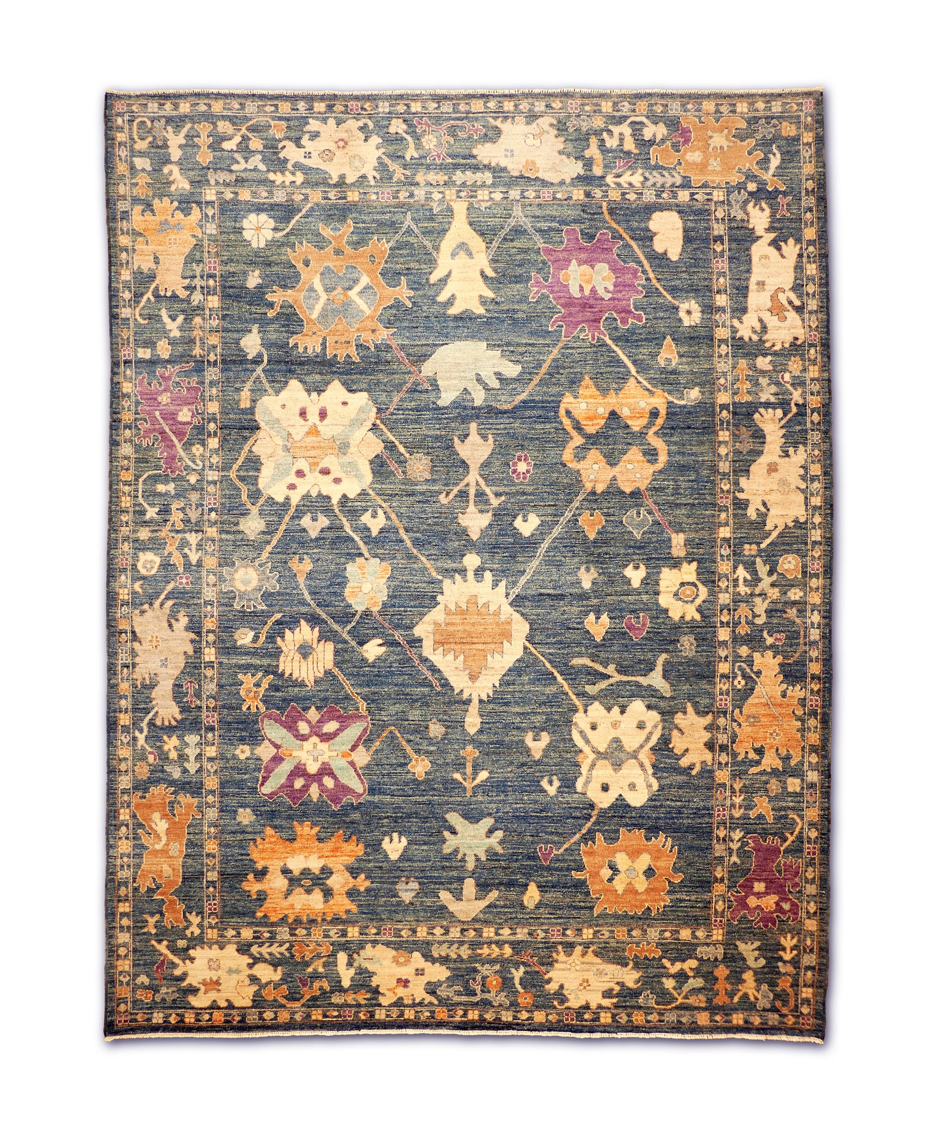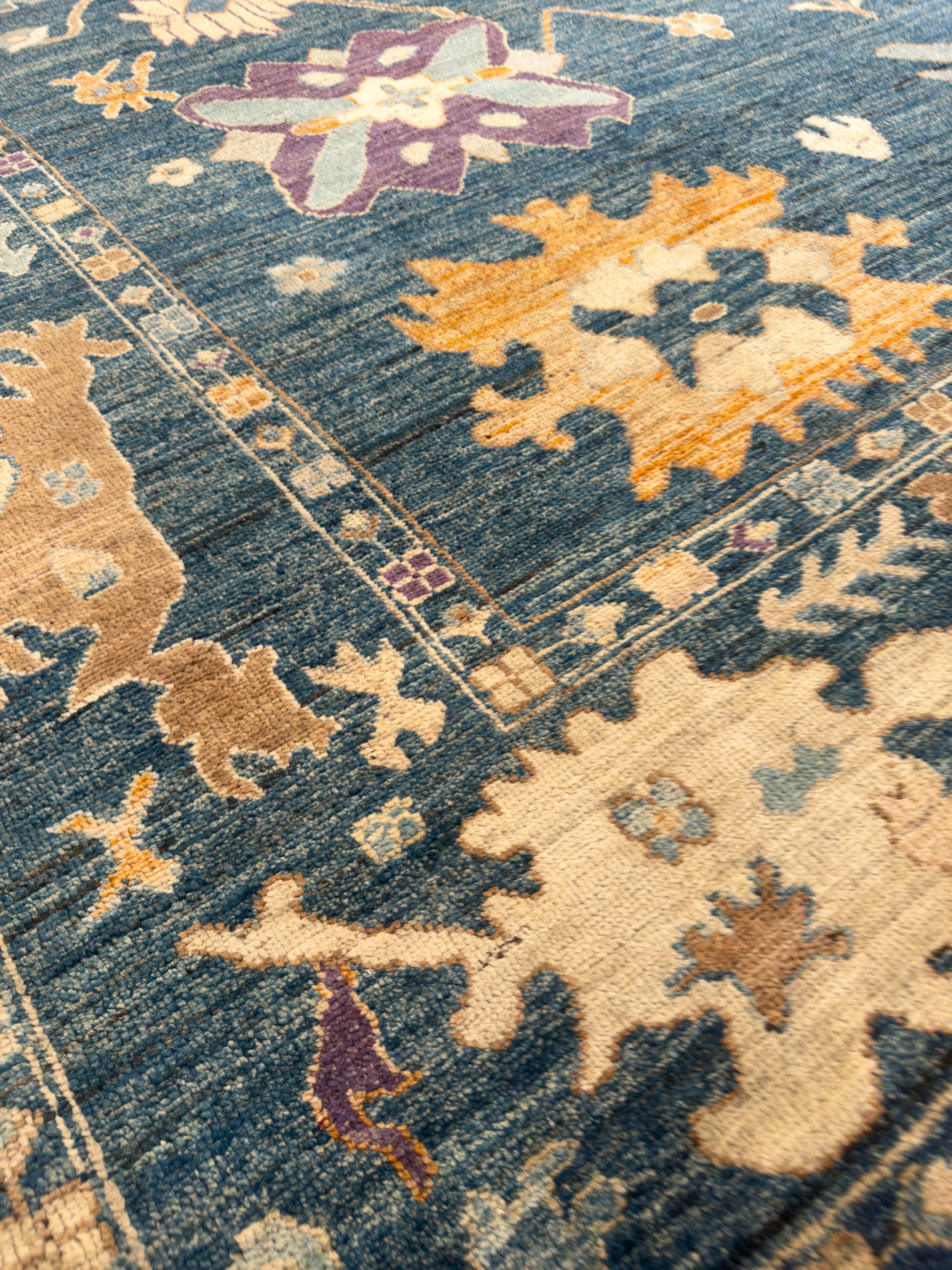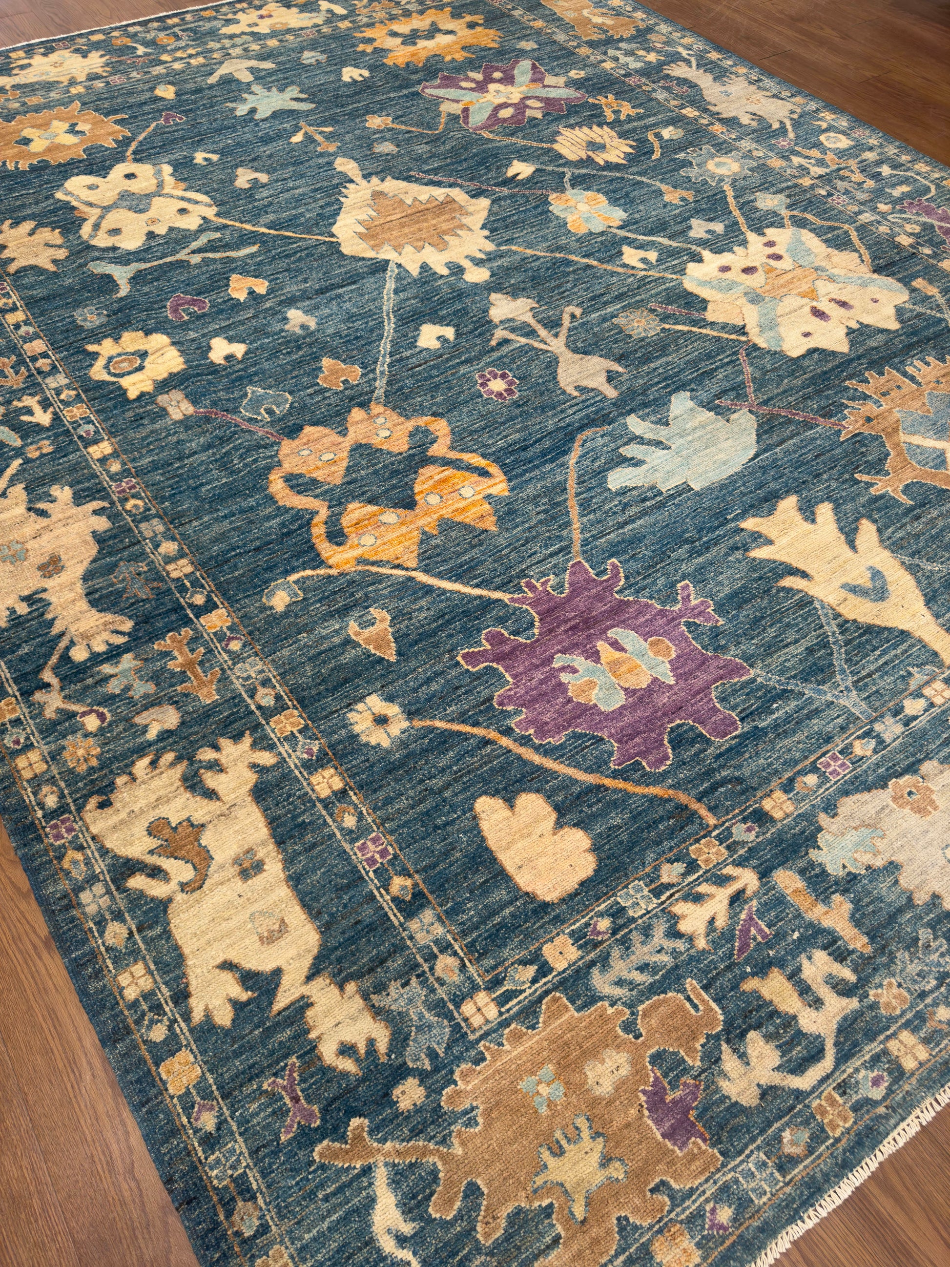 This hand-knotted rug showcases a deep teal-blue field decorated with large-scale botanical and geometric motifs in warm tones of gold, ivory, plum, and soft blue. The playful, oversized forms are arranged with an open, airy spacing that highlights each motif individually. A narrow border filled with small repeating elements frames the design, giving balance without overpowering the bold interior. Its striking color contrast and casual elegance make it a versatile piece for transitional, eclectic, or modern interiors.
