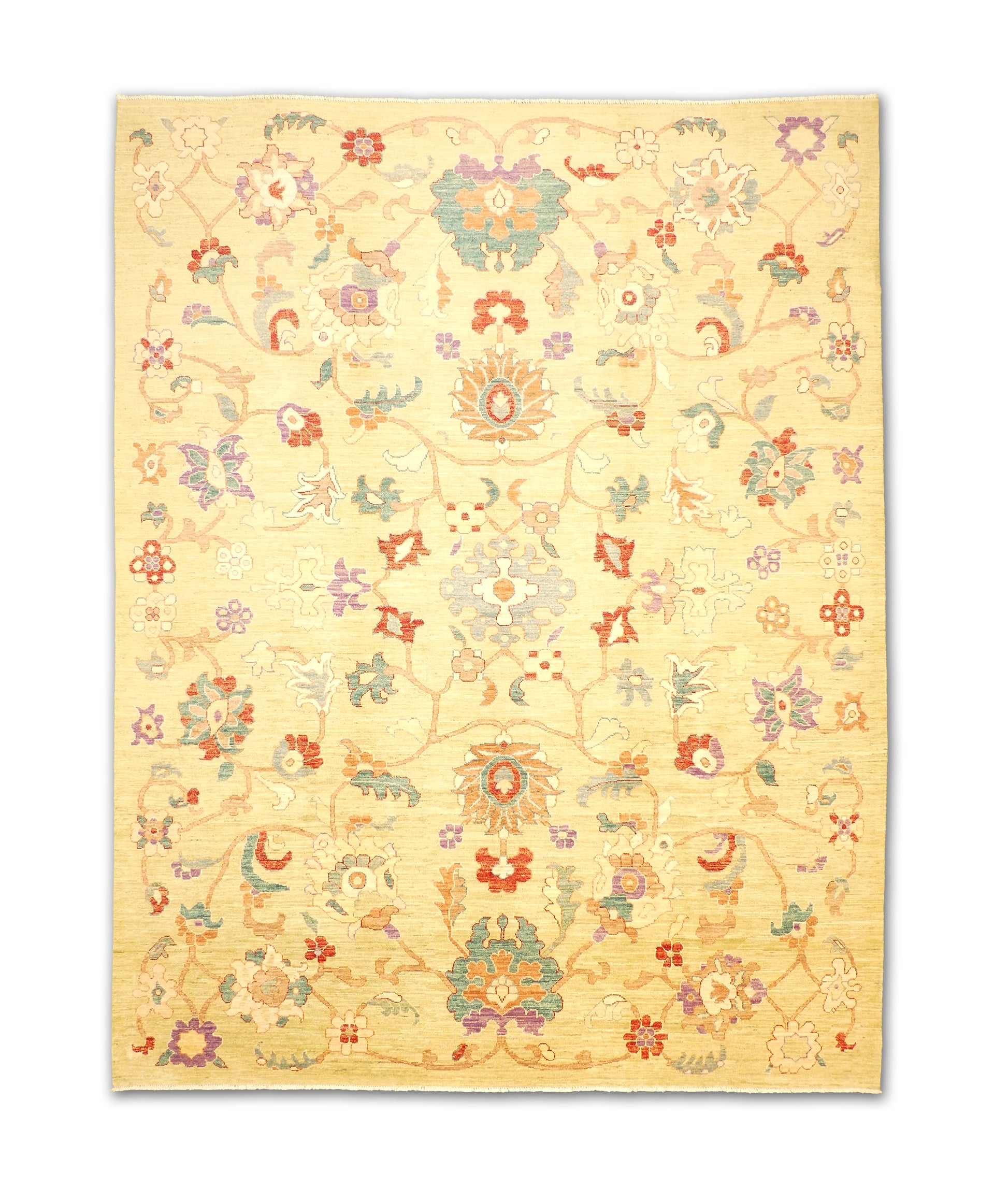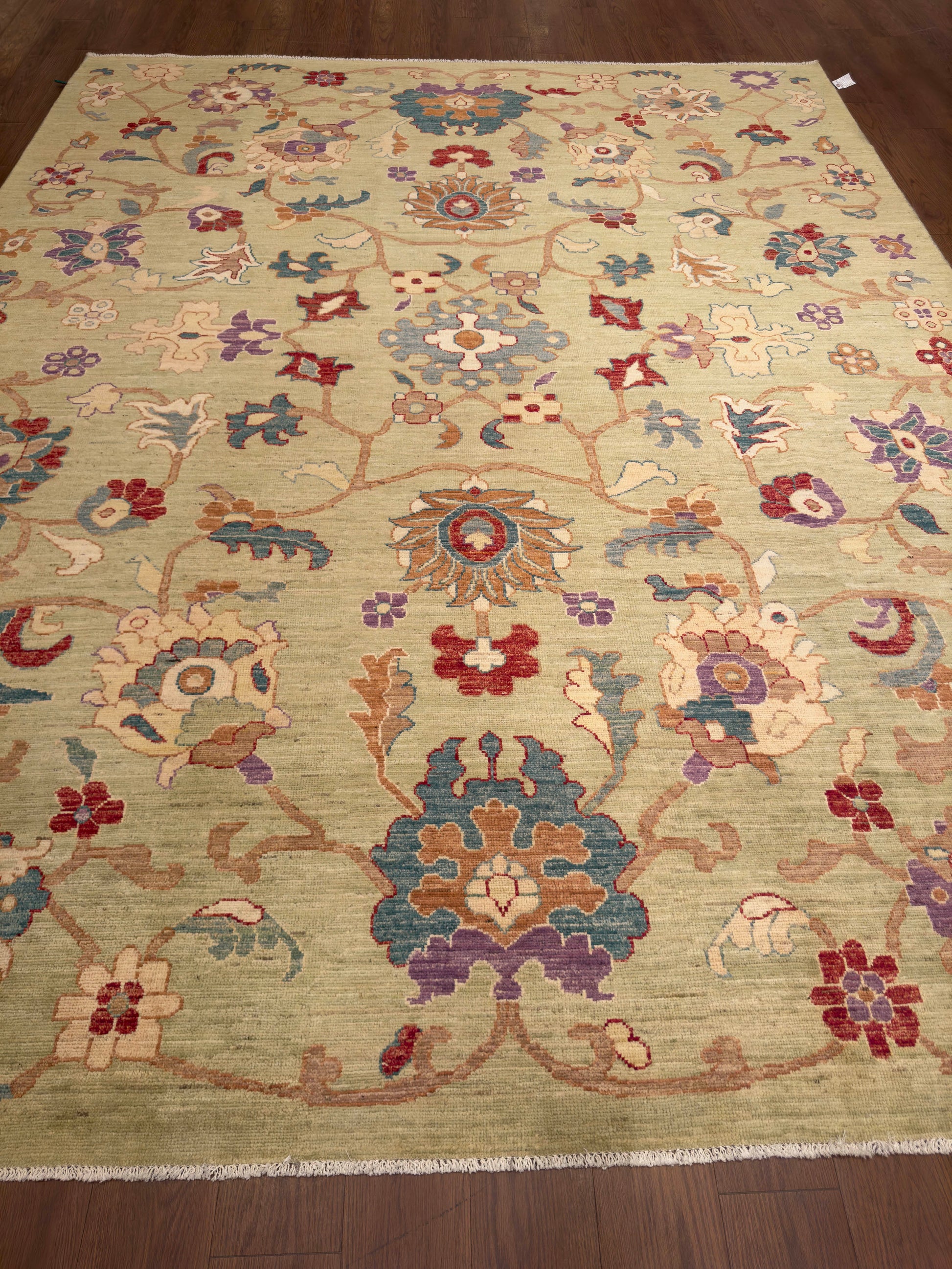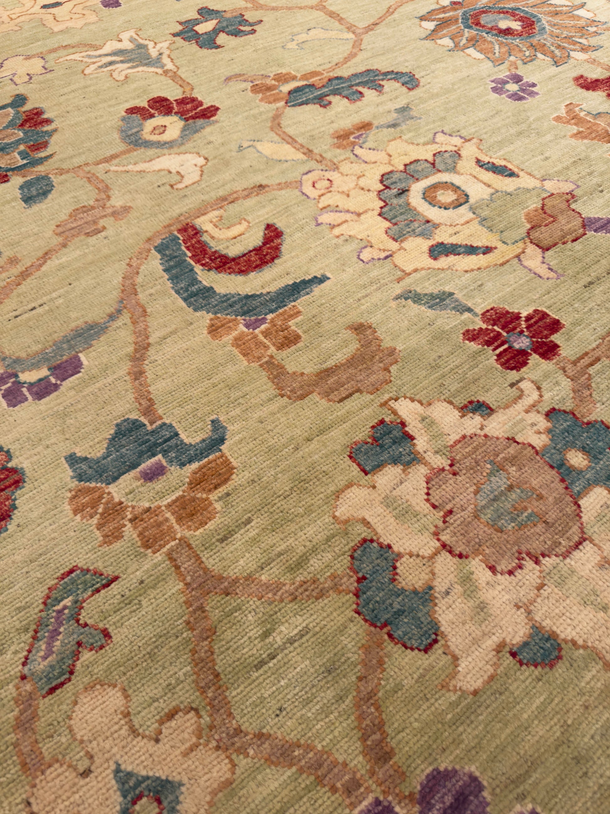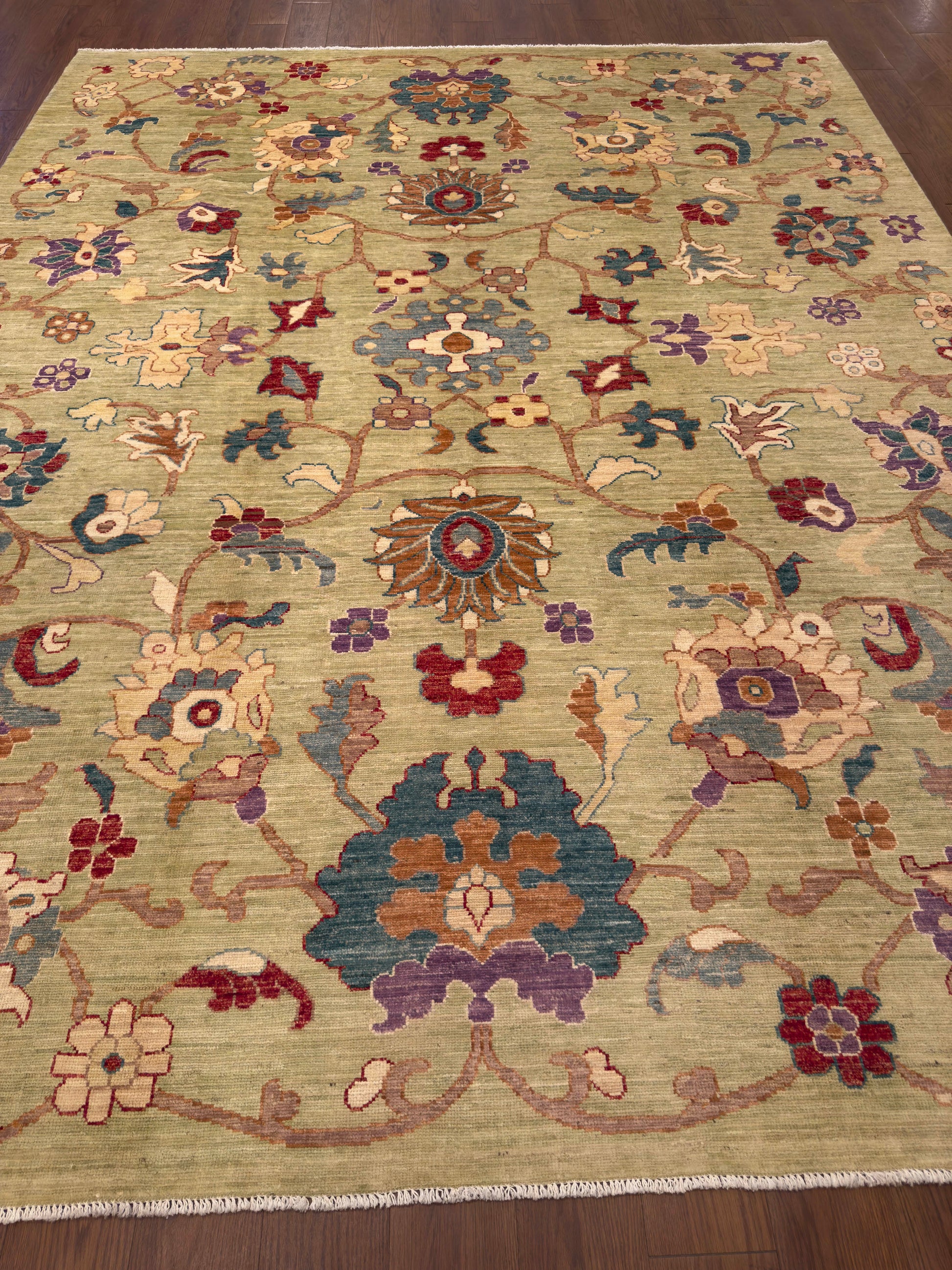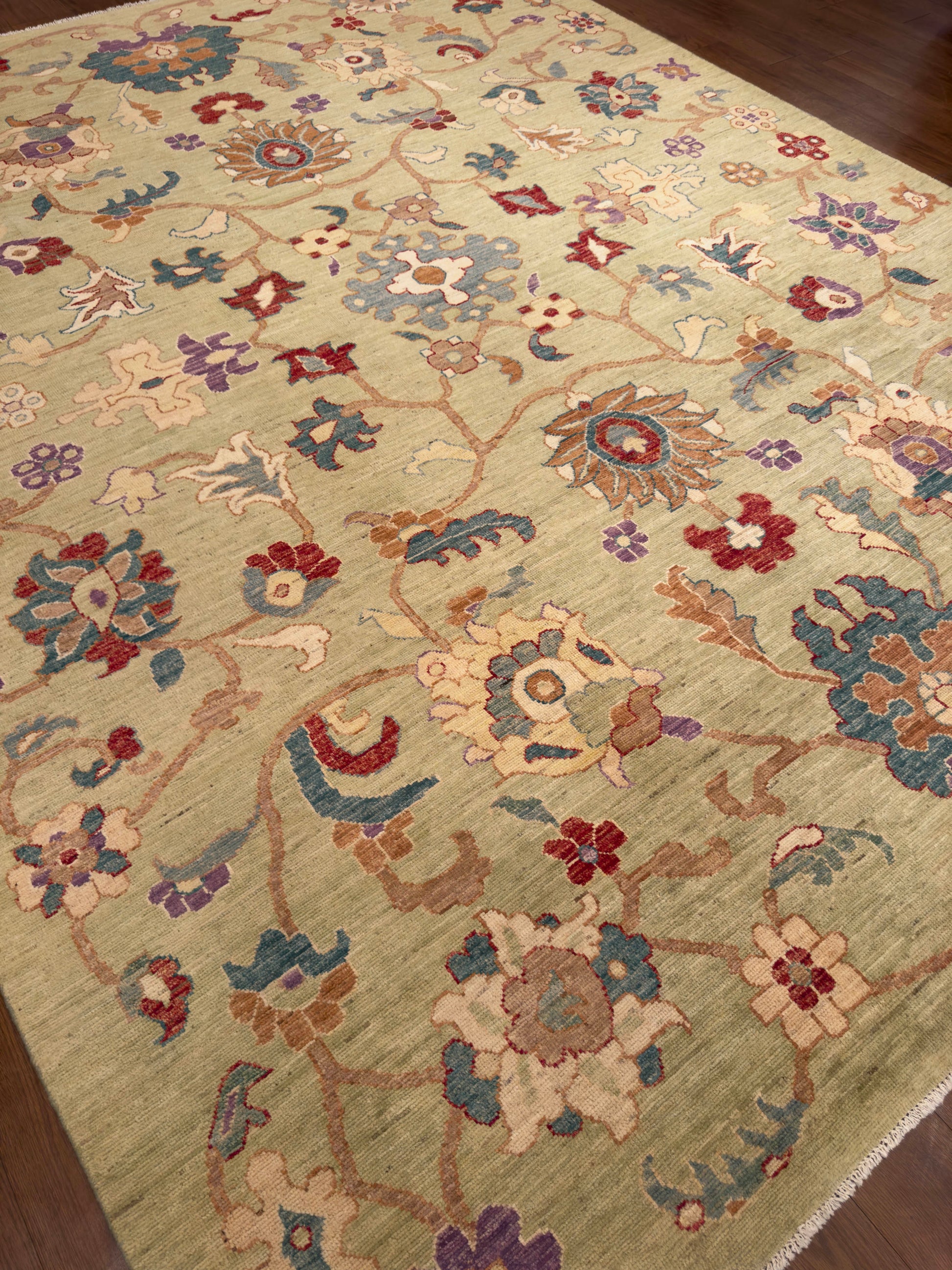 This hand-knotted rug presents a warm olive-green field adorned with large-scale floral and vine motifs in shades of red, blue, ivory, gold, and plum. The design flows with a graceful symmetry, where bold blossoms and curling leaves create a lively yet balanced rhythm. The earthy ground contrasts beautifully with the jewel-toned accents, lending both warmth and vibrancy to the composition. Its inviting palette makes it a versatile choice for traditional, transitional, or eclectic interiors.