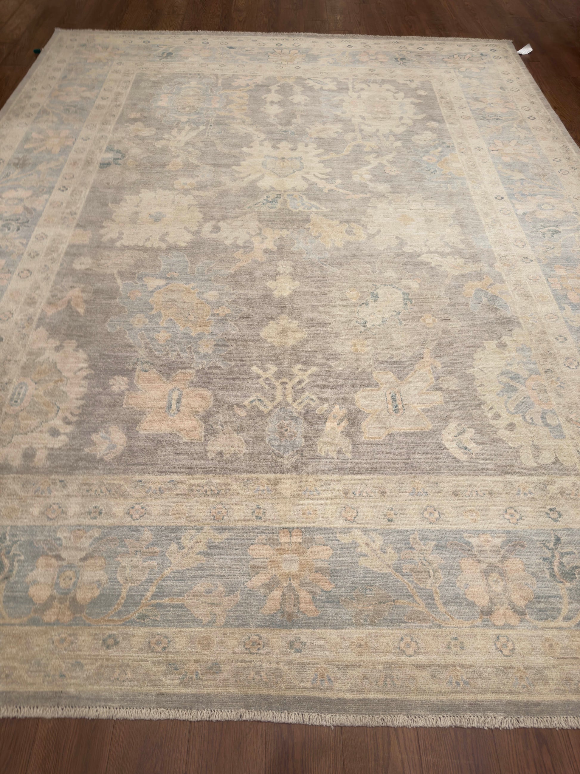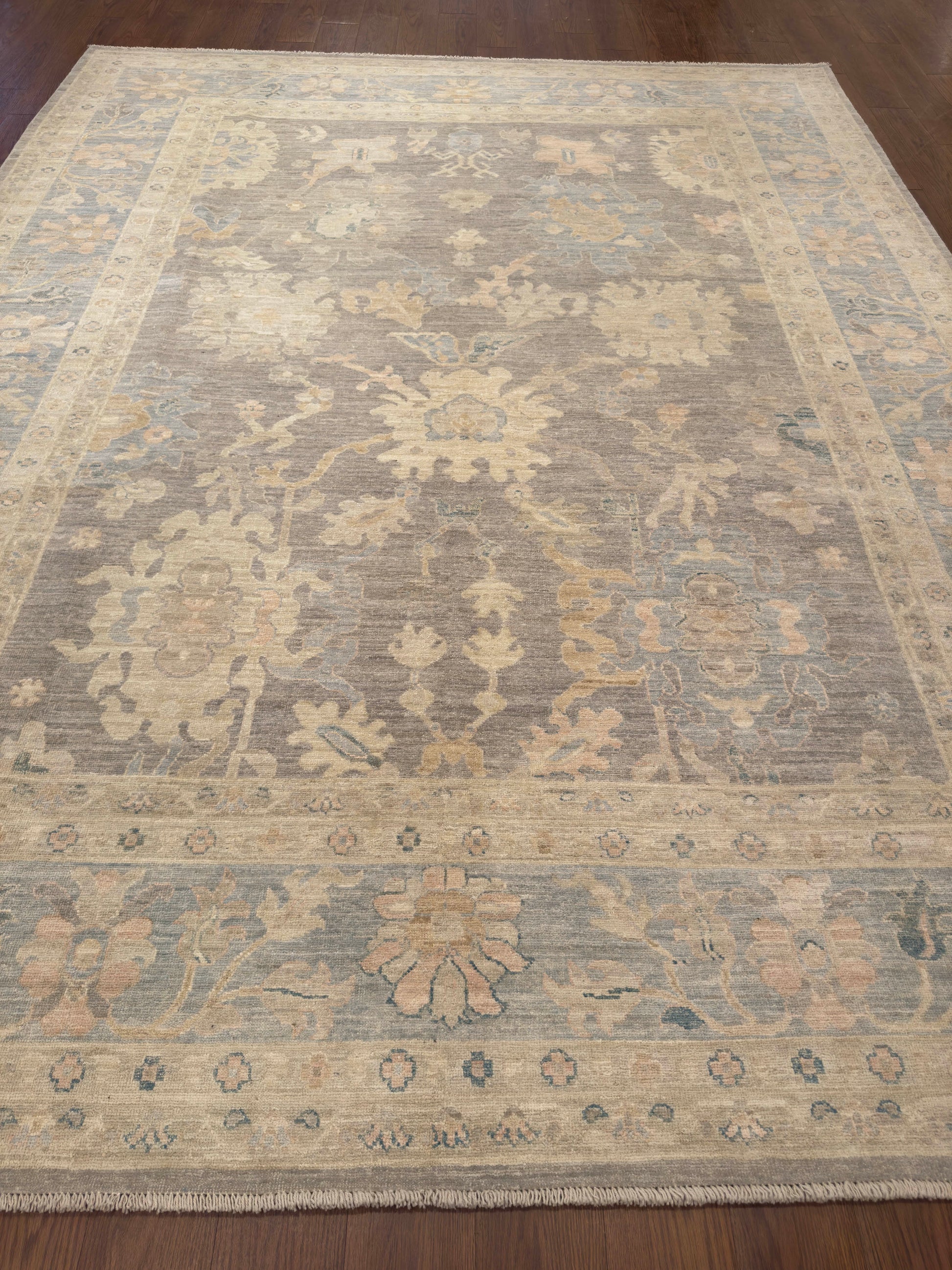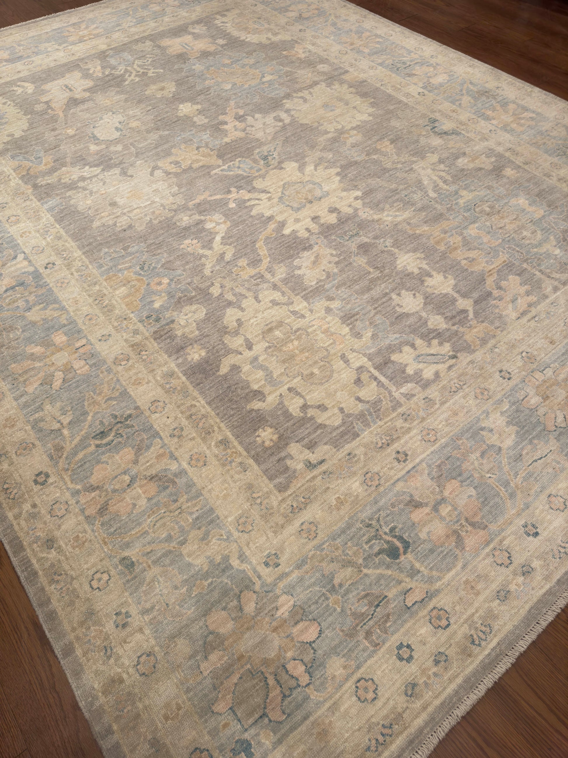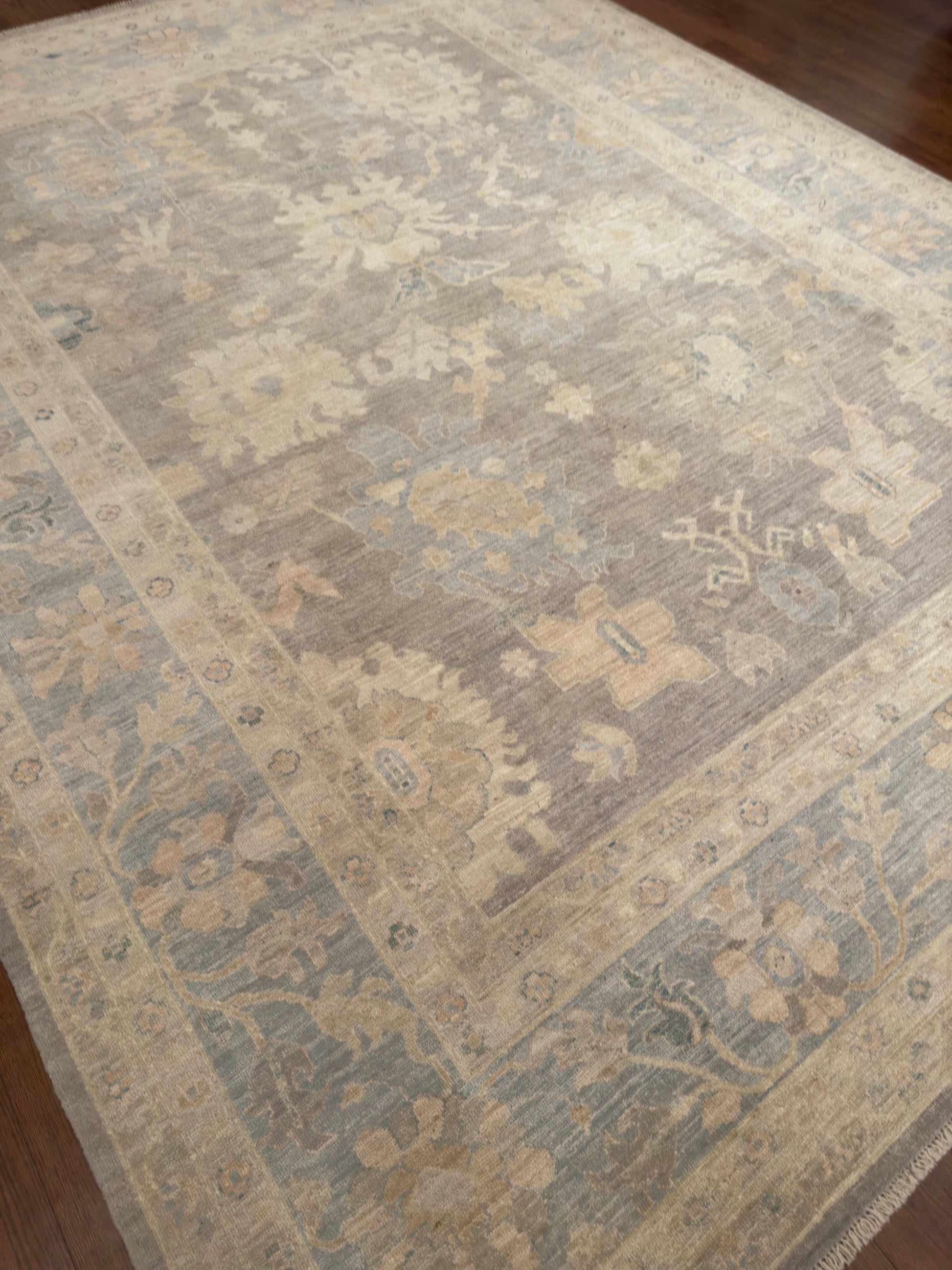 This elegant hand-knotted rug showcases a muted taupe-gray field with softly rendered floral and vine motifs in pale ivory, faded peach, and hints of blue-green. The design is intentionally subdued, giving it a washed, timeworn character that enhances its vintage charm. A broad border frames the rug with complementary tones, keeping the composition harmonious and understated. Its neutral palette and distressed aesthetic make it ideal for refined, transitional, or modern rustic interiors.