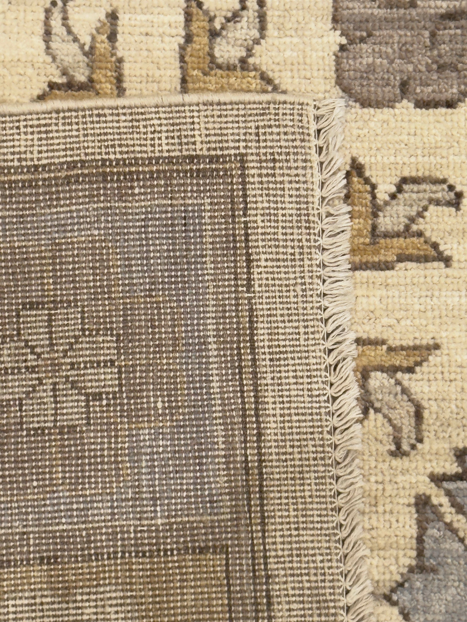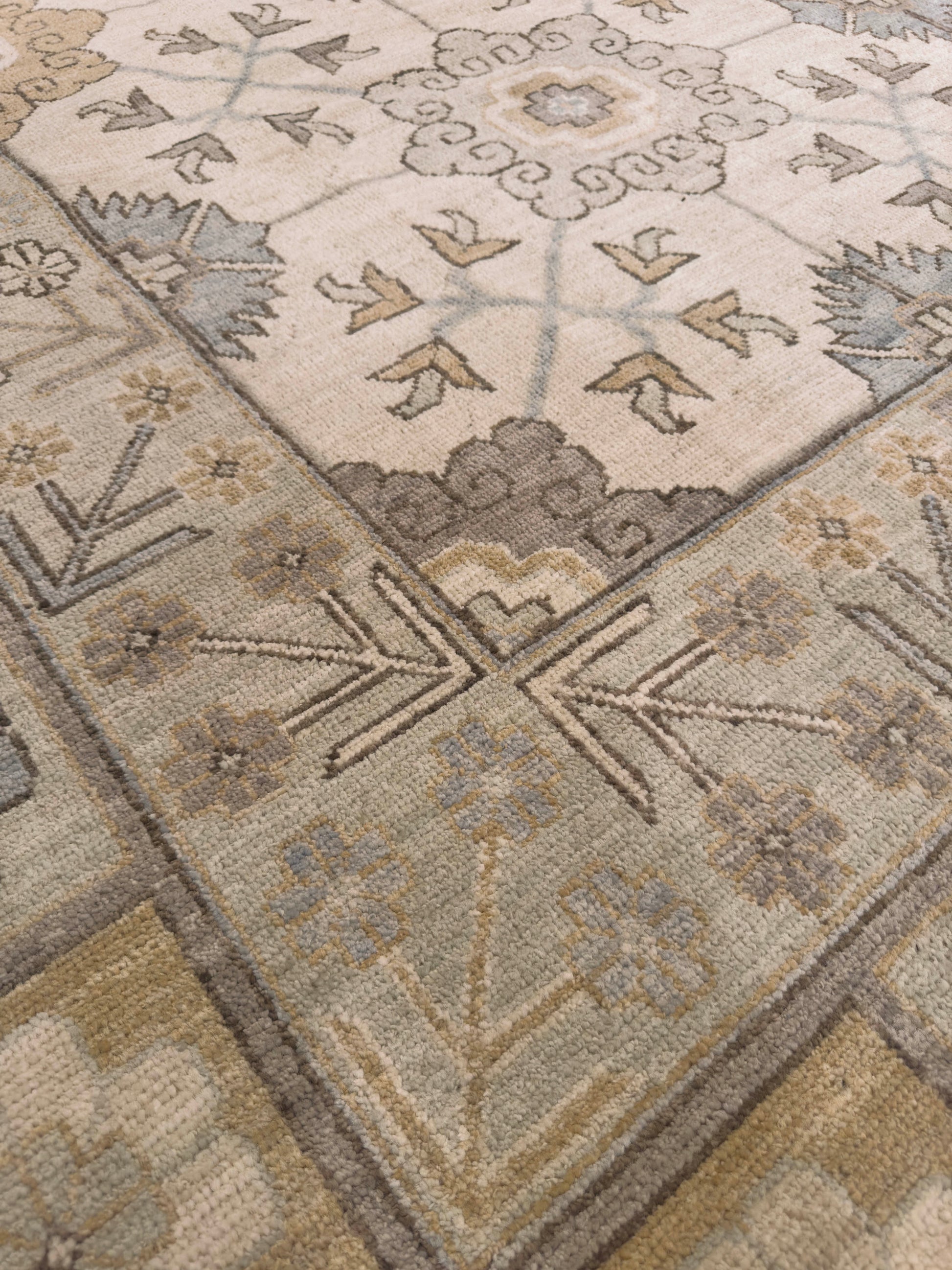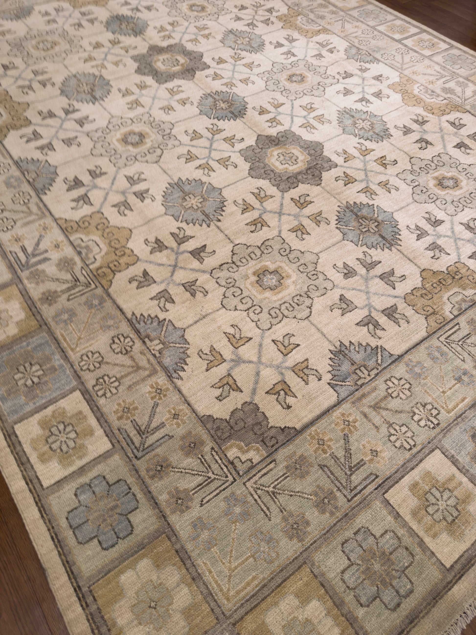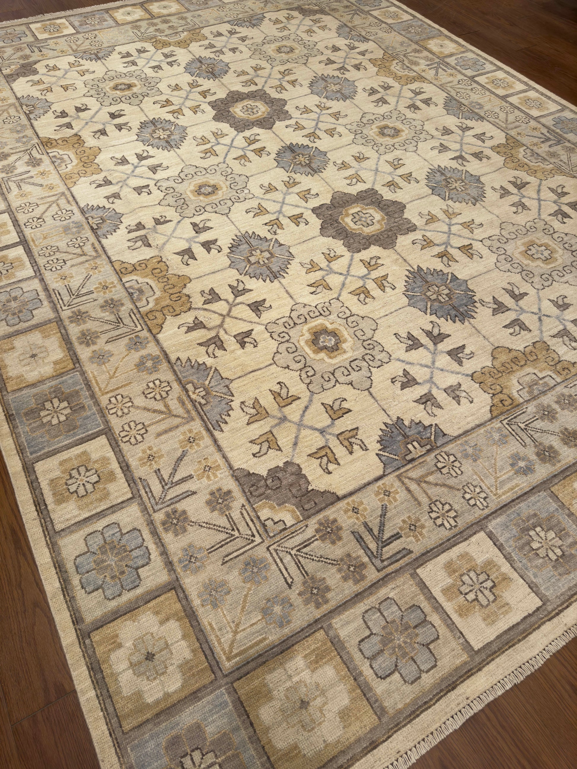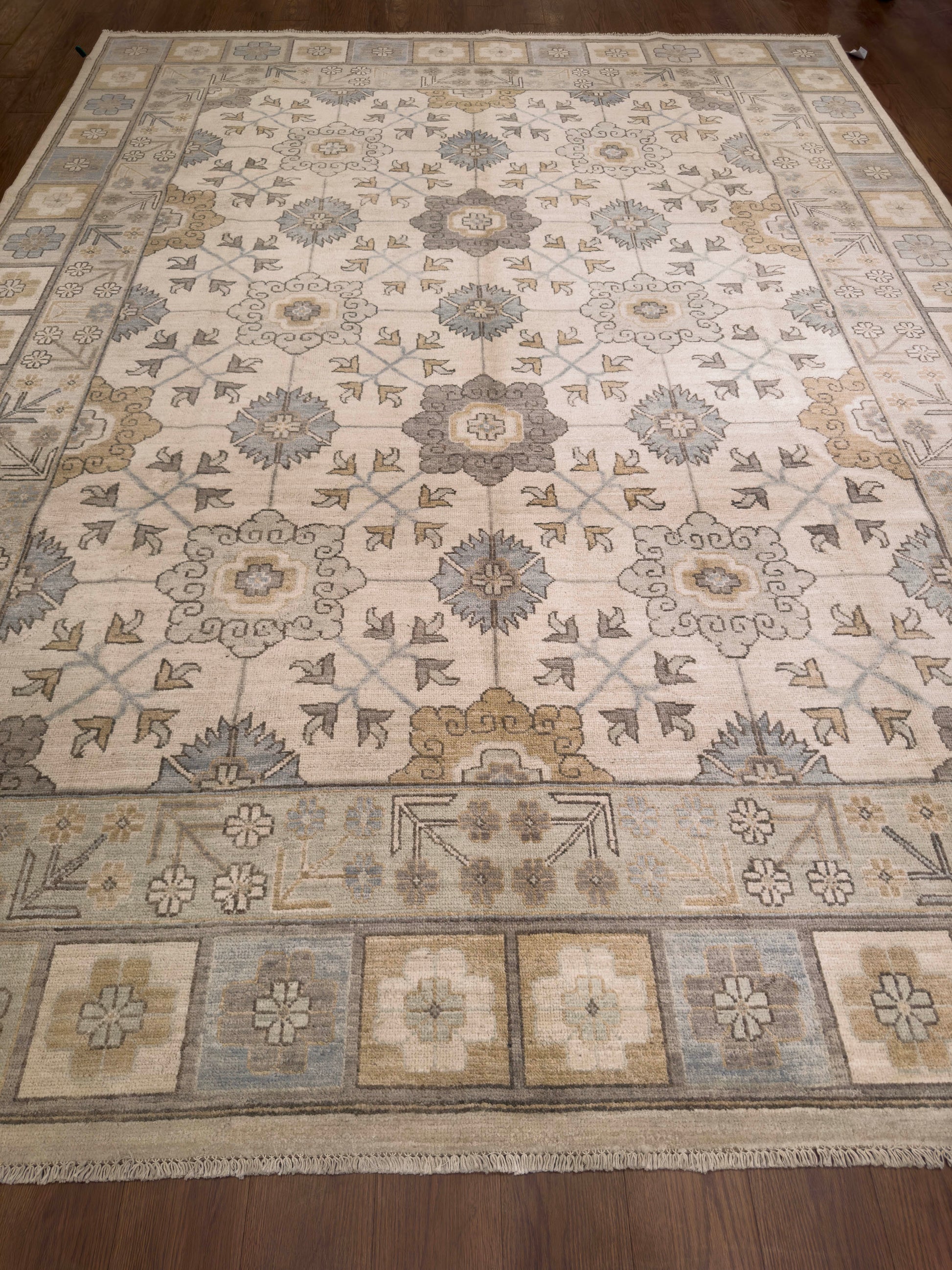 This hand-knotted rug presents a calm and structured design, featuring an ivory field patterned with geometric floral medallions and angular vine motifs. Subtle tones of beige, taupe, gray, and soft blue create a refined, understated look, while the symmetry of the repeating elements lends balance and harmony. A wide border with framed floral squares enhances its architectural quality, making it a versatile choice for both modern and traditional interiors.