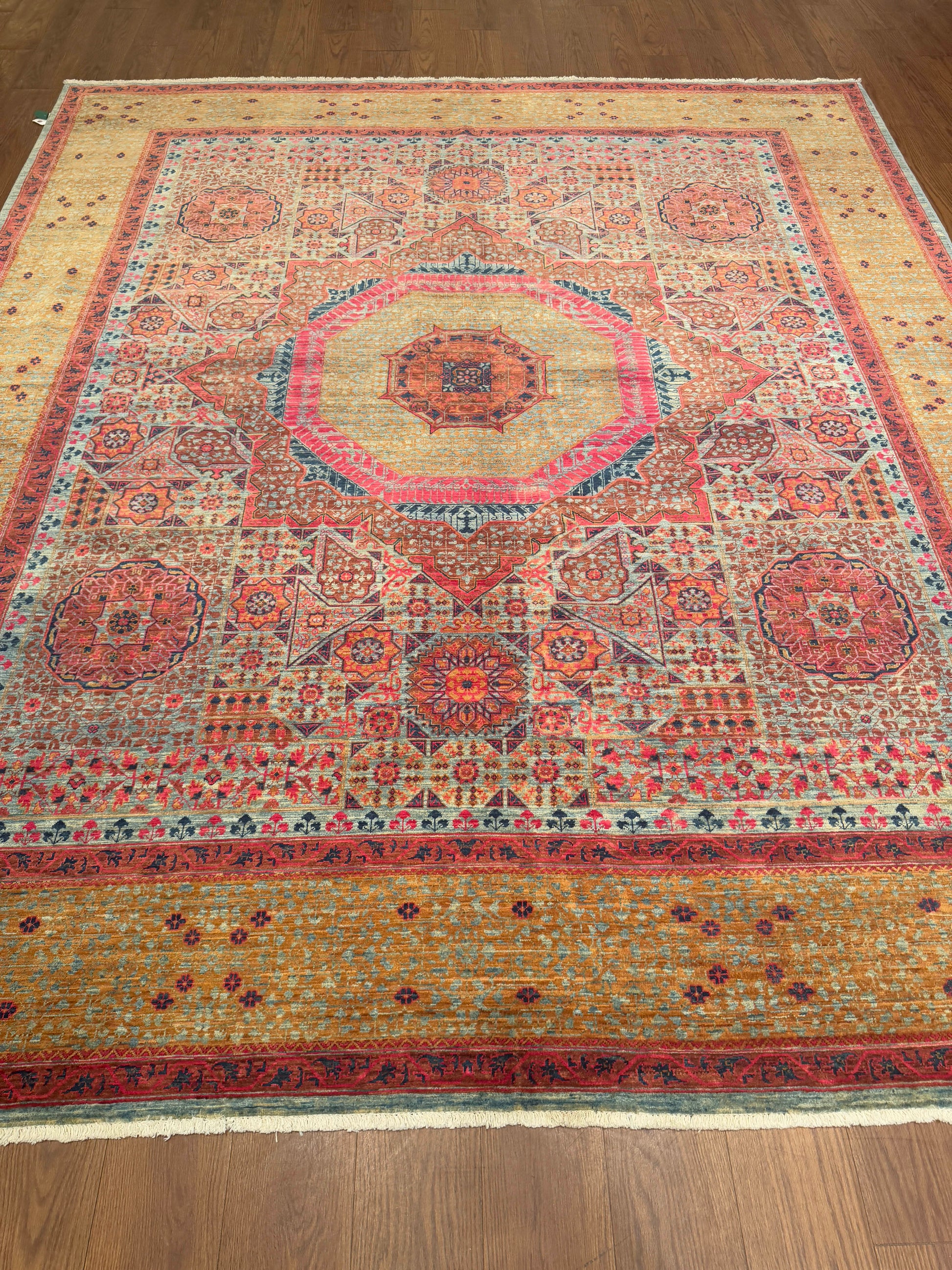This handwoven rug showcases a bold central medallion with layered geometric motifs, surrounded by intricate star and rosette patterns across the field. The palette of rich reds, gold, and soft blues creates a striking contrast, while the border frames the design with warmth and symmetry. Crafted from fine wool, this rug blends durability with timeless artistry, making it a standout piece in any interior.