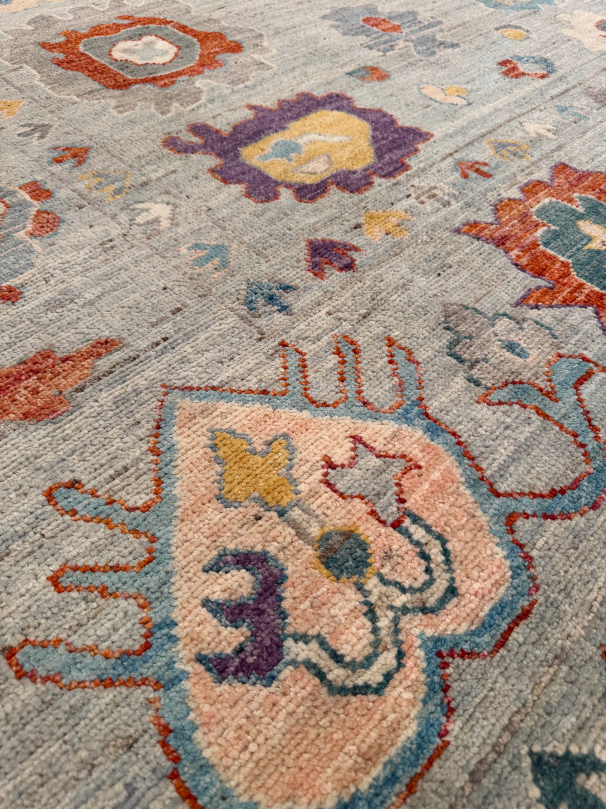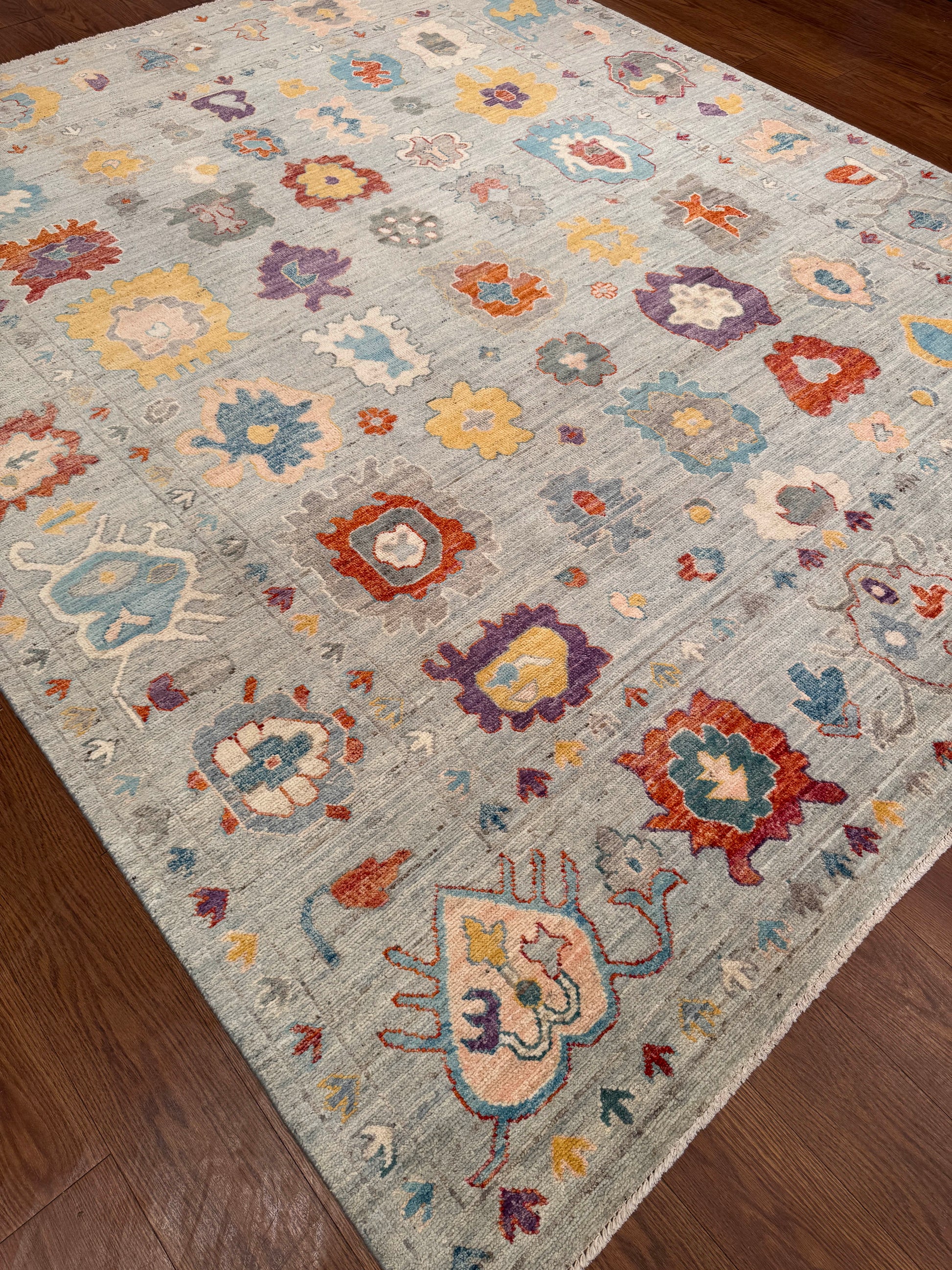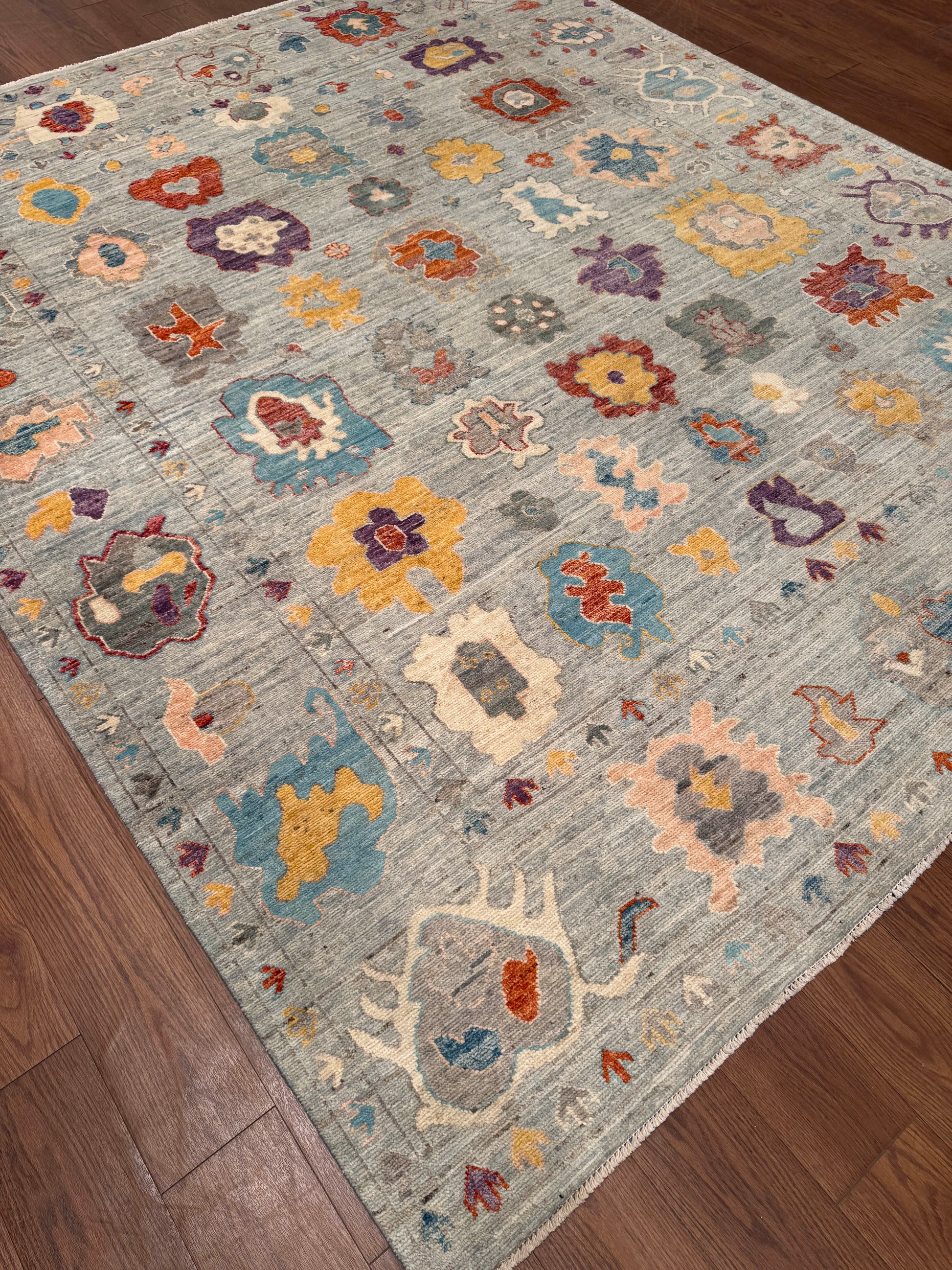 This handwoven rug features a playful allover design of stylized floral and geometric motifs scattered across a soft gray-blue field. Pops of gold, rust, turquoise, plum, and ivory bring vibrancy and charm, while the border of repeating small motifs adds structure to the lively composition. Crafted from fine wool, this rug blends traditional artistry with a contemporary feel, making it versatile for modern and transitional spaces.