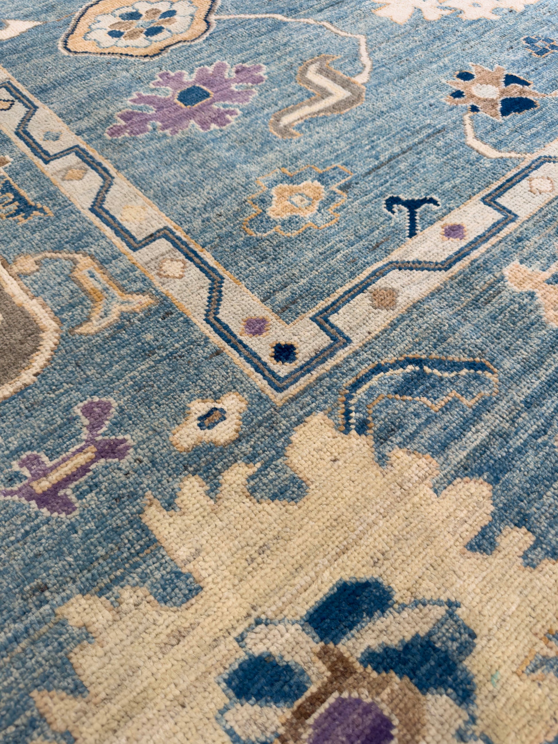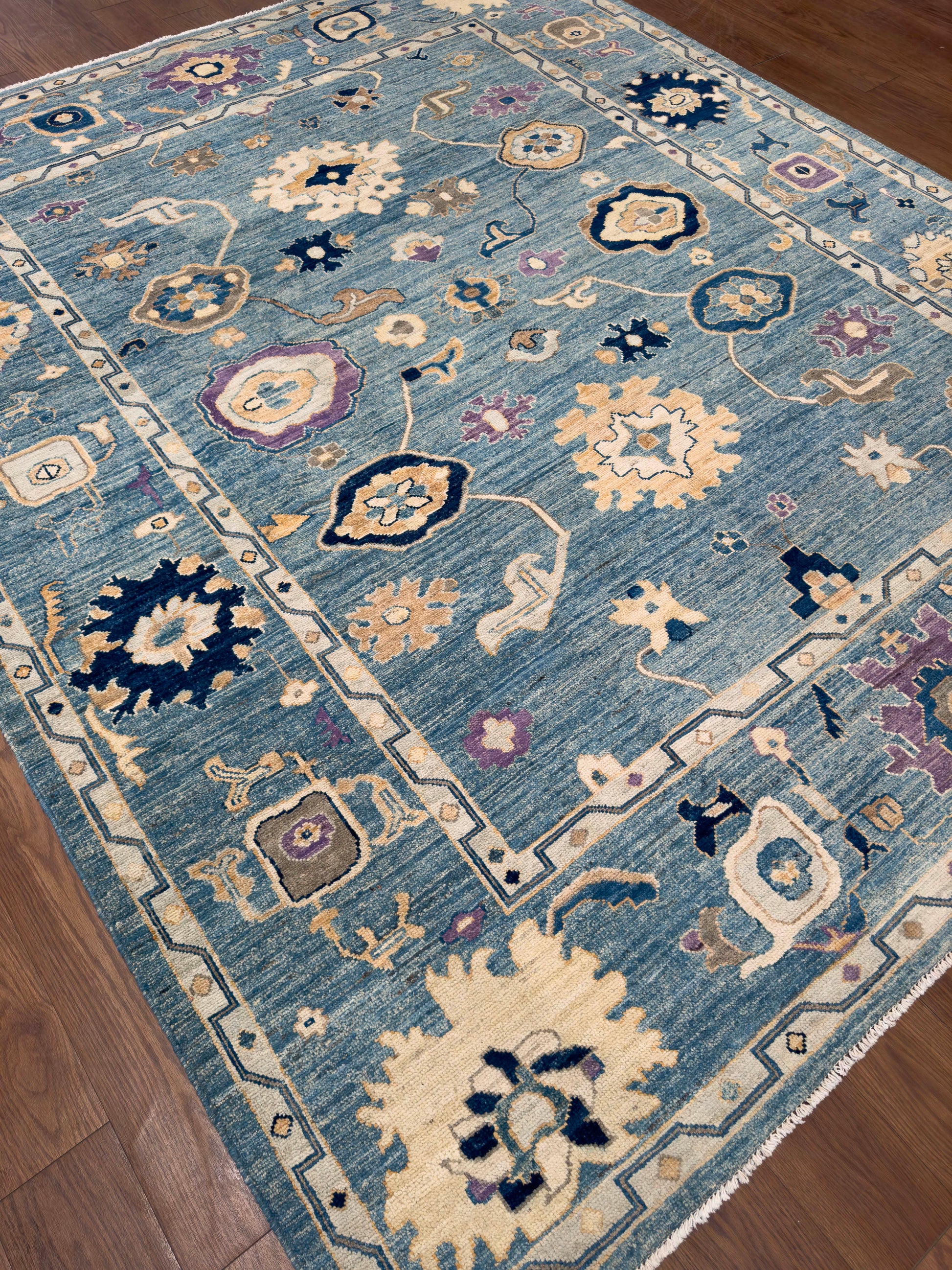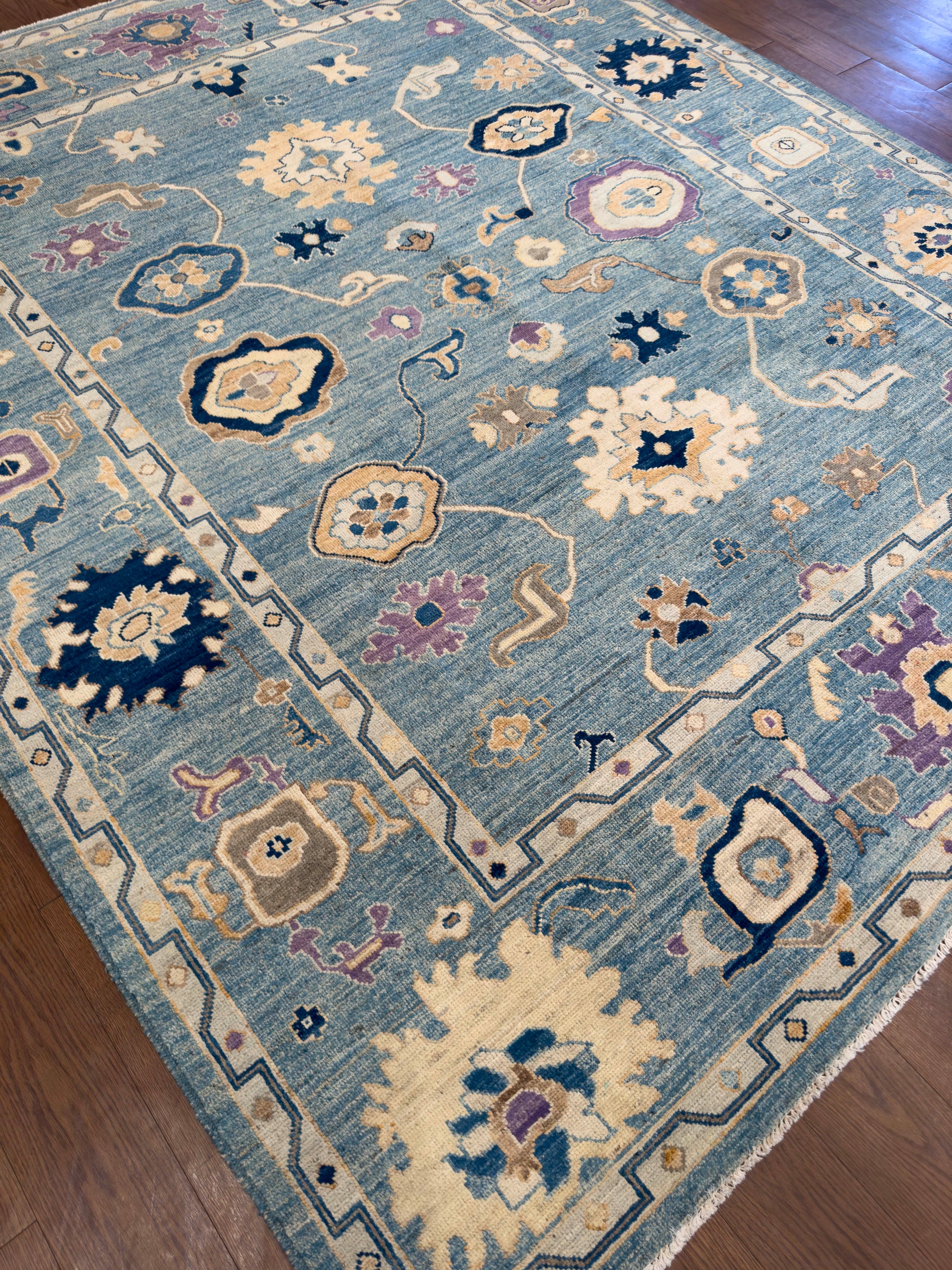 This handwoven rug features a soft blue field decorated with scattered floral and geometric motifs in ivory, gold, navy, and lavender. The playful yet balanced design is framed by a simple border, giving the rug an airy and inviting look. Crafted from fine wool, it combines durability with timeless artistry, making it a versatile piece that complements both modern and traditional interiors.