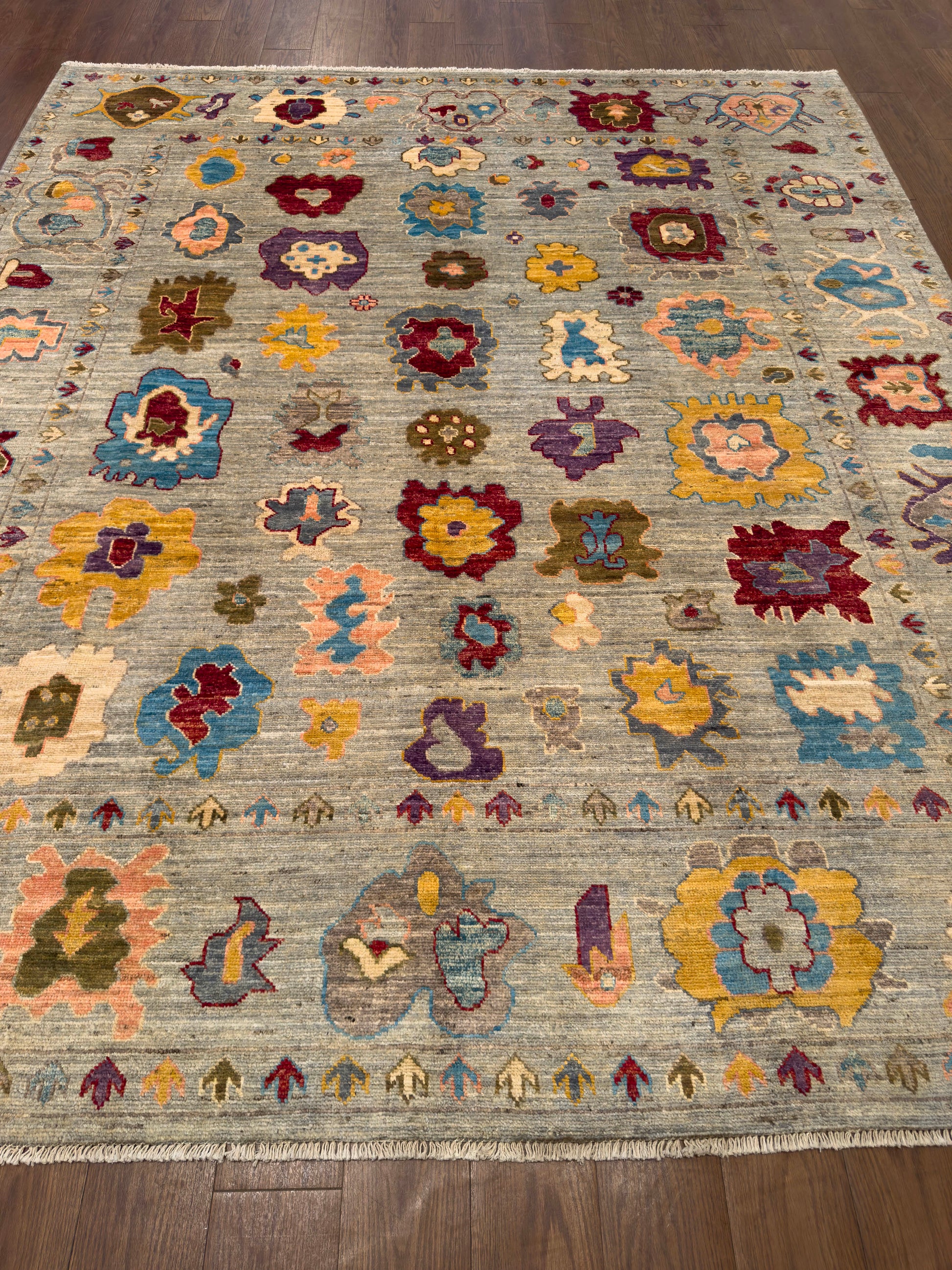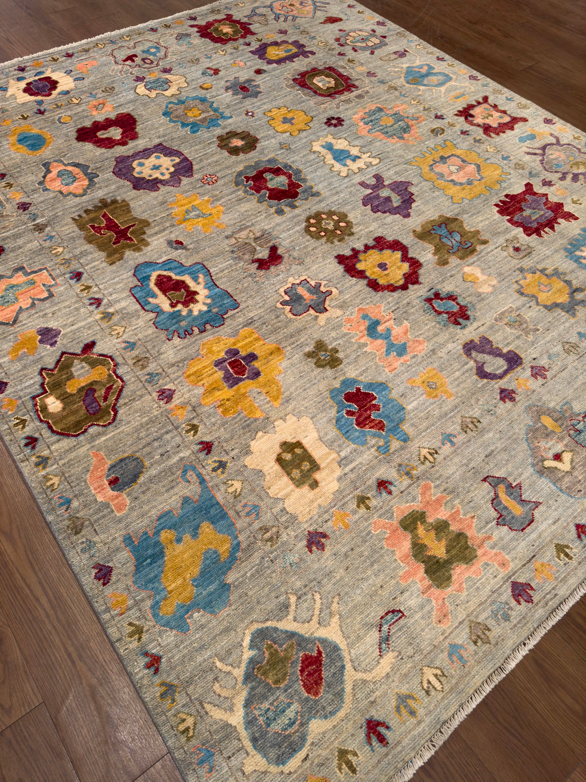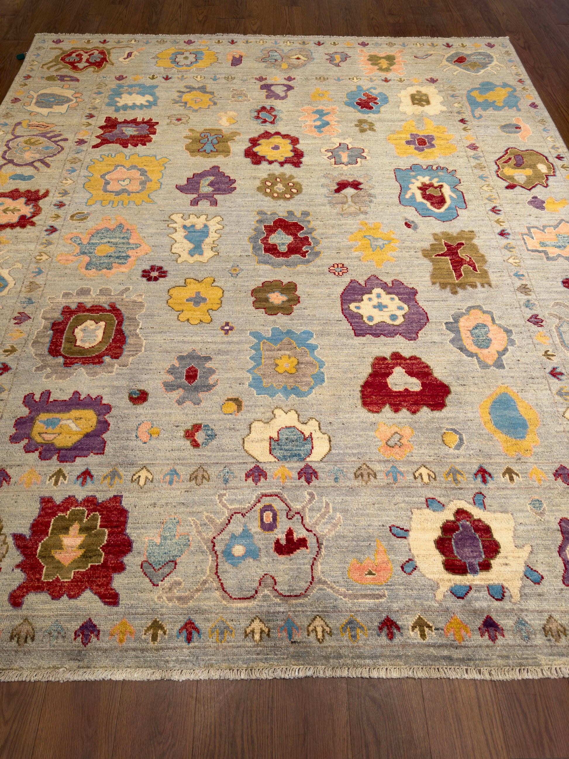 This handwoven rug features a playful allover design of abstract floral and geometric motifs scattered across a soft gray-blue field. Pops of red, gold, lavender, turquoise, and ivory bring vibrancy to the piece, giving it a cheerful yet artistic character. The wool pile provides durability and comfort underfoot, making this rug a versatile addition to both modern and transitional interiors.