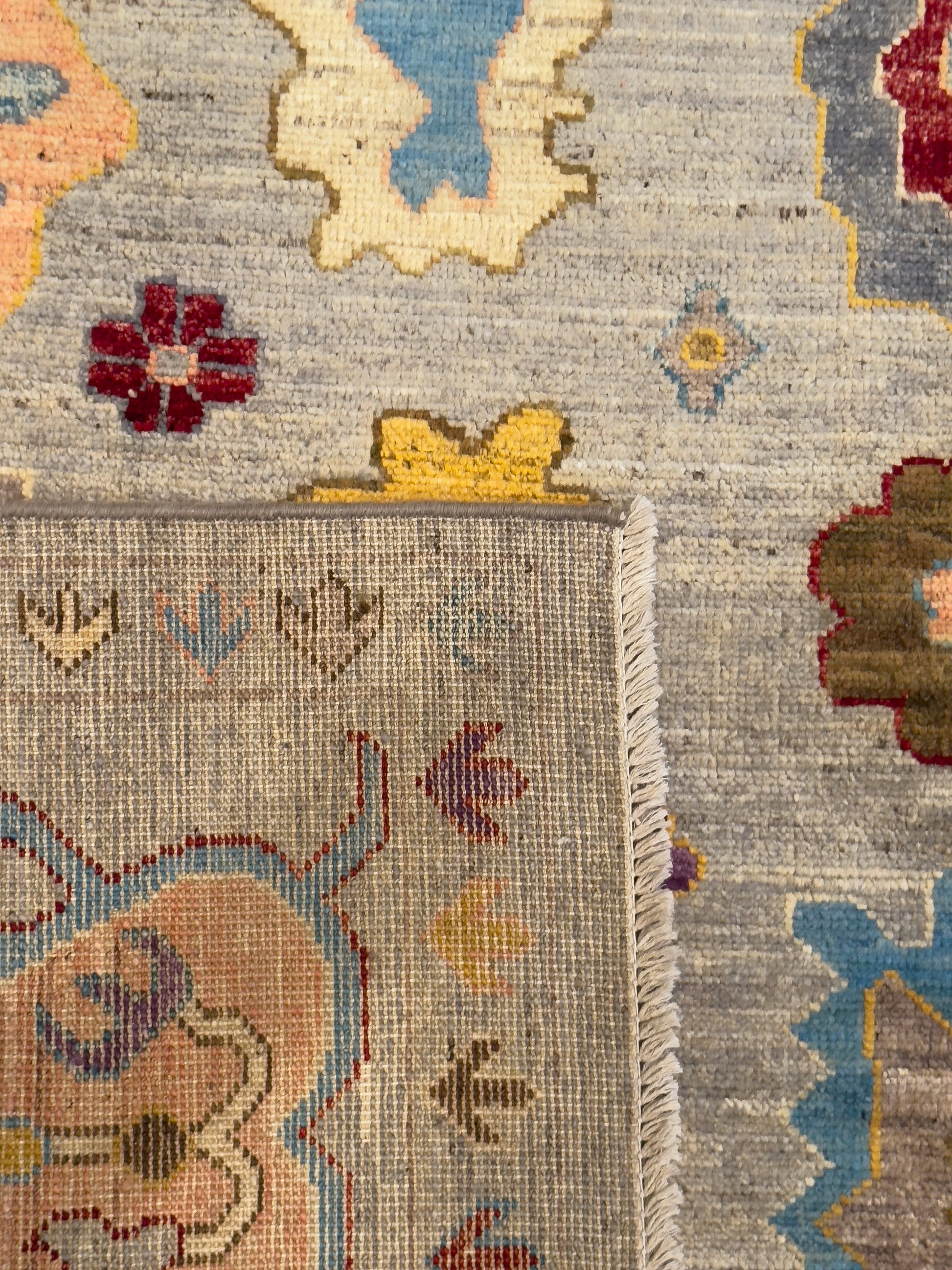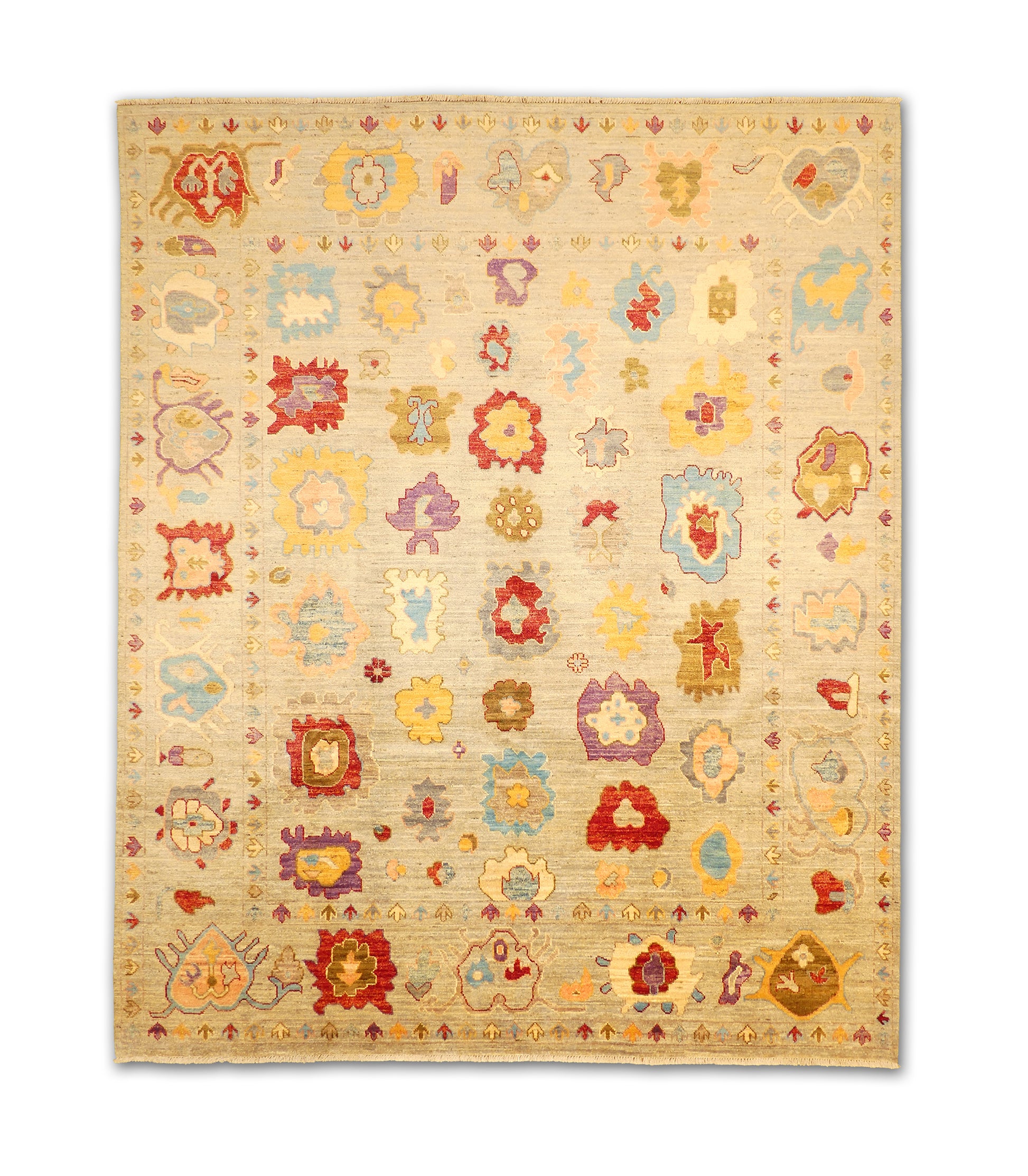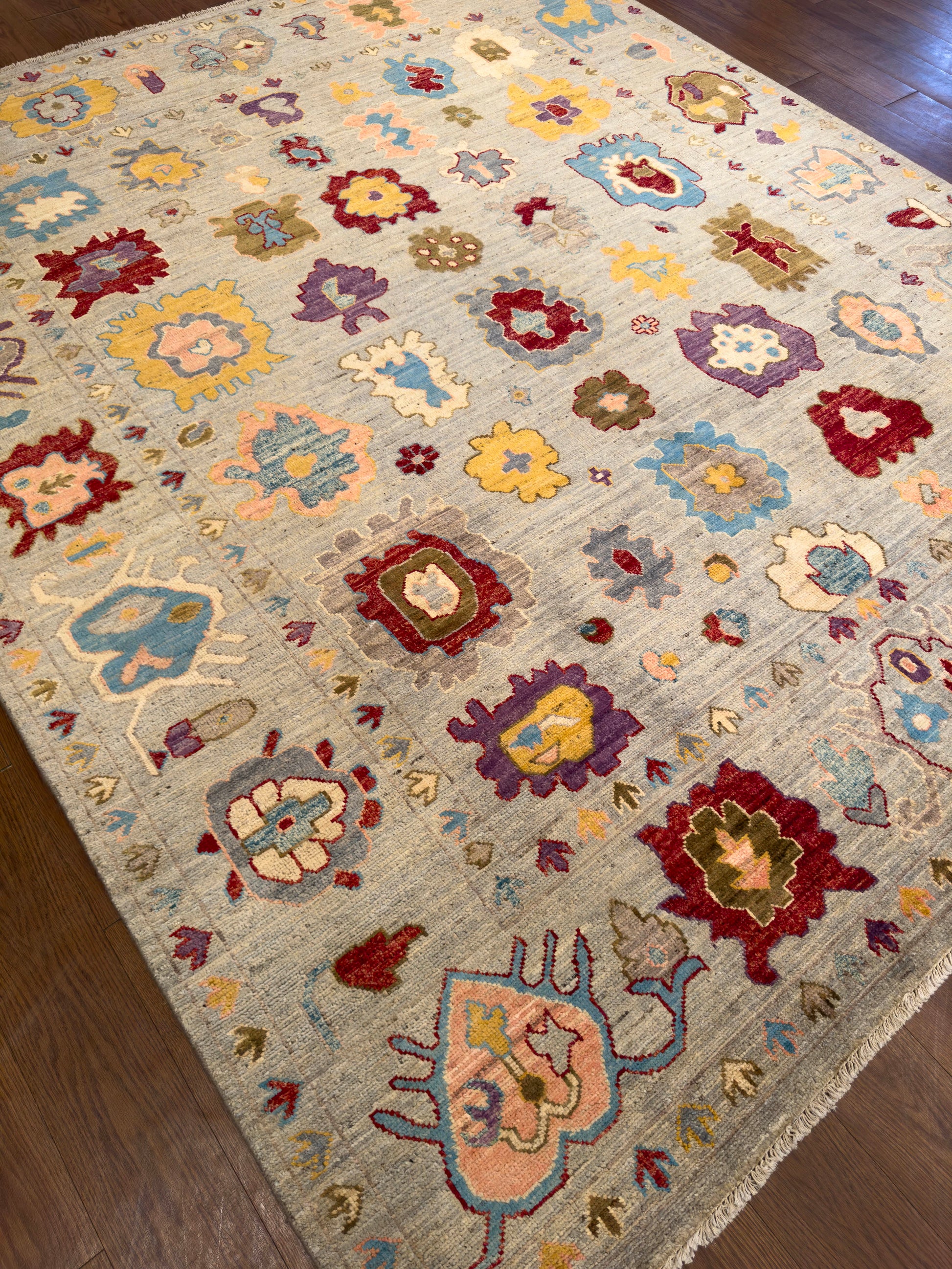 This handwoven rug features a playful allover design of abstract floral and geometric motifs scattered across a soft gray-blue field. Pops of red, gold, lavender, turquoise, and ivory bring vibrancy to the piece, giving it a cheerful yet artistic character. The wool pile provides durability and comfort underfoot, making this rug a versatile addition to both modern and transitional interiors.