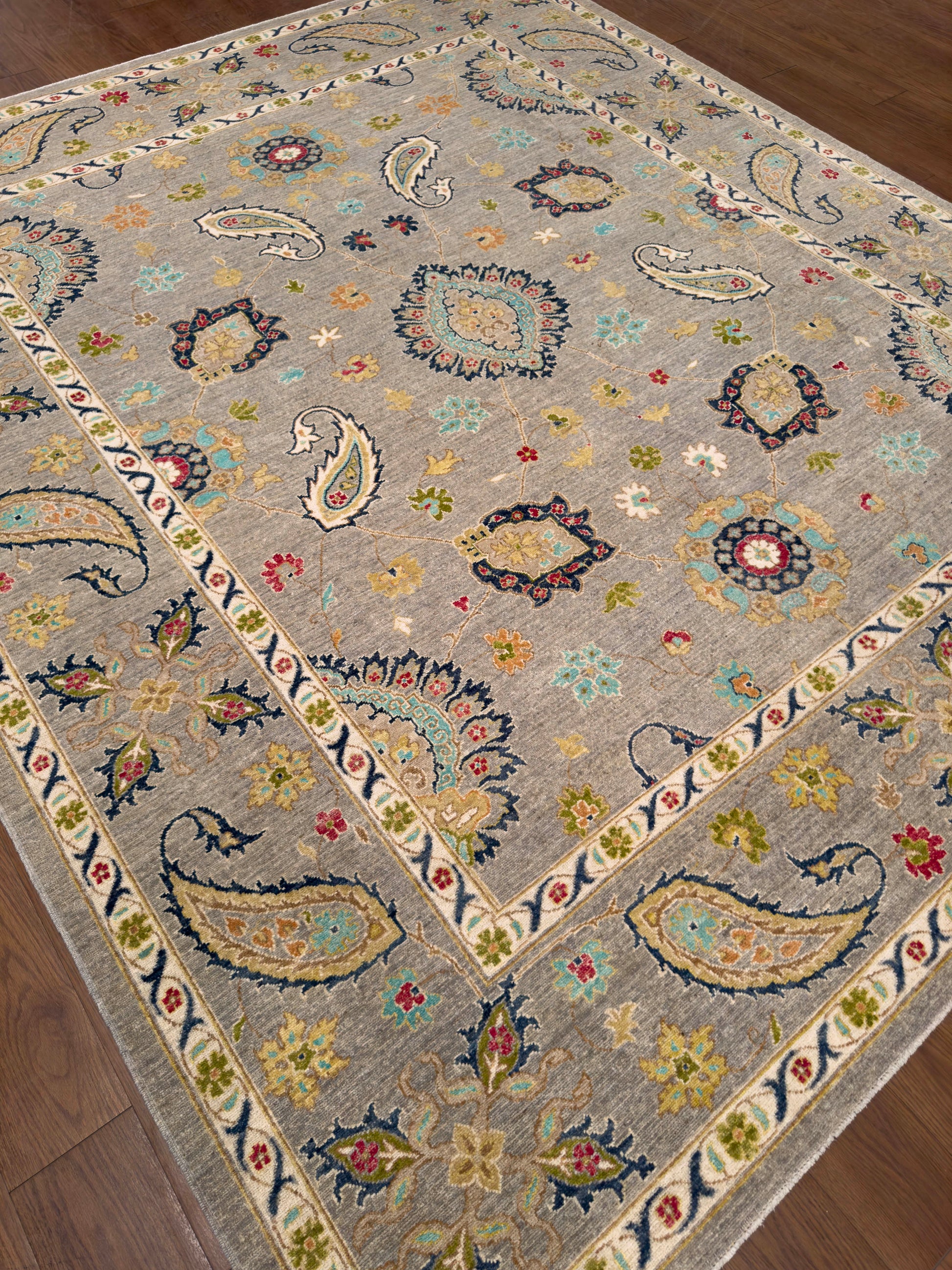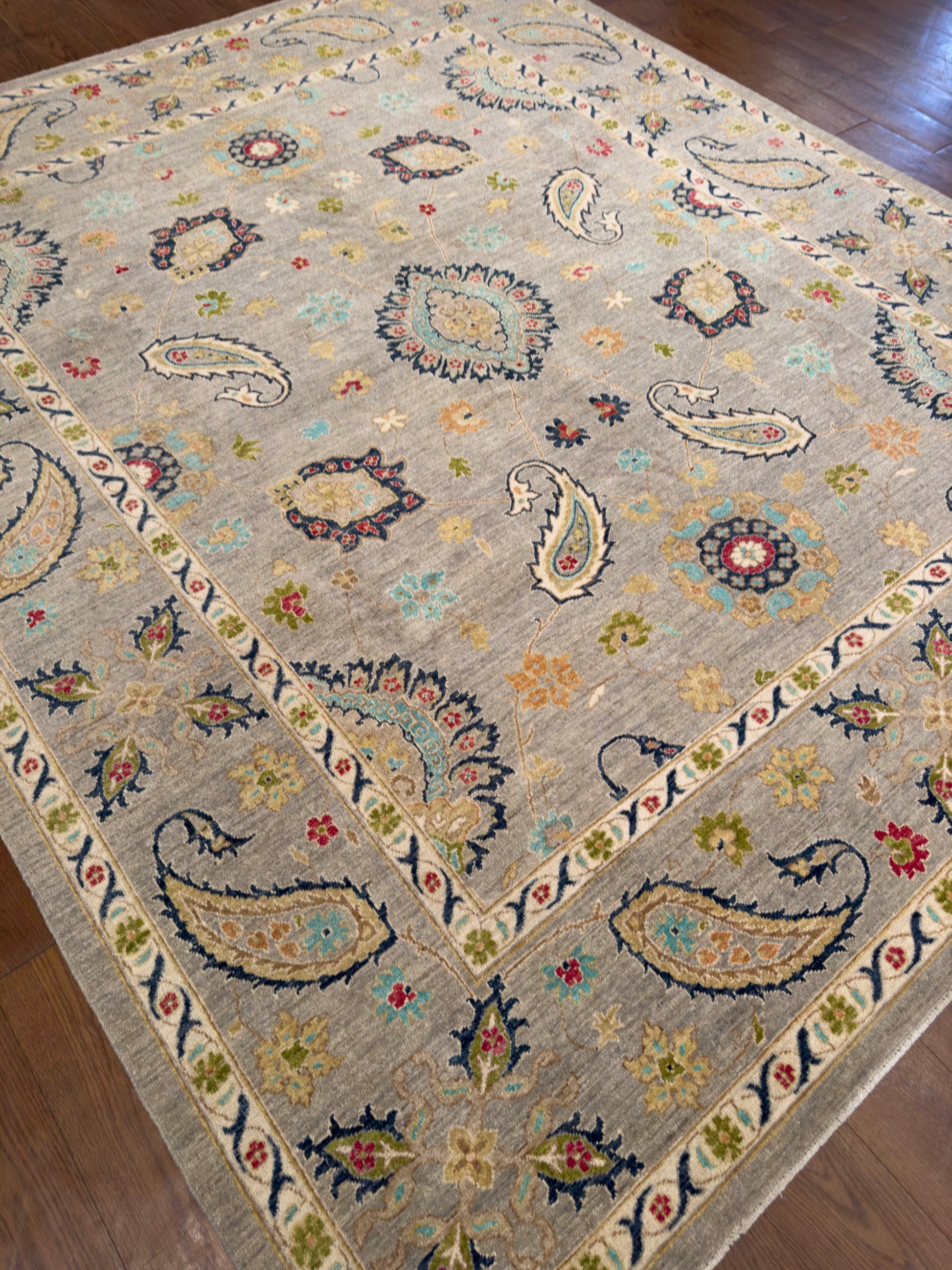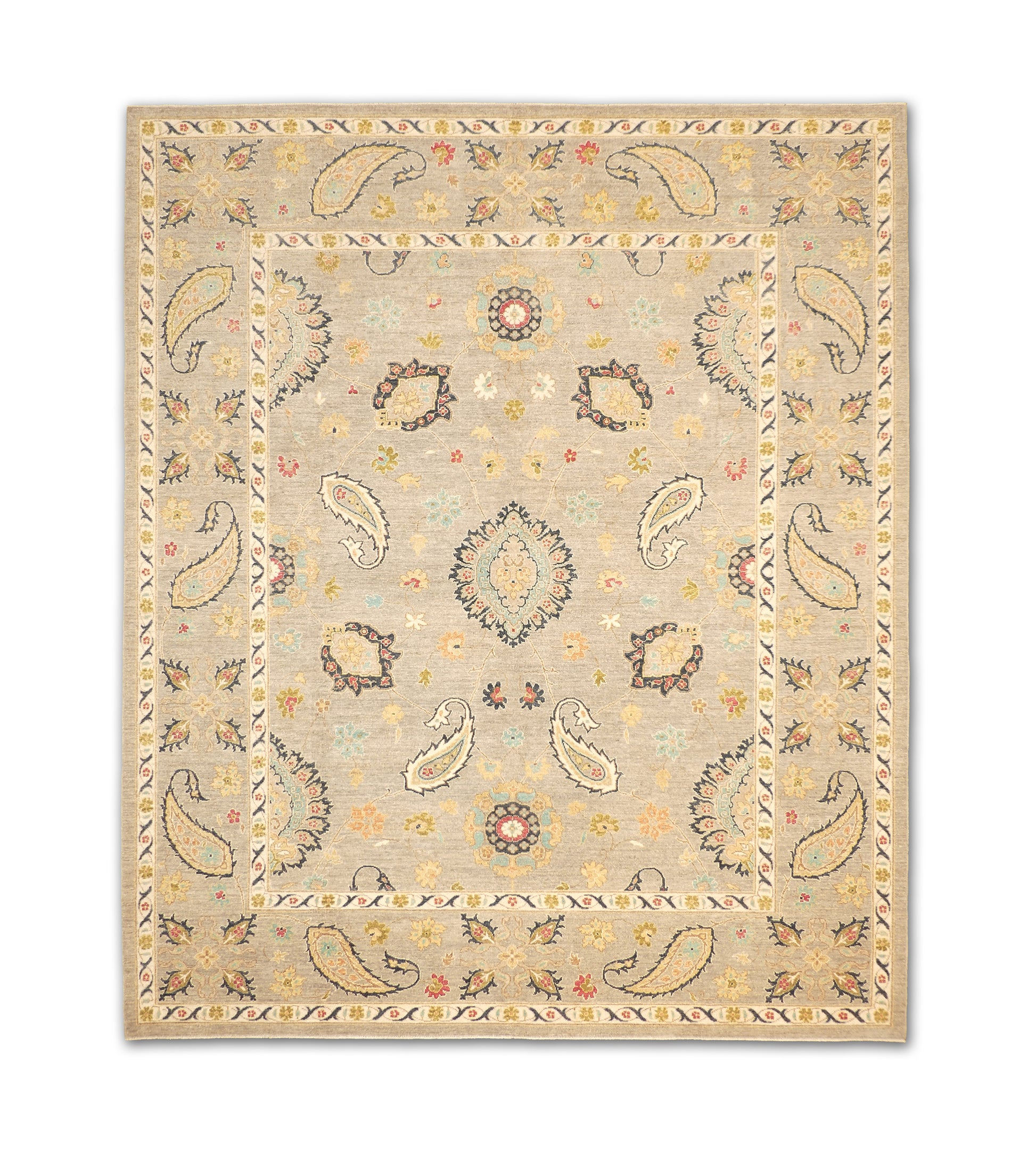This handwoven rug features a graceful arrangement of paisley and floral motifs on a soft gray field. Accents of navy, teal, red, gold, and ivory bring vibrancy and depth, while the intricate border repeats the paisley theme, enhancing the rug’s elegant symmetry. Crafted from fine wool, this rug offers both durability and timeless beauty, making it a versatile choice for traditional or transitional interiors.