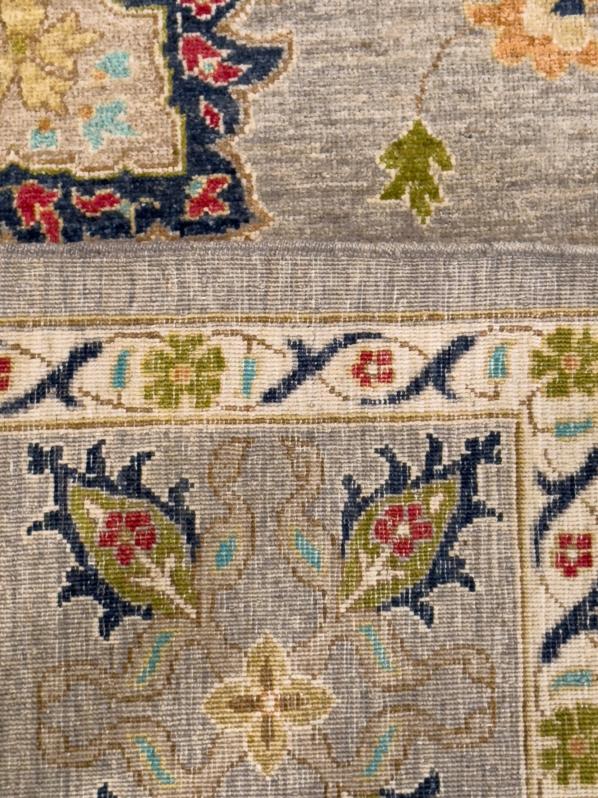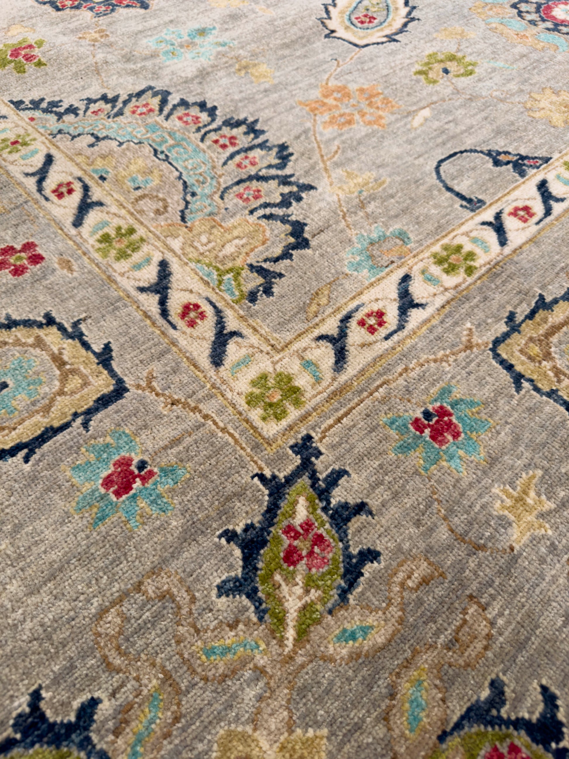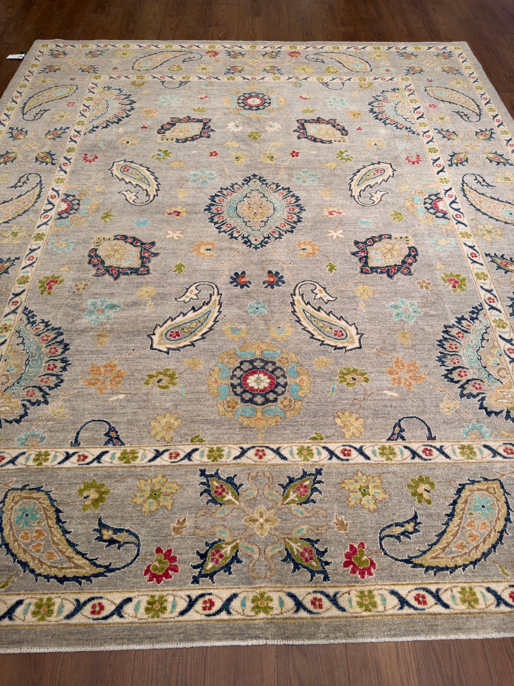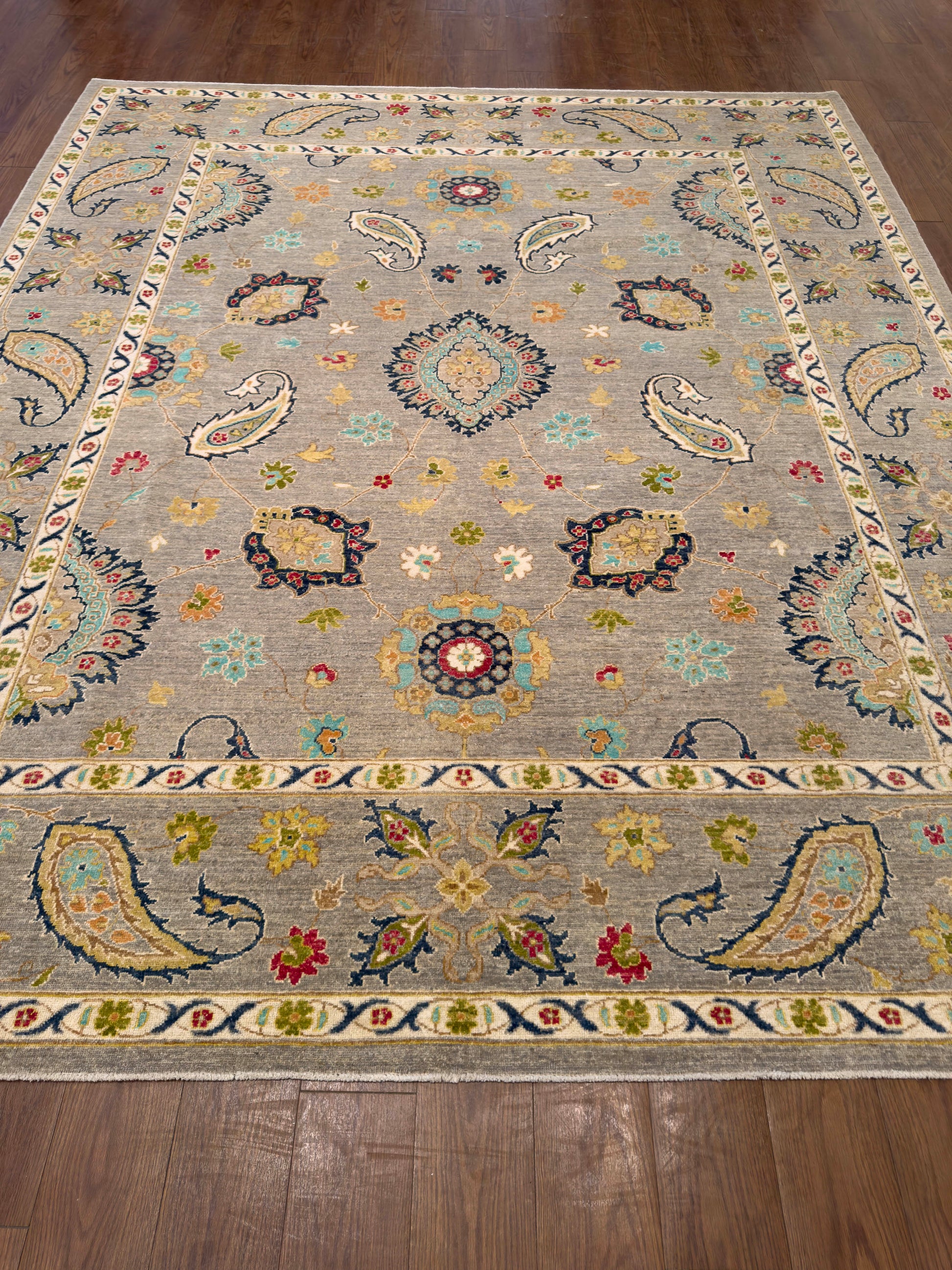 This handwoven rug features a graceful arrangement of paisley and floral motifs on a soft gray field. Accents of navy, teal, red, gold, and ivory bring vibrancy and depth, while the intricate border repeats the paisley theme, enhancing the rug’s elegant symmetry. Crafted from fine wool, this rug offers both durability and timeless beauty, making it a versatile choice for traditional or transitional interiors.