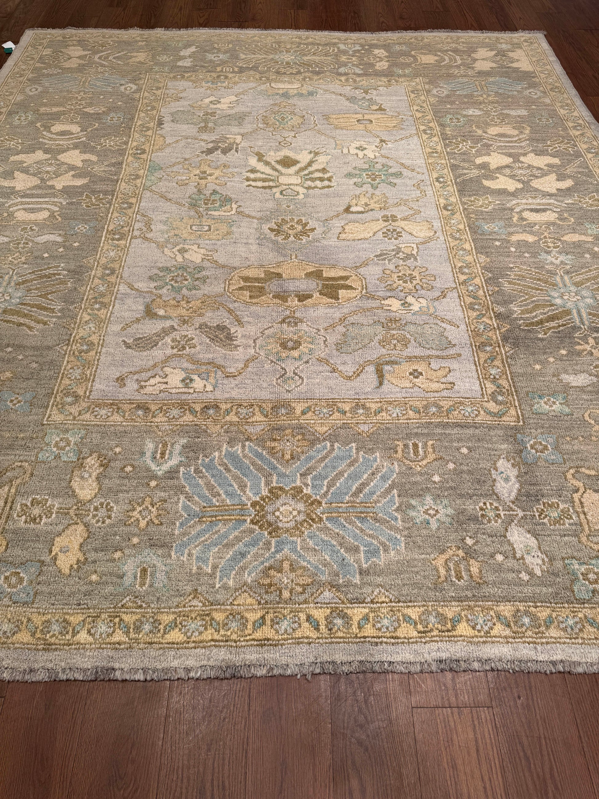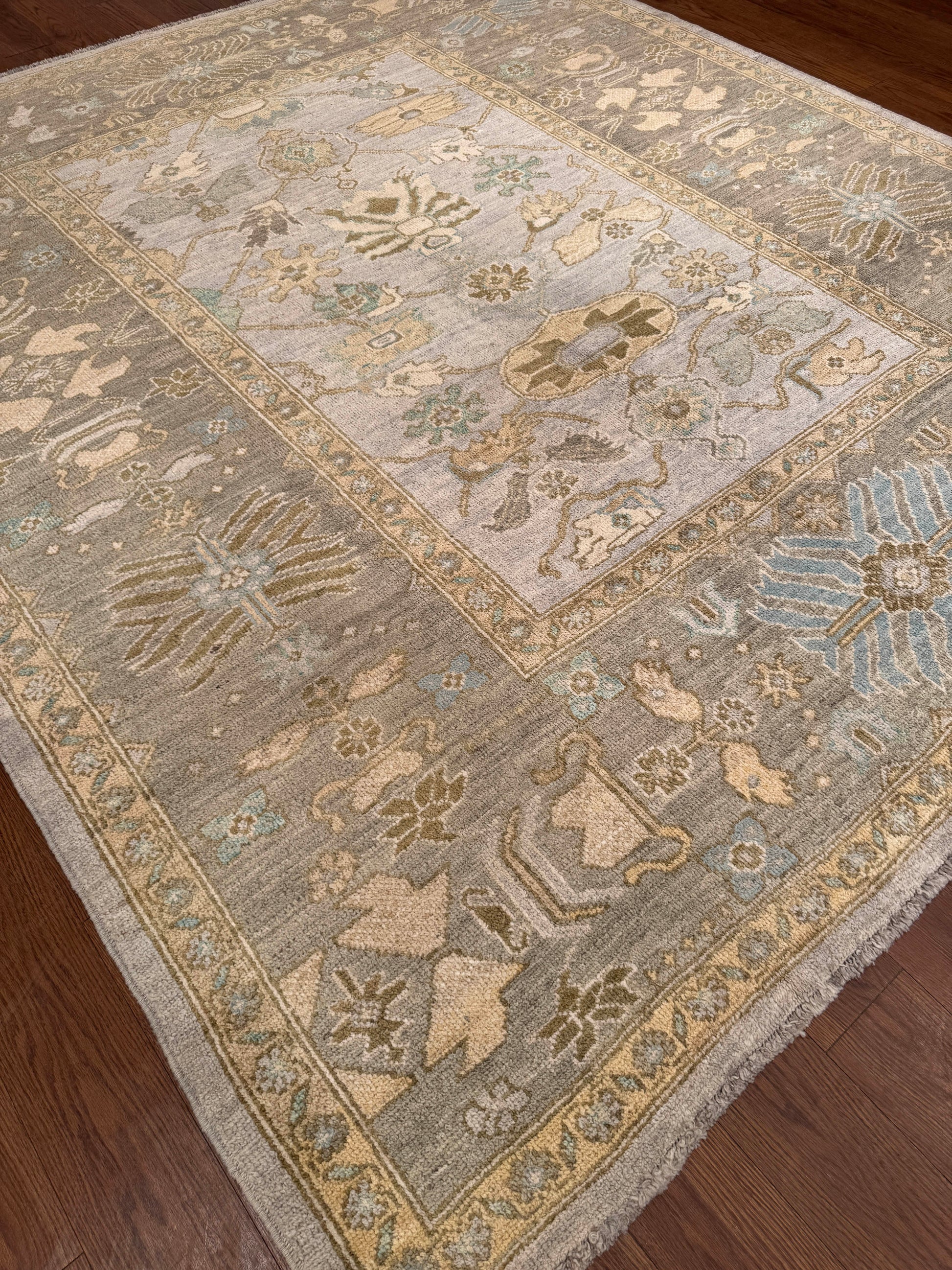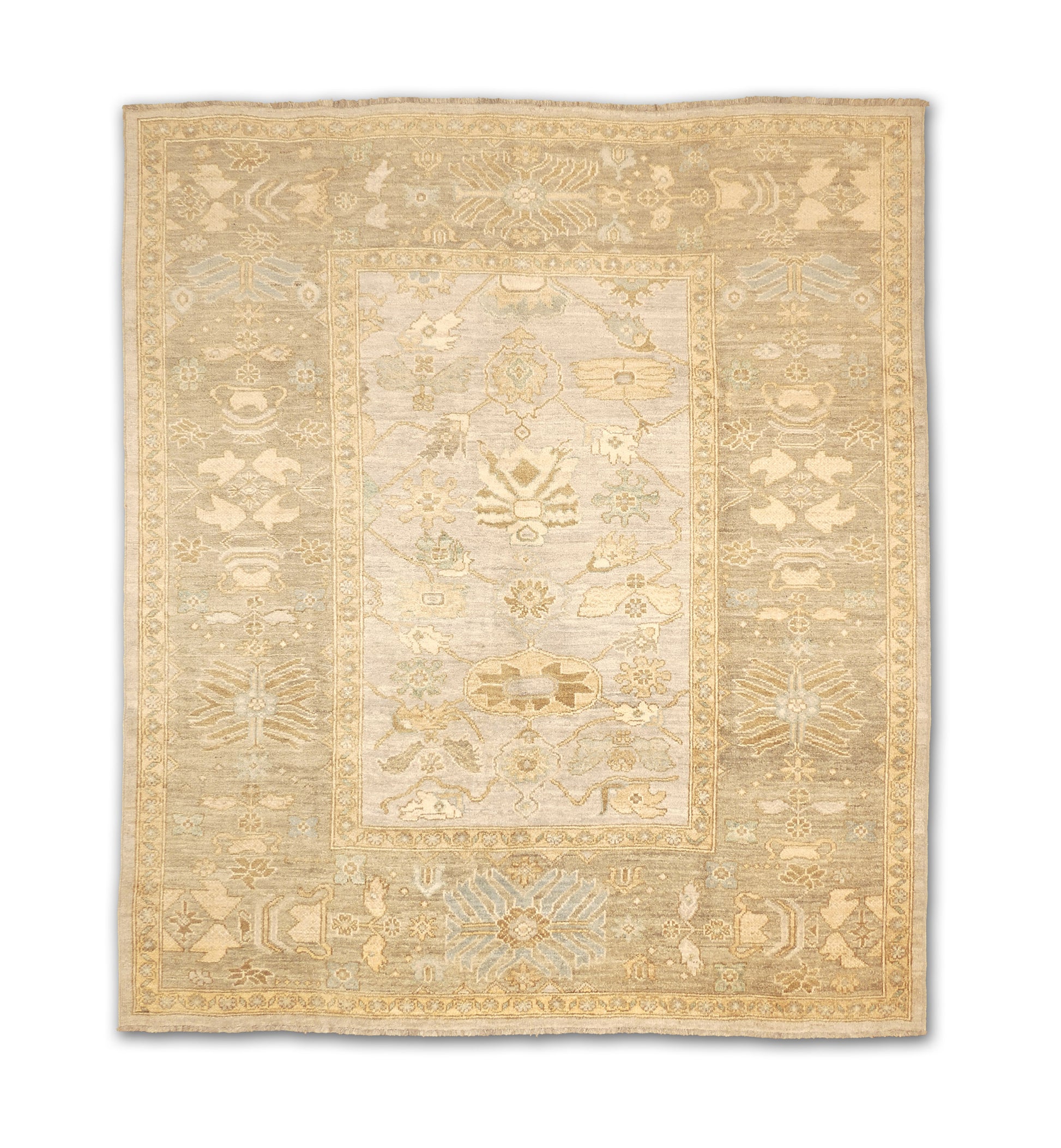 This handwoven rug features a soft, muted palette of beige, ivory, sage, and pale blue, creating a calming and elegant look. The central medallion and surrounding floral motifs are framed by a delicate border, blending symmetry with subtle artistry. Crafted from fine wool, the rug offers both durability and understated beauty, making it an ideal choice for refined and transitional interiors.