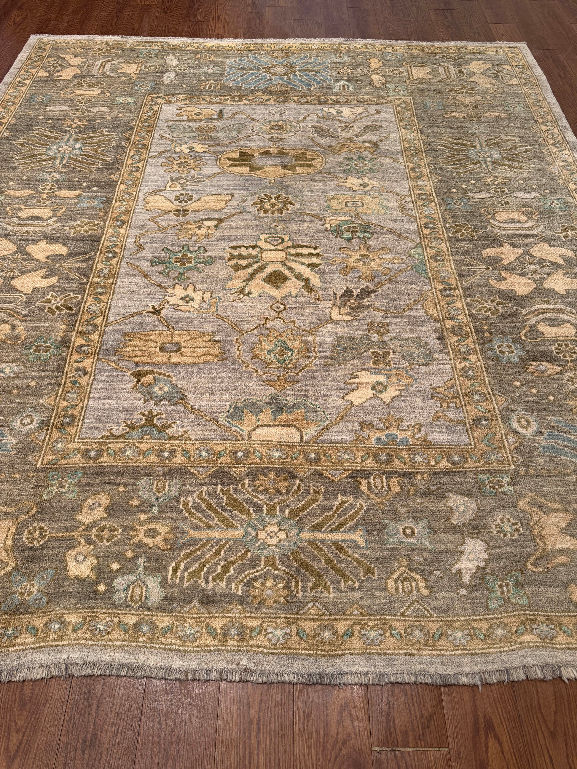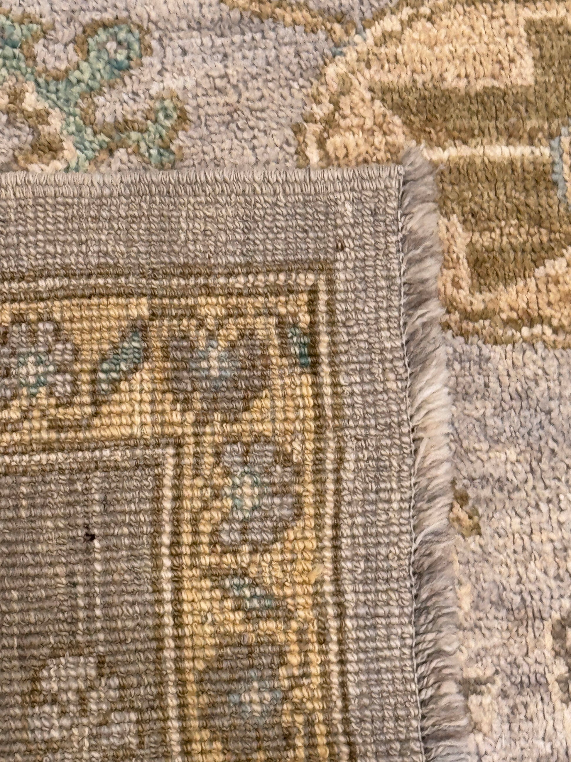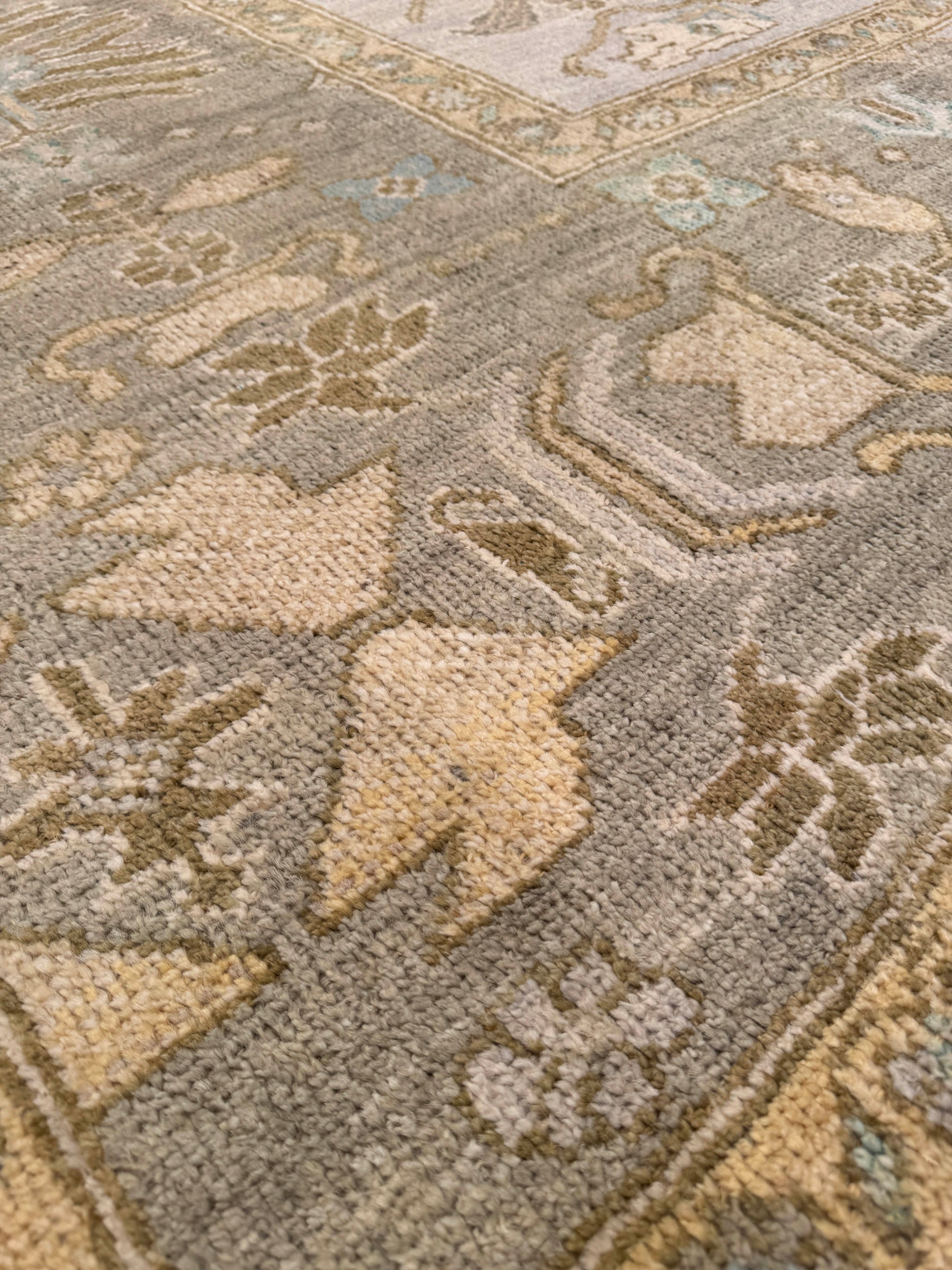 This handwoven rug features a soft, muted palette of beige, ivory, sage, and pale blue, creating a calming and elegant look. The central medallion and surrounding floral motifs are framed by a delicate border, blending symmetry with subtle artistry. Crafted from fine wool, the rug offers both durability and understated beauty, making it an ideal choice for refined and transitional interiors.