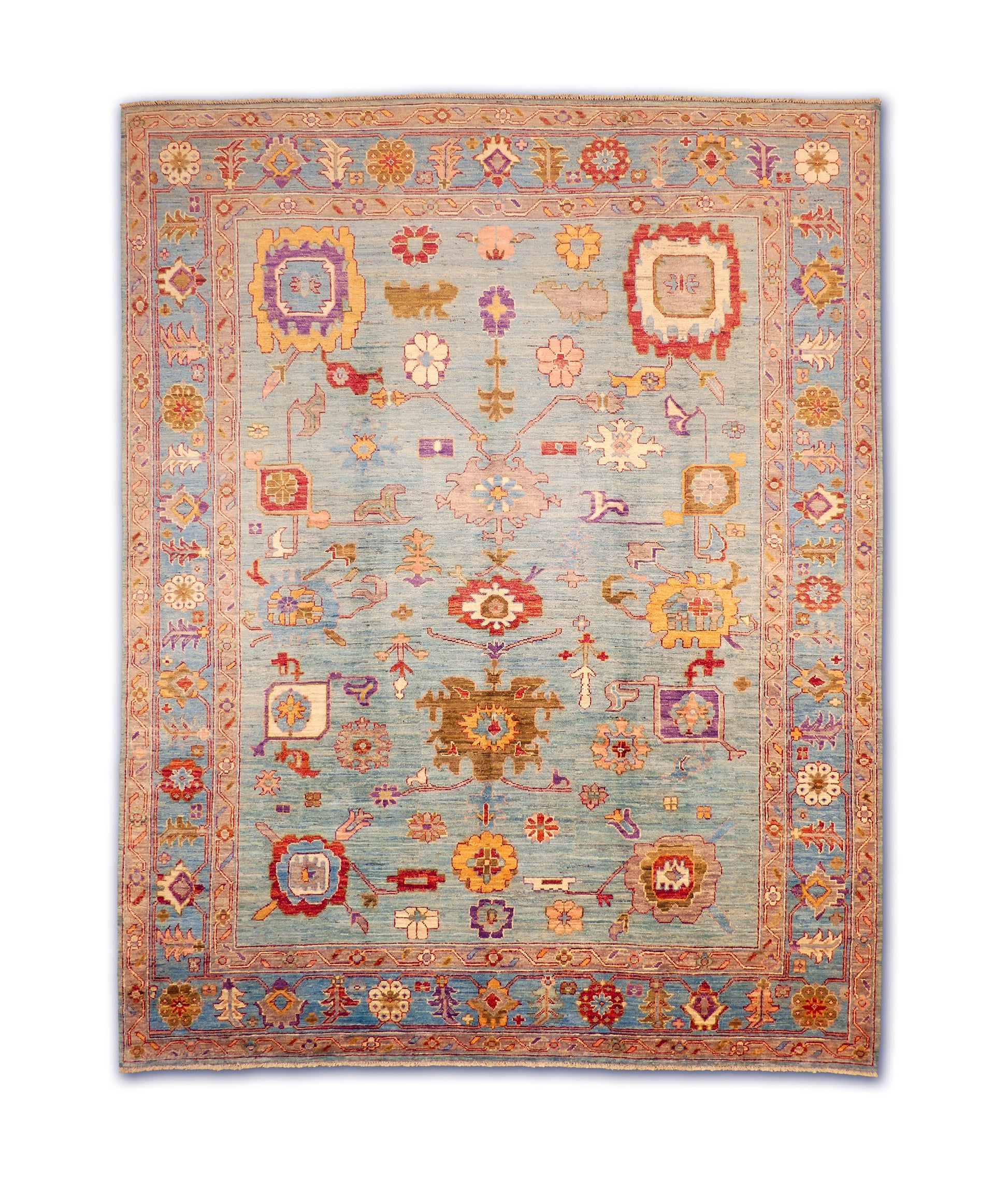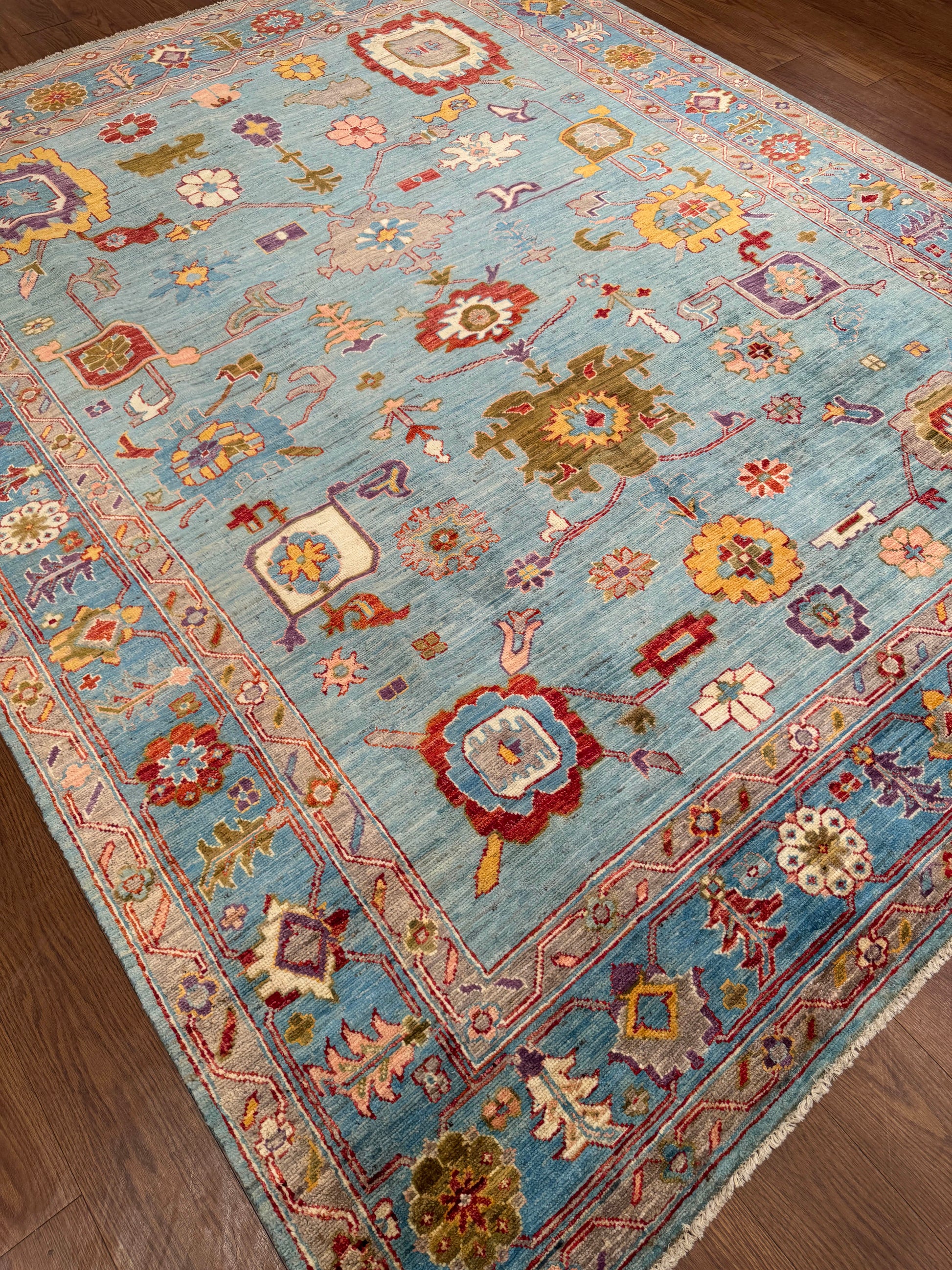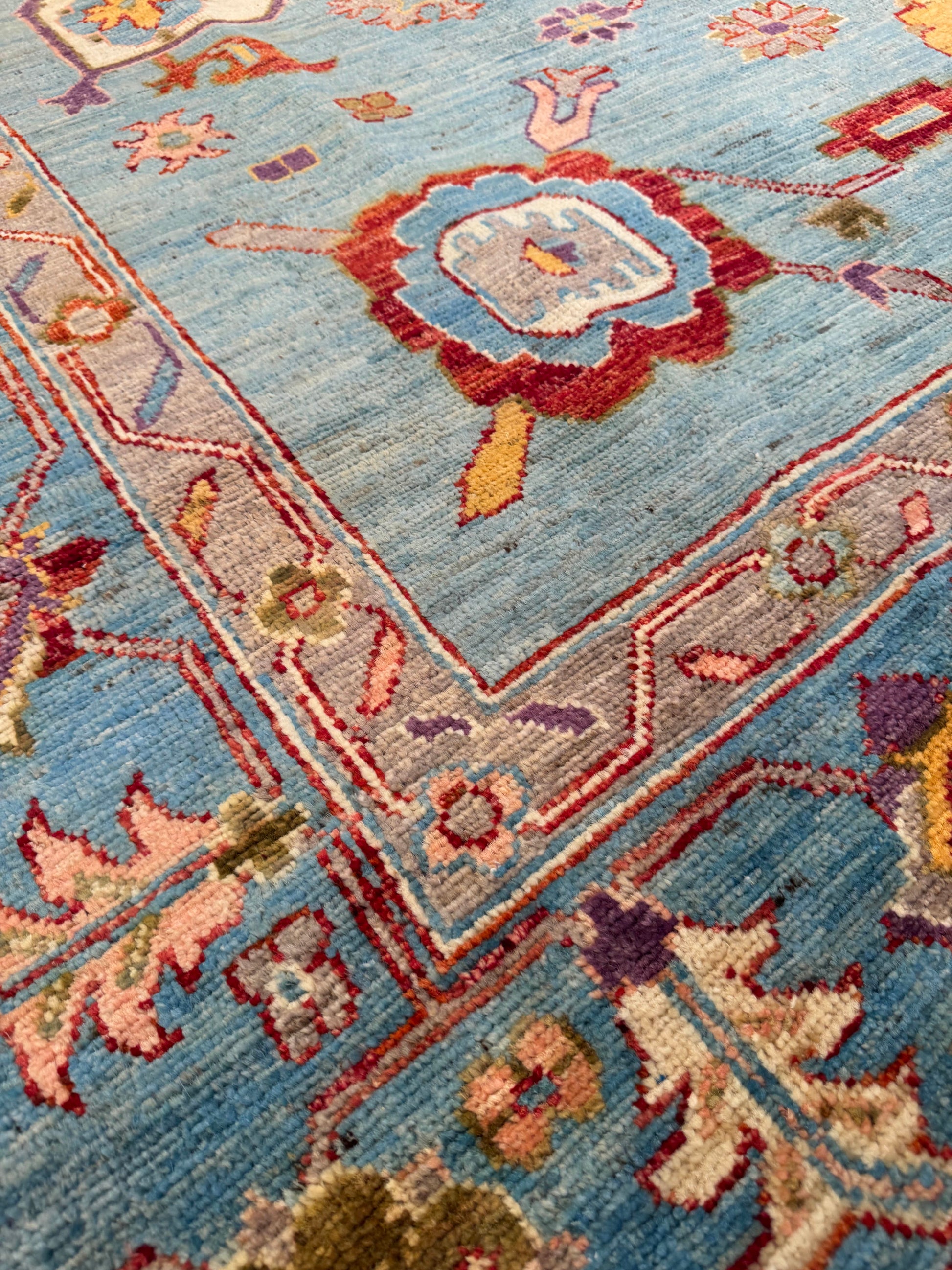 This handwoven rug features a lively display of floral and geometric motifs set against a sky-blue field. Warm accents of red, gold, ivory, lavender, and green create a colorful yet harmonious composition, while the detailed border enhances the overall charm with repeating botanical elements. Crafted from fine wool, this rug balances durability with elegance, making it a versatile piece for brightening both traditional and eclectic interiors.