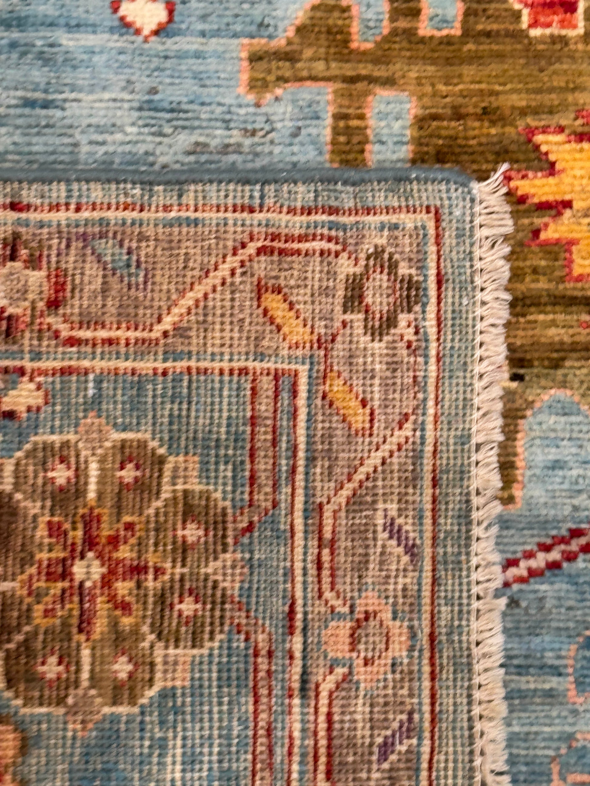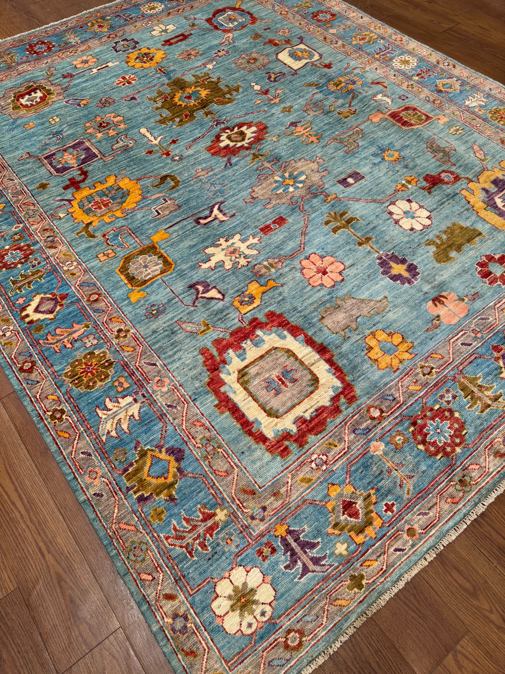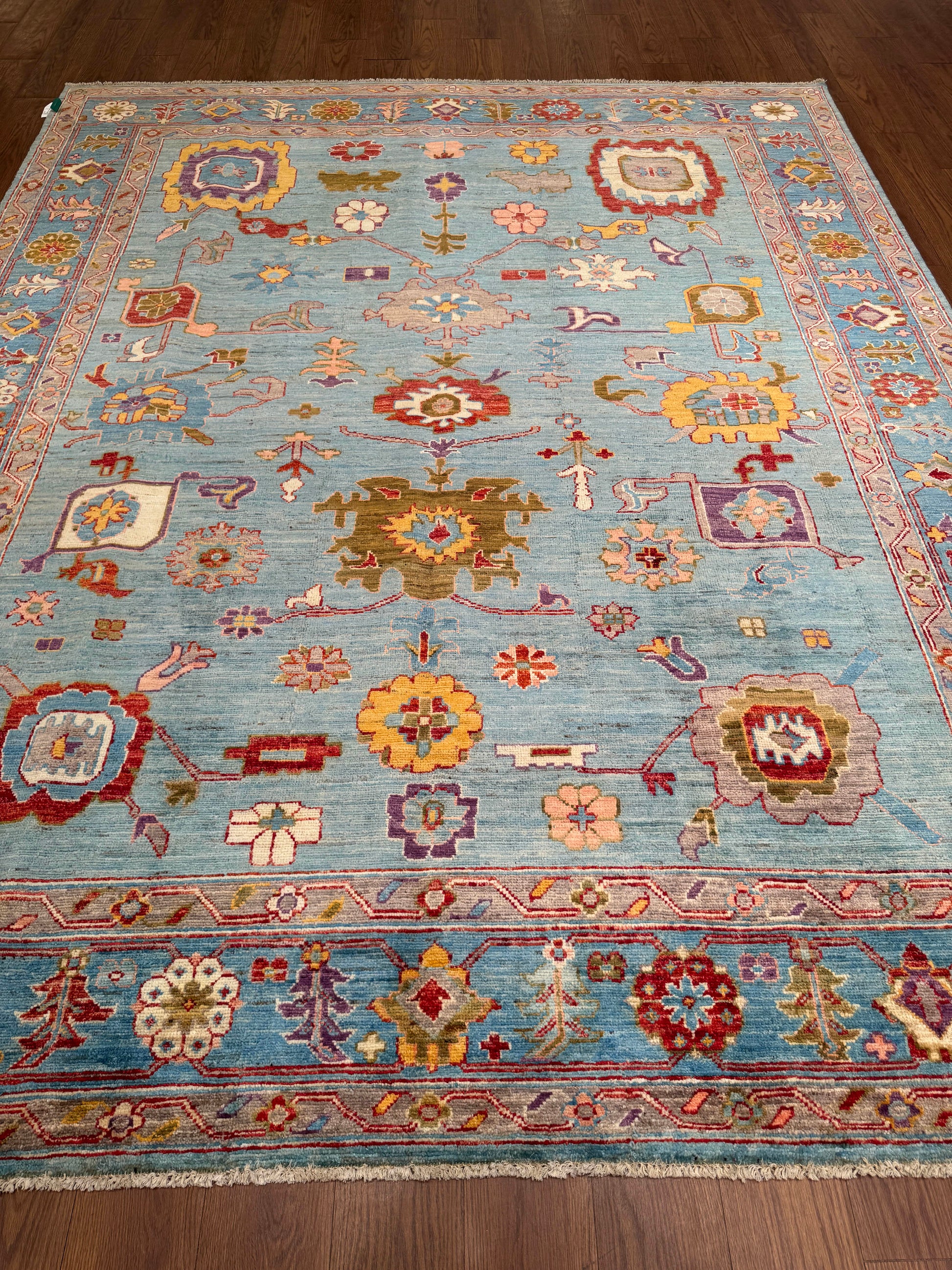 This handwoven rug features a lively display of floral and geometric motifs set against a sky-blue field. Warm accents of red, gold, ivory, lavender, and green create a colorful yet harmonious composition, while the detailed border enhances the overall charm with repeating botanical elements. Crafted from fine wool, this rug balances durability with elegance, making it a versatile piece for brightening both traditional and eclectic interiors.