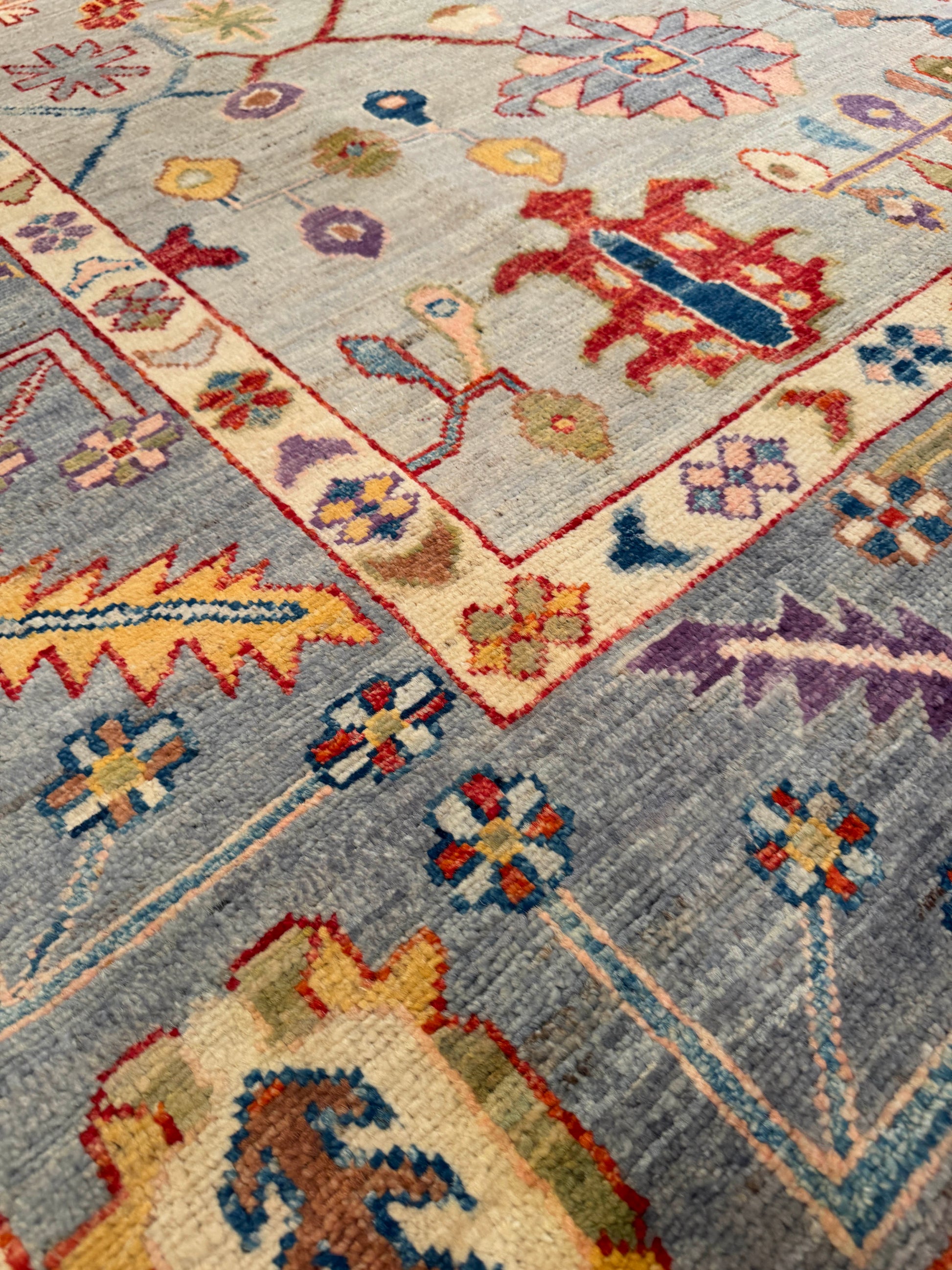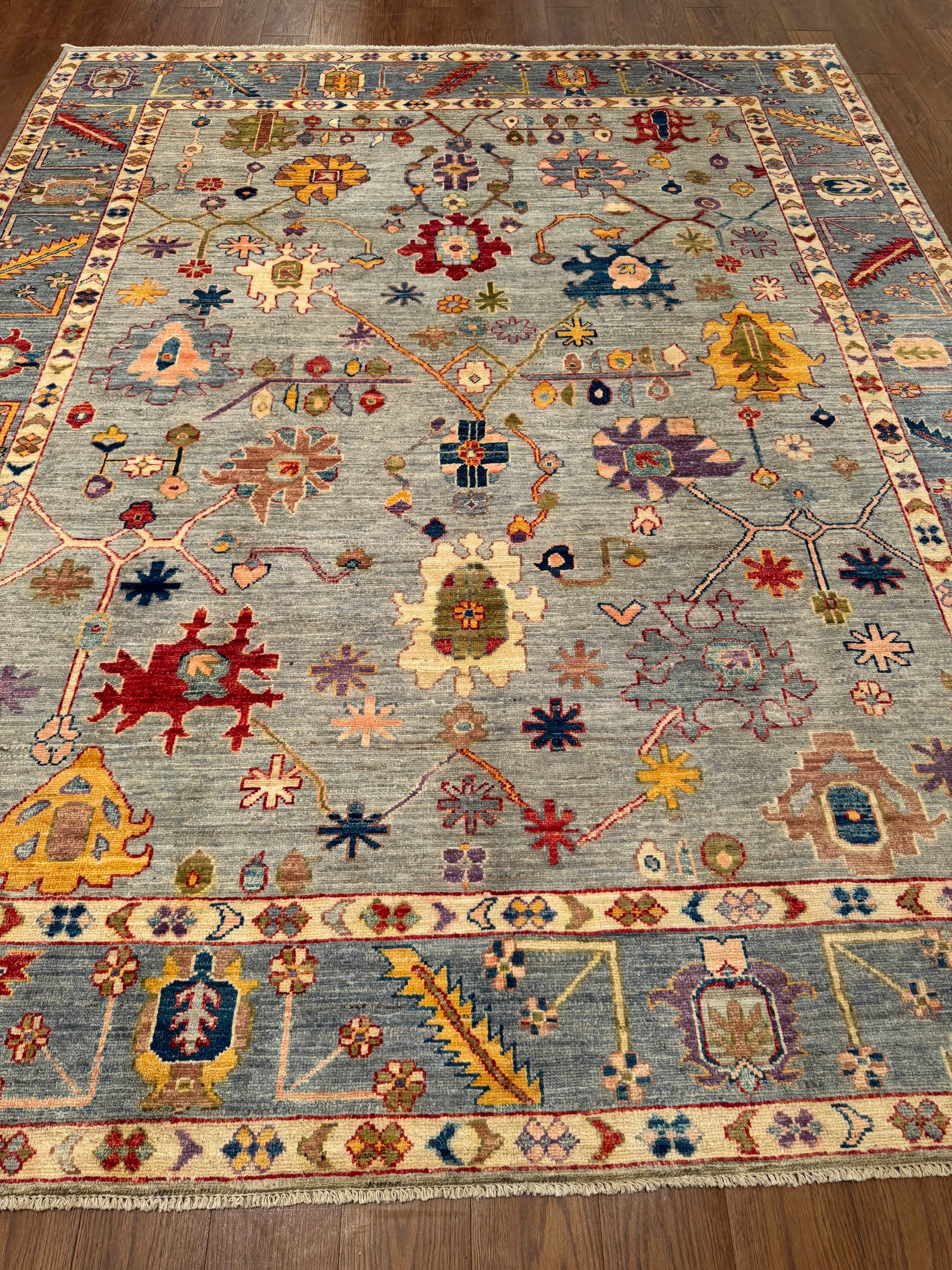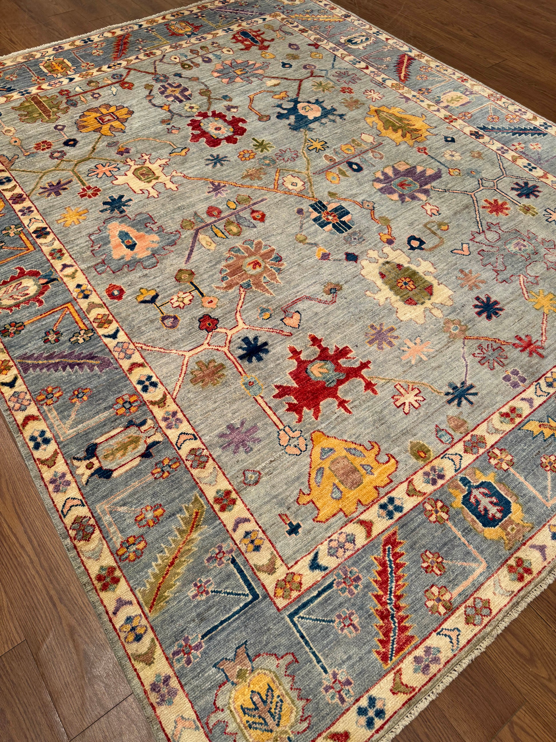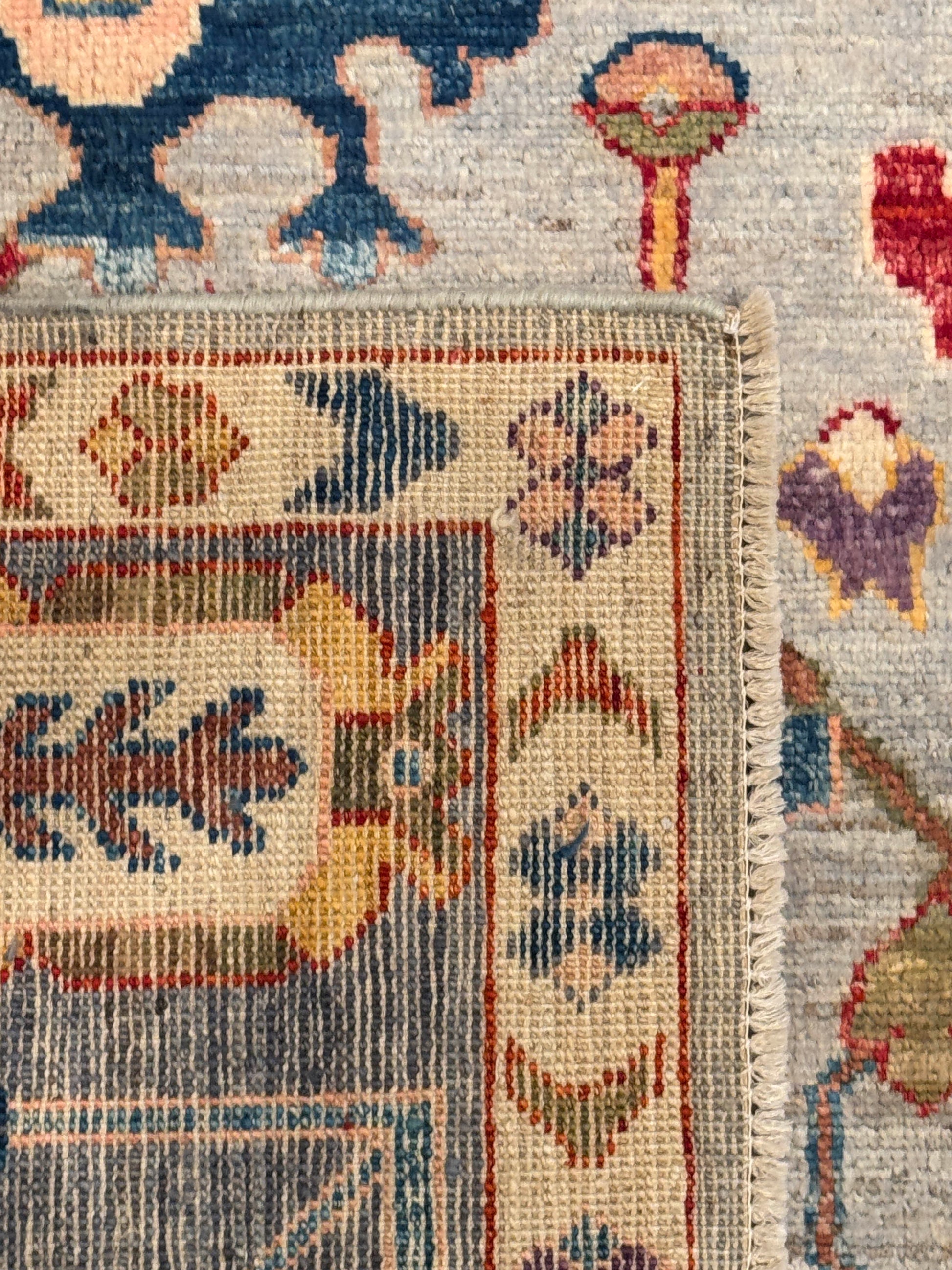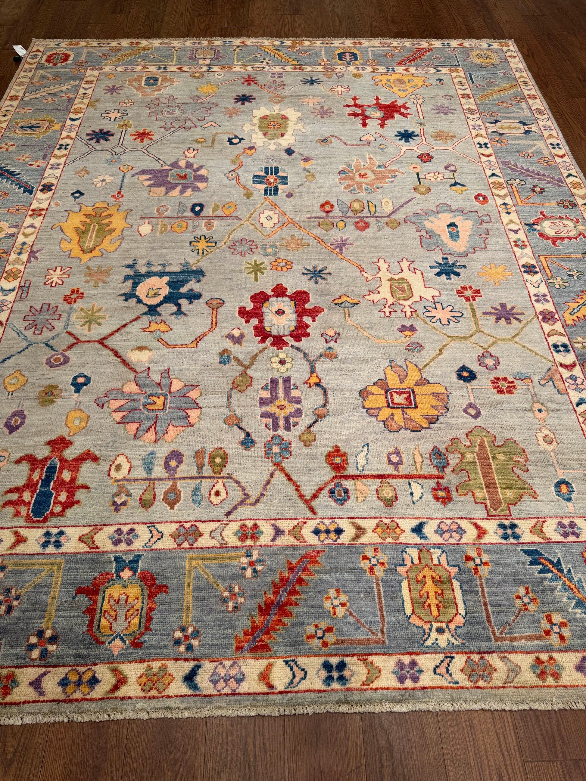 This handwoven rug showcases a light gray field adorned with whimsical floral and geometric motifs in a vibrant array of colors. Accents of red, gold, lavender, blue, and green create a lively composition, while the patterned border adds depth and structure to the design. Woven from durable wool, it brings both playfulness and refinement, making it a standout addition to eclectic, transitional, or modern-traditional spaces.