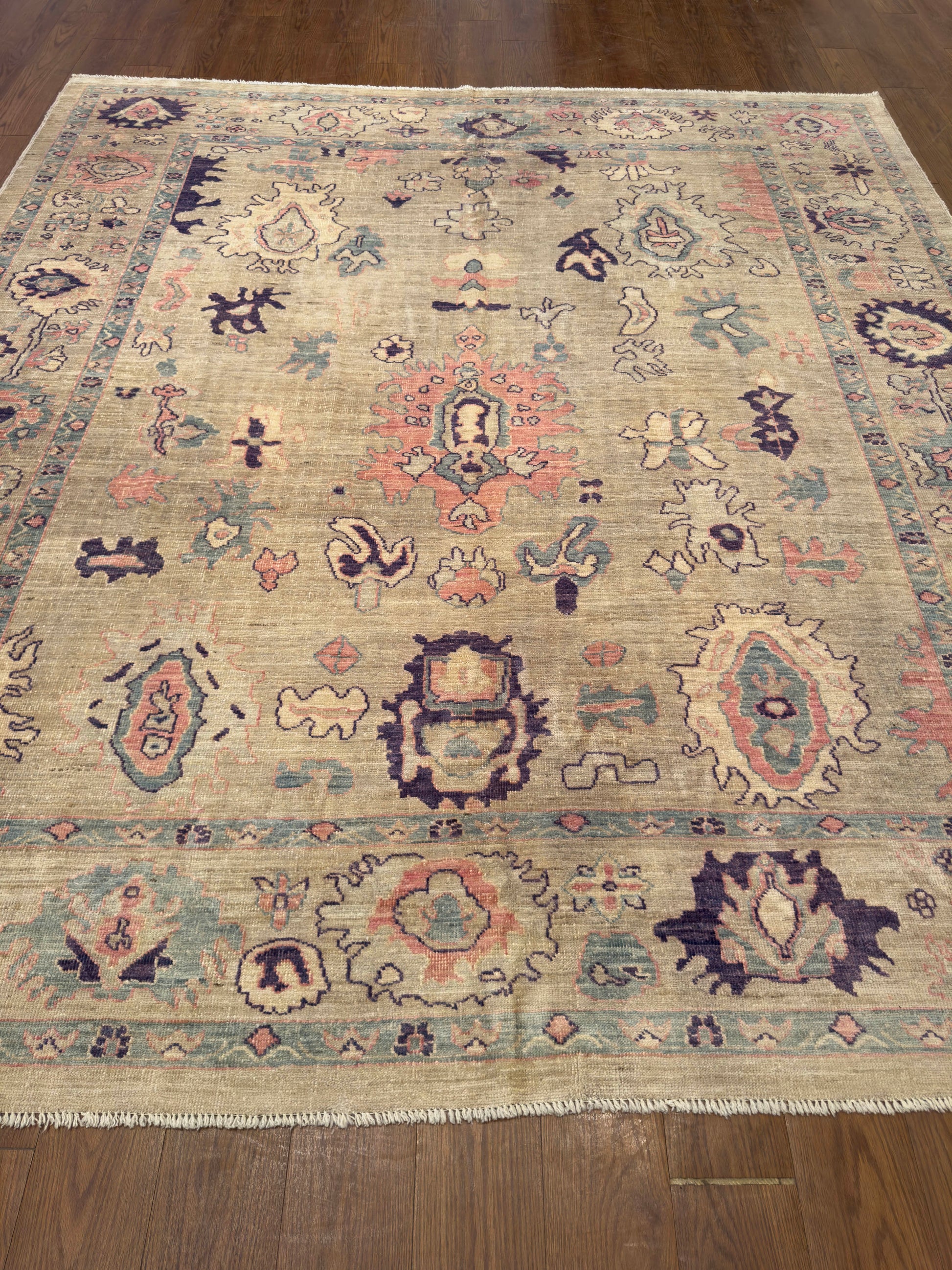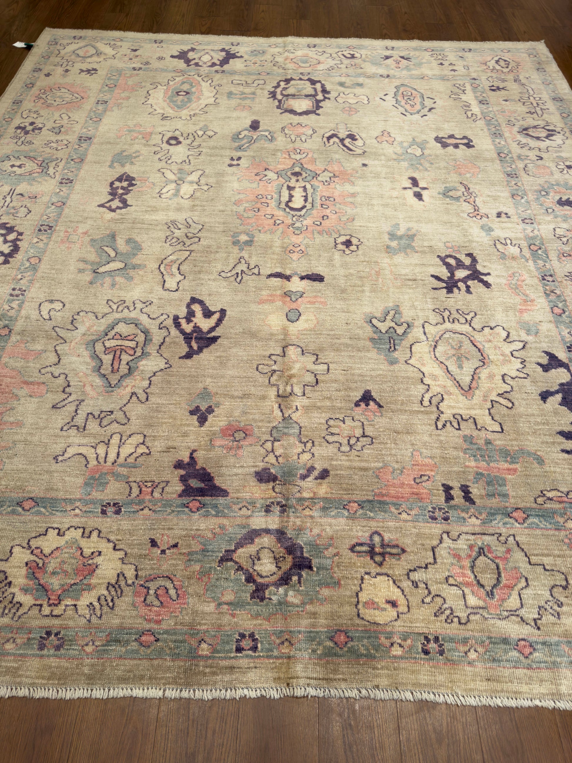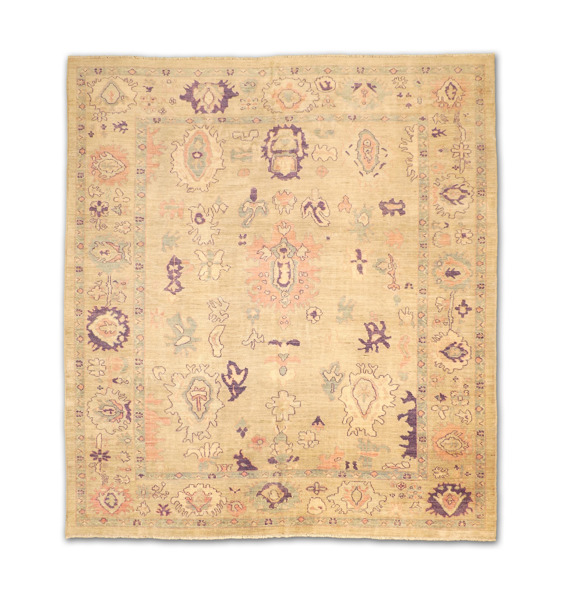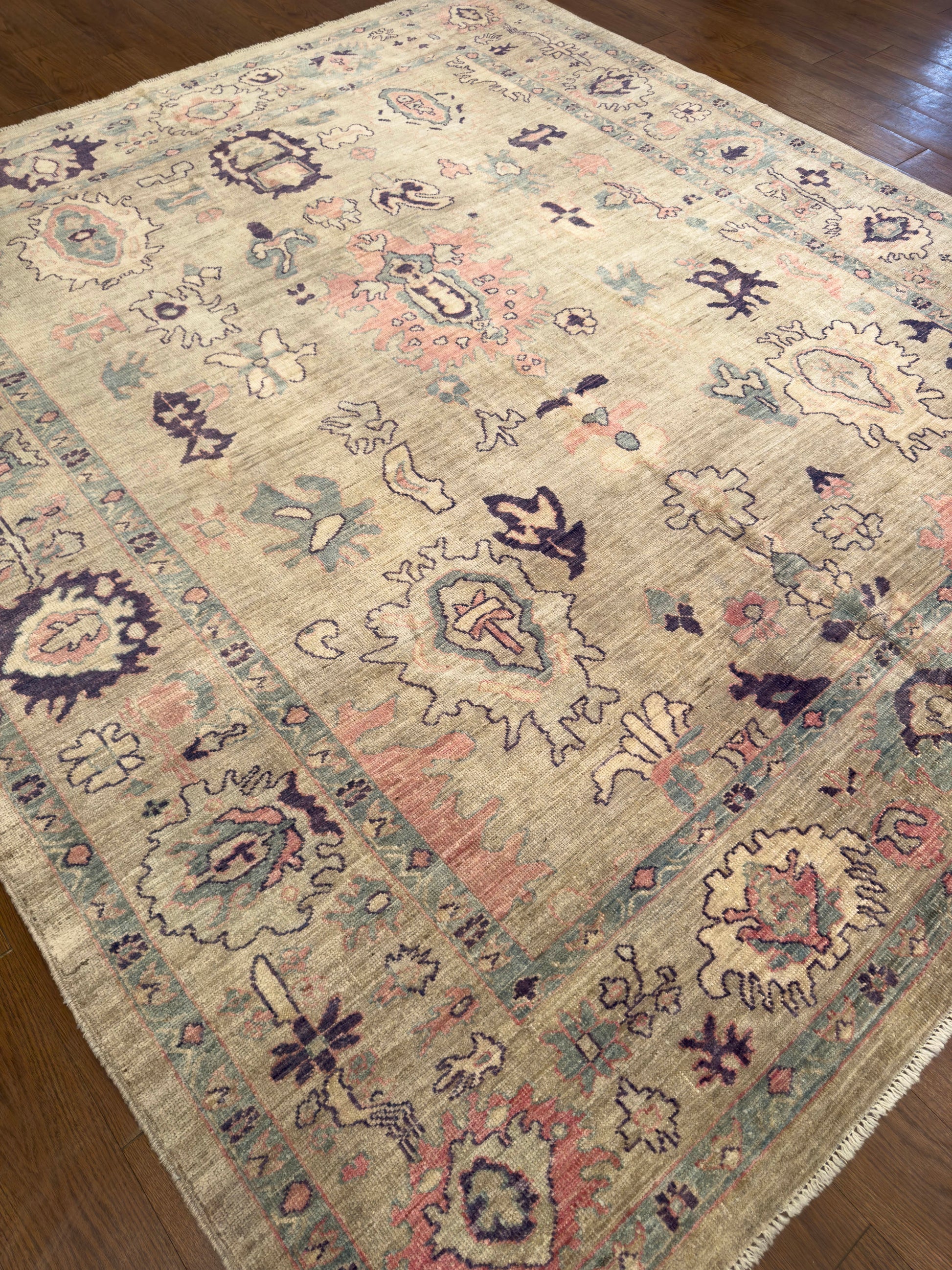 This handwoven rug carries a graceful, understated charm with its muted tones of lavender, blush, soft blue, and beige. The scattered large-scale motifs and bordered frame create a balanced yet relaxed composition, while the faded finish enhances its vintage appeal. Its versatile palette allows it to seamlessly complement both modern and traditional interiors.