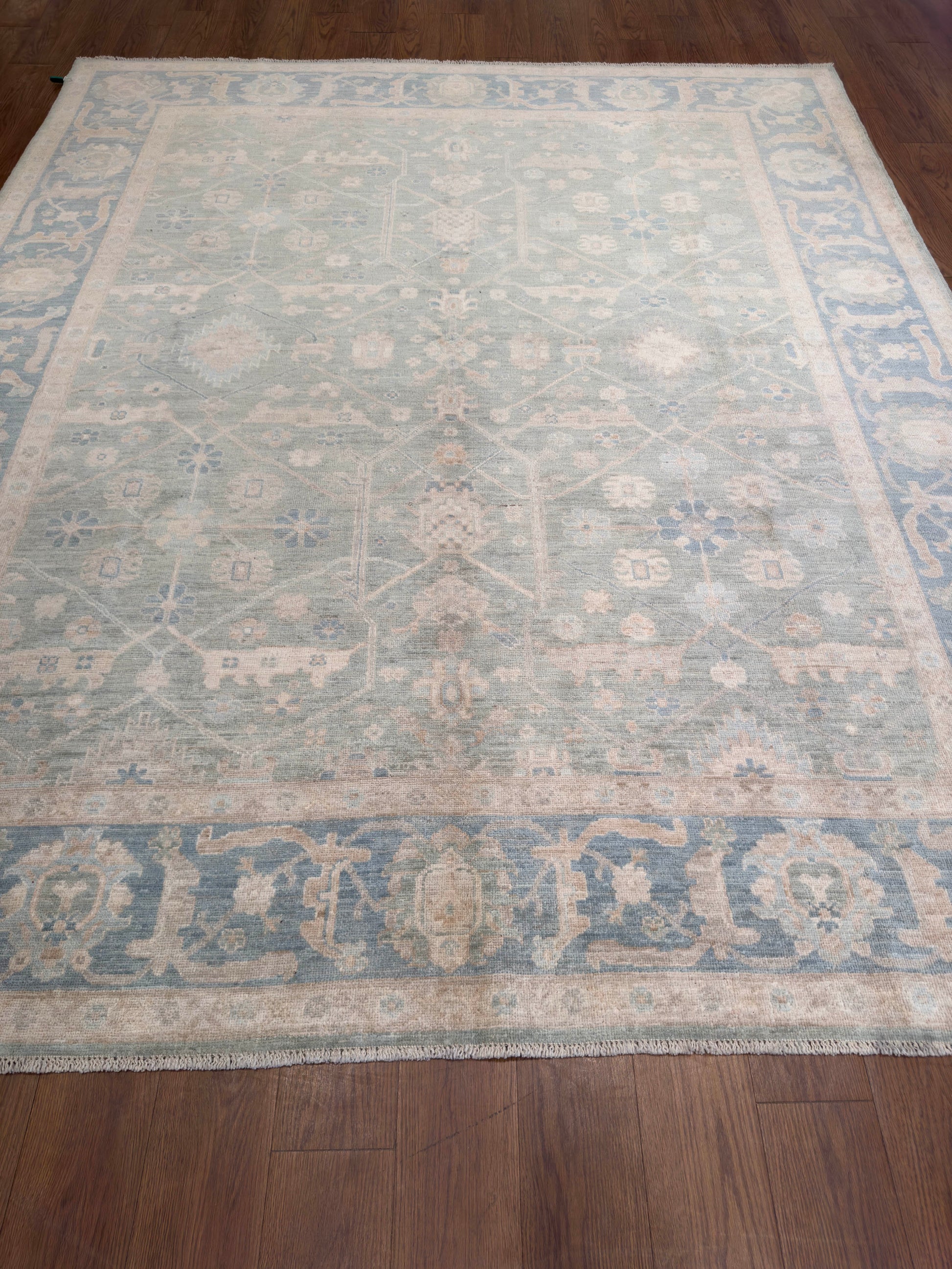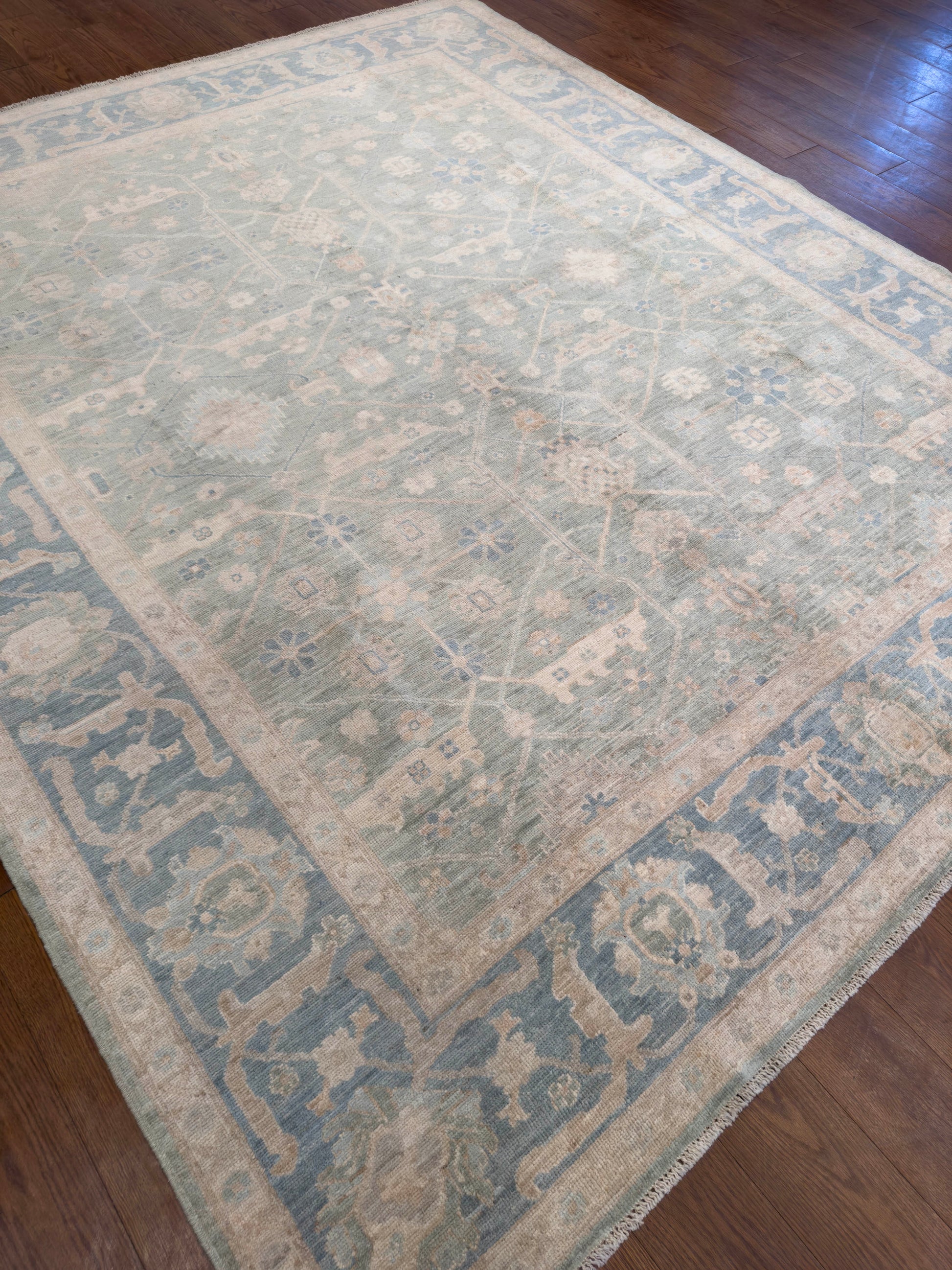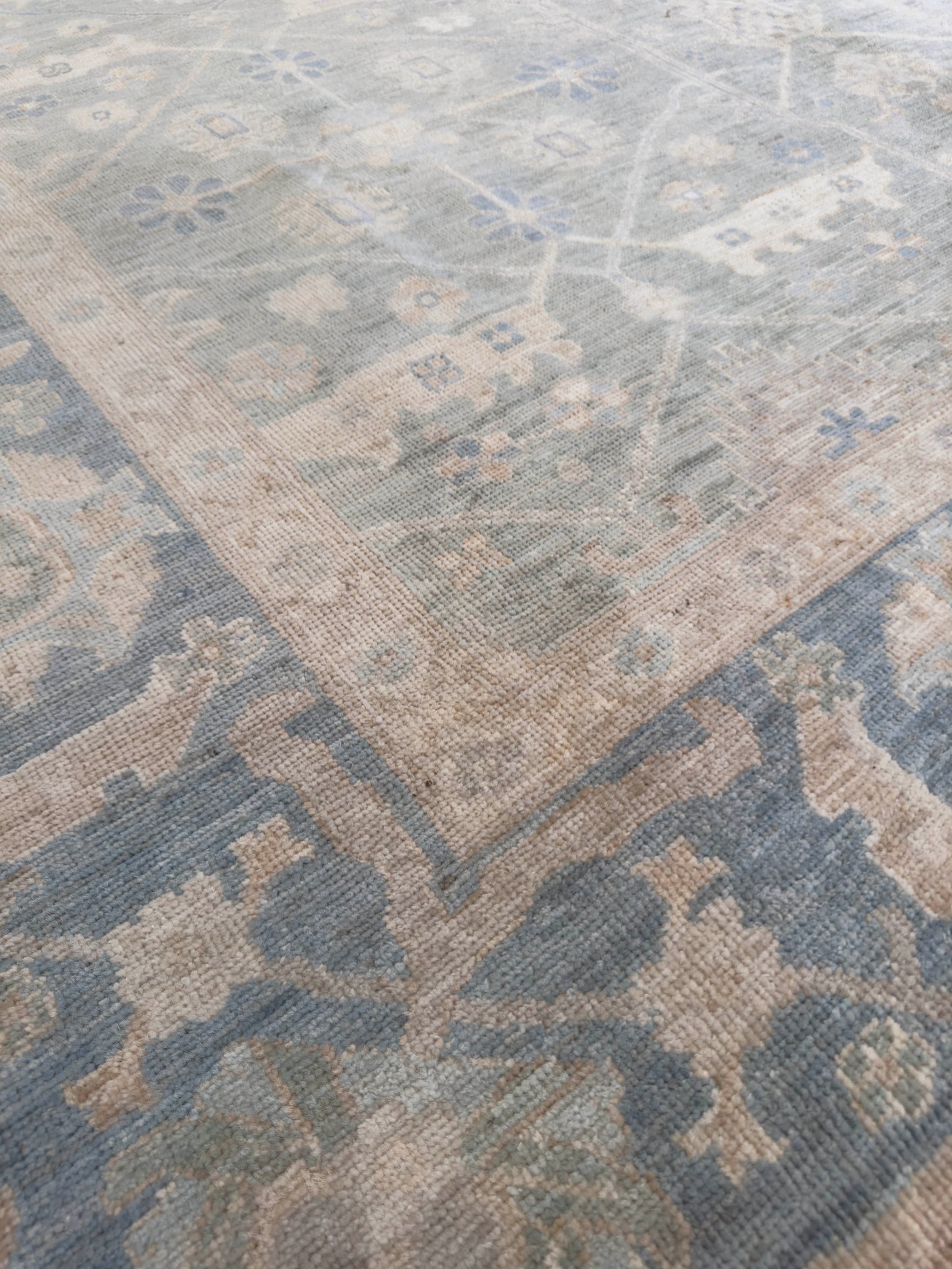 This handwoven rug exudes a soft elegance with its muted pastel tones and gently faded motifs. The delicate allover floral and geometric patterns are framed by a wide border, blending pale blue, ivory, and beige for a calming, understated look. Its washed appearance gives it a timeless vintage feel, perfect for refined yet relaxed interiors.