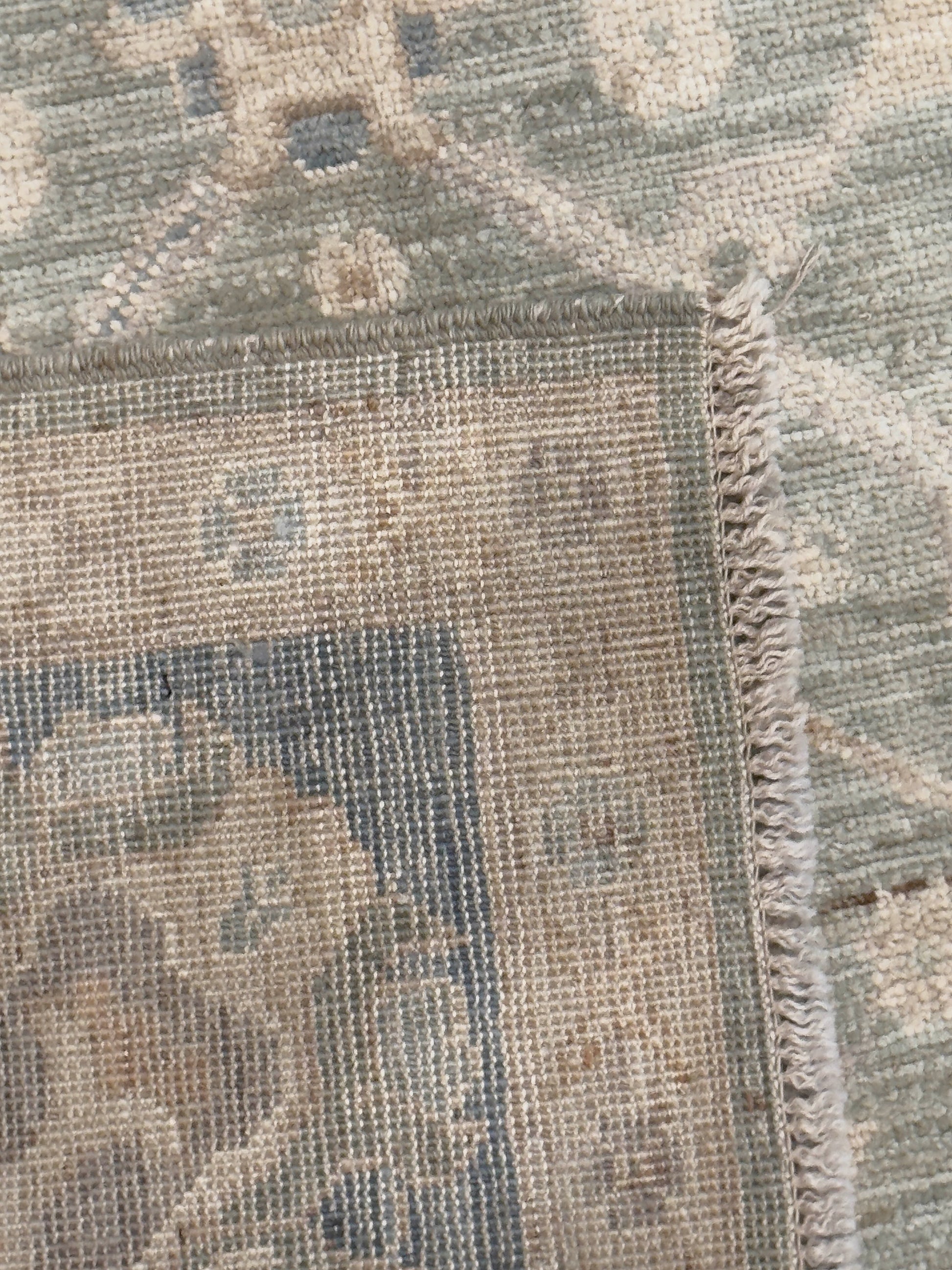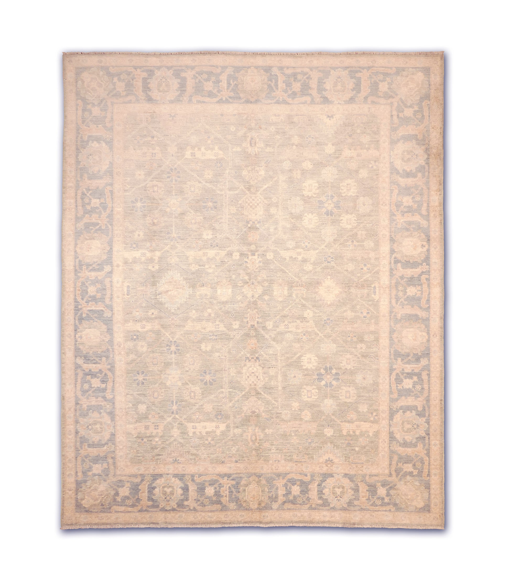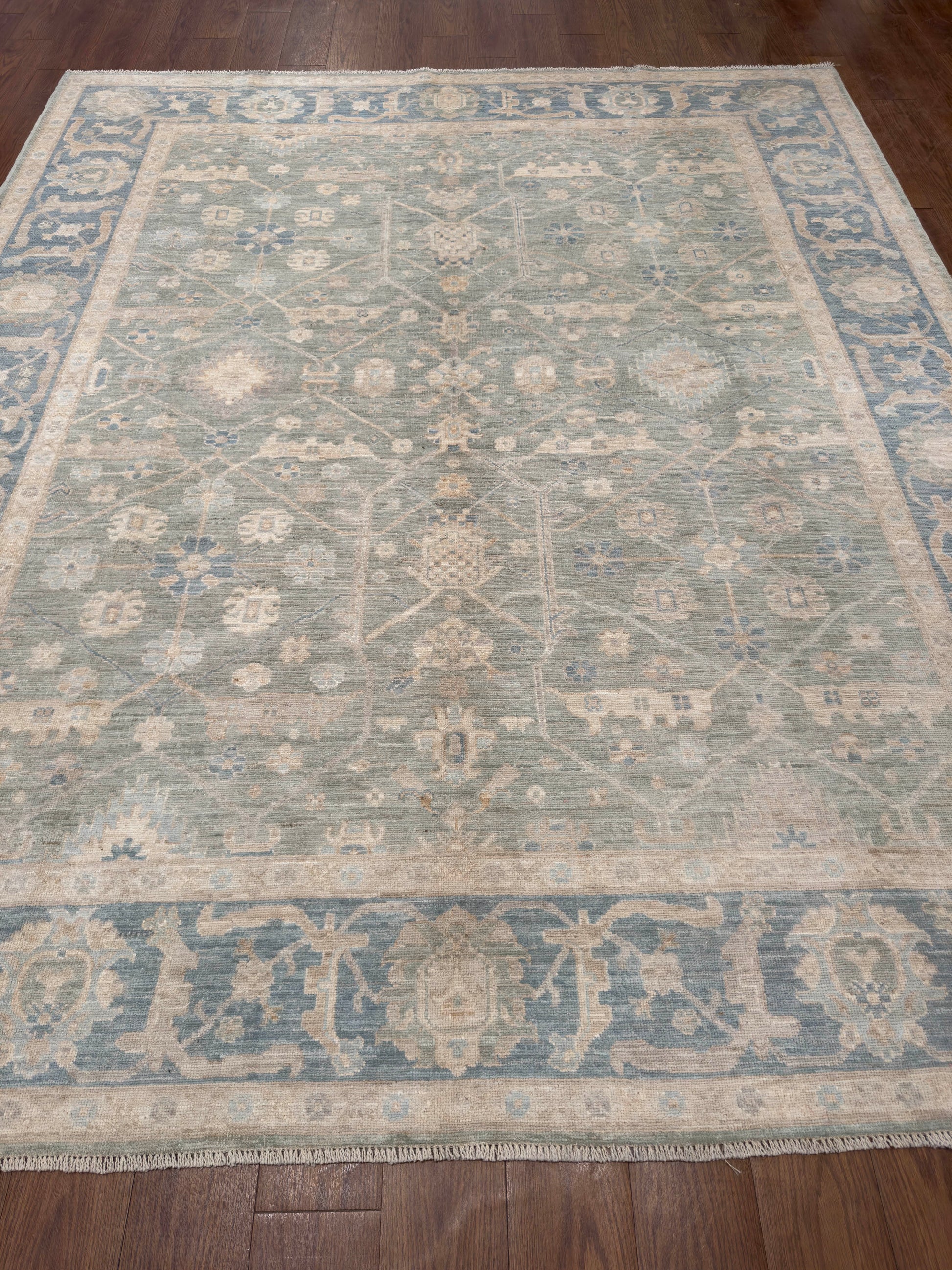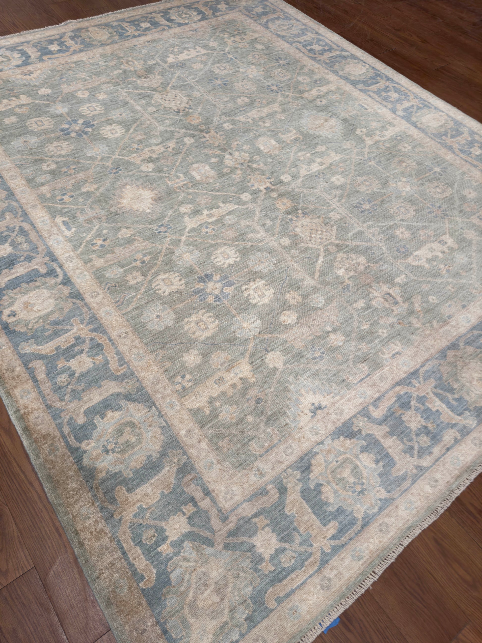 This handwoven rug exudes a soft elegance with its muted pastel tones and gently faded motifs. The delicate allover floral and geometric patterns are framed by a wide border, blending pale blue, ivory, and beige for a calming, understated look. Its washed appearance gives it a timeless vintage feel, perfect for refined yet relaxed interiors.