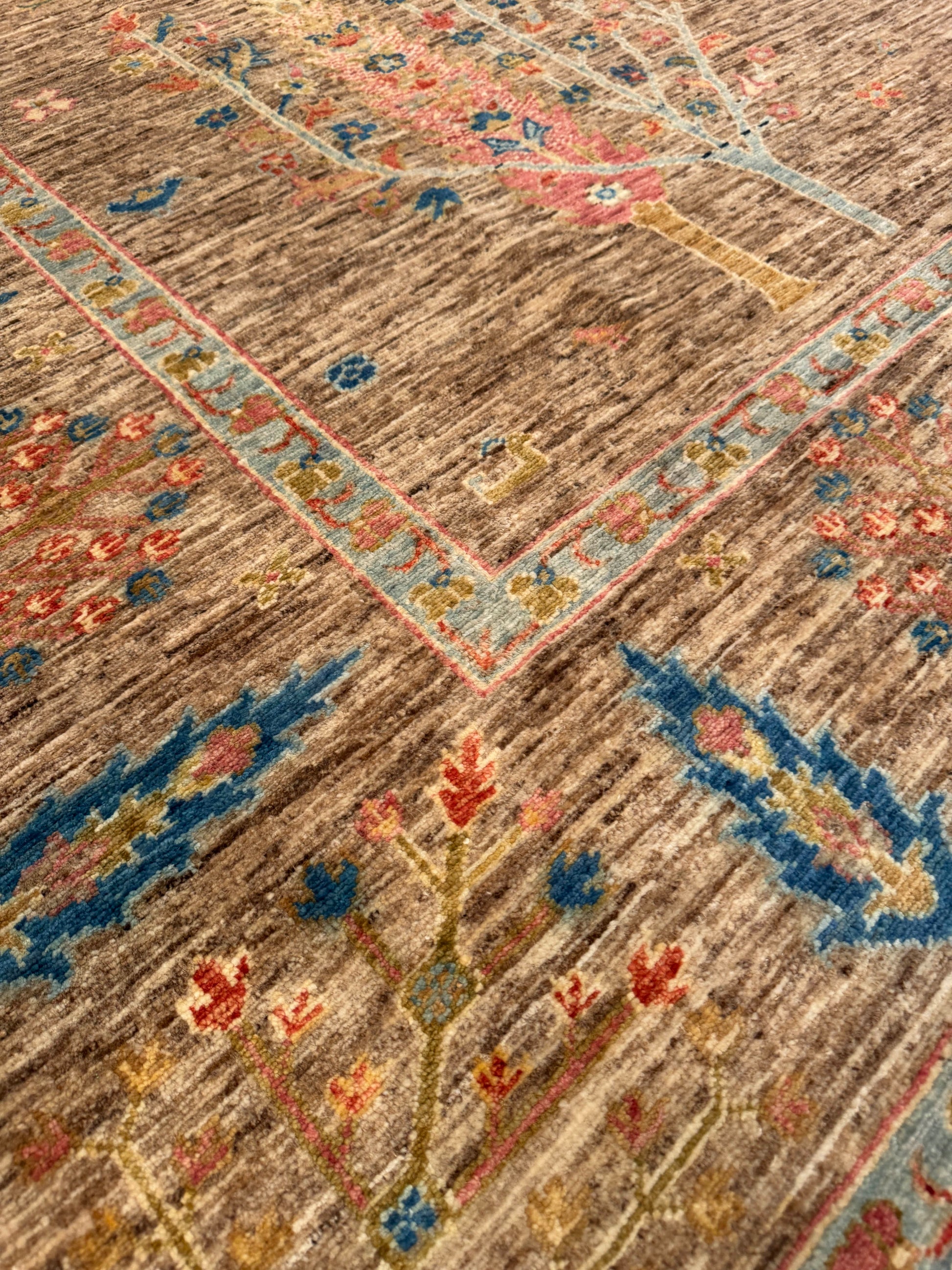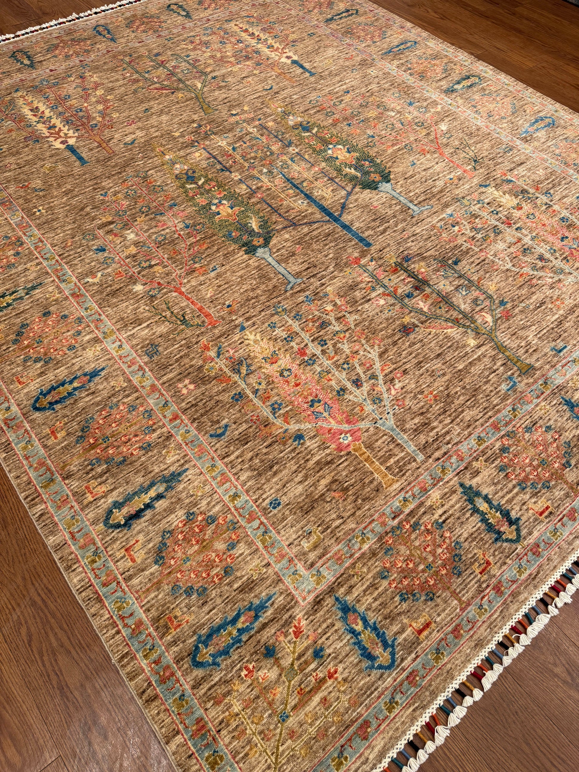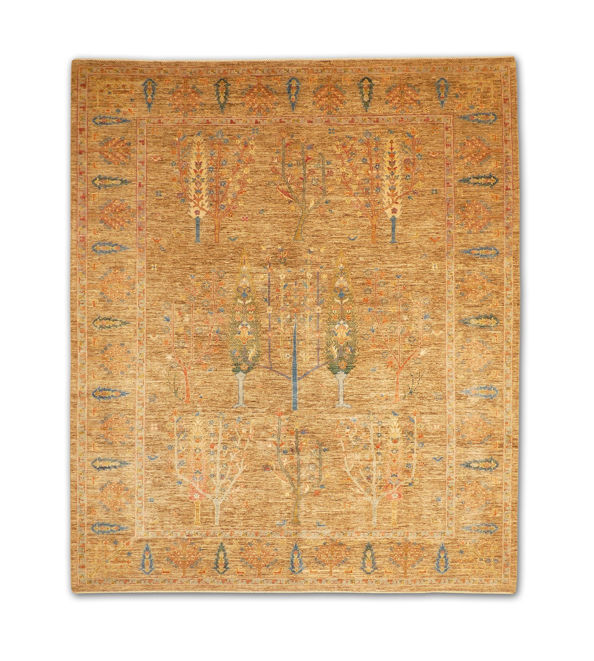 This handwoven rug showcases a beautiful tree of life design, symbolizing growth and harmony. The warm brown field is decorated with tall cypress motifs and blossoming trees, accented by vibrant touches of blue, coral, ivory, and gold. Its detailed borders add balance, making it both a decorative and meaningful statement piece.