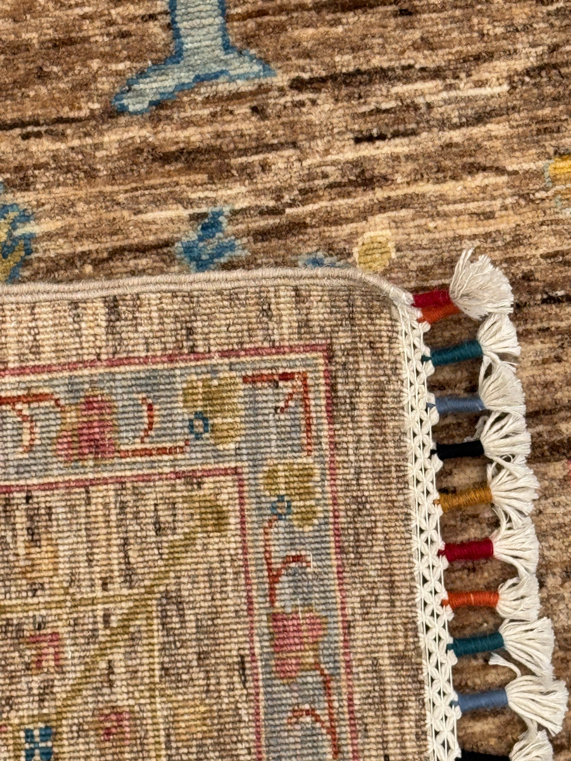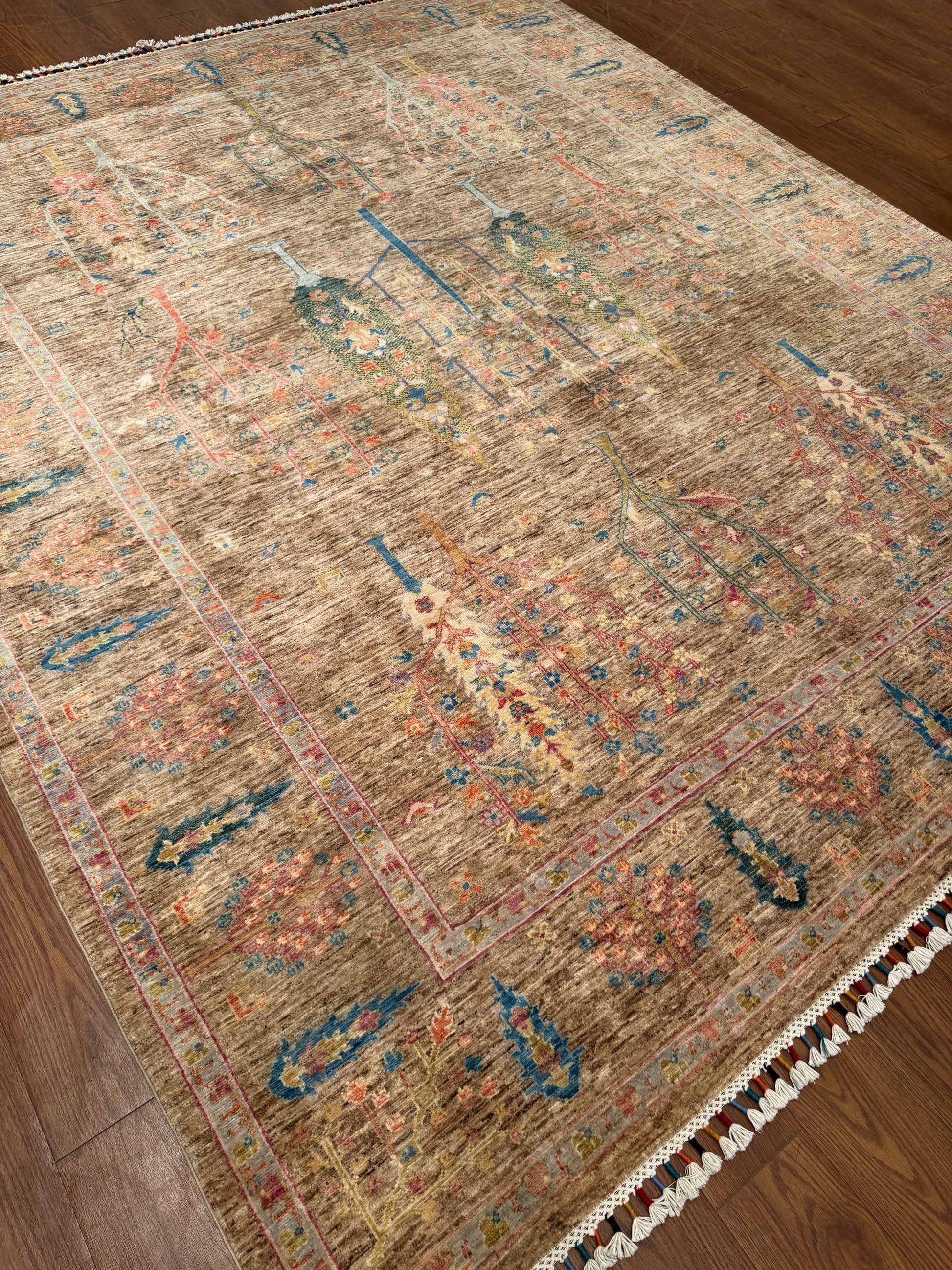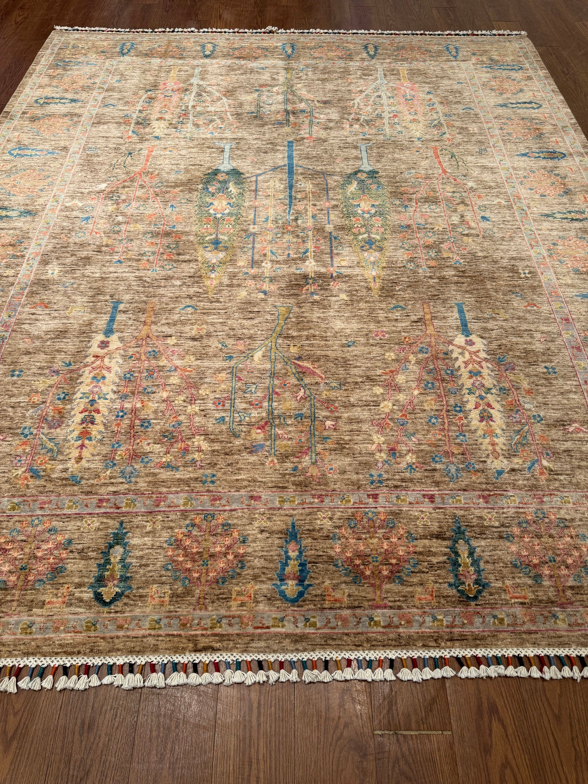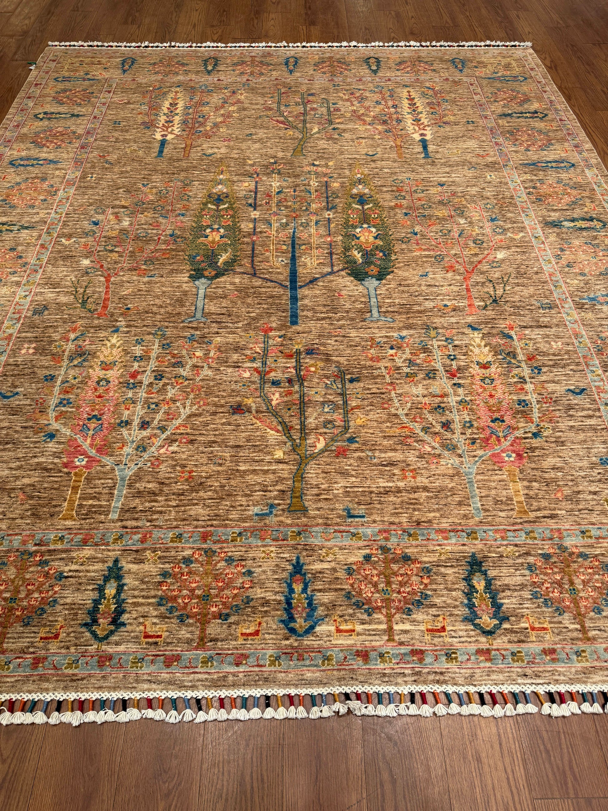 This handwoven rug showcases a beautiful tree of life design, symbolizing growth and harmony. The warm brown field is decorated with tall cypress motifs and blossoming trees, accented by vibrant touches of blue, coral, ivory, and gold. Its detailed borders add balance, making it both a decorative and meaningful statement piece.