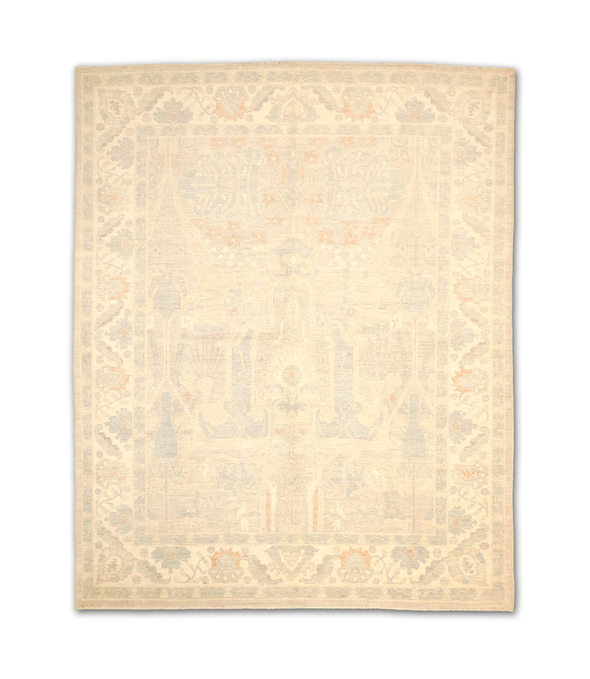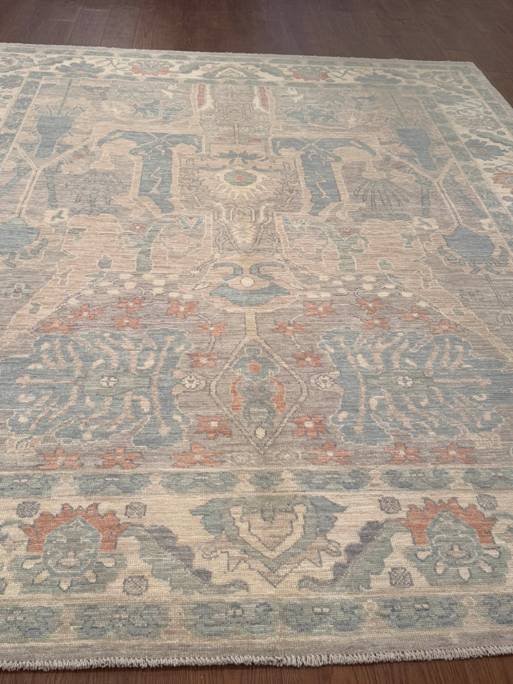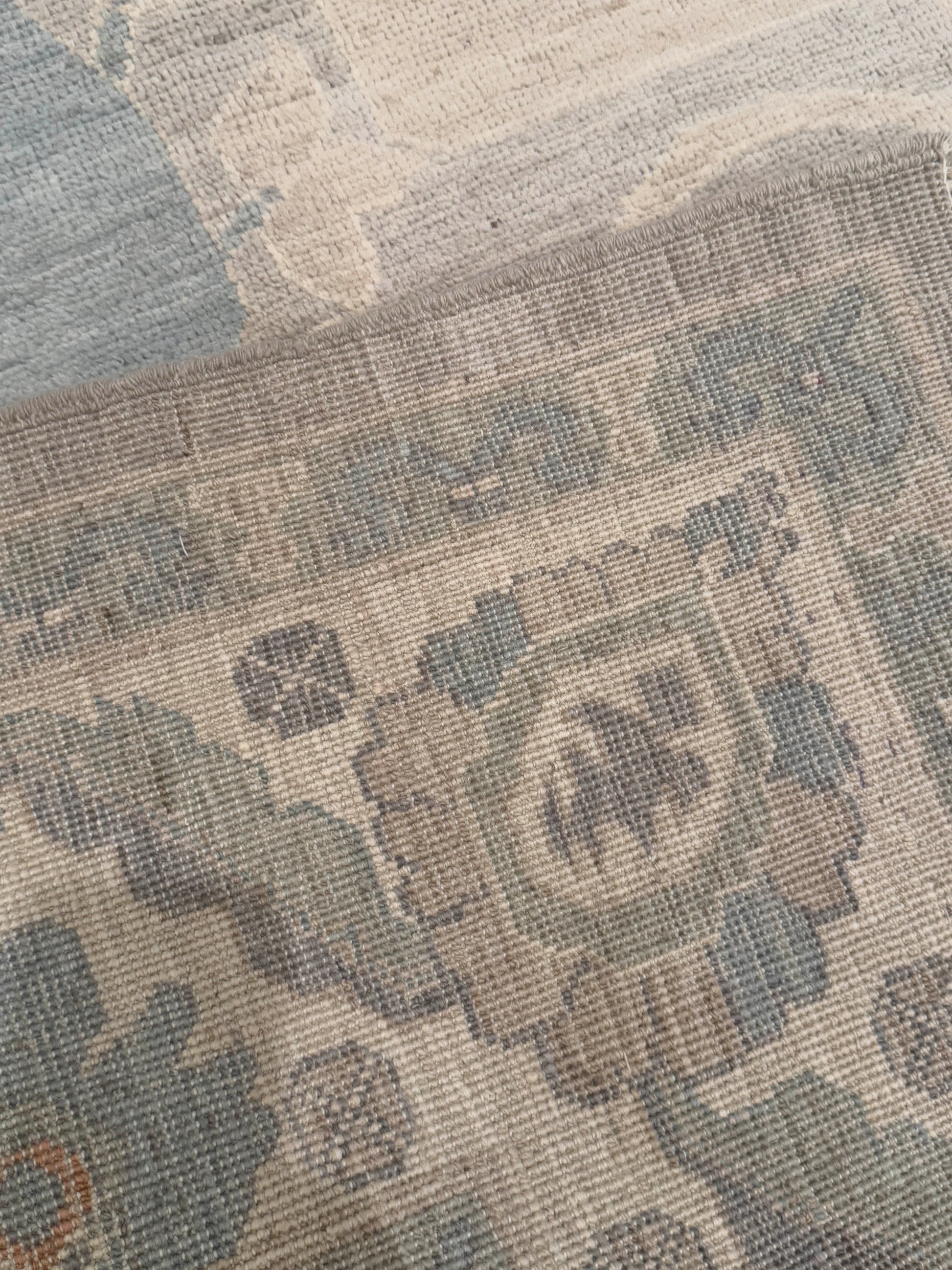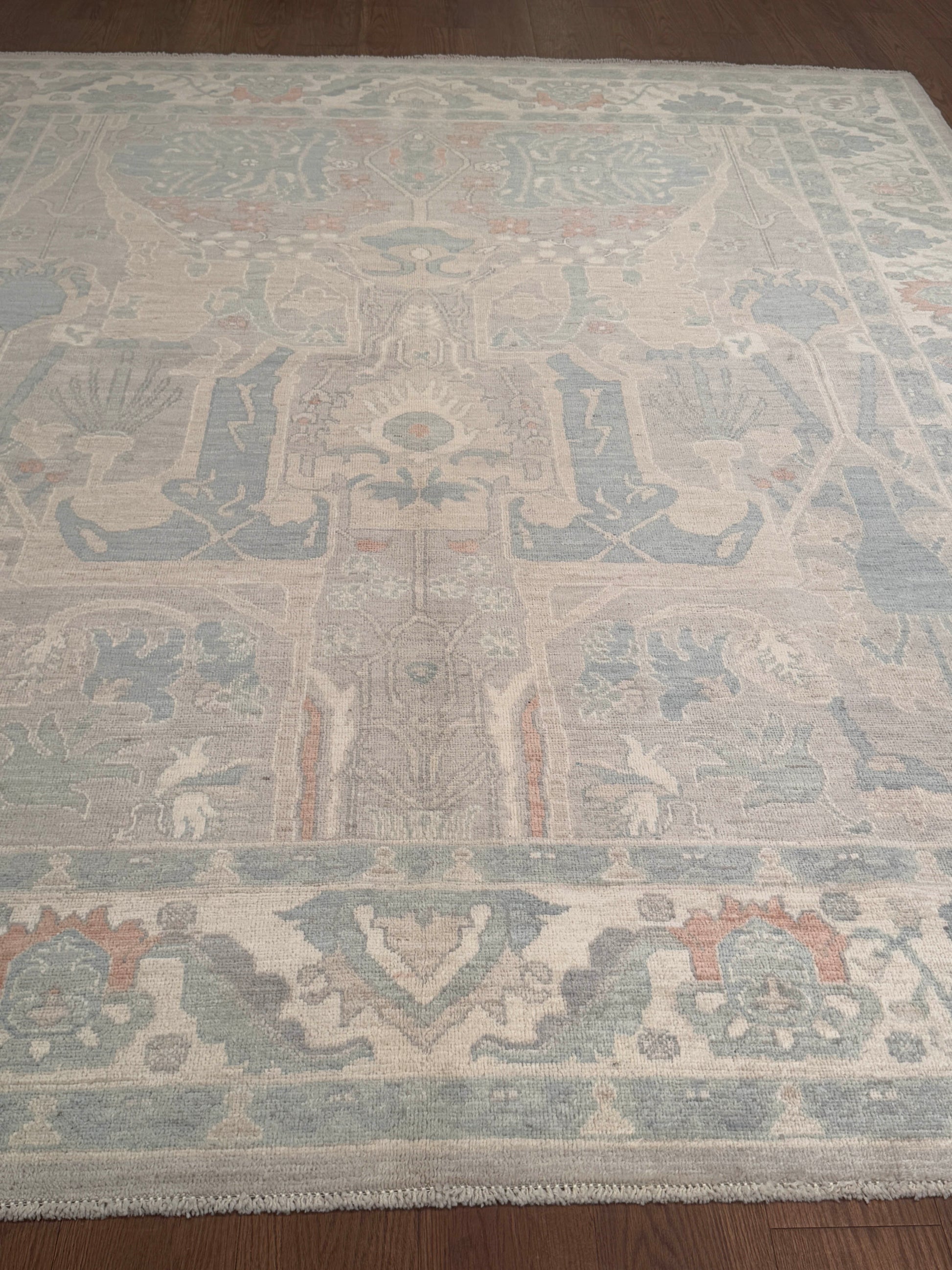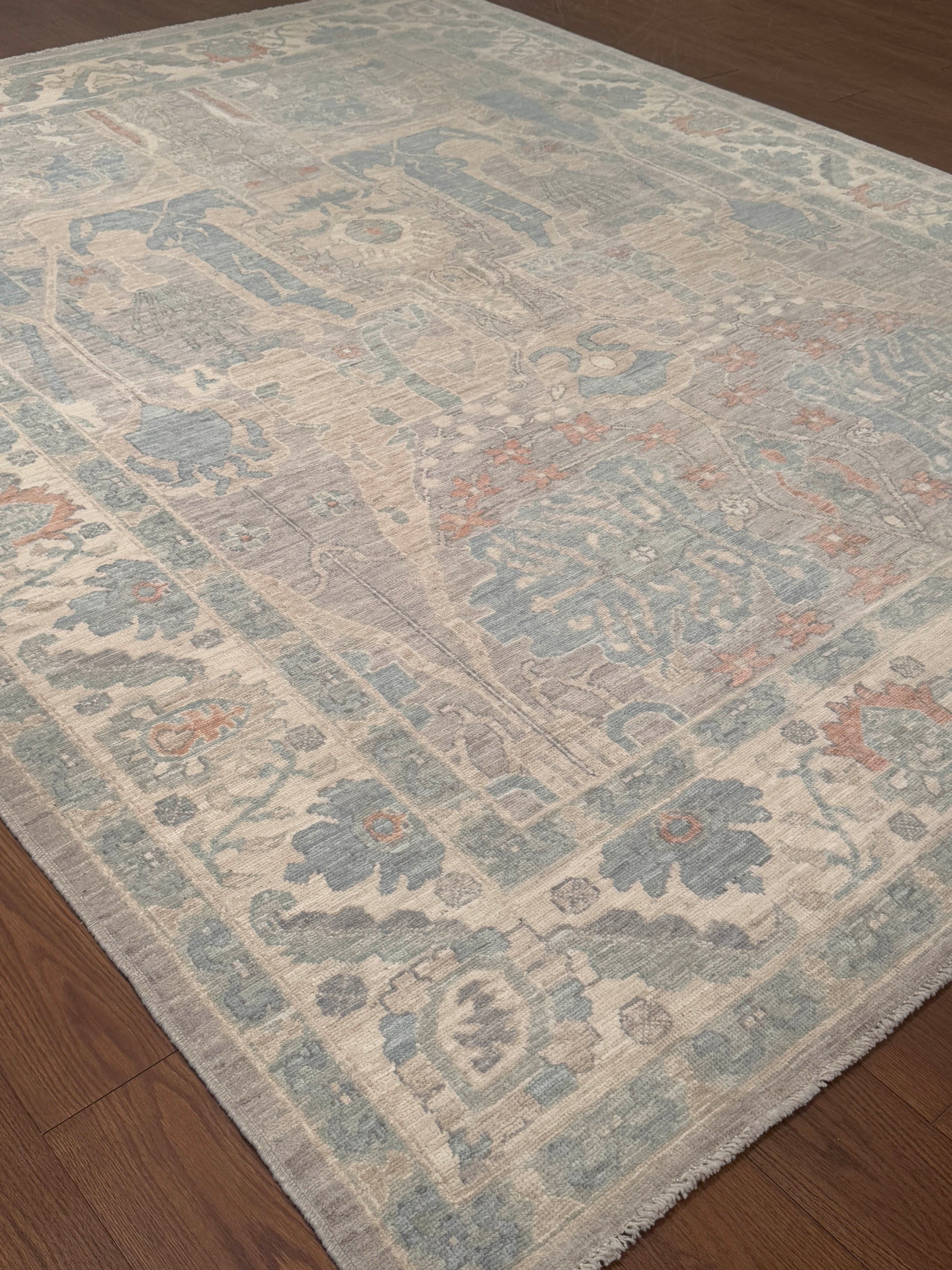 This handwoven rug features a soft, washed palette of muted blues, earthy taupe, and gentle terracotta tones, creating an elegant and timeless appeal. The intricate detailing is arranged in a balanced layout of floral and geometric forms, offering both structure and flow. Its weathered finish adds depth and character, making it a versatile foundation piece for interiors that embrace subtle sophistication.