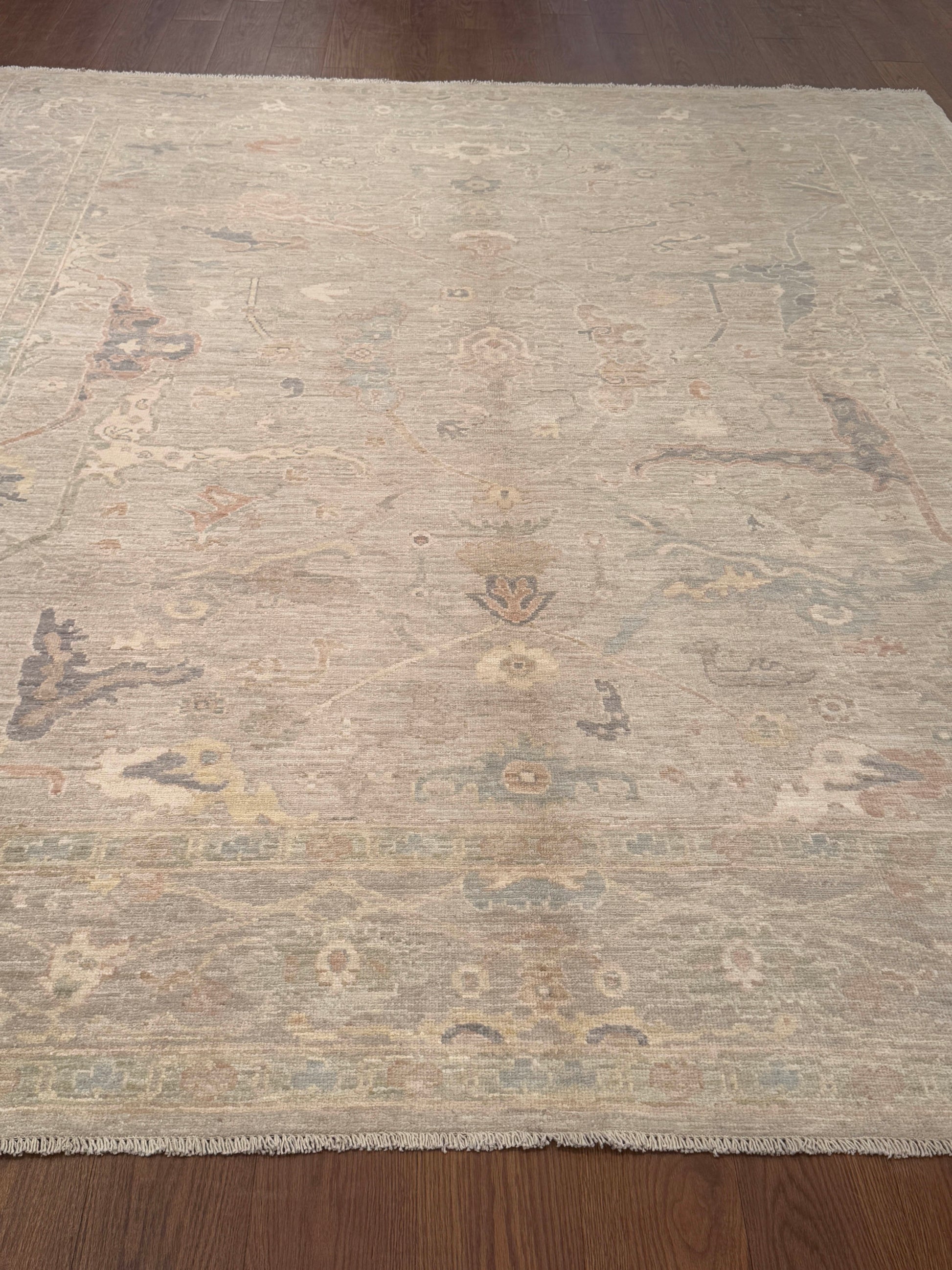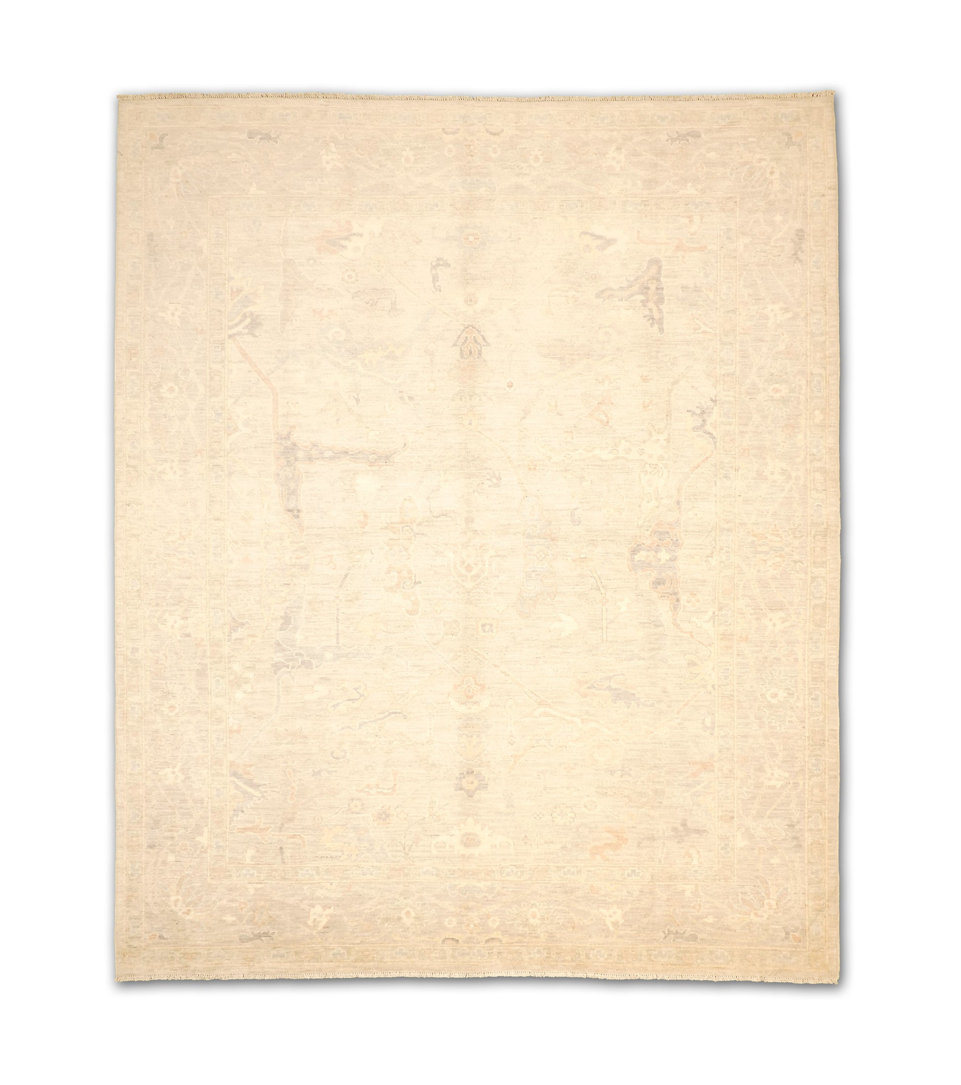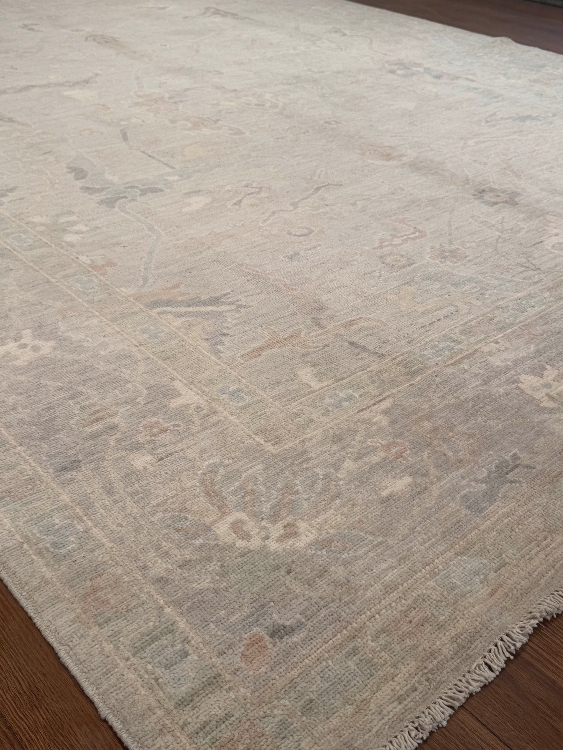 This handwoven rug embodies understated elegance with its soft, neutral palette of beige, ivory, muted gray, and gentle taupe. Subtle floral and vine motifs are delicately woven into the design, giving it a faintly distressed, timeworn character that enhances its vintage charm. Its quiet sophistication allows it to complement both classic and contemporary interiors, bringing warmth without overpowering the space.