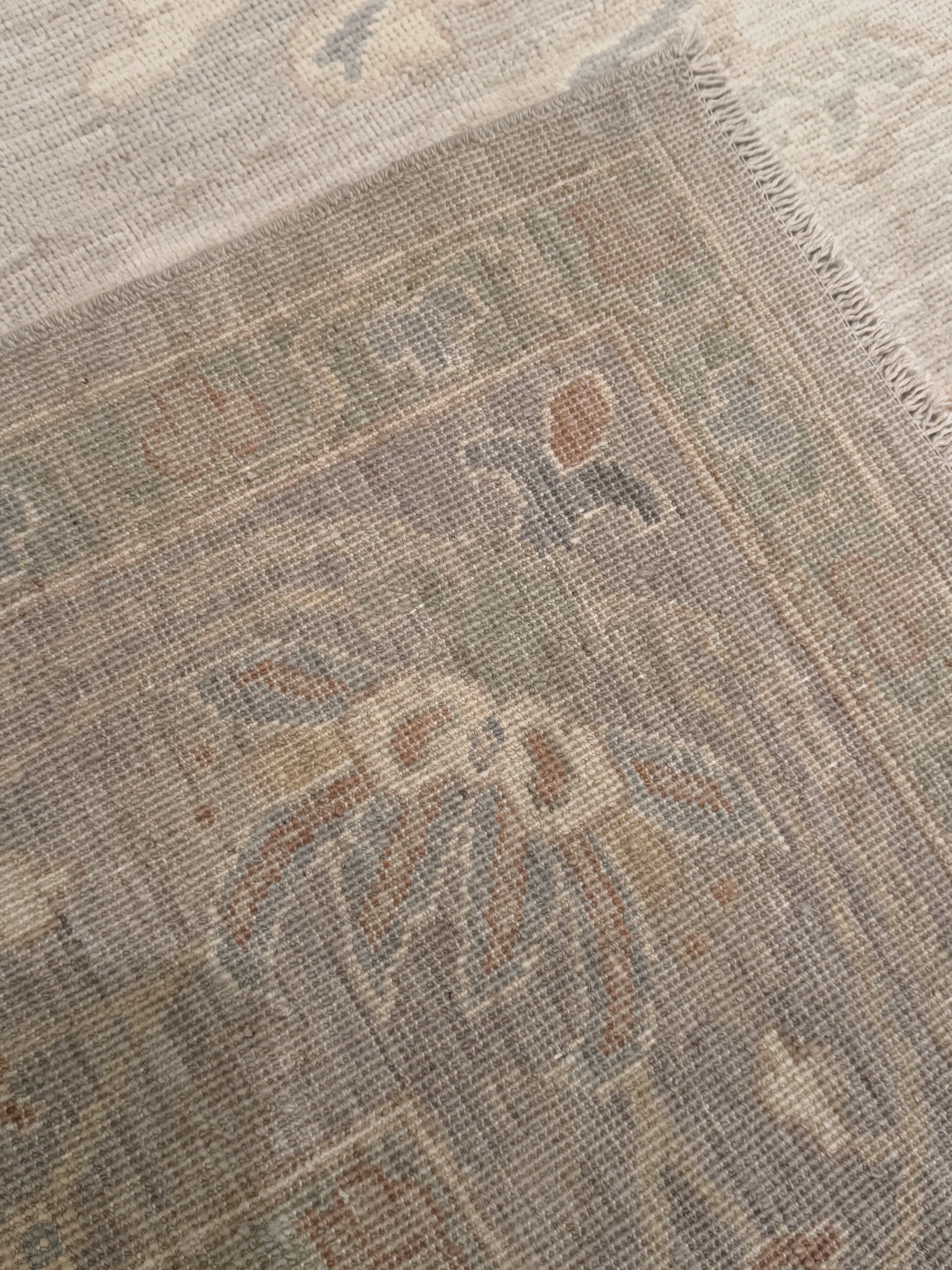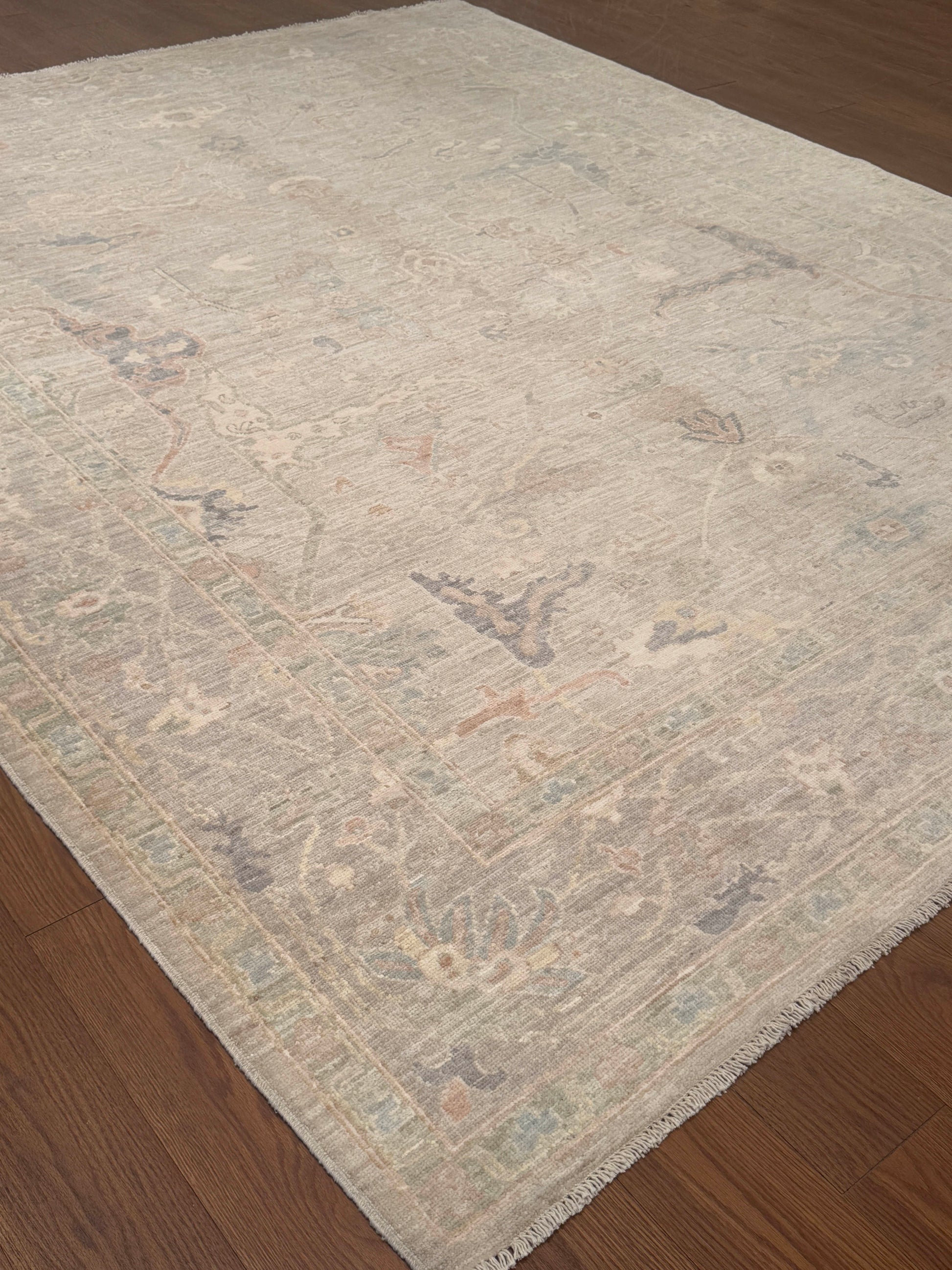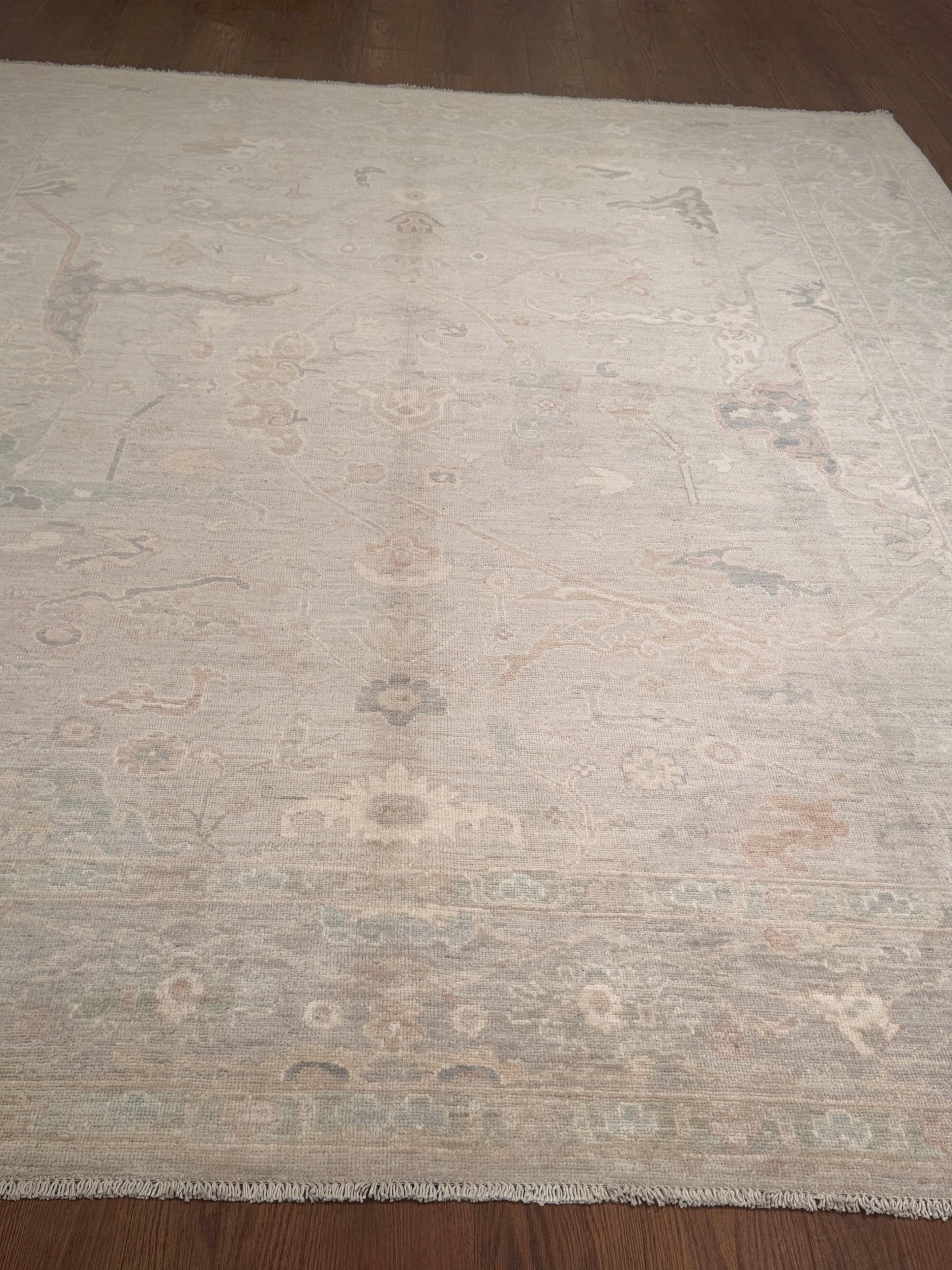 This handwoven rug embodies understated elegance with its soft, neutral palette of beige, ivory, muted gray, and gentle taupe. Subtle floral and vine motifs are delicately woven into the design, giving it a faintly distressed, timeworn character that enhances its vintage charm. Its quiet sophistication allows it to complement both classic and contemporary interiors, bringing warmth without overpowering the space.