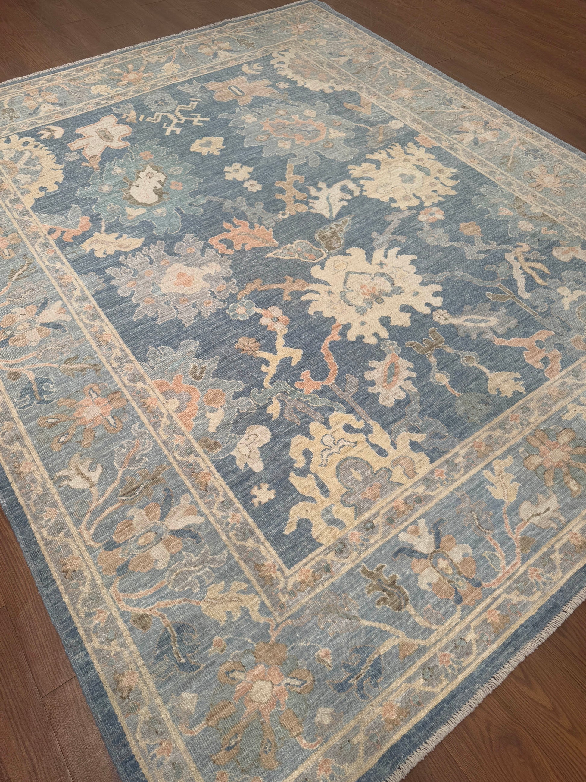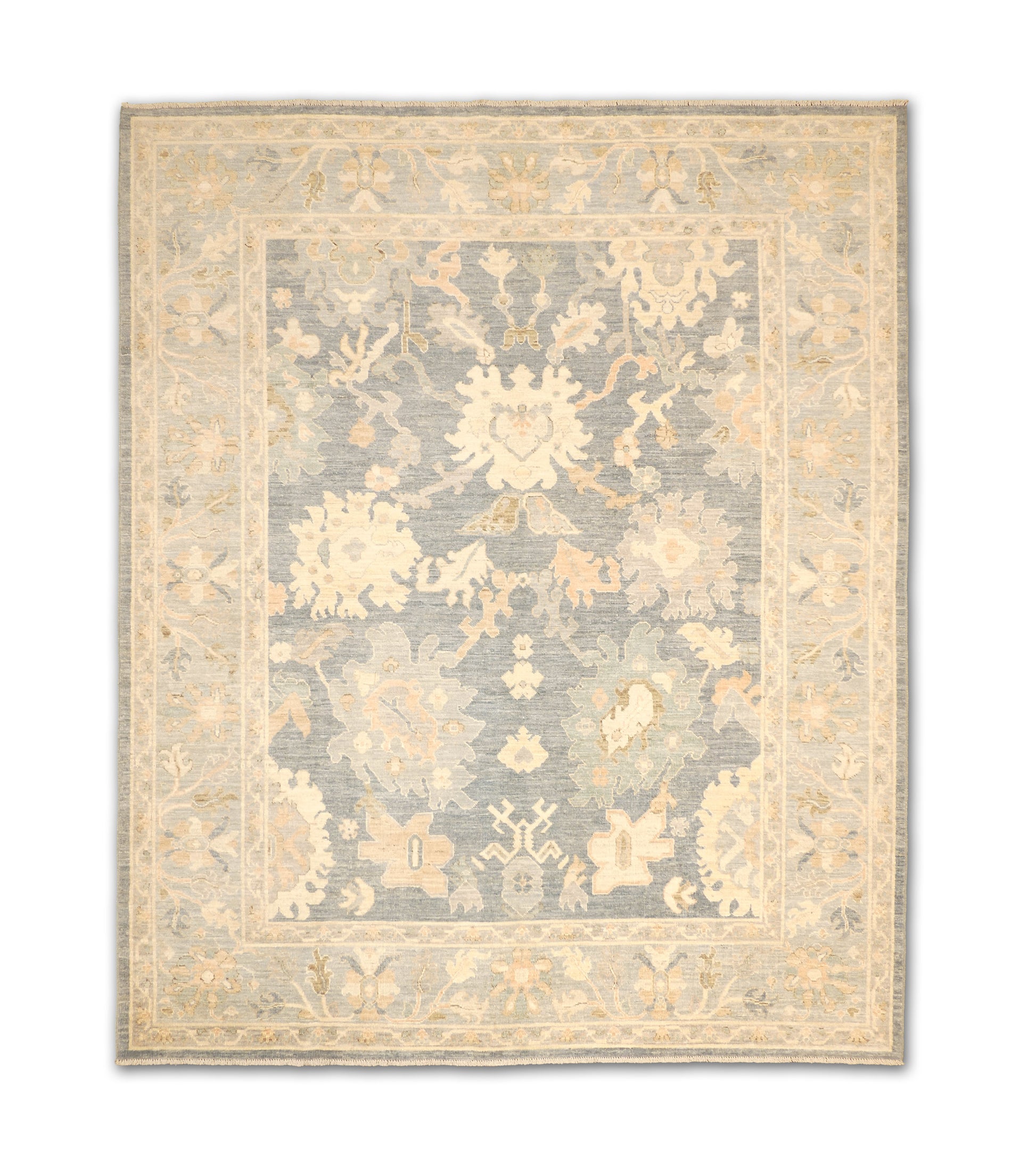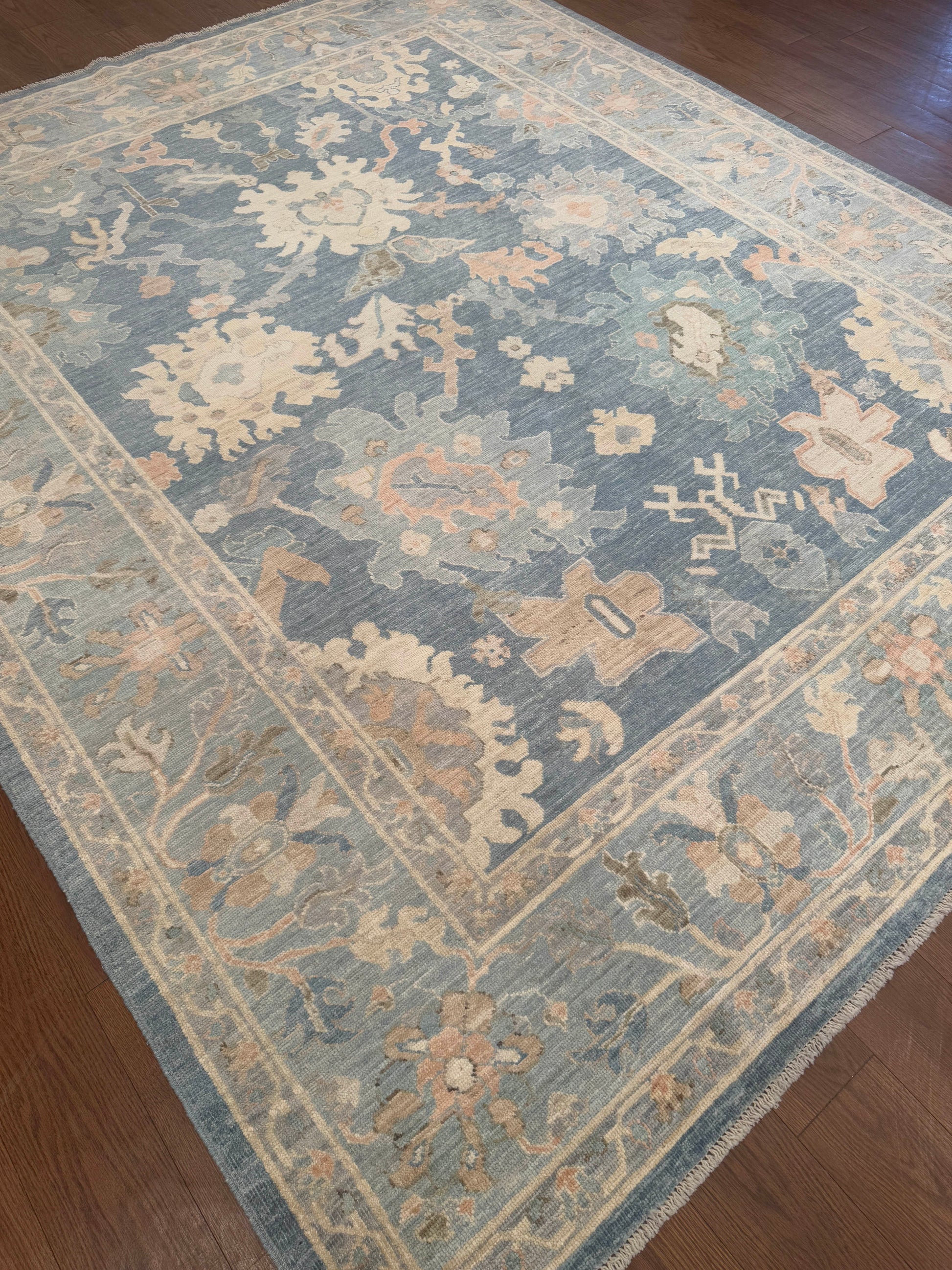 This elegant handwoven rug features a soothing palette of dusty blue, ivory, beige, and soft peach, creating a refined yet welcoming atmosphere. Large-scale floral and vine motifs flow across the field, framed by a delicately patterned border that enhances its balanced design. The muted tones and timeless layout make it versatile for both traditional and transitional interiors, offering sophistication with a touch of warmth.
