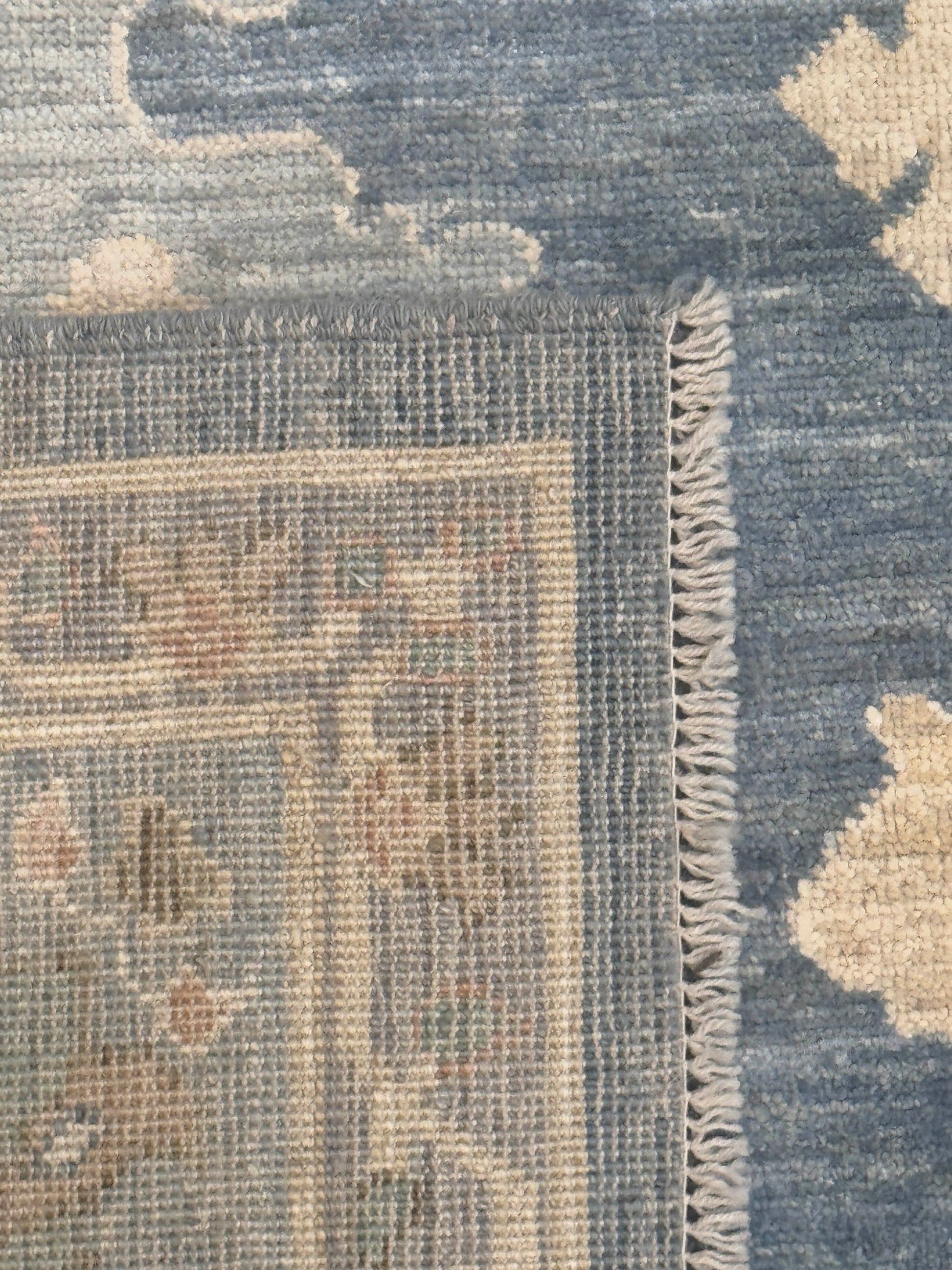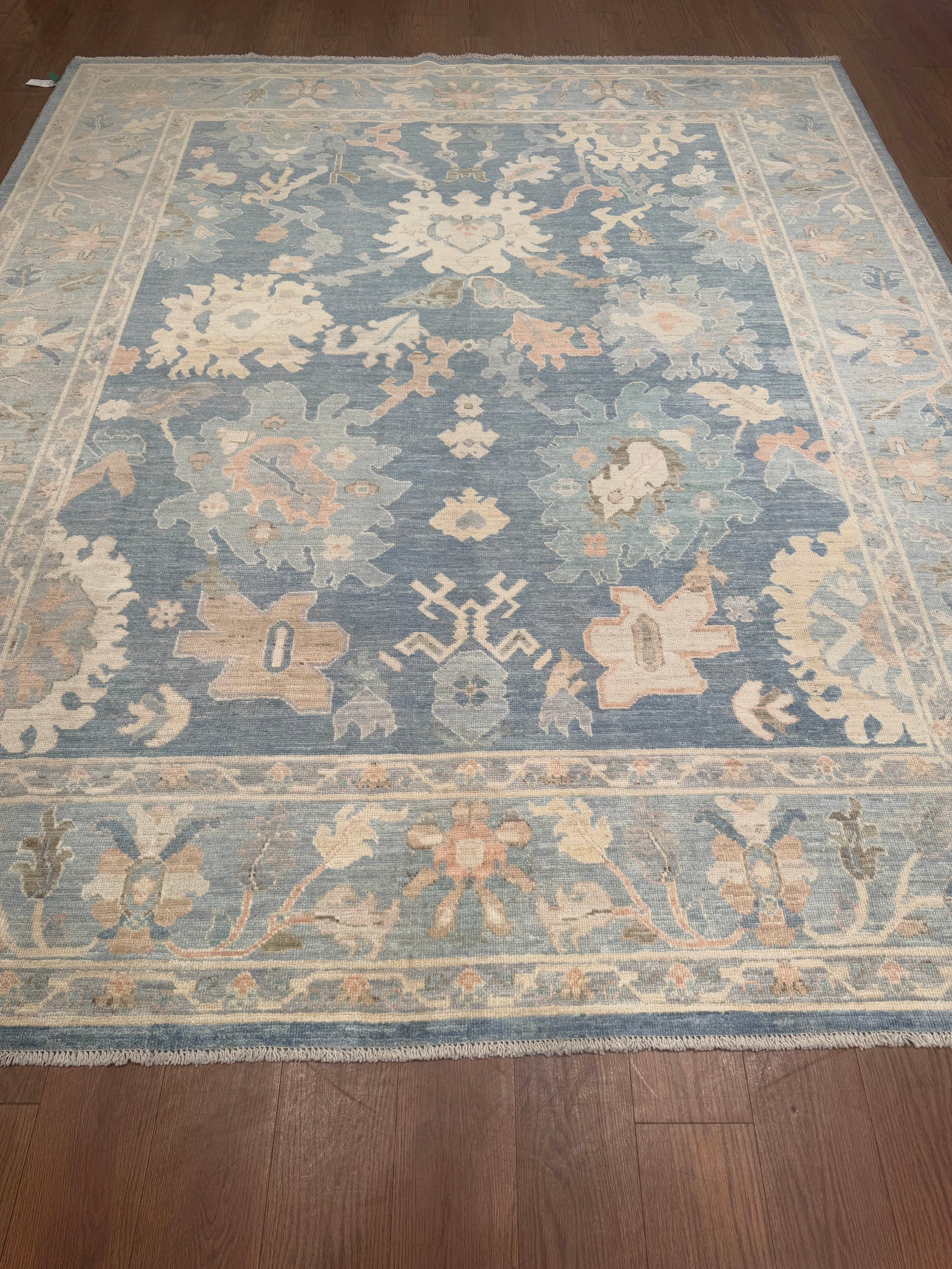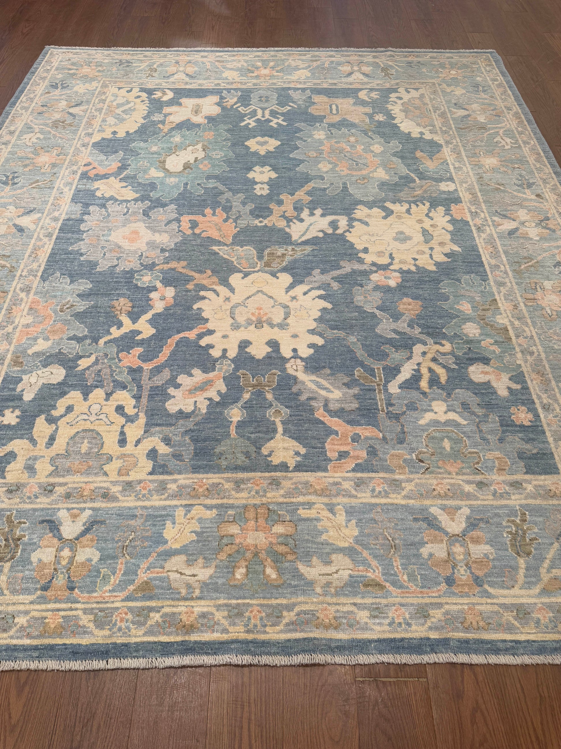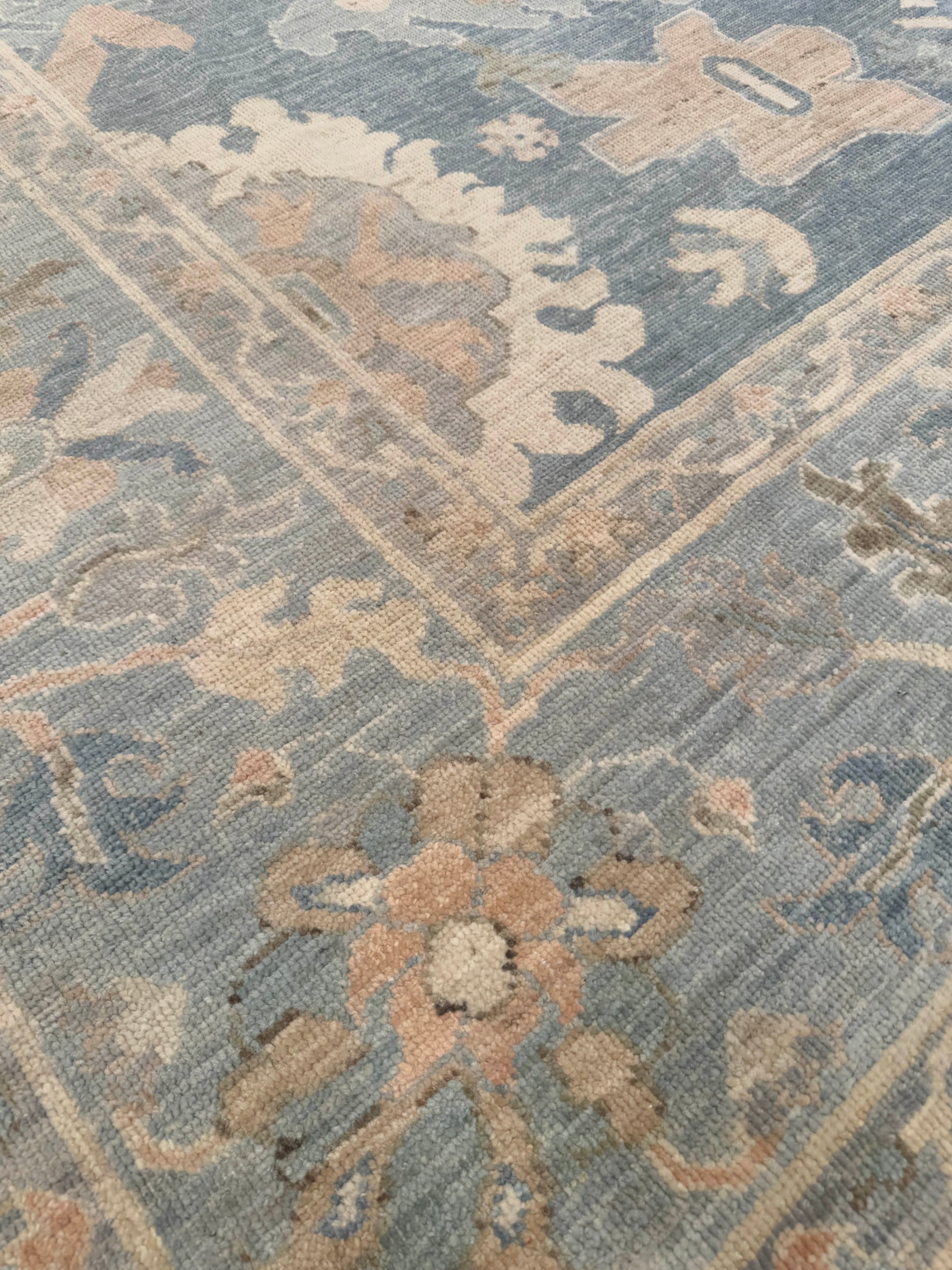 This elegant handwoven rug features a soothing palette of dusty blue, ivory, beige, and soft peach, creating a refined yet welcoming atmosphere. Large-scale floral and vine motifs flow across the field, framed by a delicately patterned border that enhances its balanced design. The muted tones and timeless layout make it versatile for both traditional and transitional interiors, offering sophistication with a touch of warmth.