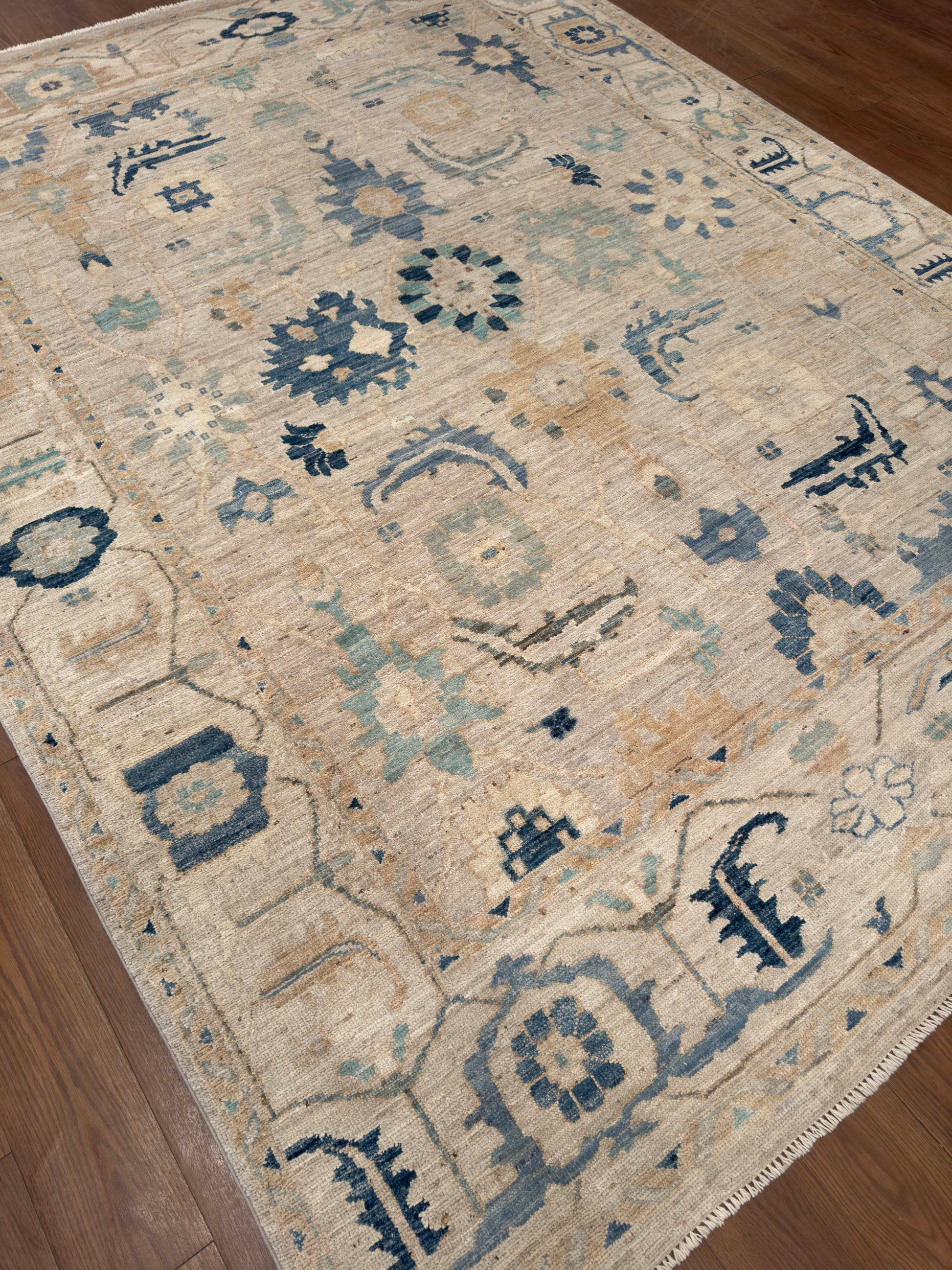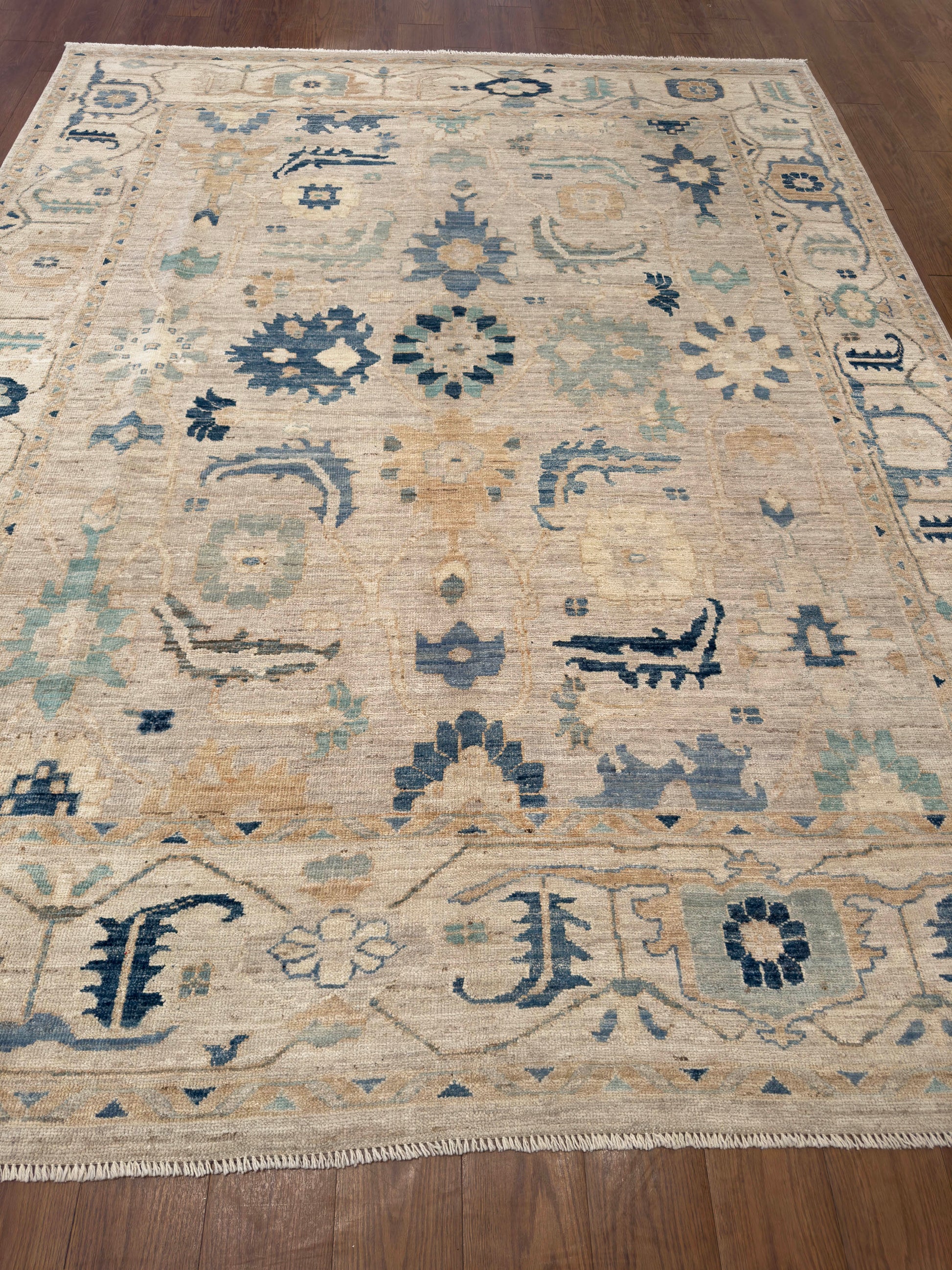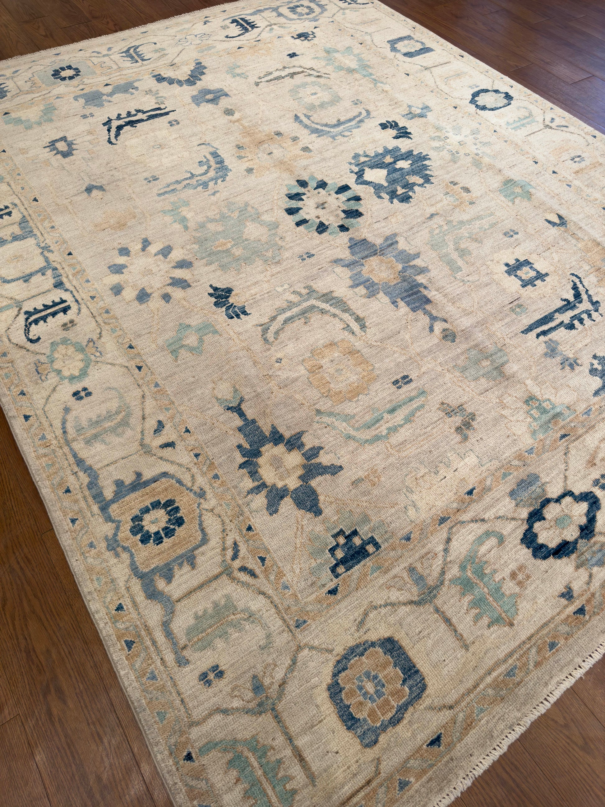 This elegant handwoven rug features a soft neutral base highlighted with accents of teal, slate blue, and sandy beige. Its scattered floral and geometric motifs bring a relaxed balance of structure and artistry, while the wide border frames the design with understated sophistication. The muted tones and gentle patterning make it an easy fit for both modern and traditional interiors, offering warmth and refinement without overwhelming the space.