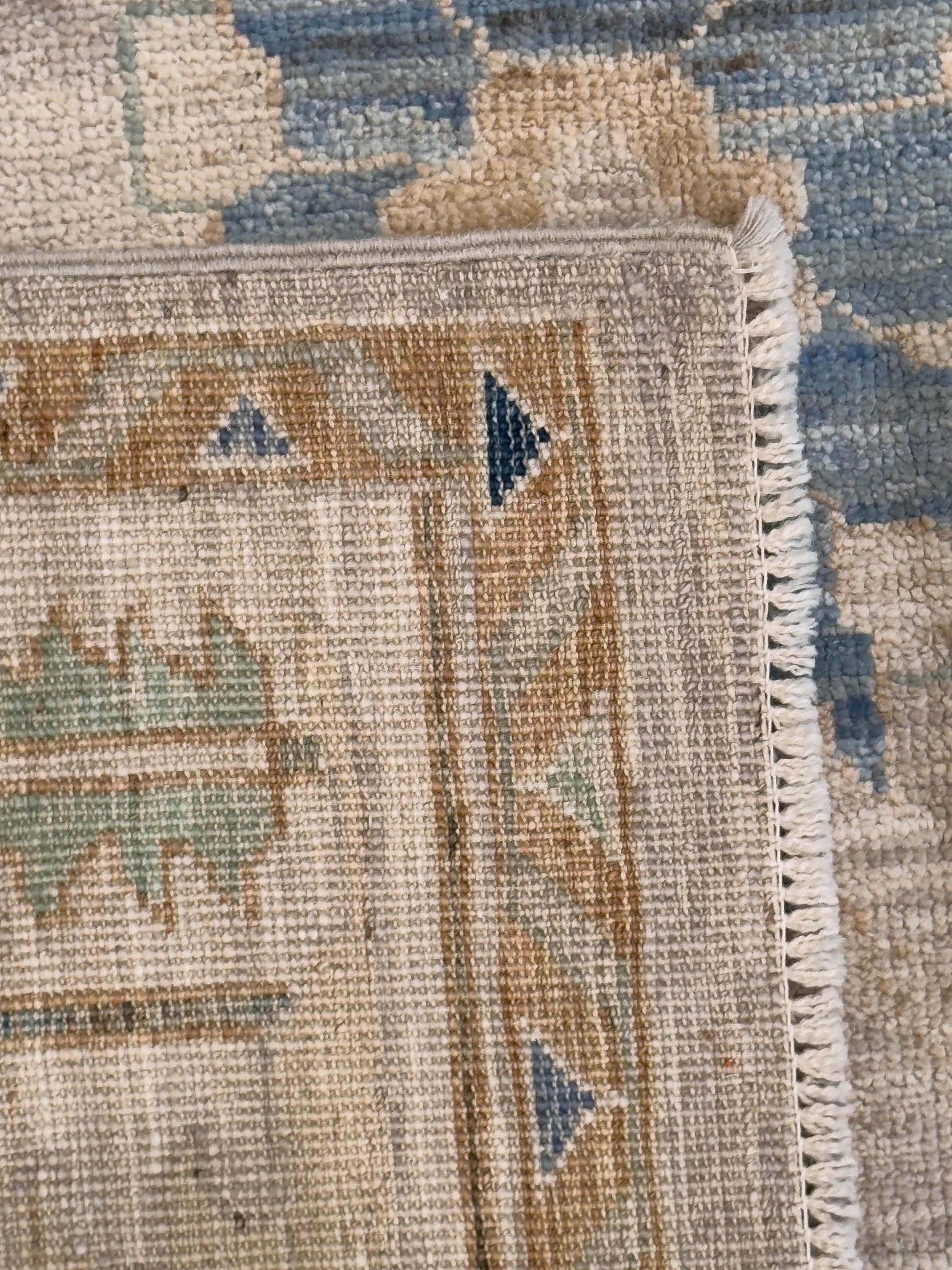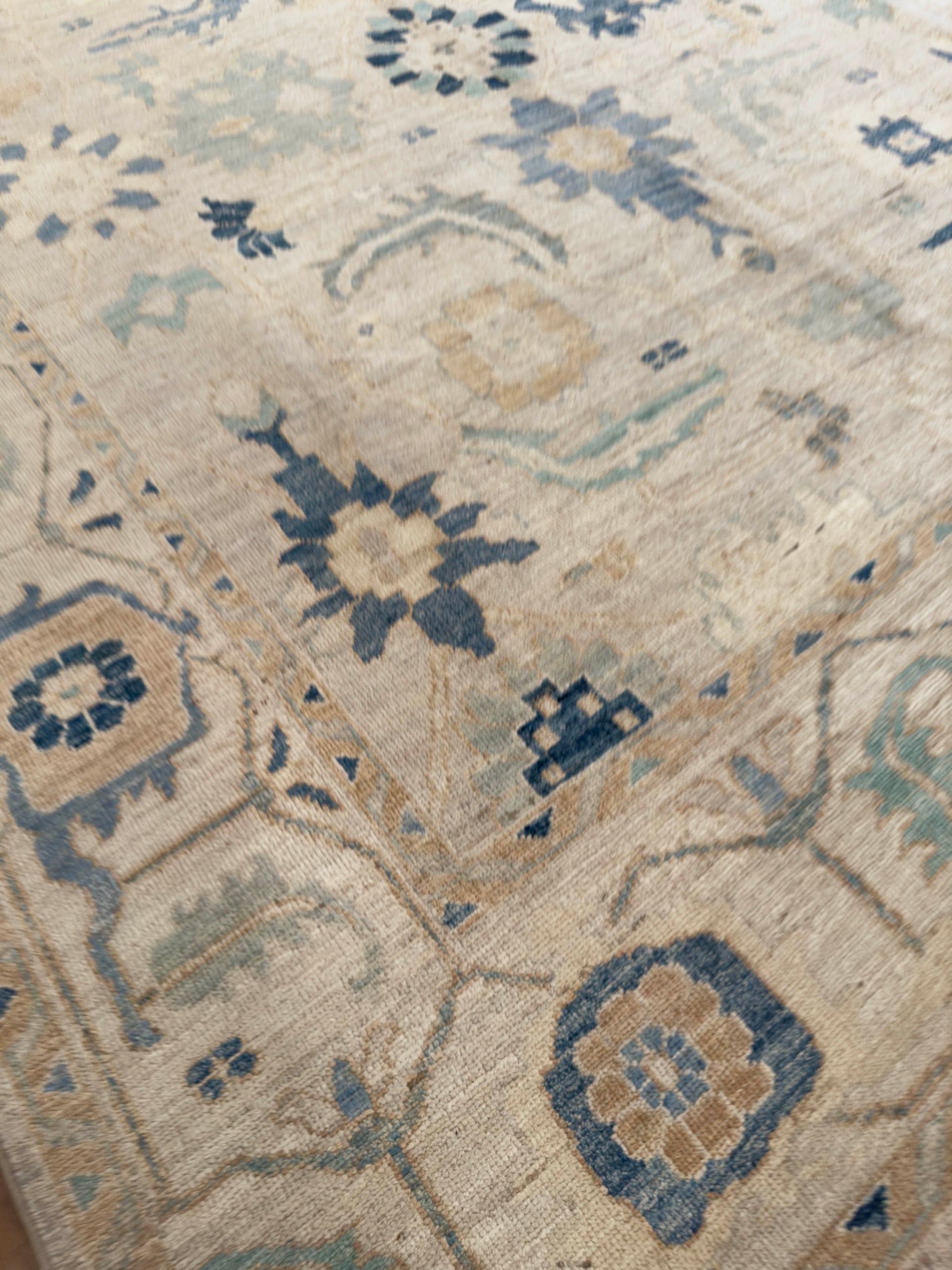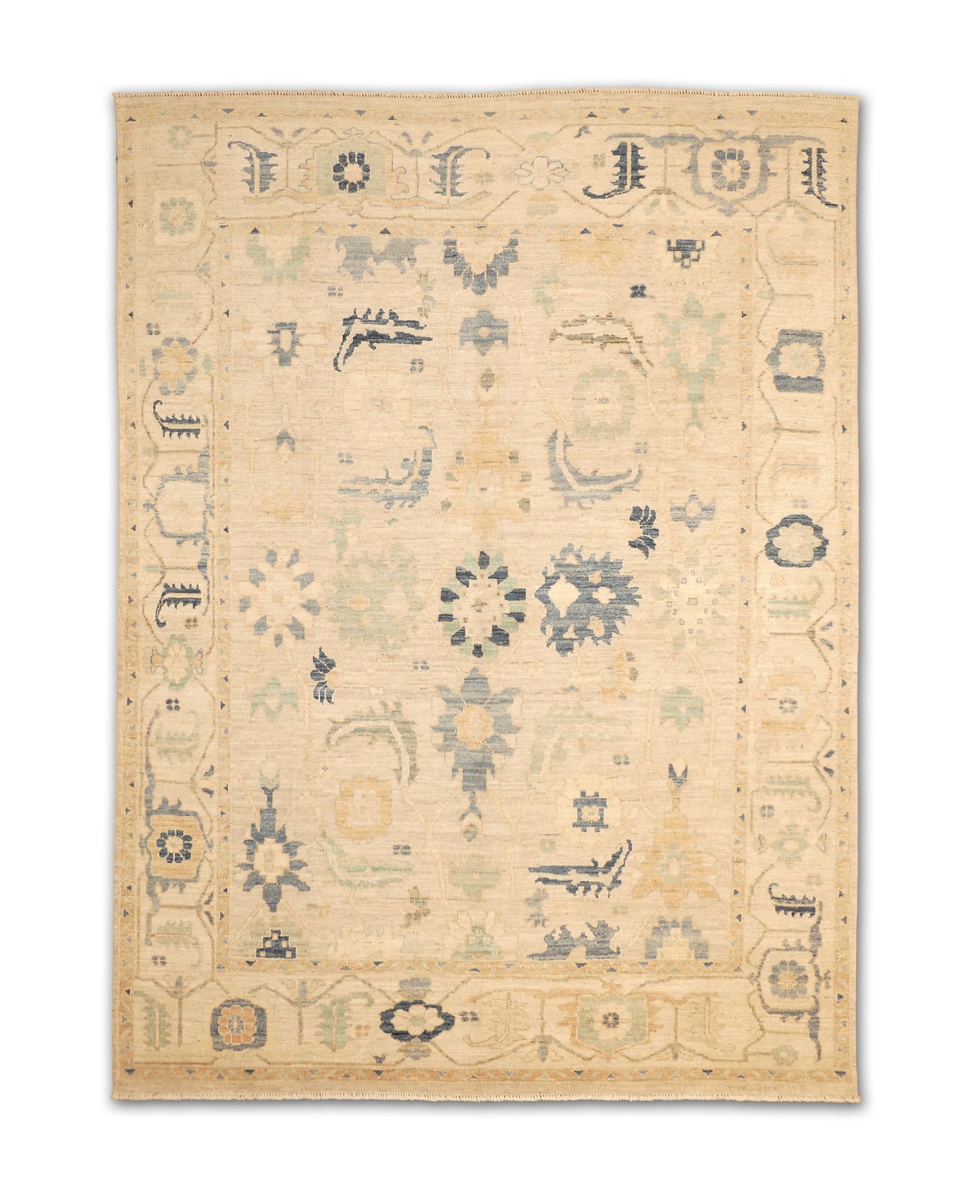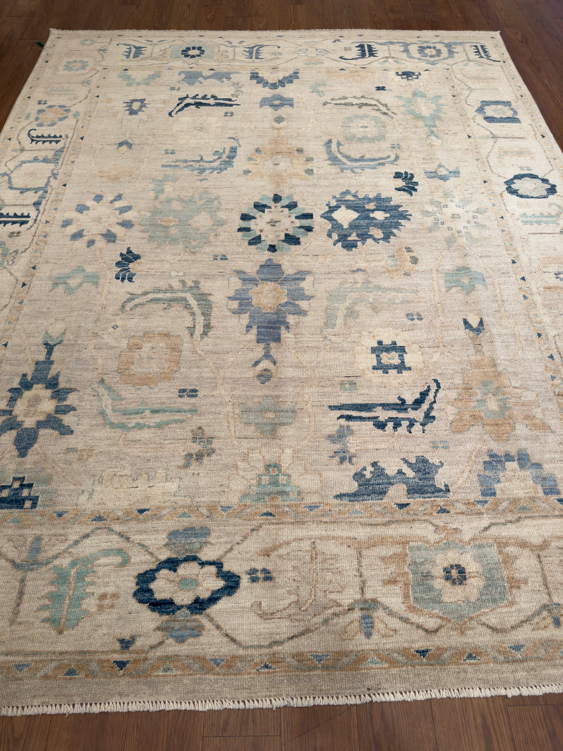 This elegant handwoven rug features a soft neutral base highlighted with accents of teal, slate blue, and sandy beige. Its scattered floral and geometric motifs bring a relaxed balance of structure and artistry, while the wide border frames the design with understated sophistication. The muted tones and gentle patterning make it an easy fit for both modern and traditional interiors, offering warmth and refinement without overwhelming the space.