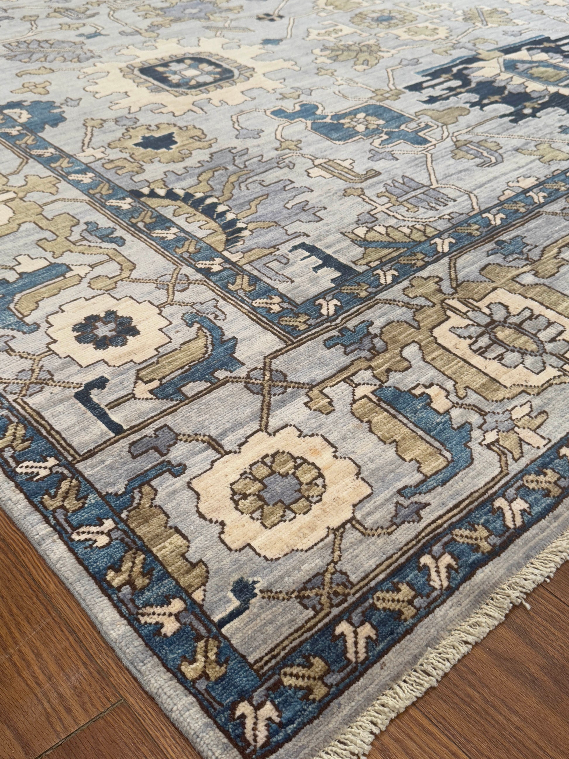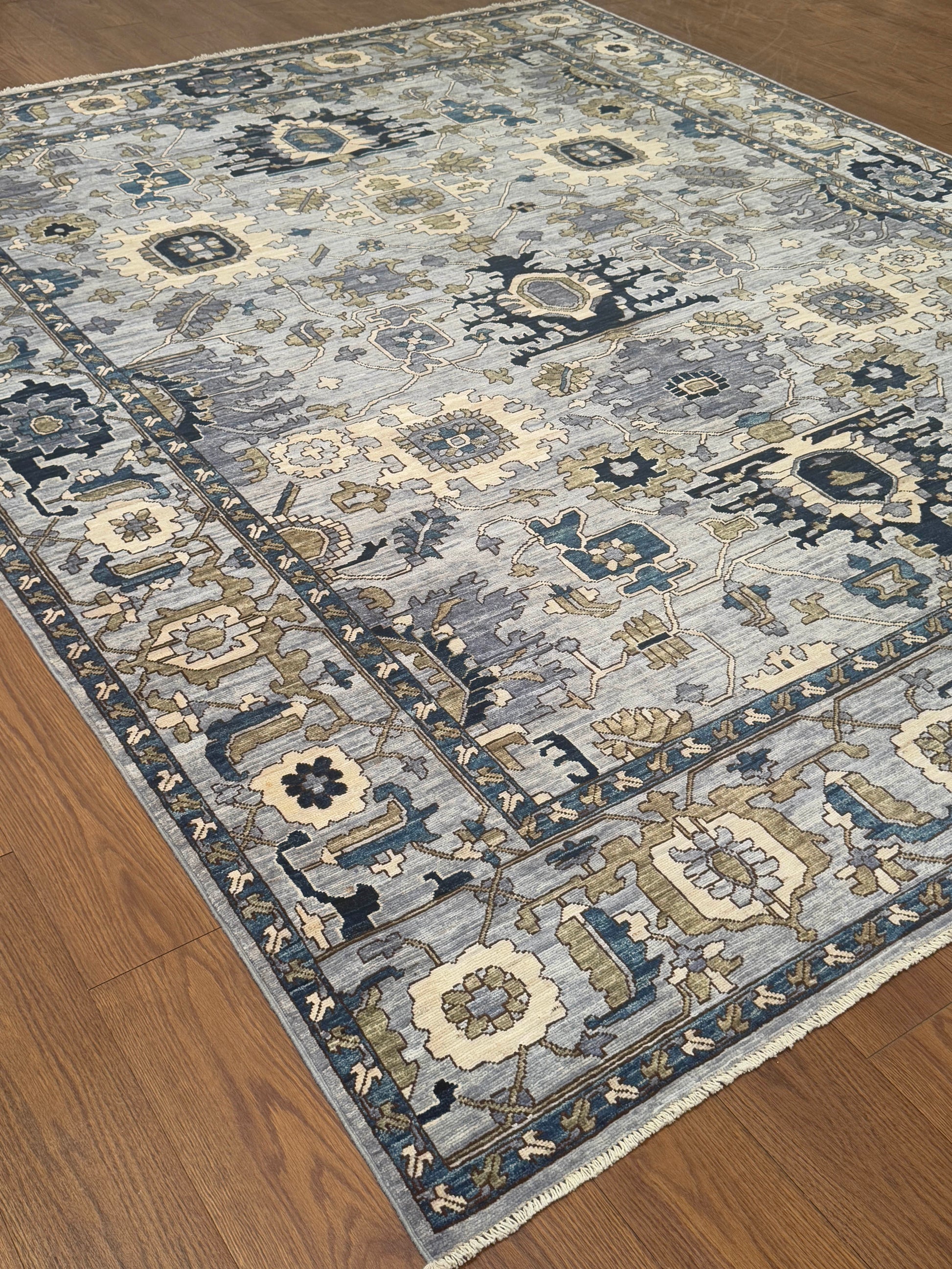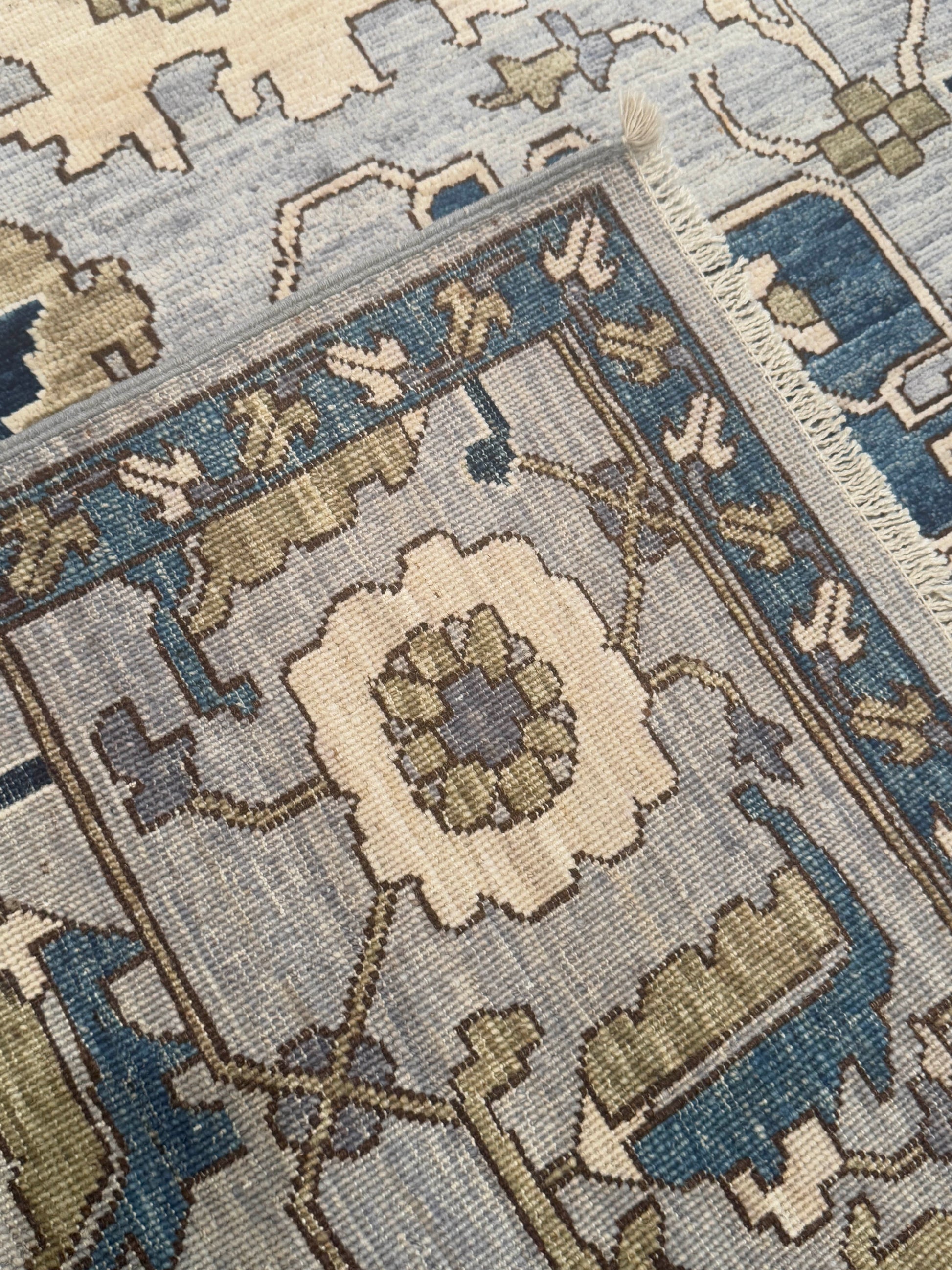 This striking handwoven rug showcases a cool-toned palette of slate blue, navy, olive green, and ivory. Its intricate motifs are arranged in a balanced yet lively layout, framed by a detailed border that enhances the rug’s visual depth. The combination of earthy and muted hues creates a versatile piece that feels both bold and timeless, perfect for anchoring a sophisticated interior.