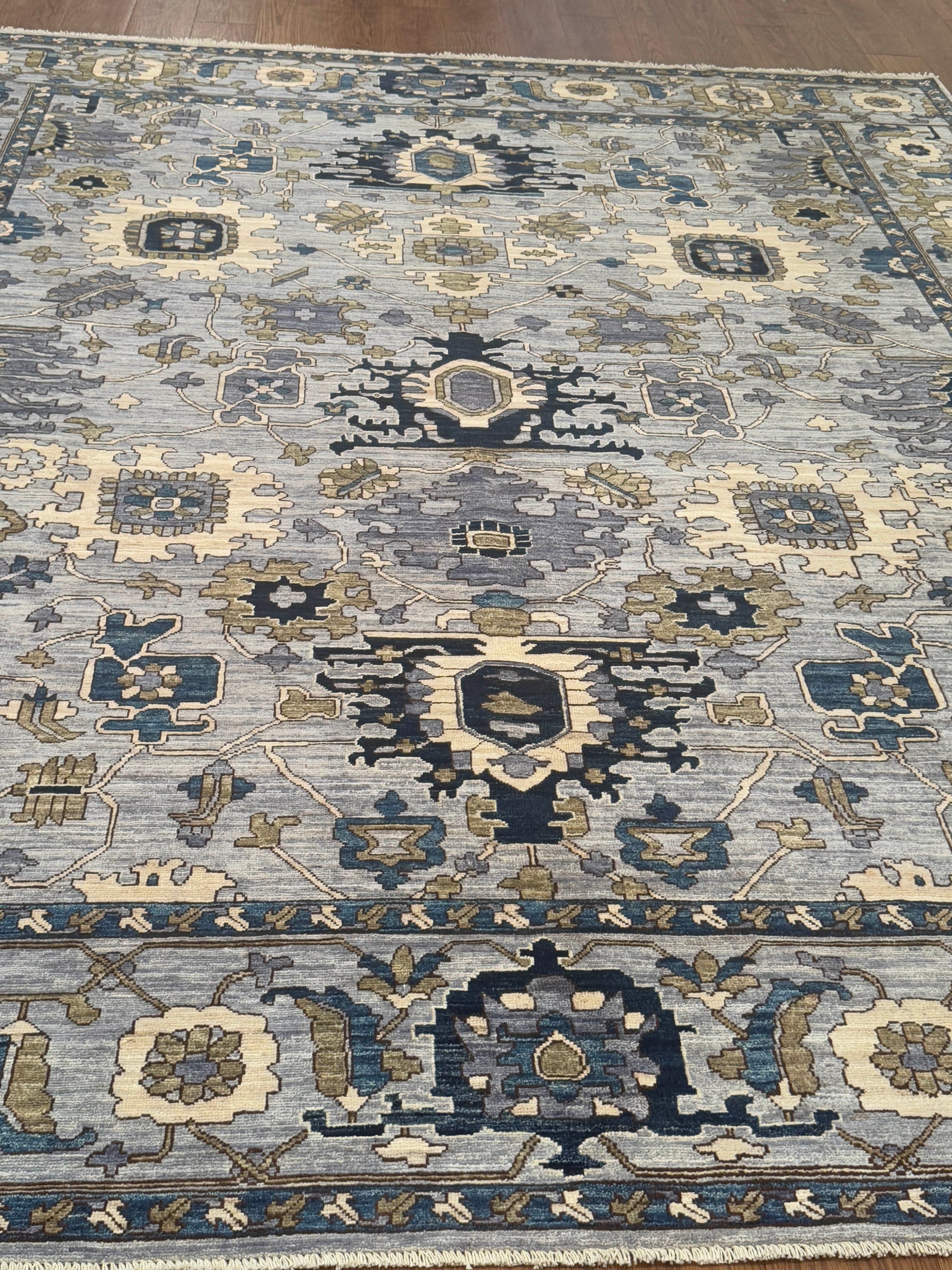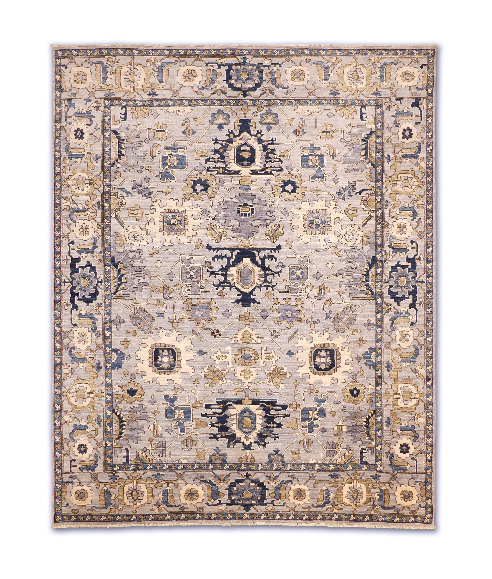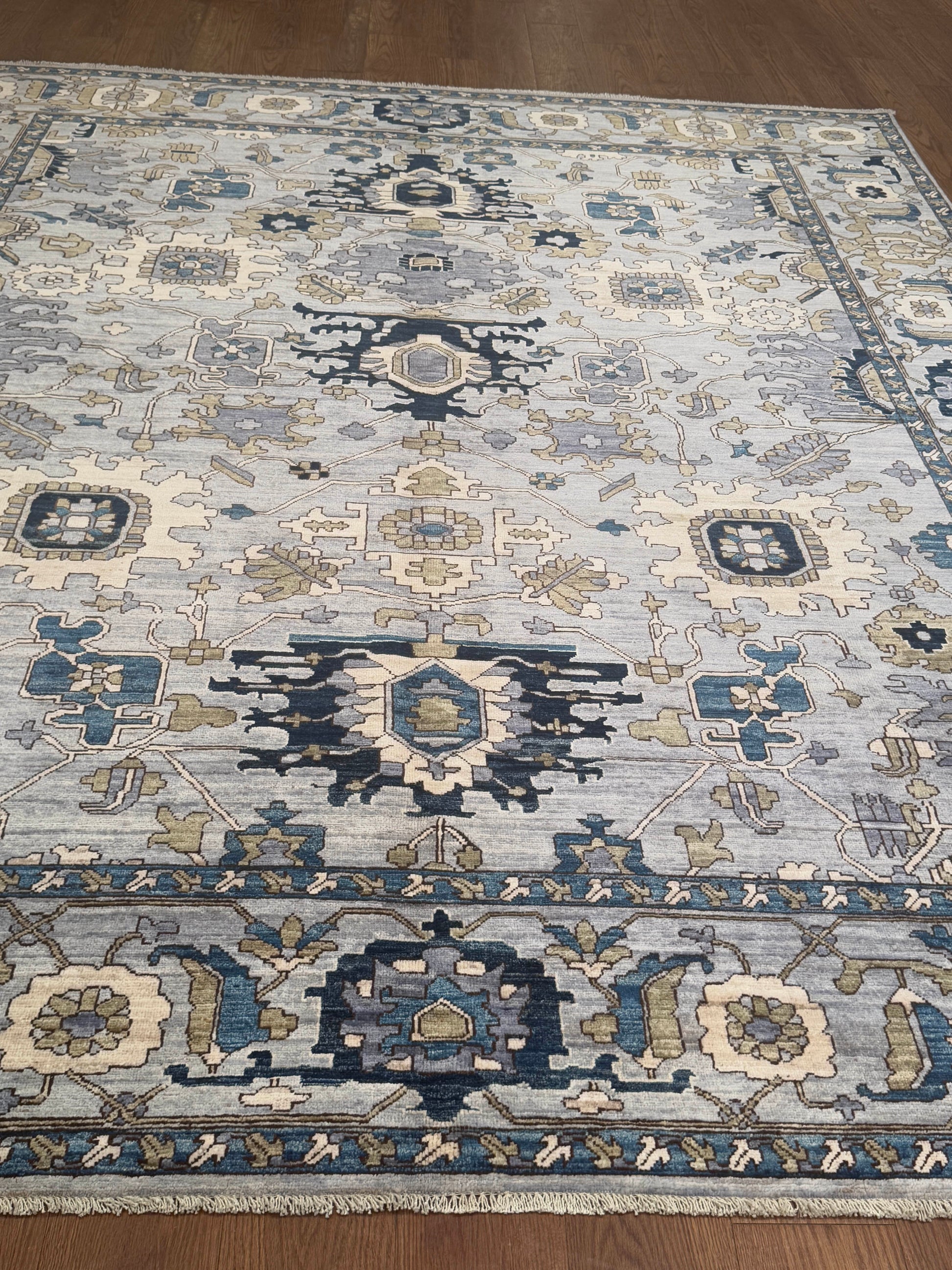 This striking handwoven rug showcases a cool-toned palette of slate blue, navy, olive green, and ivory. Its intricate motifs are arranged in a balanced yet lively layout, framed by a detailed border that enhances the rug’s visual depth. The combination of earthy and muted hues creates a versatile piece that feels both bold and timeless, perfect for anchoring a sophisticated interior.