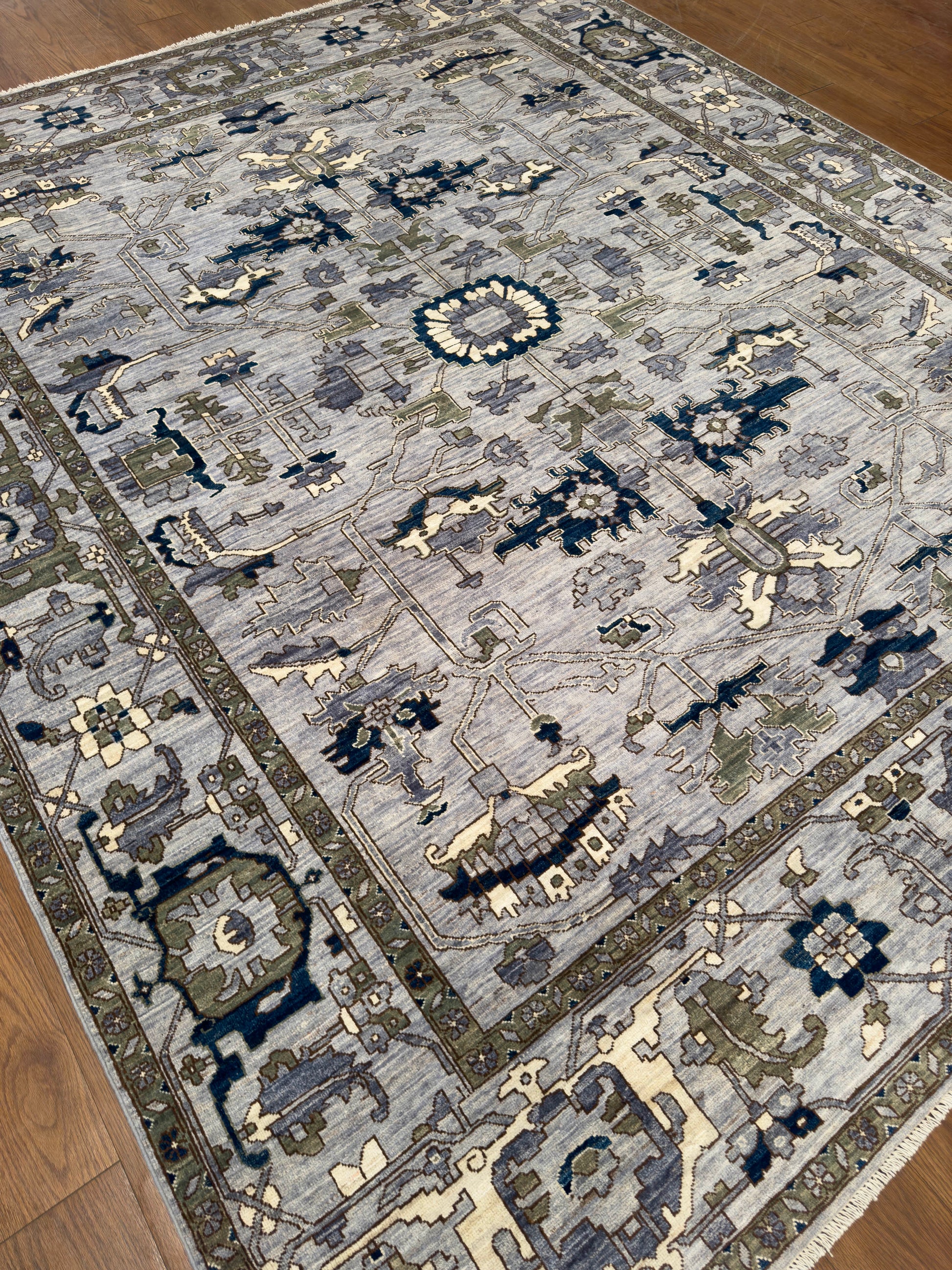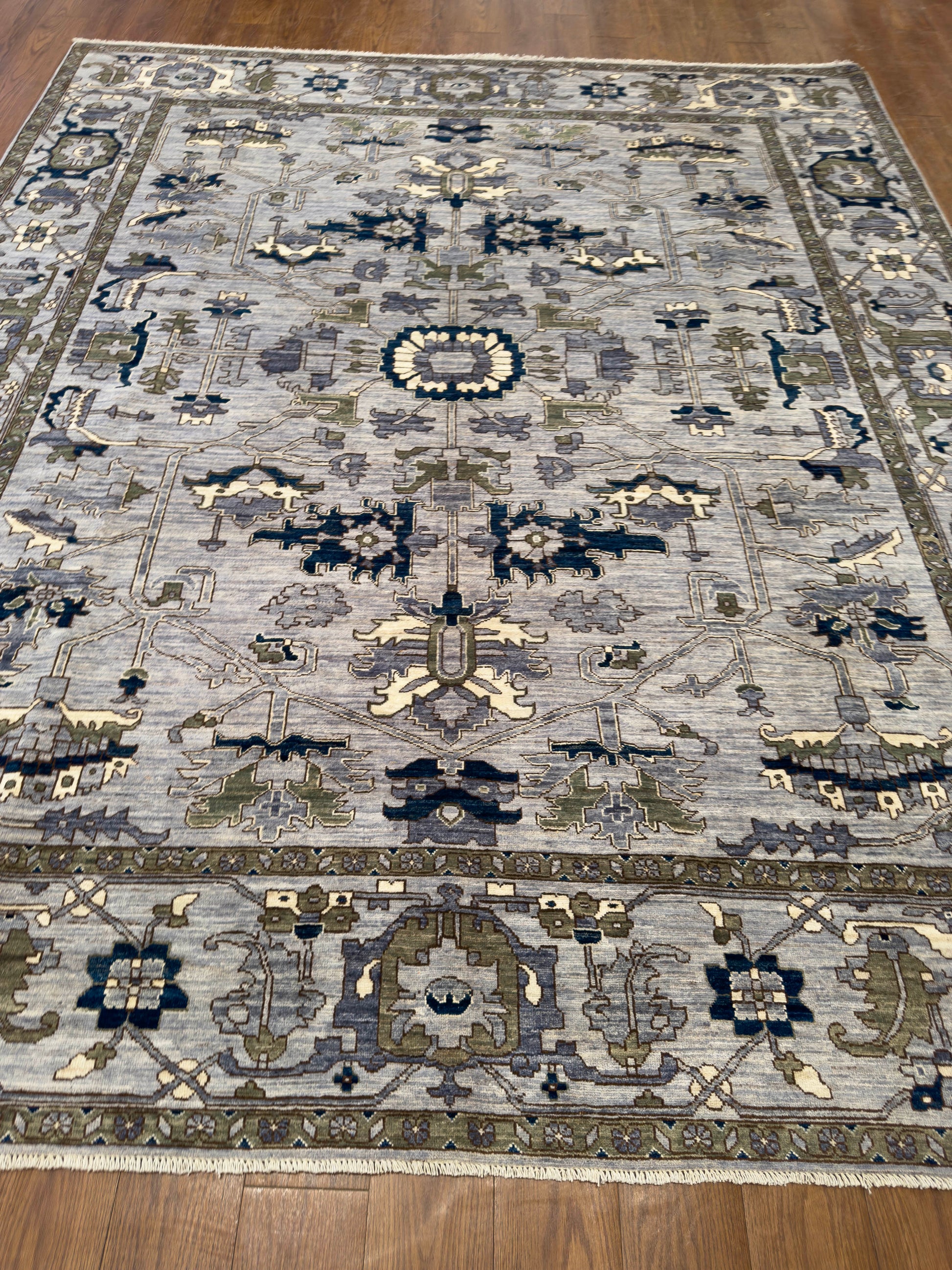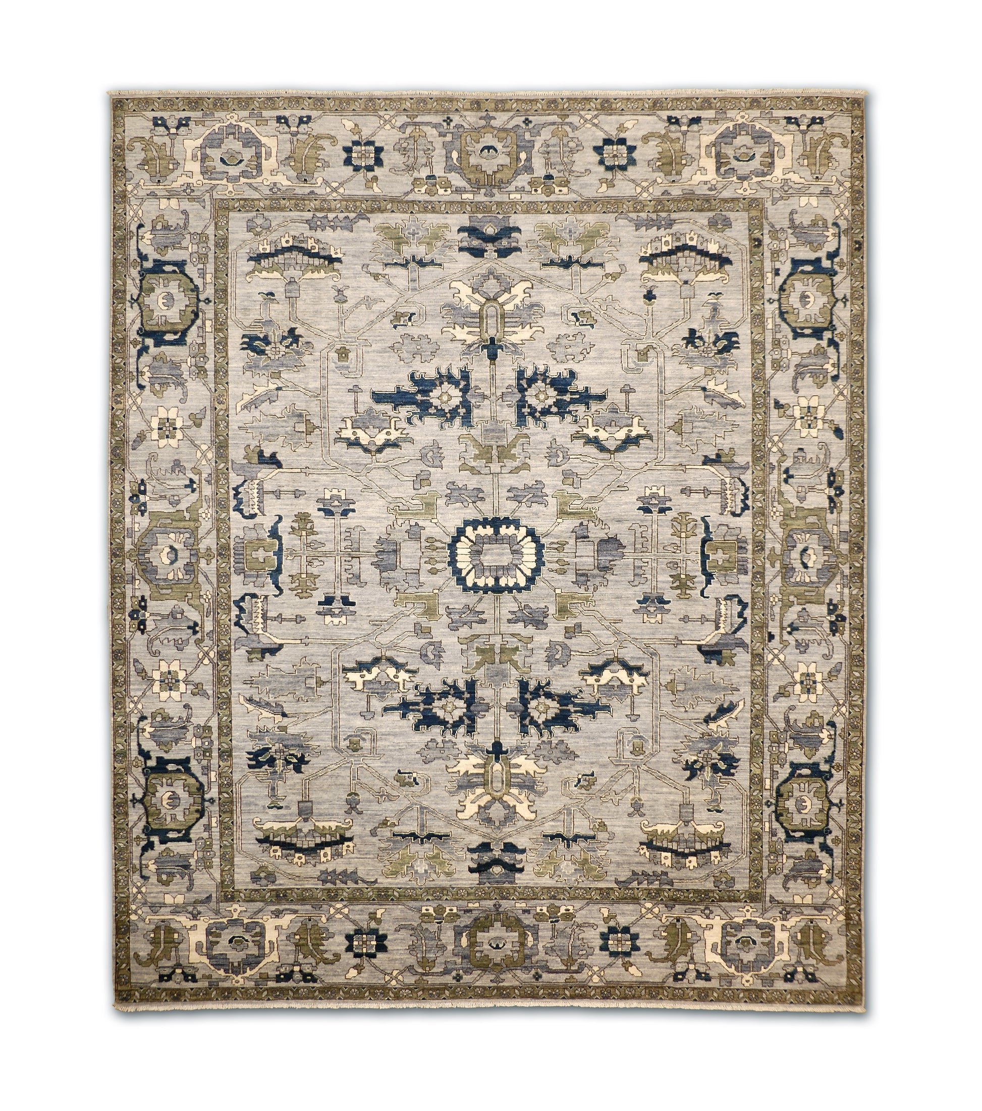 This elegant handwoven rug features a refined palette of slate blue, navy, olive green, ivory, and soft gray. Its design showcases intricate geometric and floral-inspired motifs arranged symmetrically across the field, while the detailed border enhances its structured sophistication. The balance of muted and deep tones gives this piece a timeless versatility, making it suitable for both traditional and transitional interiors.