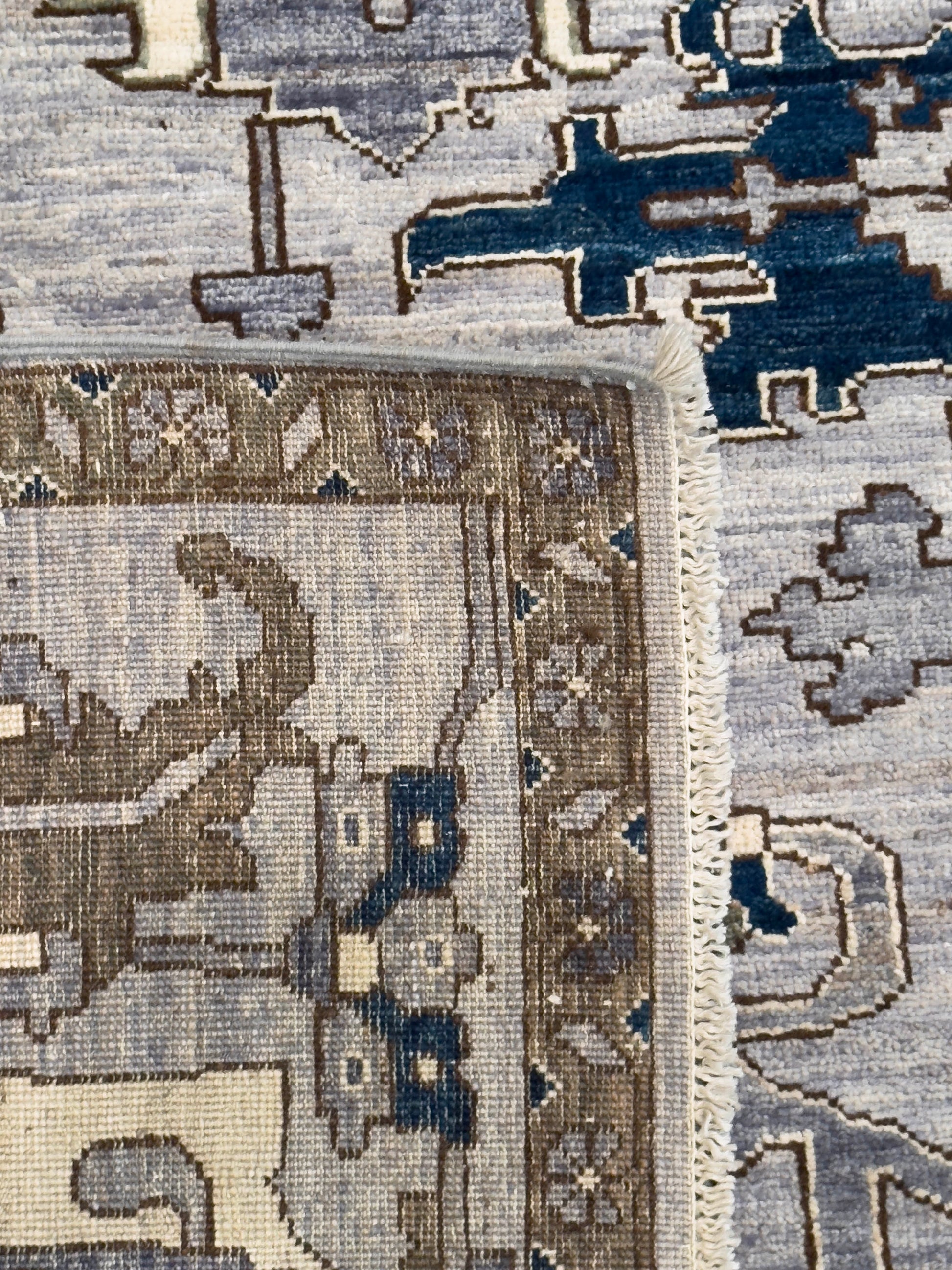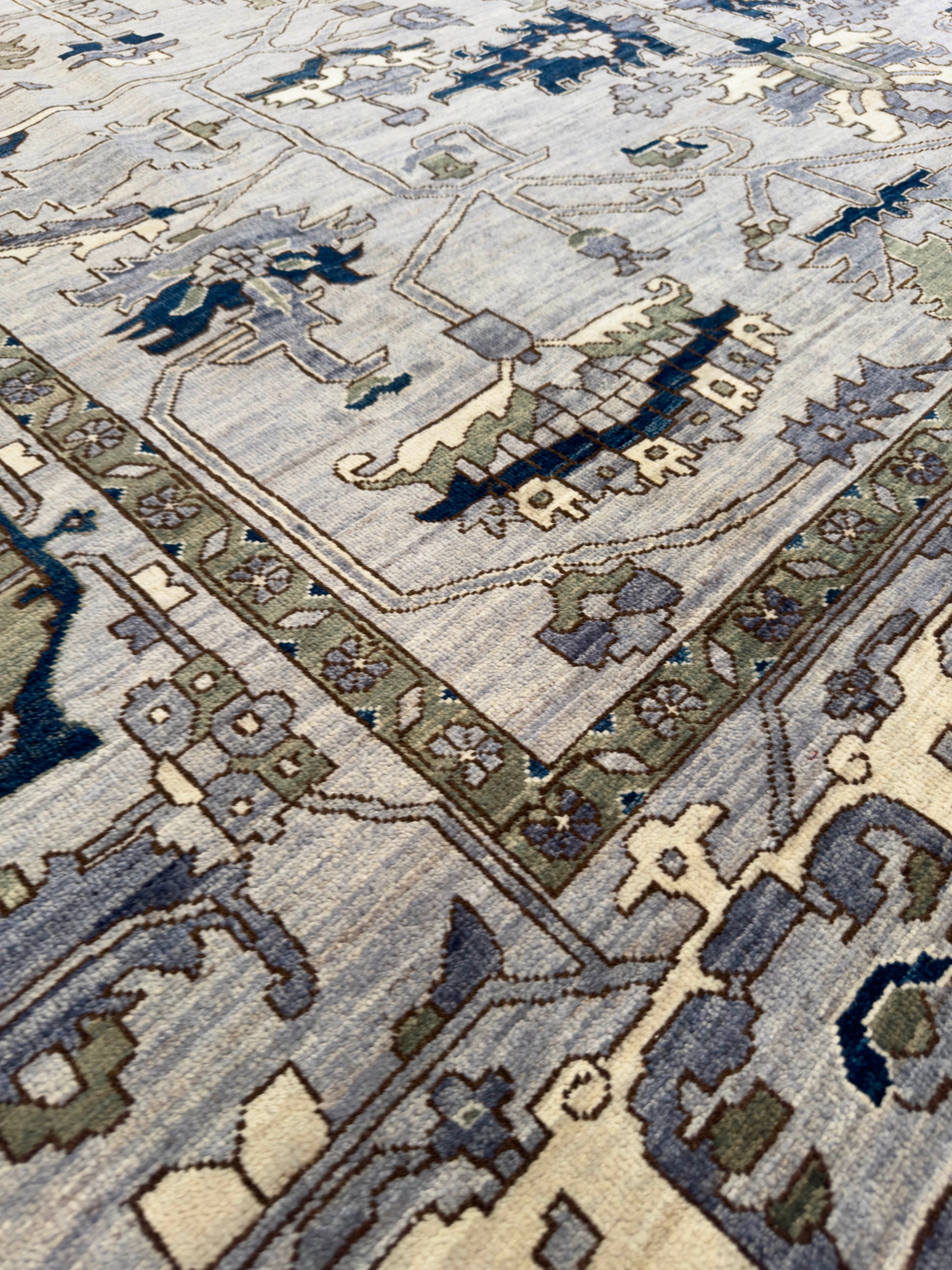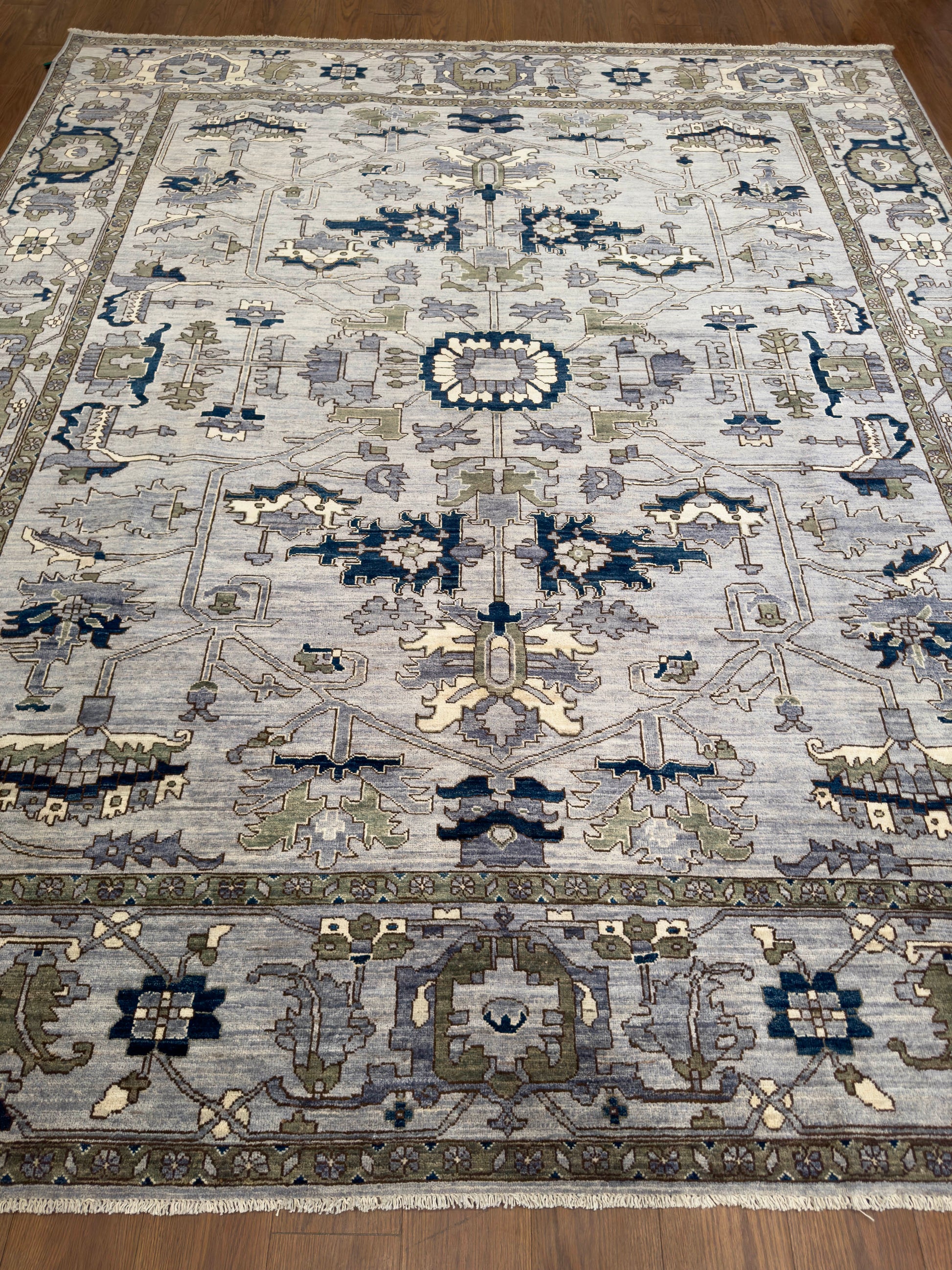 This elegant handwoven rug features a refined palette of slate blue, navy, olive green, ivory, and soft gray. Its design showcases intricate geometric and floral-inspired motifs arranged symmetrically across the field, while the detailed border enhances its structured sophistication. The balance of muted and deep tones gives this piece a timeless versatility, making it suitable for both traditional and transitional interiors.