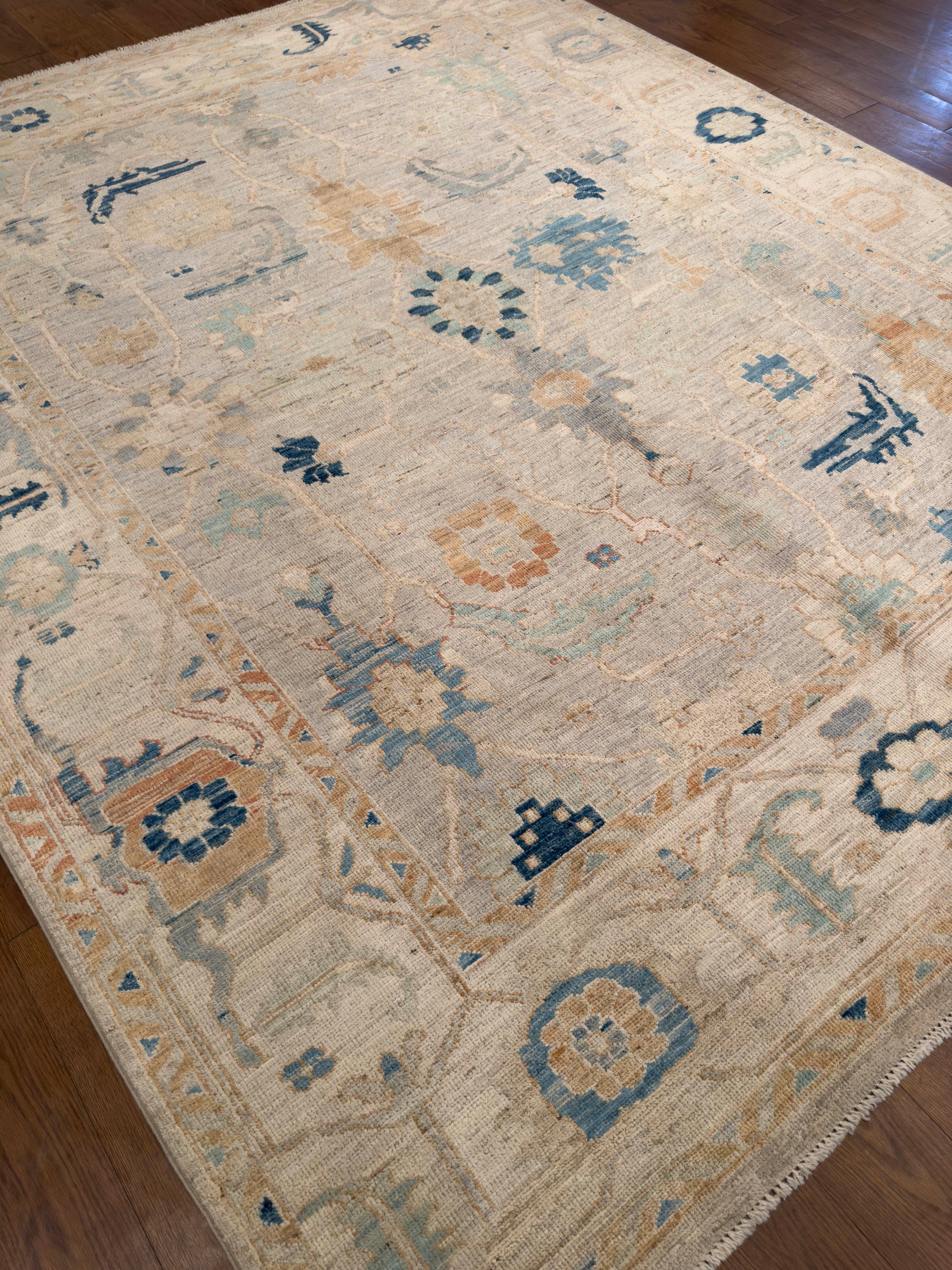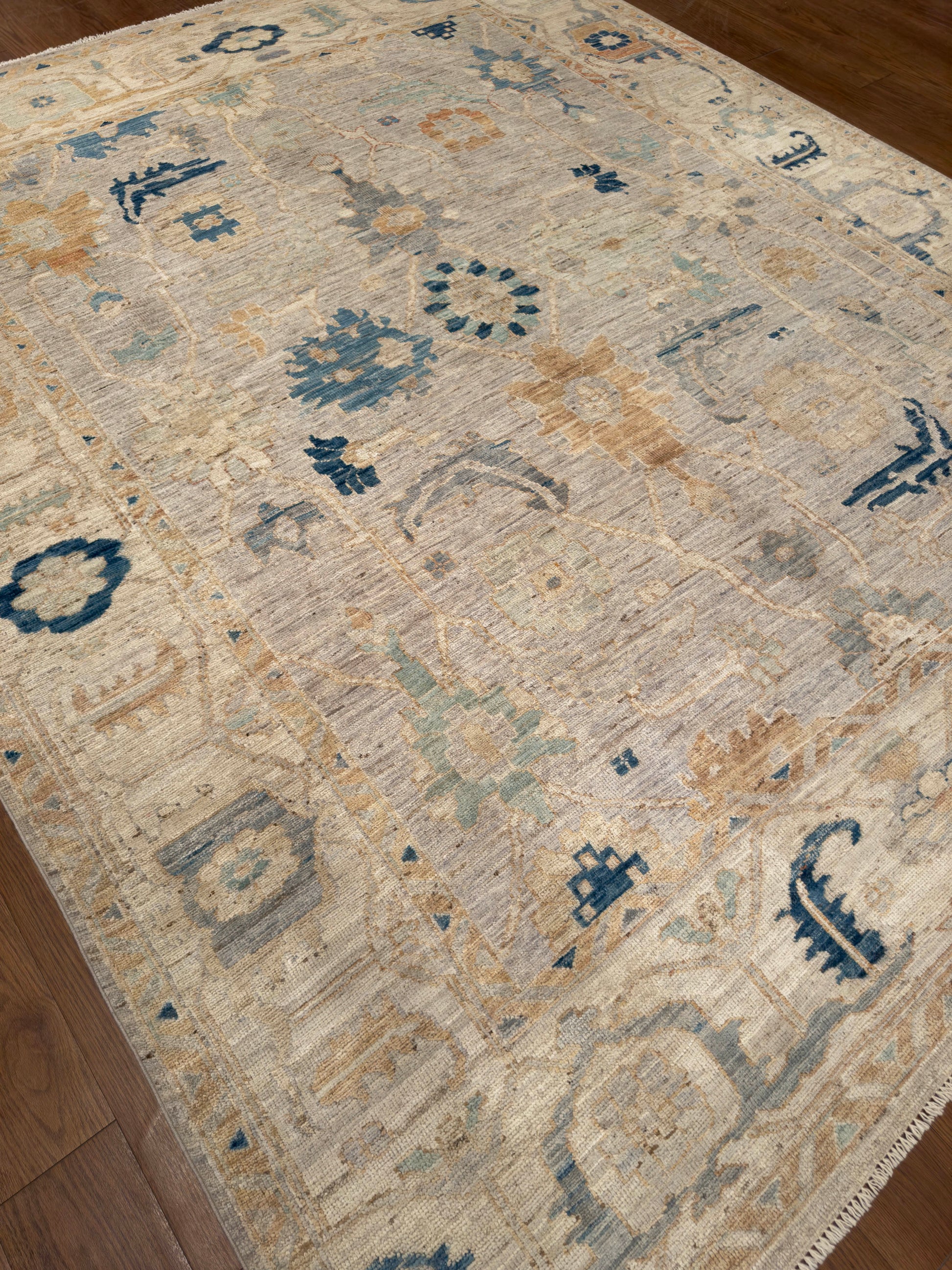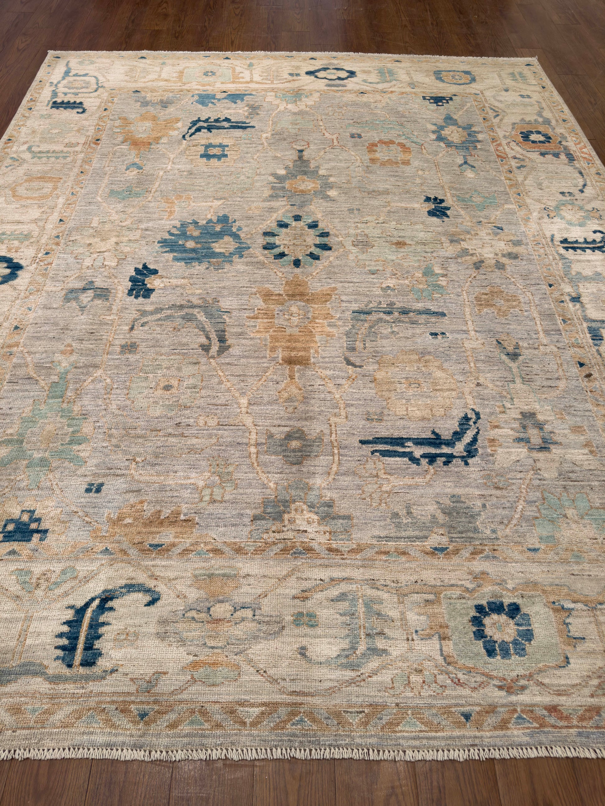 This handwoven rug brings together a soft, earthy palette of taupe, beige, muted teal, and deep blue accents. Its field is filled with large-scale floral and vine motifs, giving the rug an open, airy structure that feels both traditional and welcoming. The border frames the design with complementary detailing, offering balance and cohesion. With its harmonious tones and understated elegance, this piece is versatile enough for both classic and contemporary interiors.