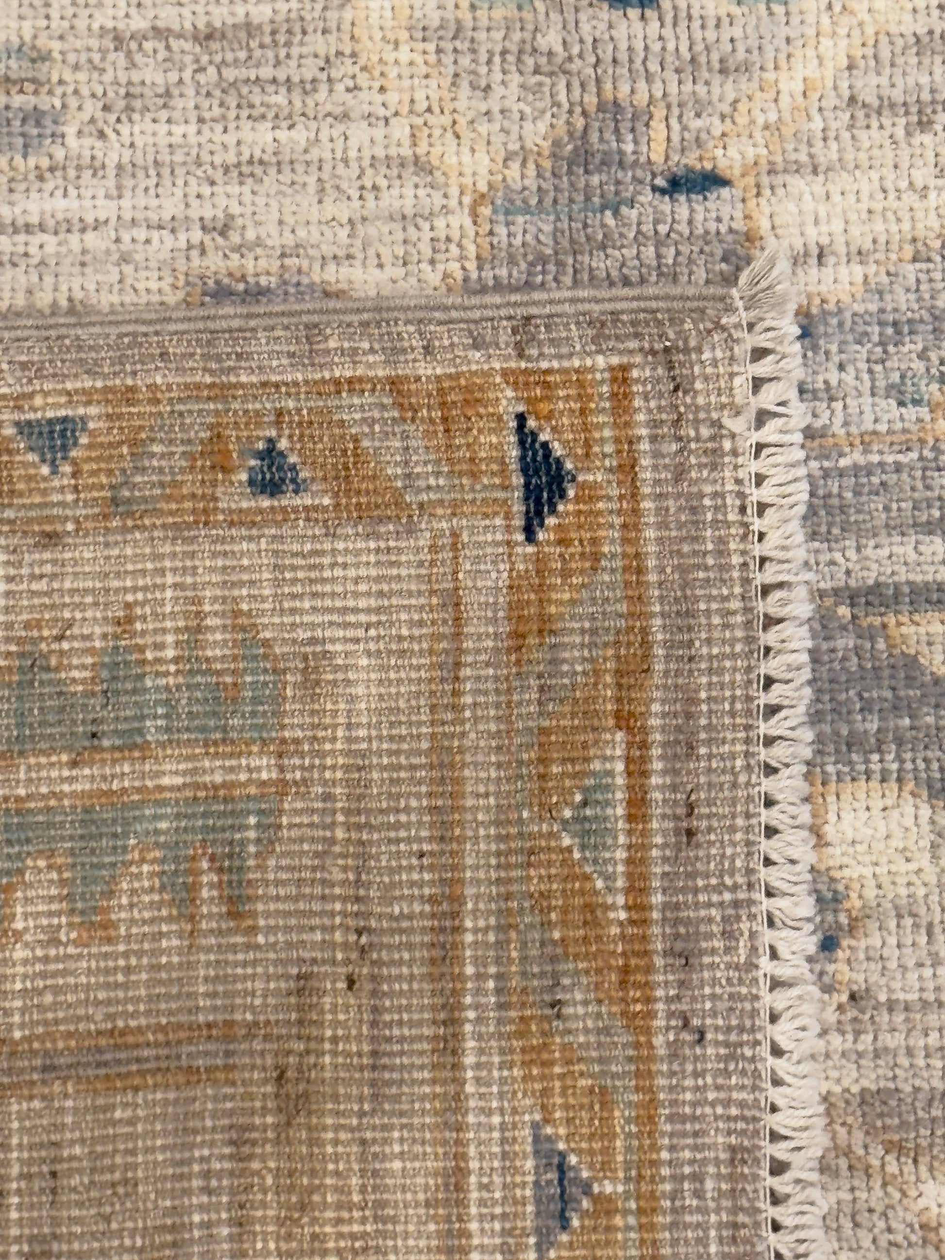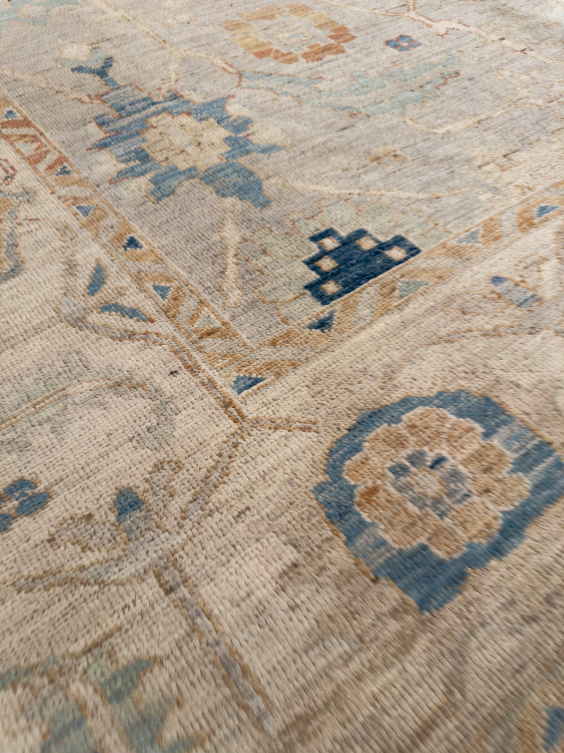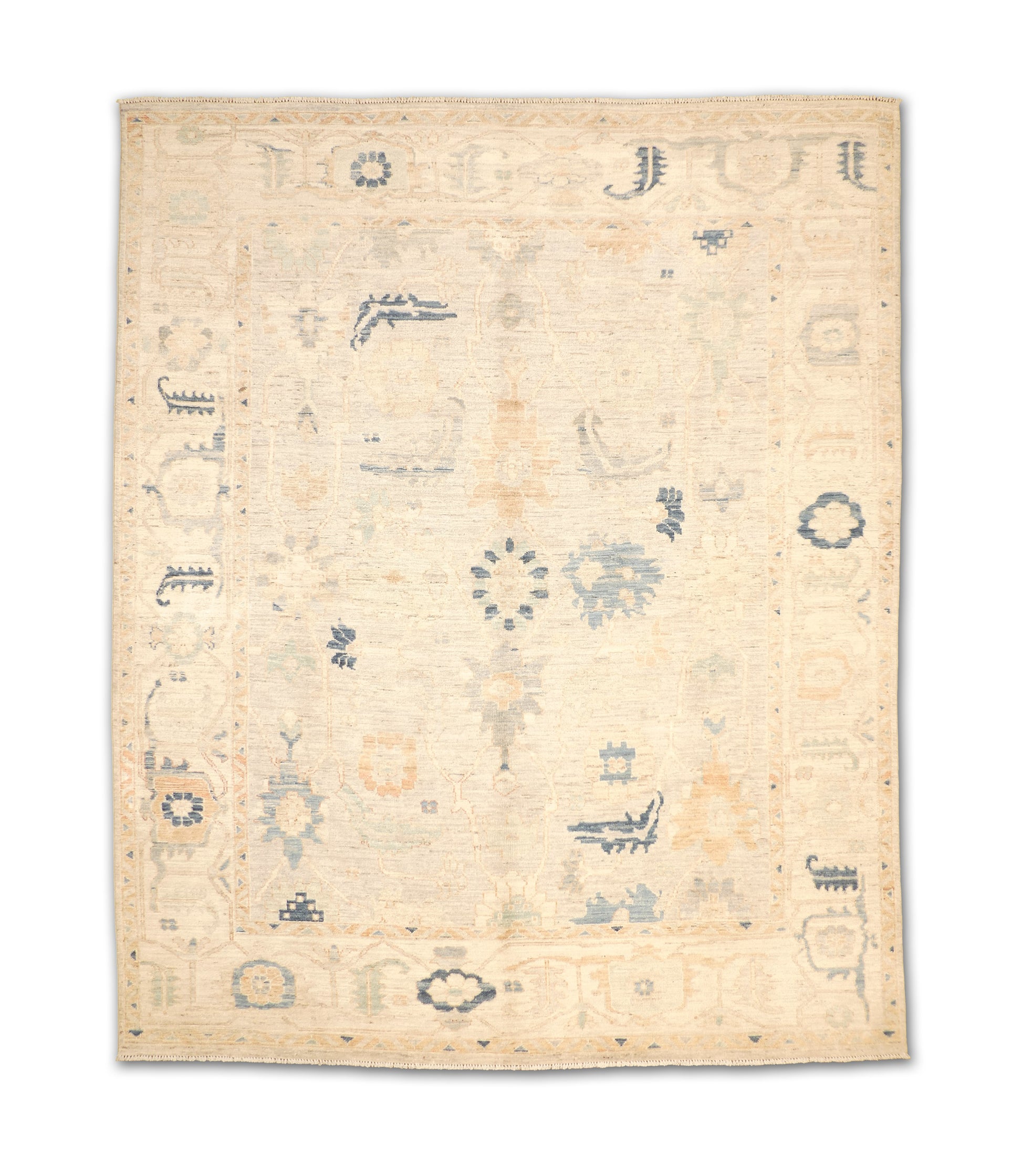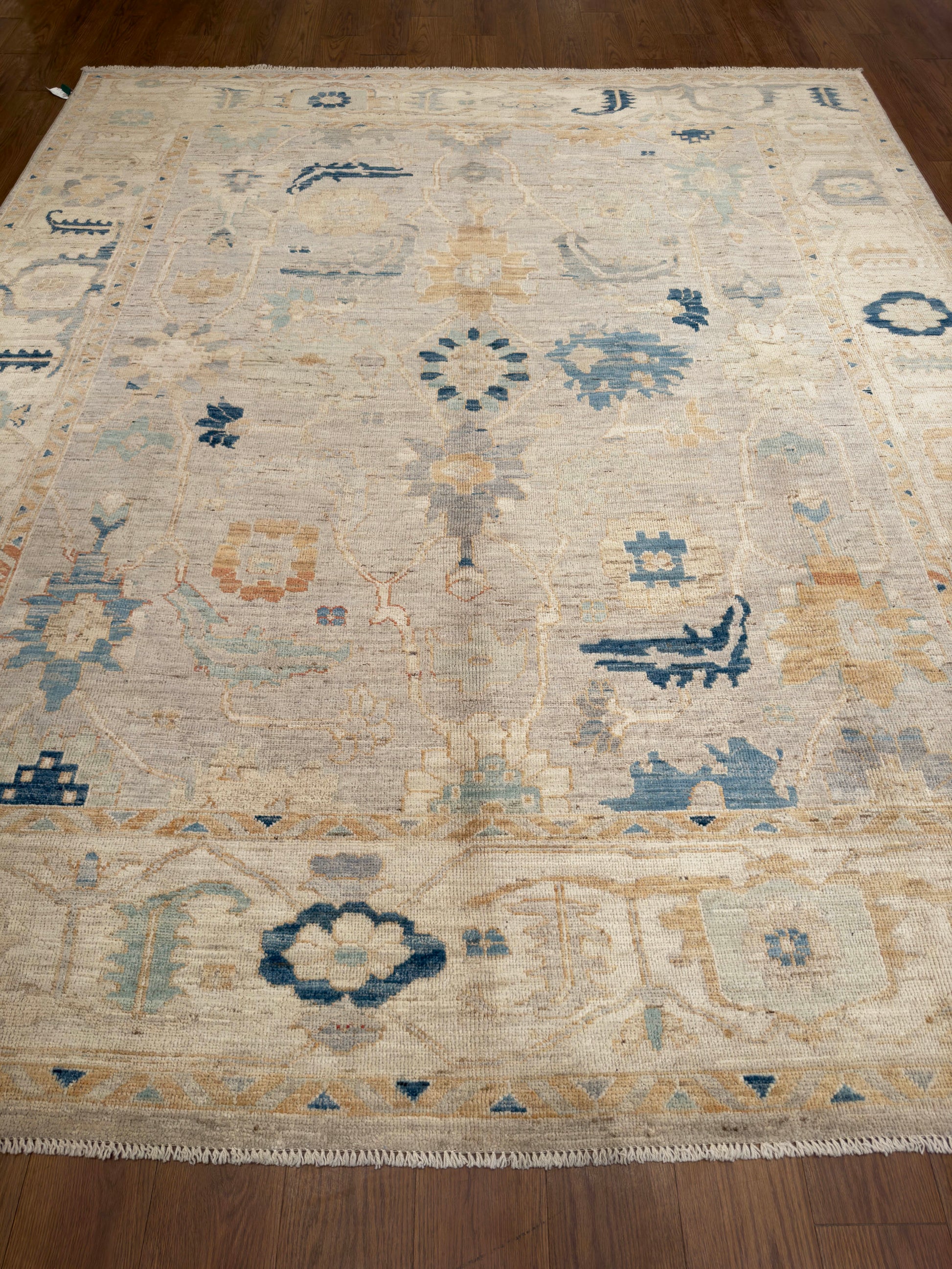 This handwoven rug brings together a soft, earthy palette of taupe, beige, muted teal, and deep blue accents. Its field is filled with large-scale floral and vine motifs, giving the rug an open, airy structure that feels both traditional and welcoming. The border frames the design with complementary detailing, offering balance and cohesion. With its harmonious tones and understated elegance, this piece is versatile enough for both classic and contemporary interiors.