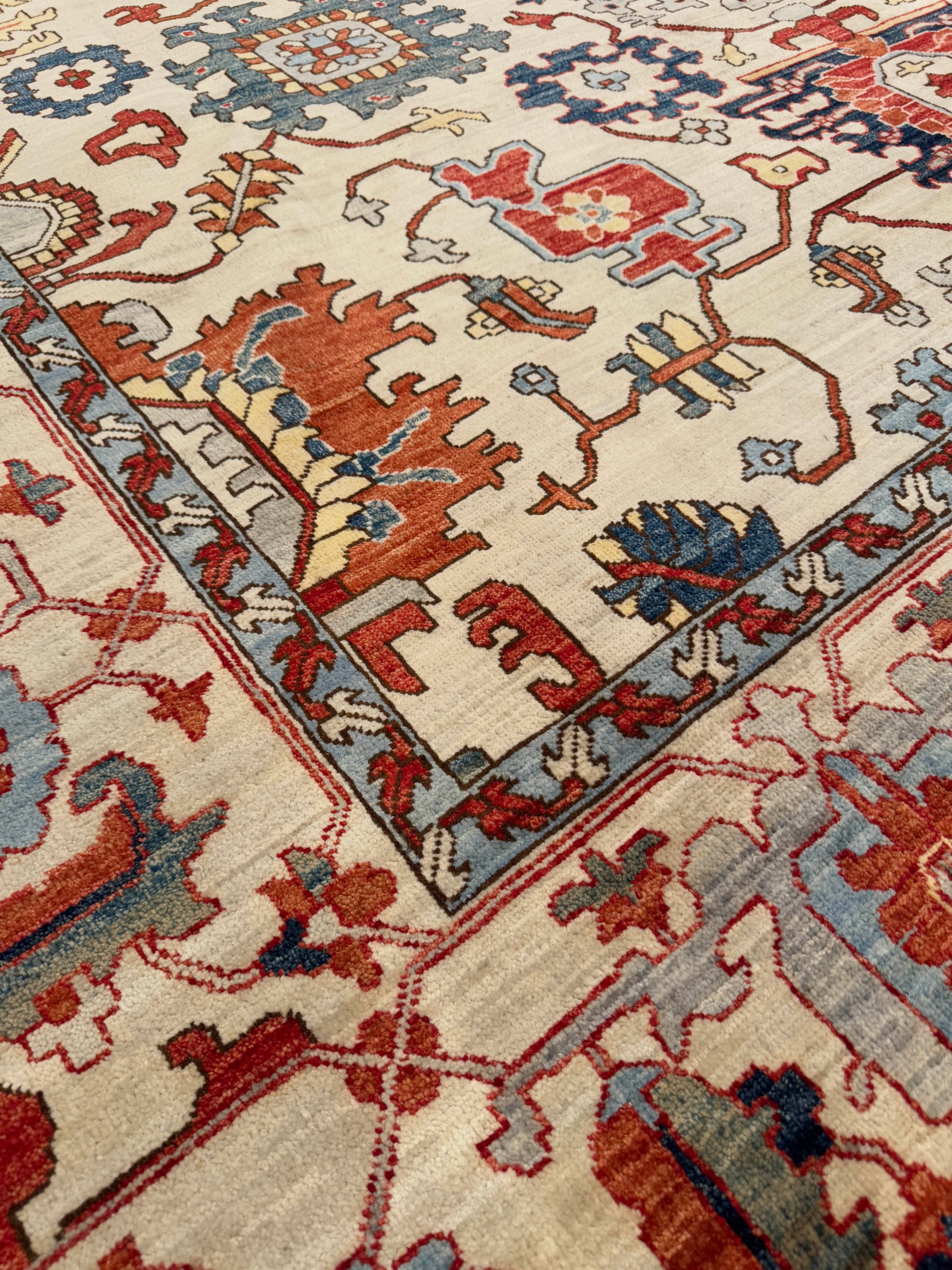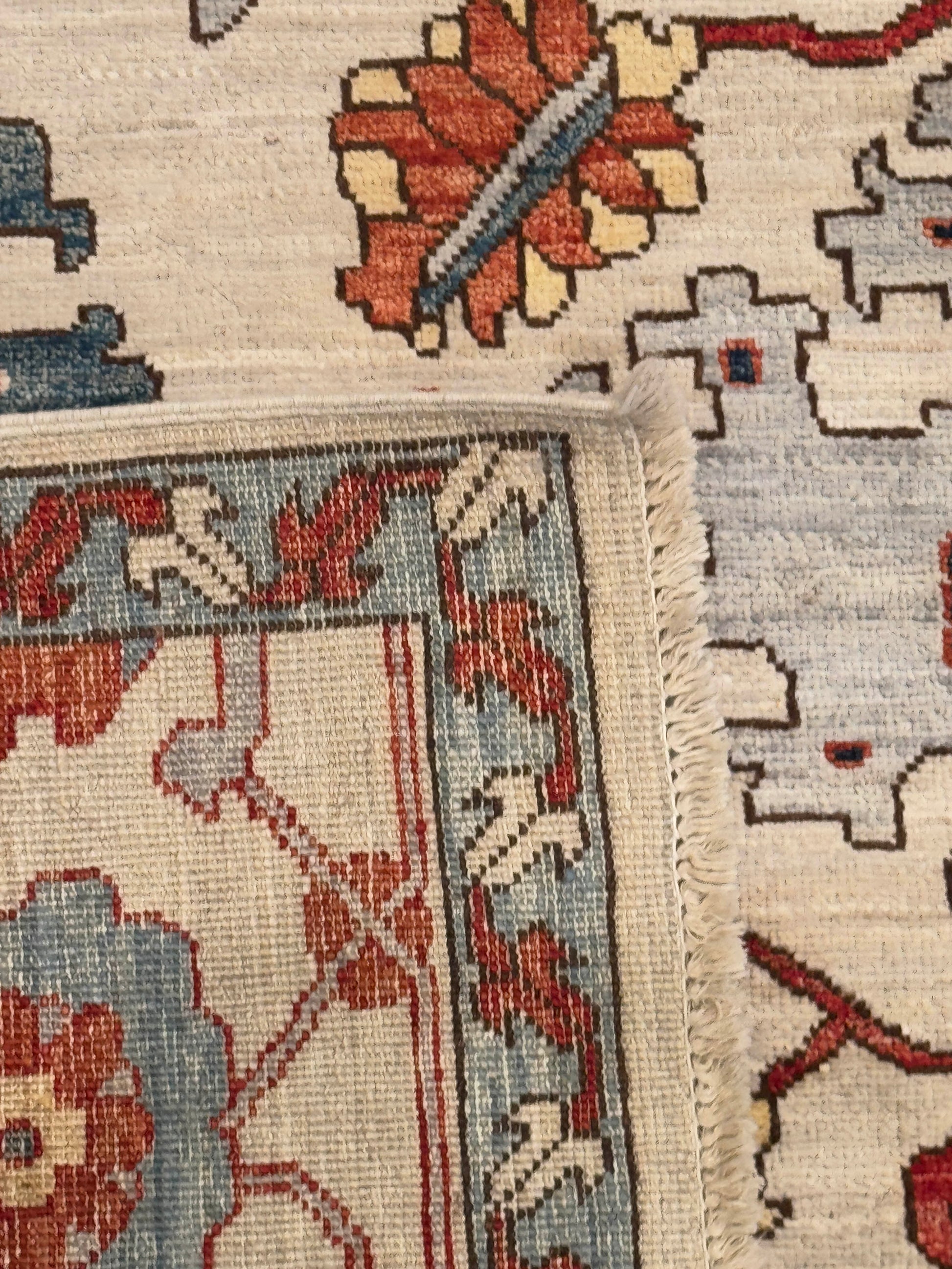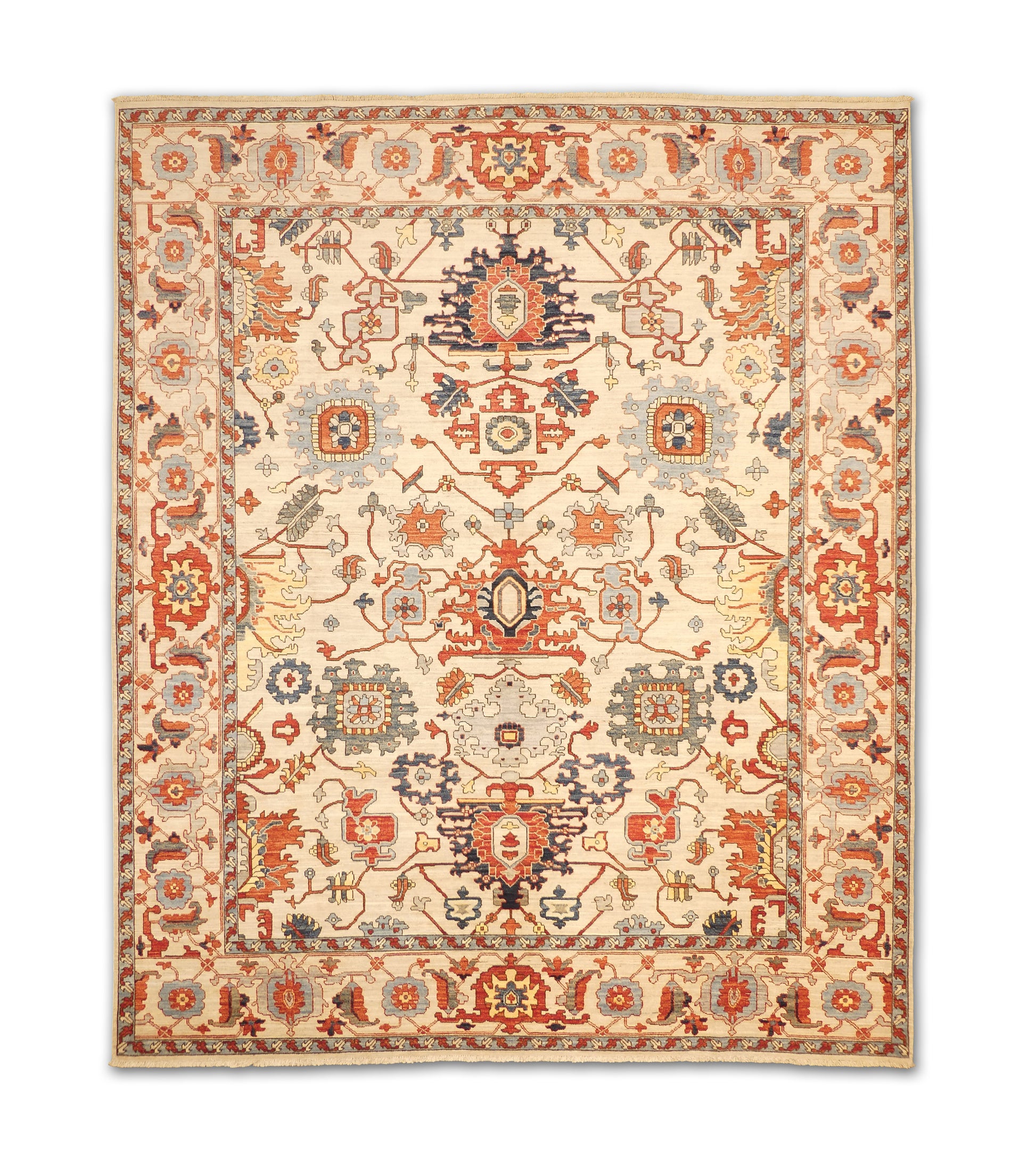 - Design: Bold medallions and angular motifs enclosed by a detailed border