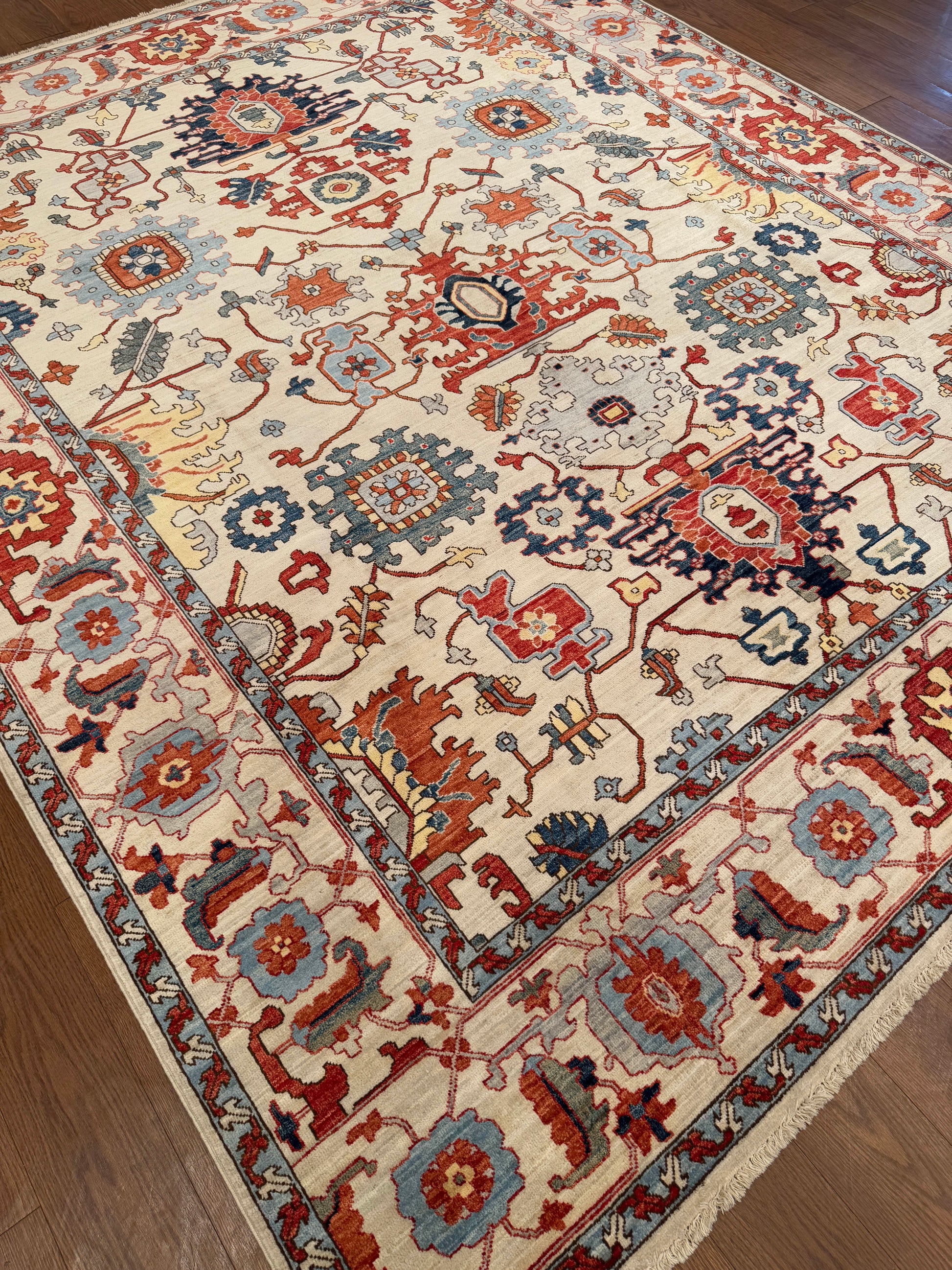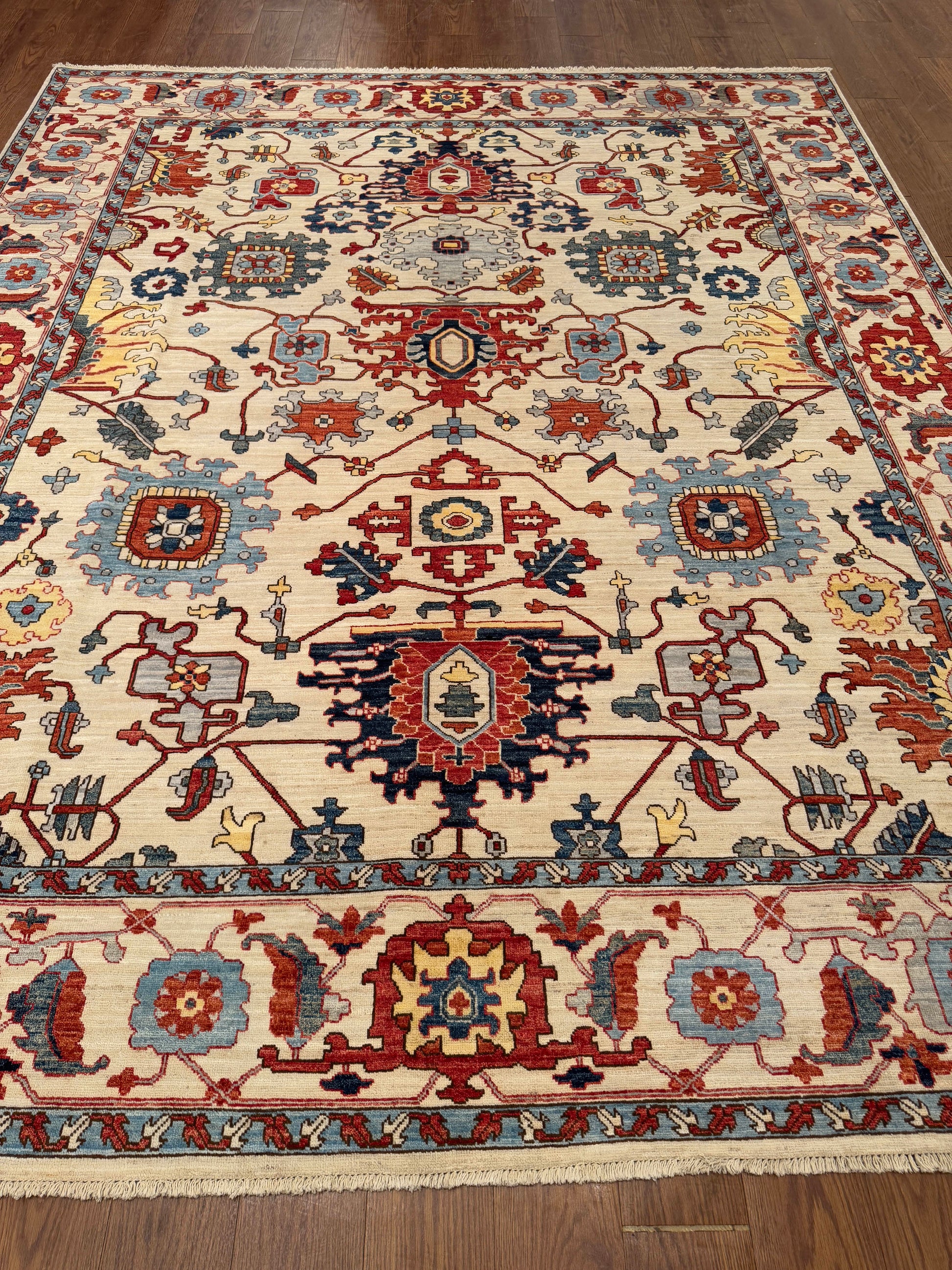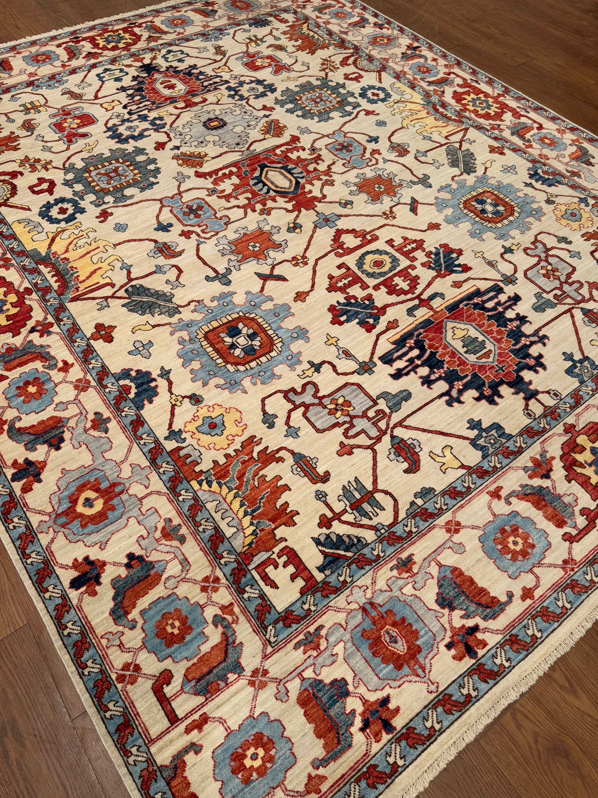 This vibrant handwoven rug commands attention with its bold use of crimson red, sky blue, ivory, and deep navy. Strong geometric medallions and angular motifs fill the field with a sense of symmetry and strength, while the richly detailed border frames the design with a striking contrast. The high-energy palette and structured layout create a dynamic centerpiece that exudes character and timeless appeal.