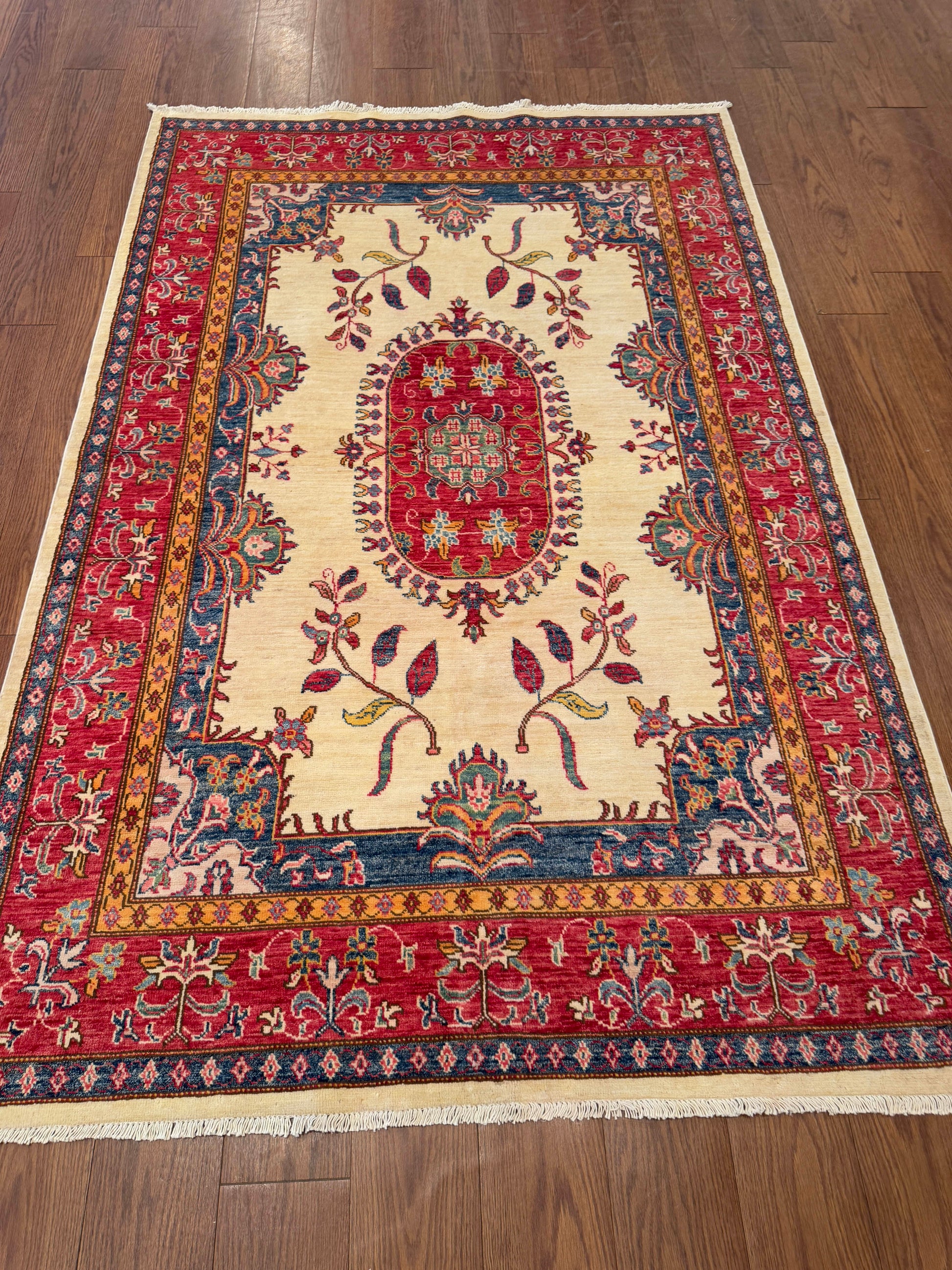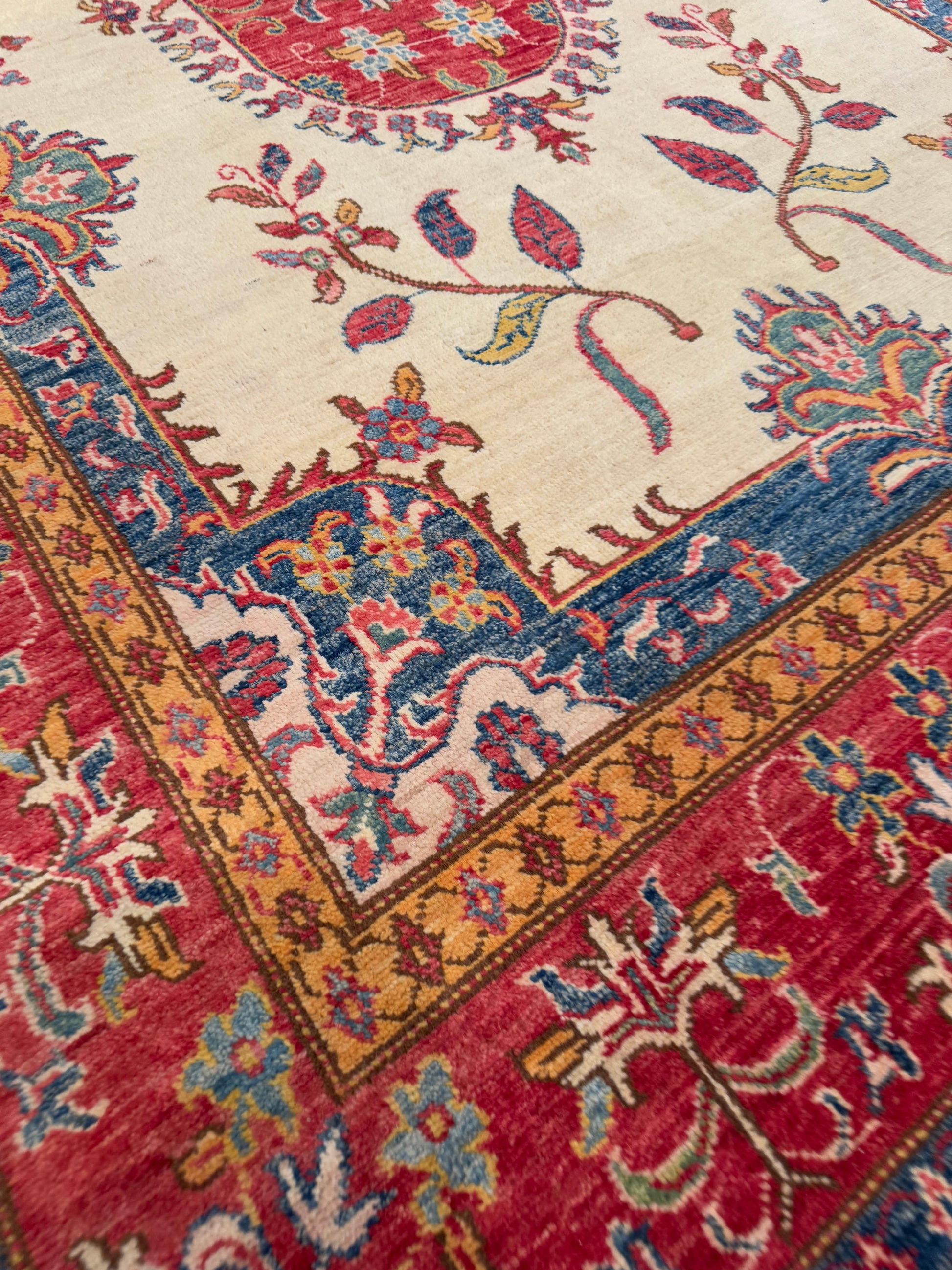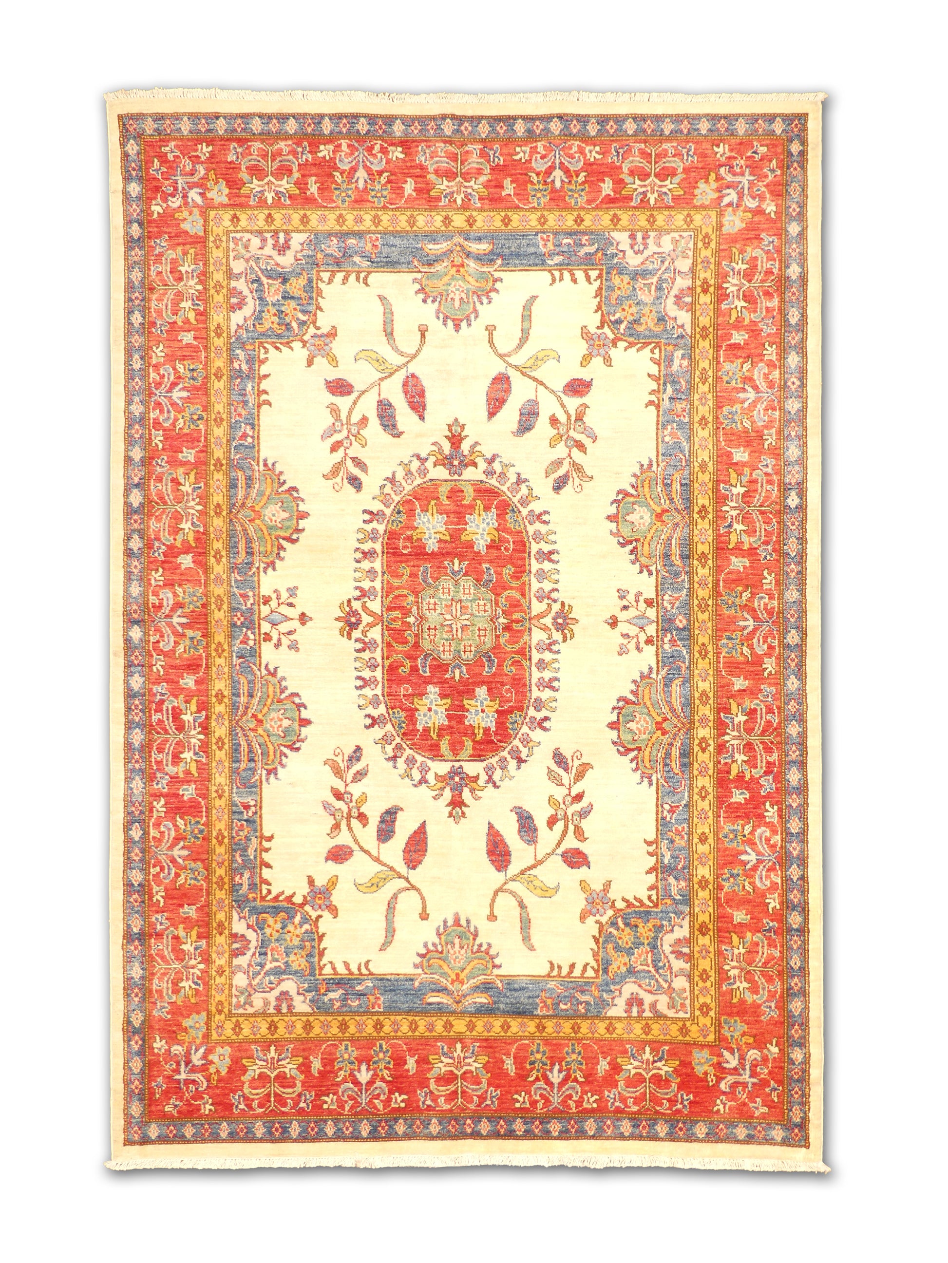 This handwoven wool rug presents a refined balance of elegance and tradition, featuring a soft ivory field centered by an oval red medallion framed with intricate floral motifs. Graceful vine and blossom patterns extend outward, giving the design a delicate rhythm. The surrounding red border, enriched with blue and gold accents, adds depth and contrast while highlighting the central composition. The restrained palette and open design make this piece versatile, bringing a sense of sophistication and warmth to any setting.