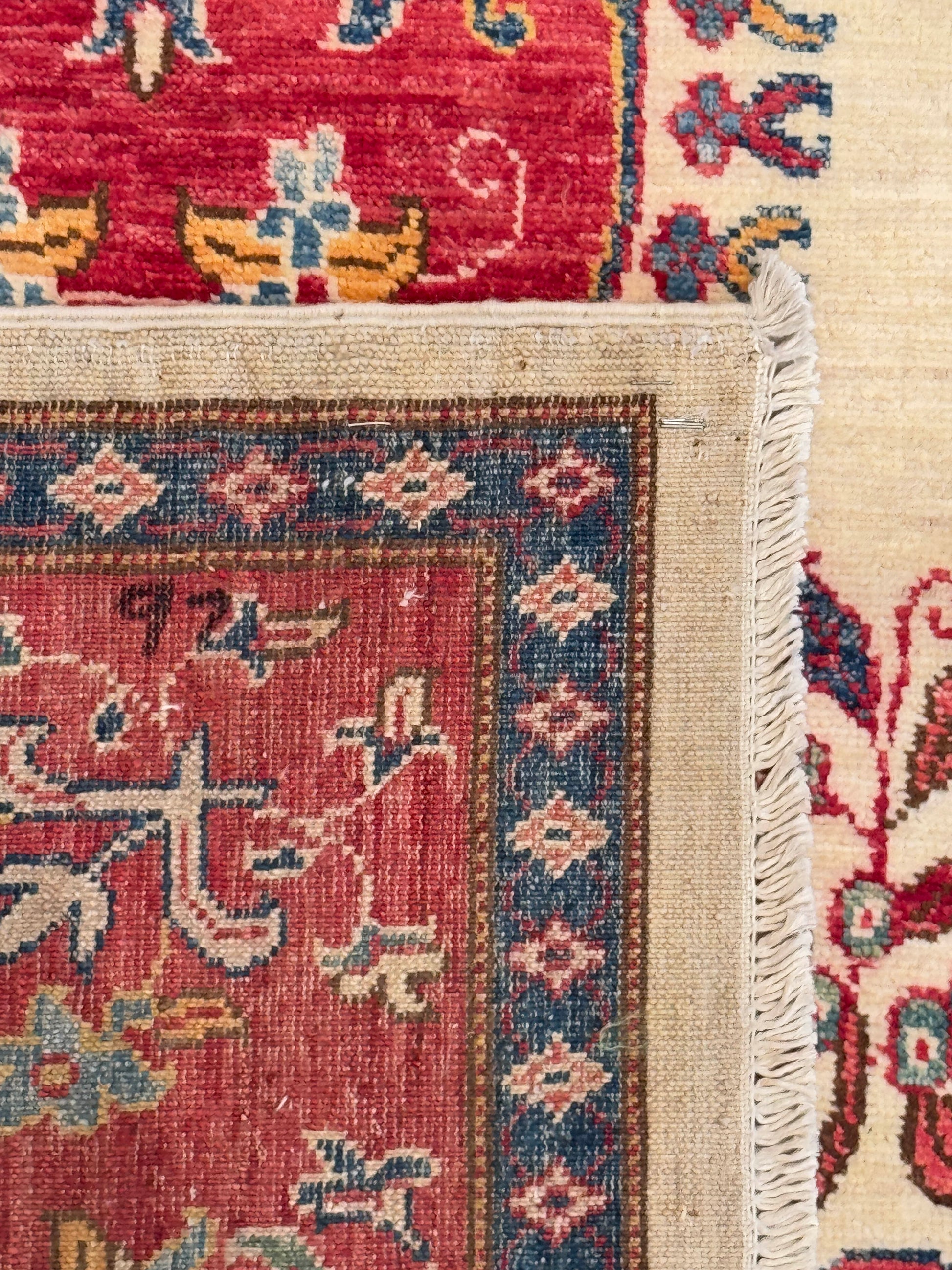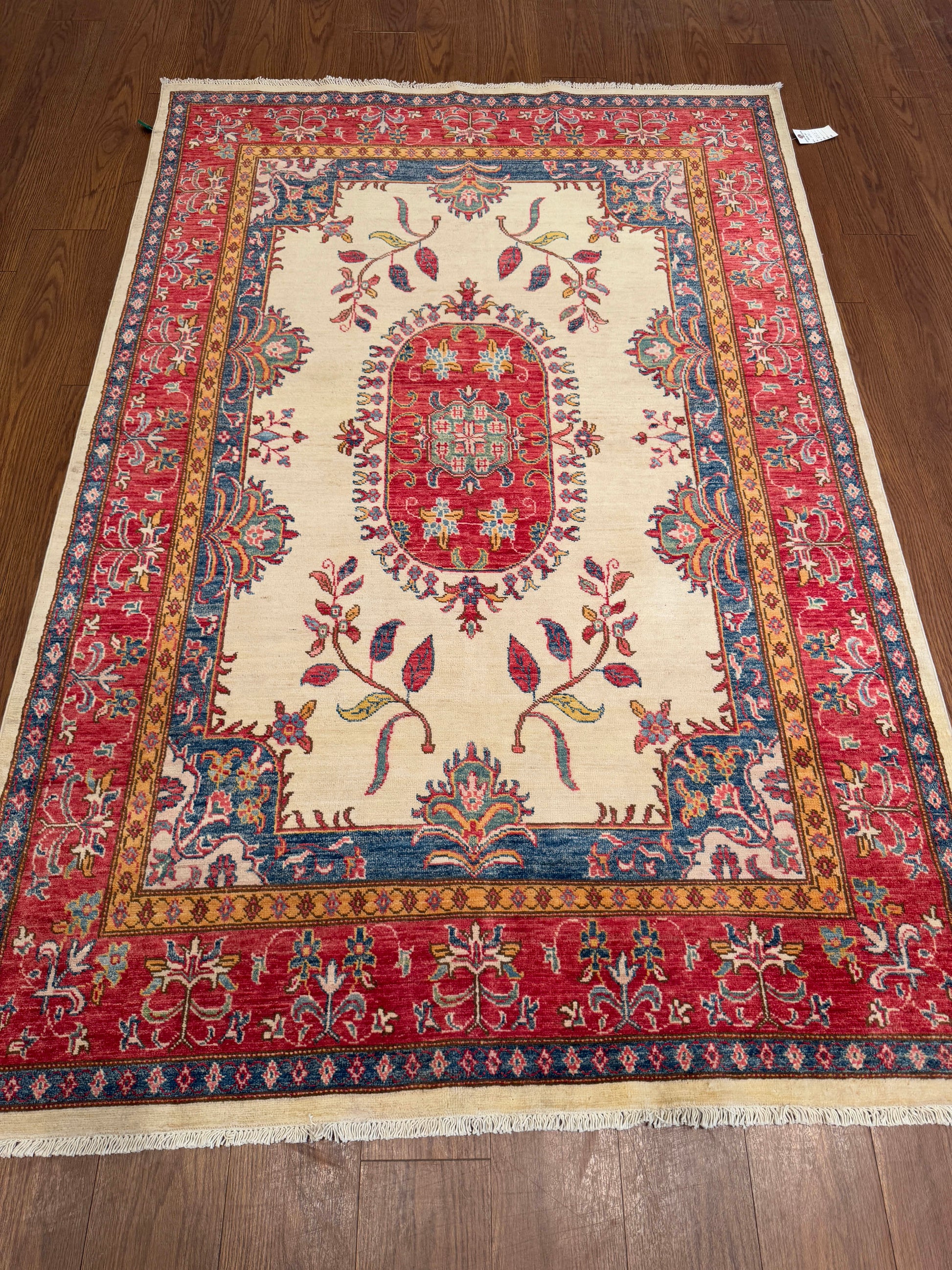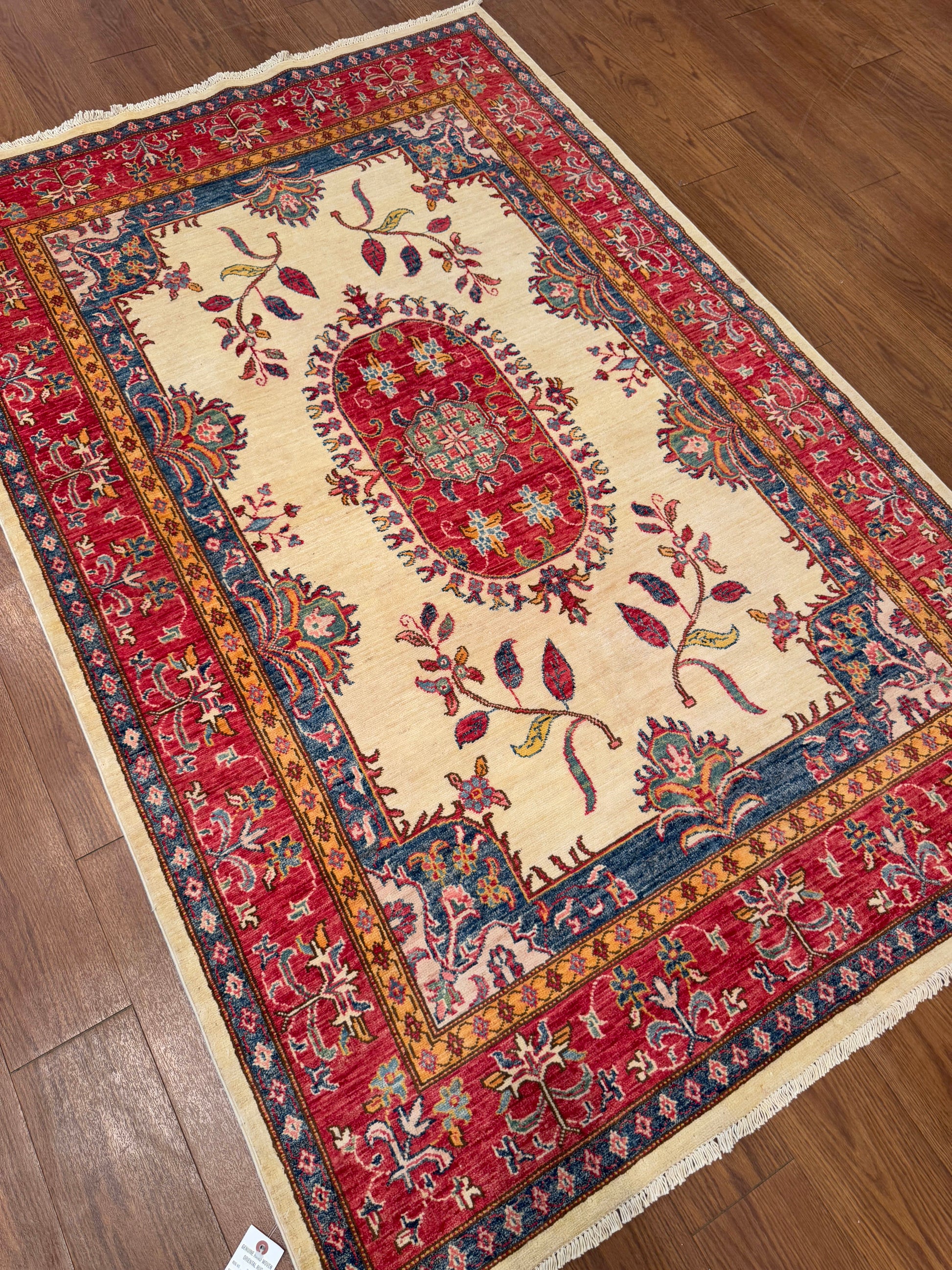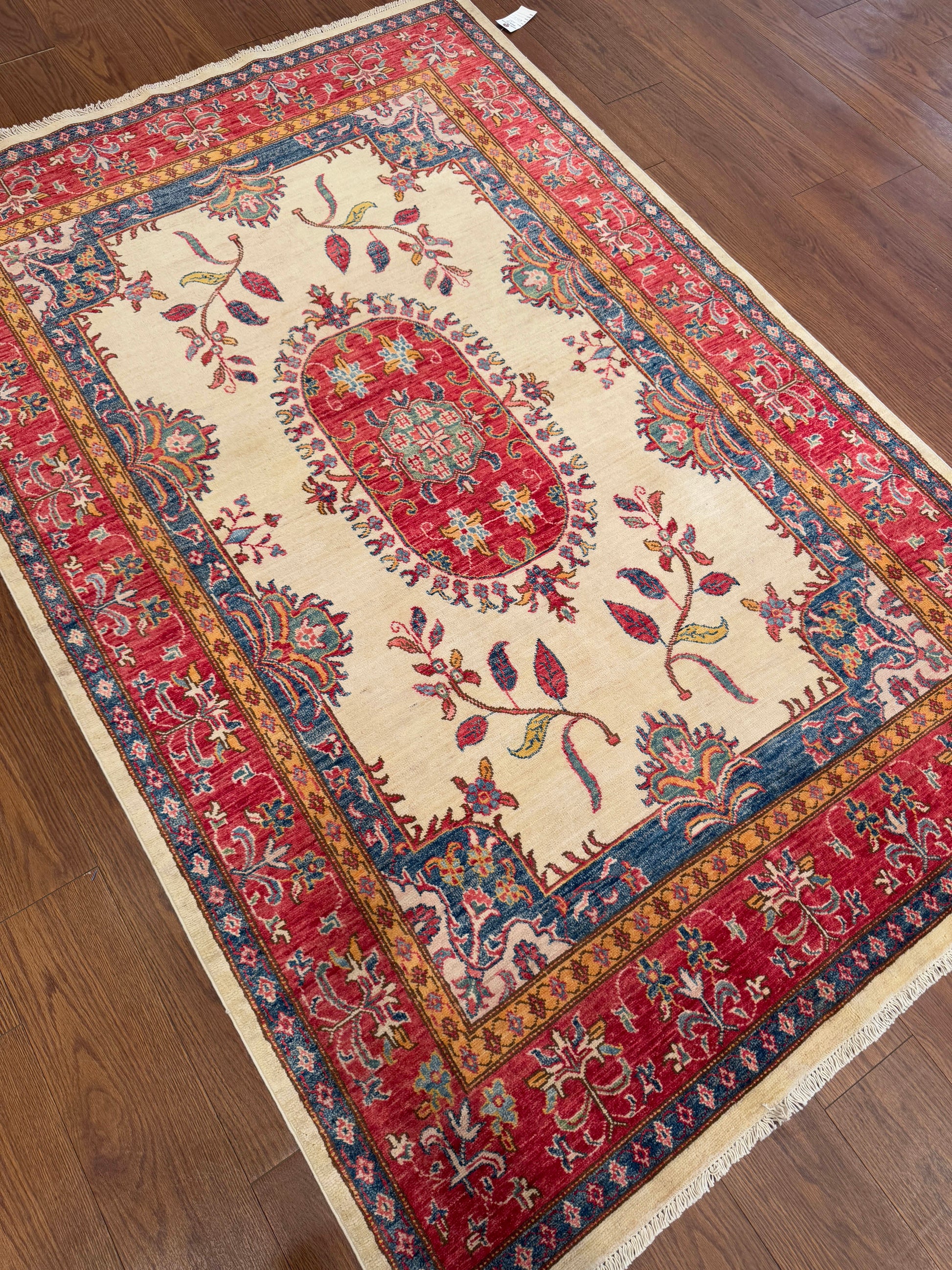 This handwoven wool rug presents a refined balance of elegance and tradition, featuring a soft ivory field centered by an oval red medallion framed with intricate floral motifs. Graceful vine and blossom patterns extend outward, giving the design a delicate rhythm. The surrounding red border, enriched with blue and gold accents, adds depth and contrast while highlighting the central composition. The restrained palette and open design make this piece versatile, bringing a sense of sophistication and warmth to any setting.