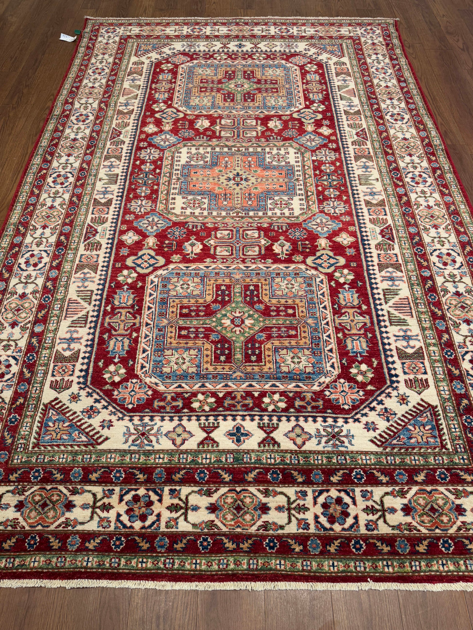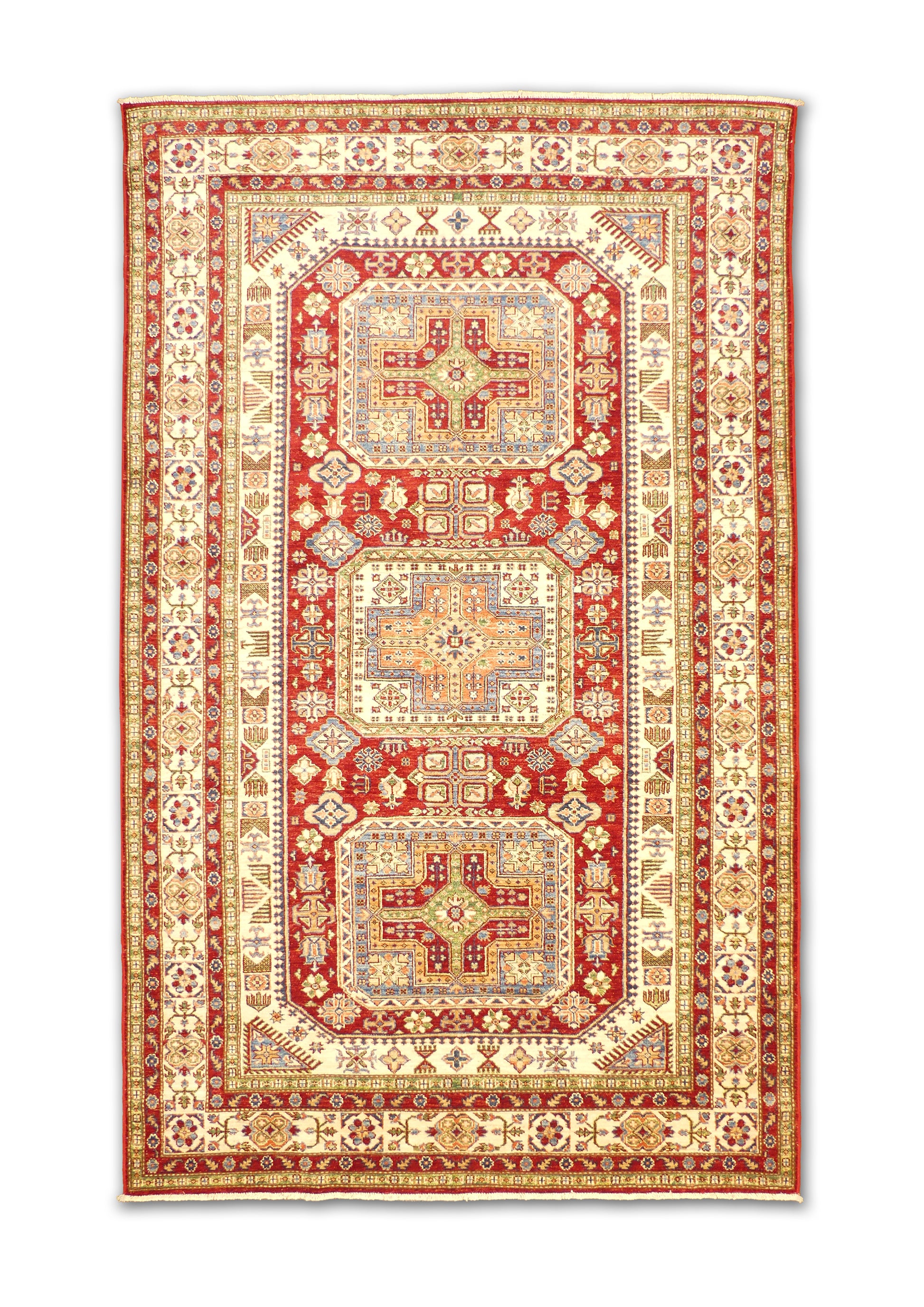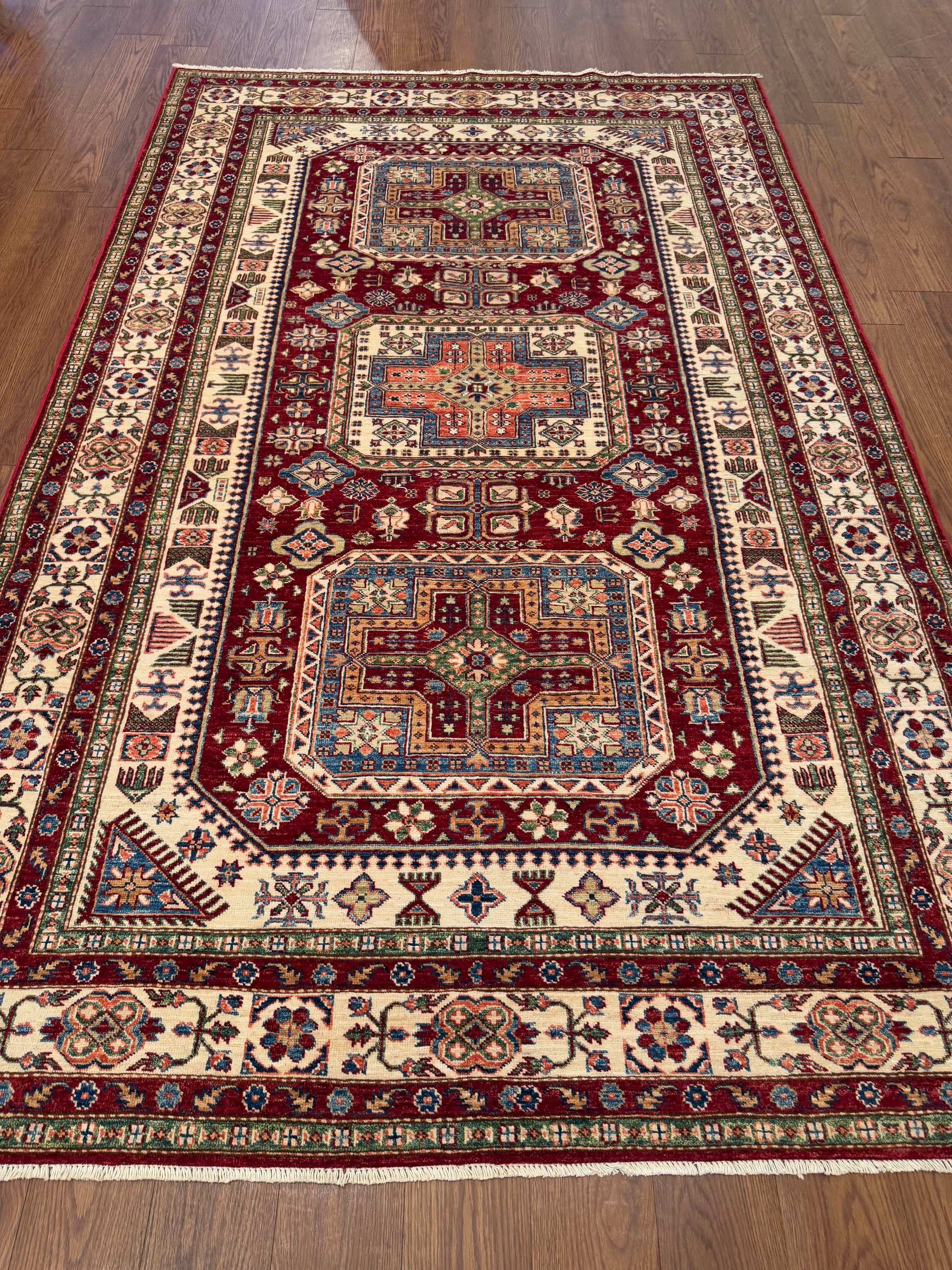 This vibrant handwoven wool rug showcases a bold red field highlighted by striking geometric medallions and intricate ivory borders. The detailed accents in green, blue, and gold bring dimension and balance, making it a standout piece with both character and elegance.