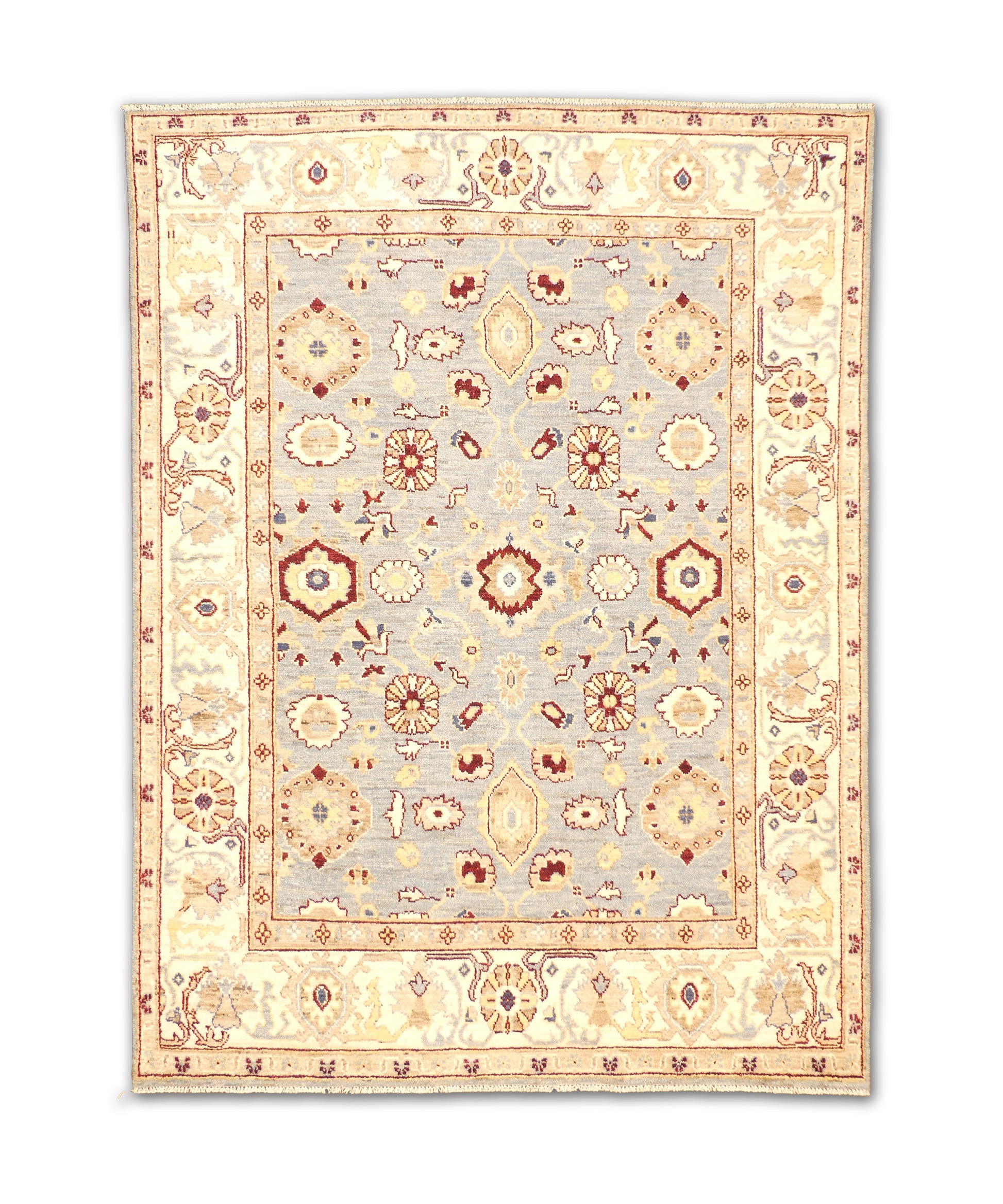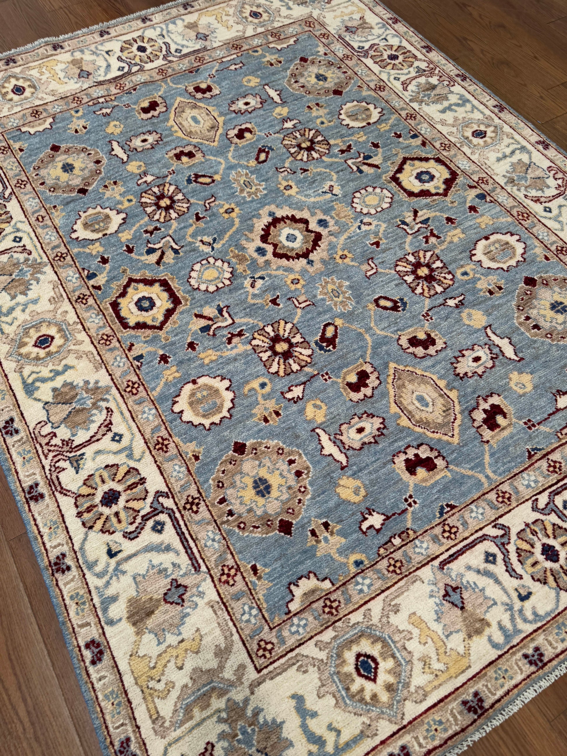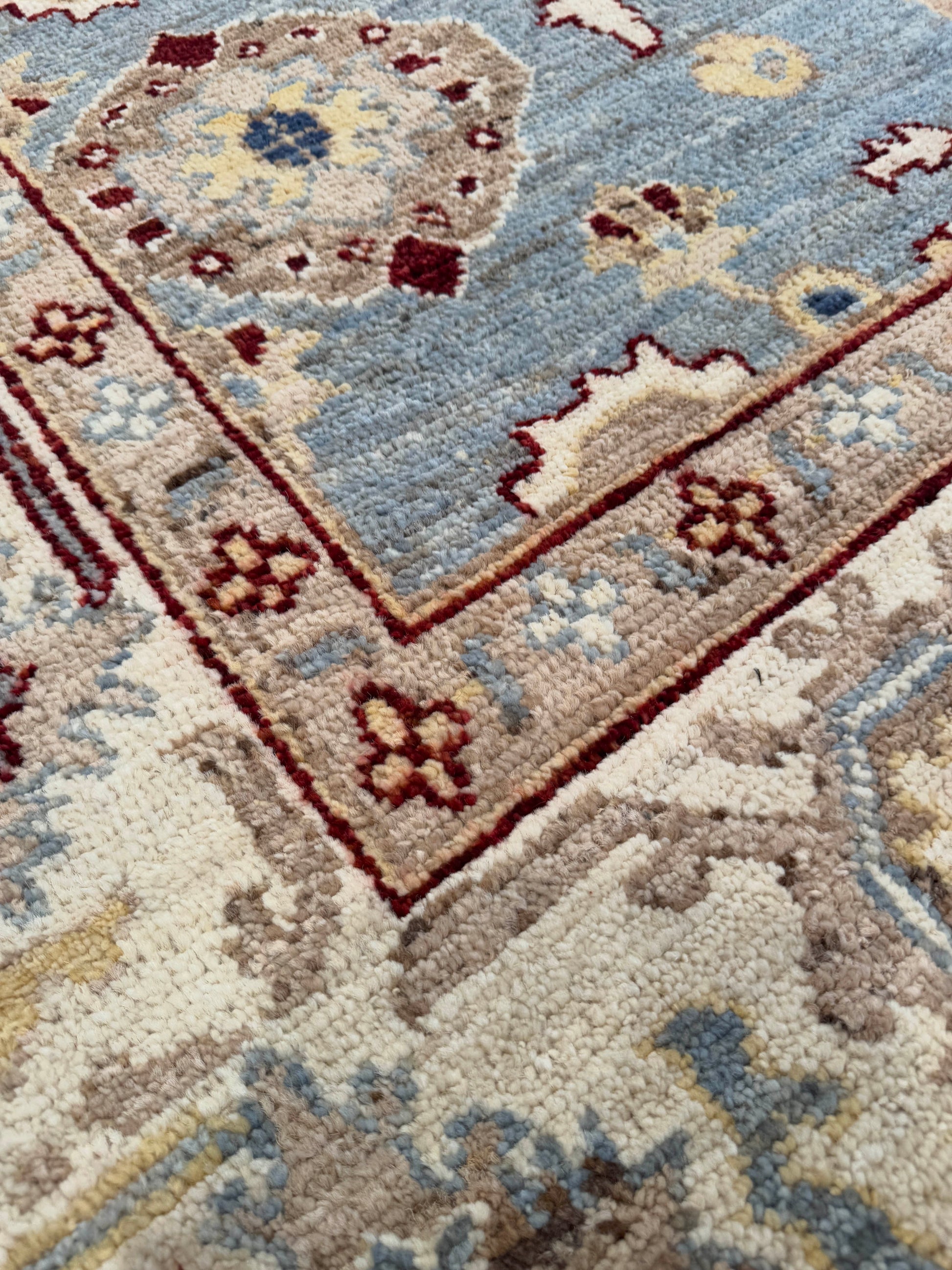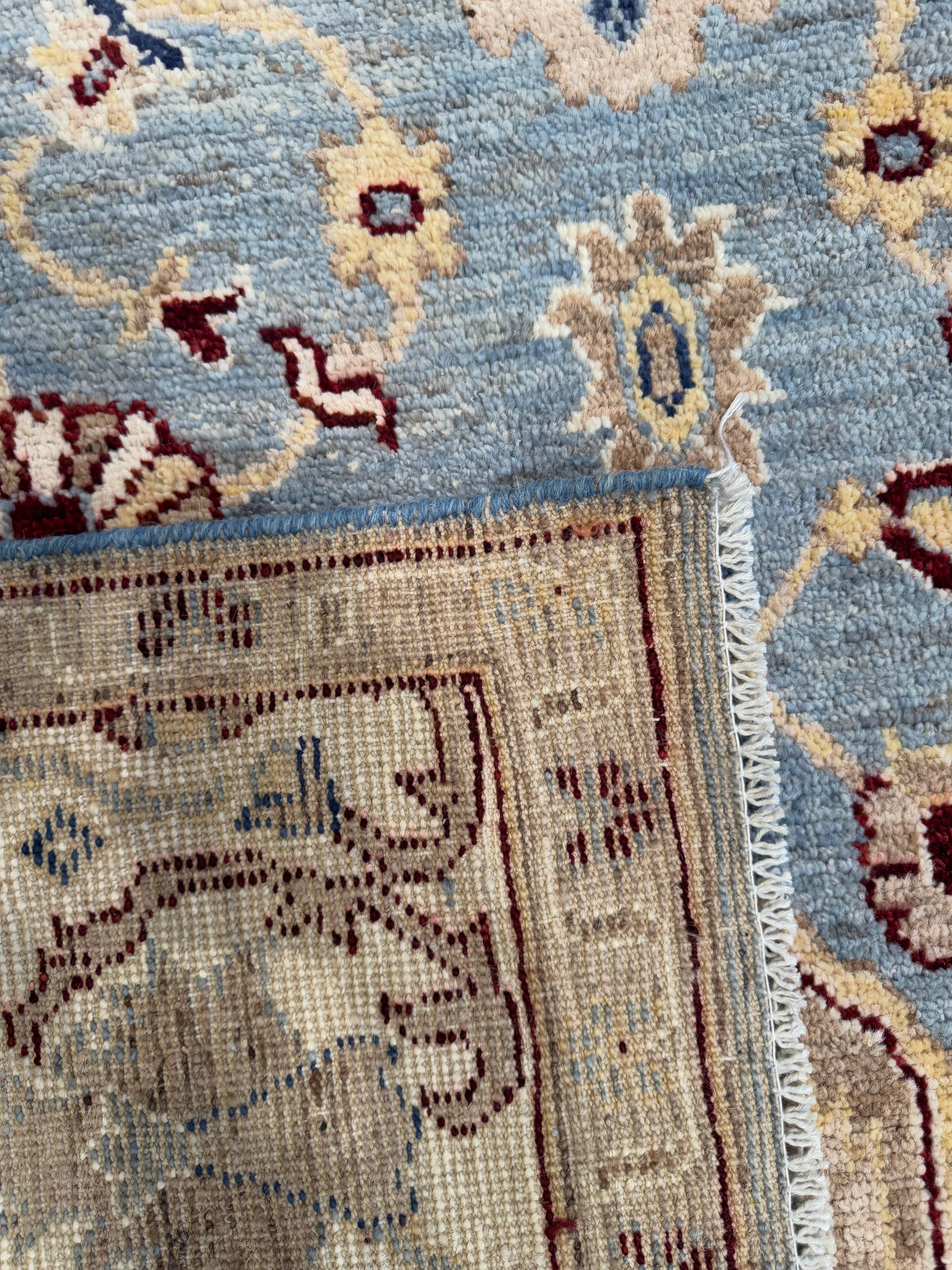 This handwoven wool rug showcases a soft blue field with repeating floral and geometric motifs framed by ivory-toned borders. The balanced palette of burgundy, beige, and gold adds warmth and contrast, creating a versatile piece that blends traditional craftsmanship with refined elegance.